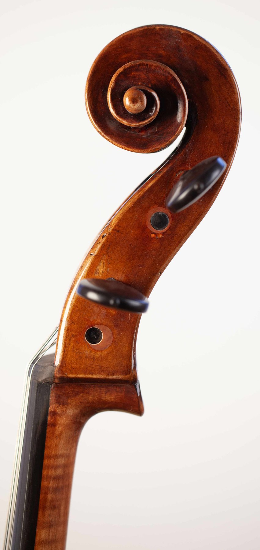 This beautiful old cello is made with a fantastic seasoned, powerful sound! Two pieces back of strongly narrow flamed wood with matched sides. The top of high grained spruce. Golden-amber varnish is very shiny and transparent. New rosewood set up, new Despiau bridge, Pirastro strings. The sound of this instrument is of a charming character, sweet and beautiful colors, depth and great carrying power. Suitable for solo and chamber music. Going by the label and type of work I assume this to be a fine italian instrument. Never the less by this assumption it is sold as is. LOB: 753 mm UPPER: 344 mm MID: 239 mm LOWER: 433 mm Full: 1220 mm