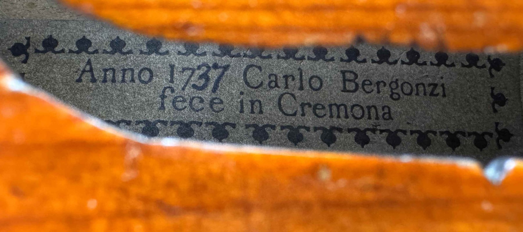 A very fine antique master 4/4 violin, labeled Anno 1737 Carlo Bergonzi fece in Cremona. The violin has an excellent medium grained spruce of the top and one piece back of softly flamed maple with matched sides and scroll. Very rich golden amber varnish remains in good condition. The whole length of the violin is 593 mm and the back 362 mm. The width of the upper bouts: 164 mm; middle bouts: 110 mm; lower bouts: 205 mm.