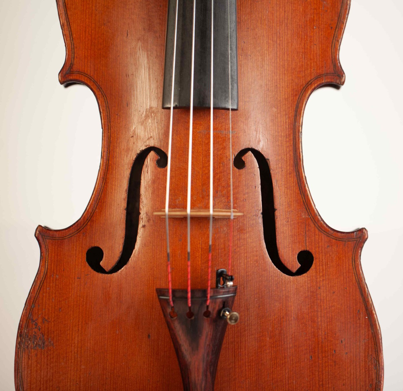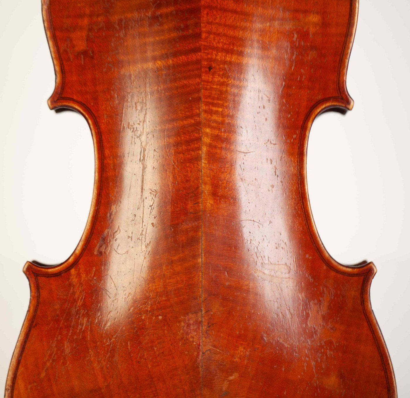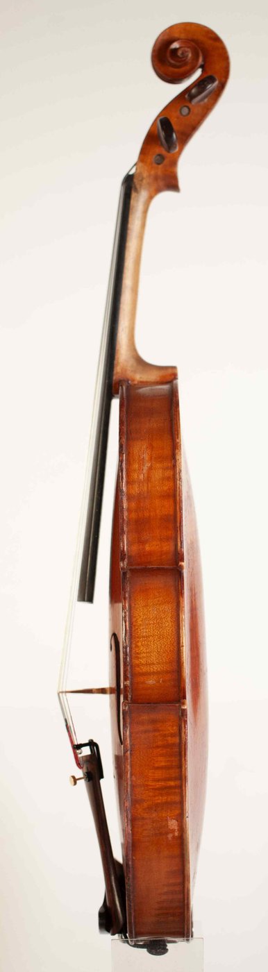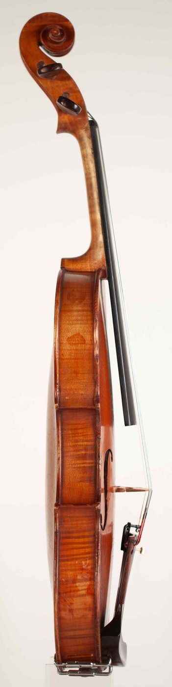 A very fine and rare 4/4 violin, labeled Camillo Mandelli fidibus fide fidis Camillus Calcensis fecit Anno Domini 1918. The violin has an excellent high to medium grained spruce of the top and two pieces back of interesting flamed maple with matched sides and scroll. The purfling is professionally executed and the edges are masterfully done. The whole length of the violin is 586 mm and the back 356 mm. The width of the upper bouts: 167 mm; middle bouts: 115 mm; lower bouts: 207 mm.