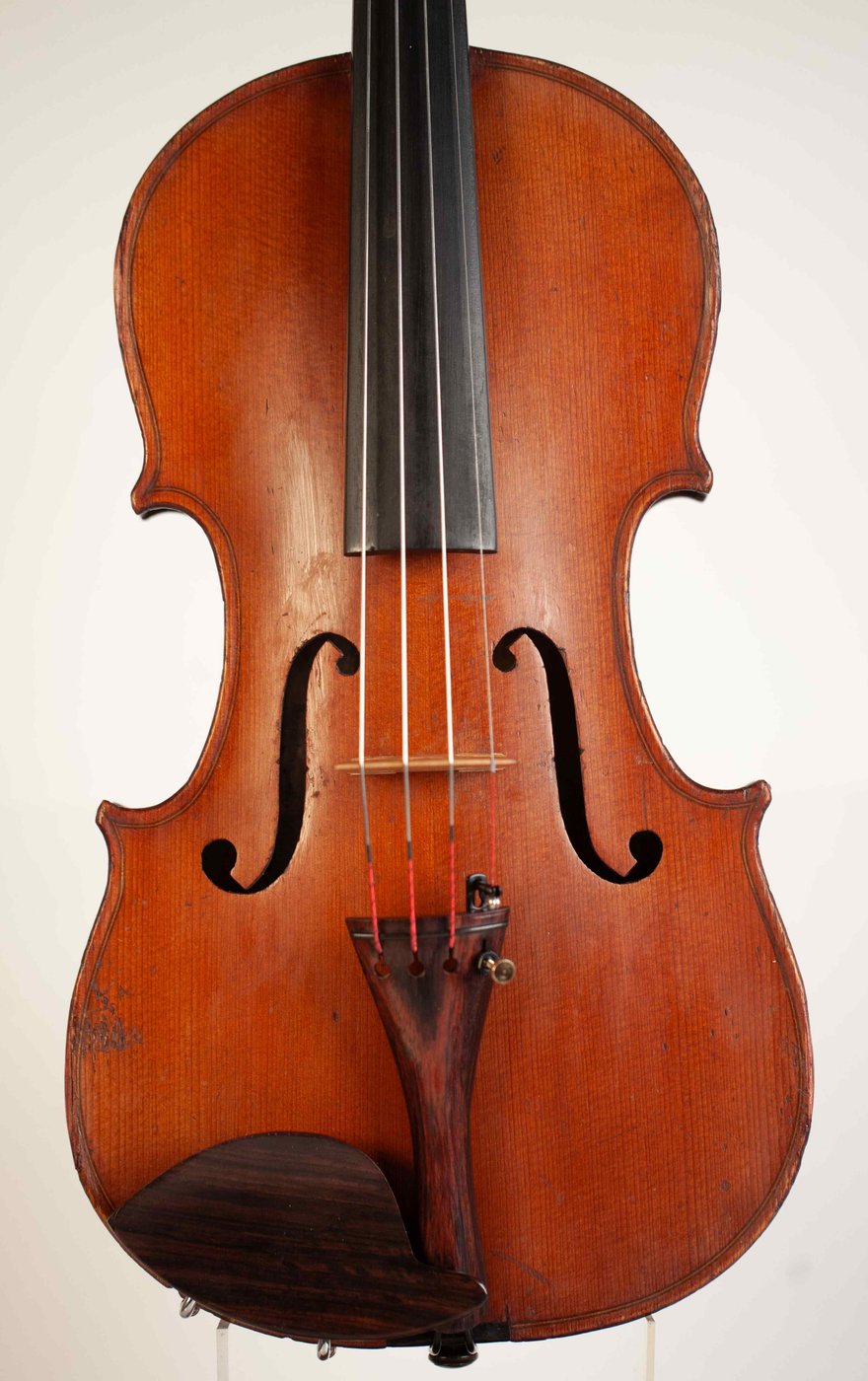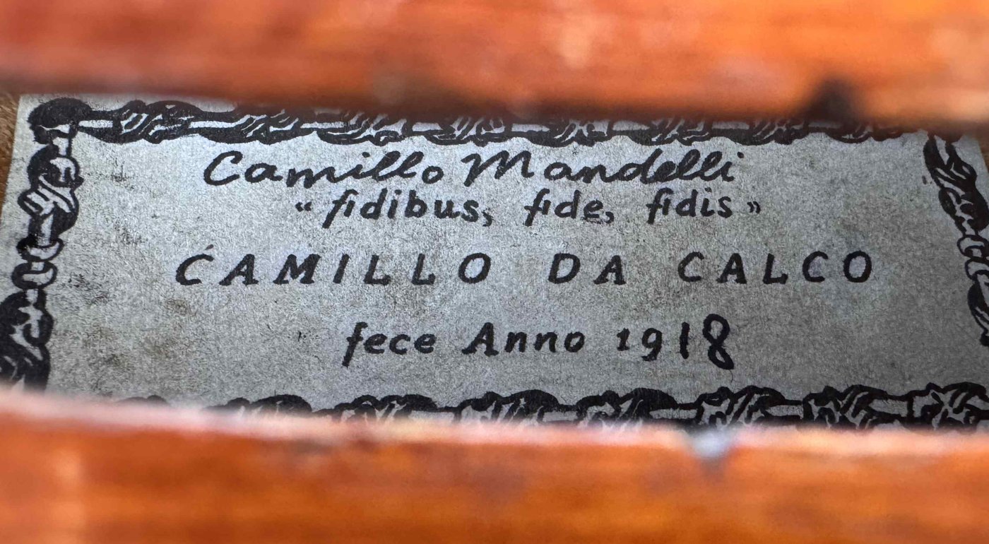 Old violin, labeled Camillo Mandelli fidibus fide fidis Camillus Calcensis fecit Anno Domini 1918.