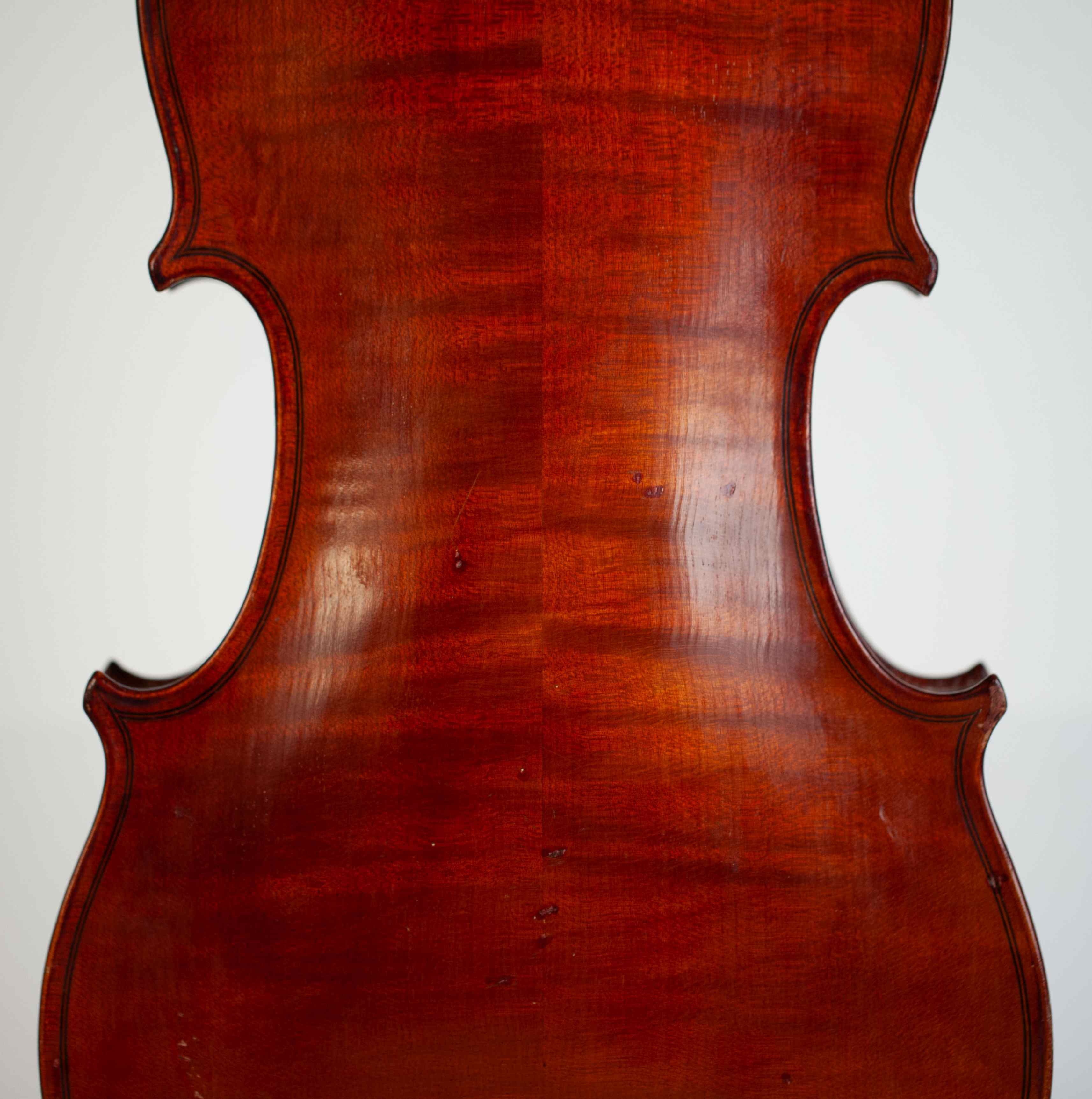 A very fine and rare 4/4 violin, labeled Camillo Mandelli fidibus fide fidis Camillus Calcensis fecit Anno Domini 1920. The violin has an excellent high to medium grained spruce of the top and two pieces back of softly flamed maple with matched sides and scroll. The purfling is professionally executed and the edges are masterfully done. The whole length of the violin is 587 mm and the back 356 mm. The width of the upper bouts: 162 mm; middle bouts: 110 mm; lower bouts: 202 mm.