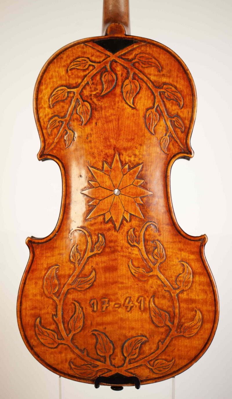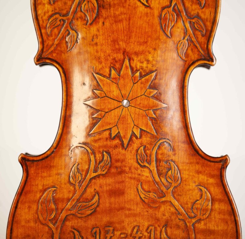 A very fine and rare antique 4/4 violin, labeled Januarius Gagliano filius Alexandri fecit Neap. 1741. The violin has an excellent high to medium grained spruce of the top and two pieces back with amazing carvings. The whole length of the violin is 592 mm and the back 357 mm. The width of the upper bouts: 168 mm; middle bouts: 112 mm; lower bouts: 206 mm.