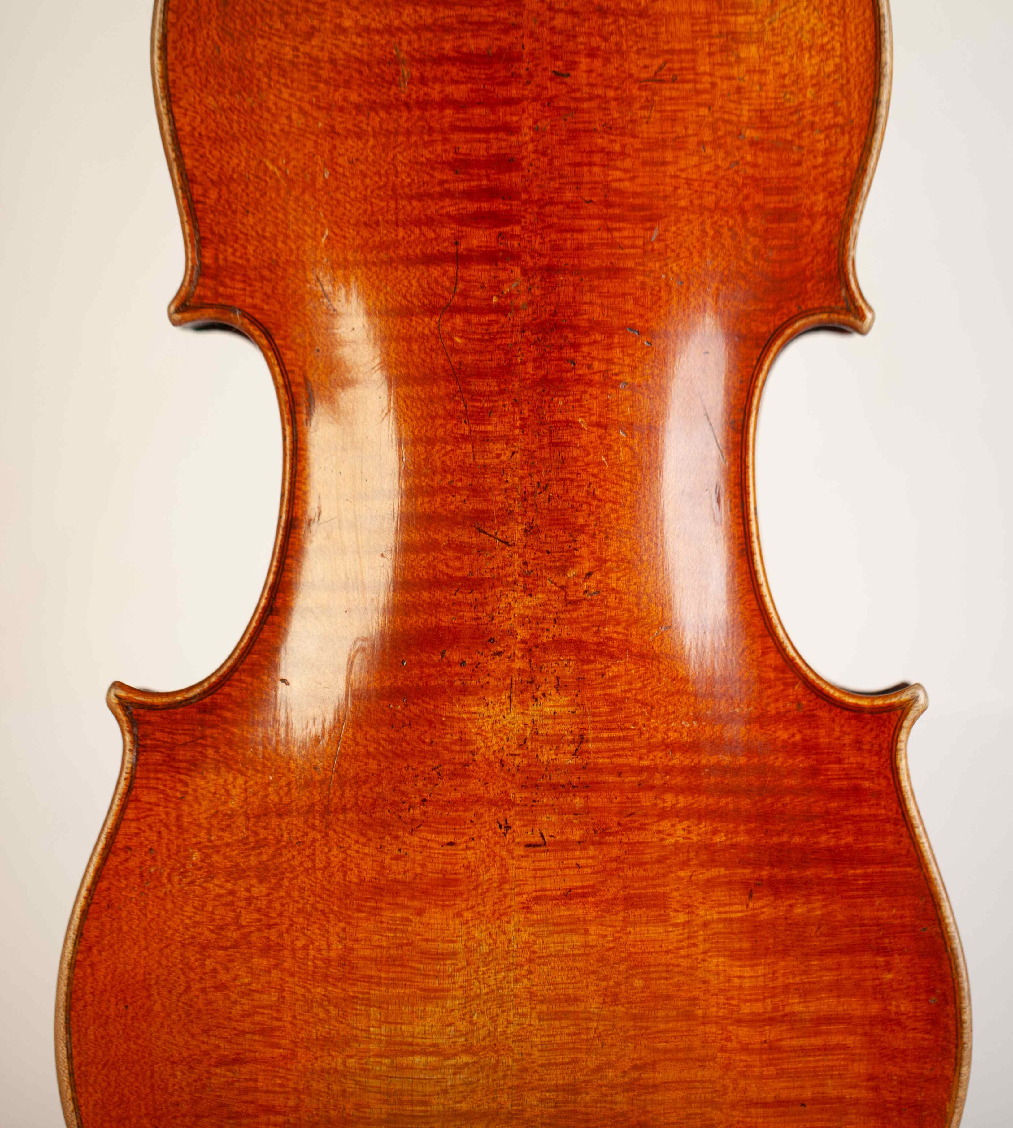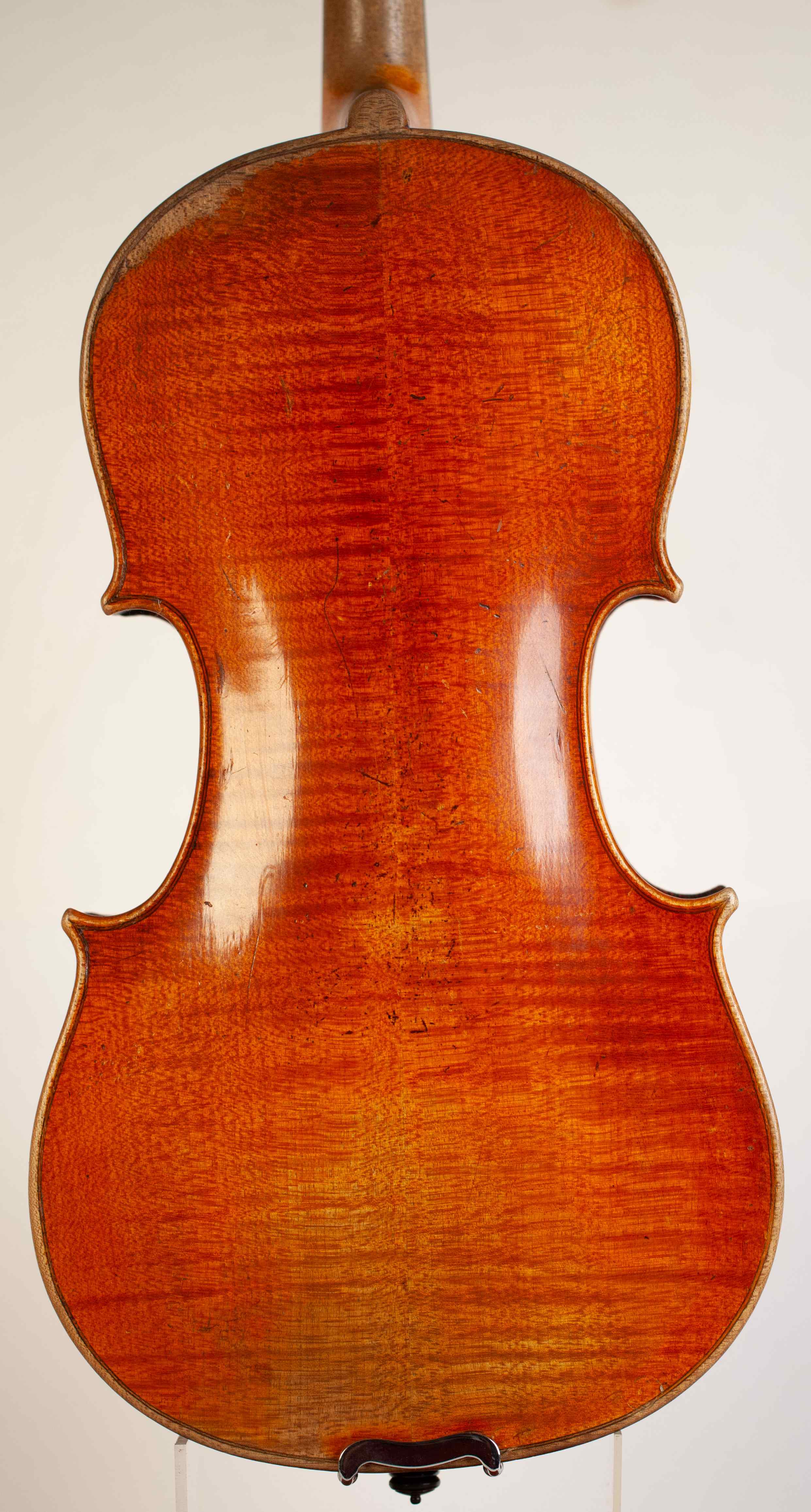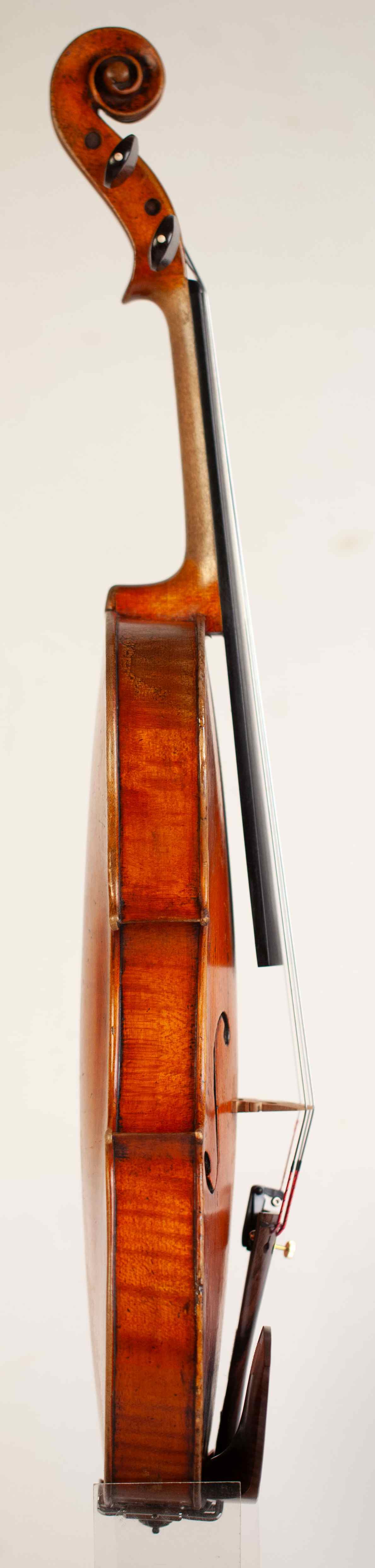 A very fine and rare old italian 4/4 violin, labeled: Januarius Vinaccia fecit Neapoli sub signo Cremonese in Rua Catalana Anno Domini 1779. The violin has an excellent medium grained spruce of the top and two pieces back of strongly flamed maple with matched sides and scroll. Rich golden amber color varnish shows an amazing wooden choice. The whole length of the violin is 591 mm and the back 355 mm. The width of the upper bouts: 162 mm; middle bouts: 108 mm; lower bouts: 200 mm.