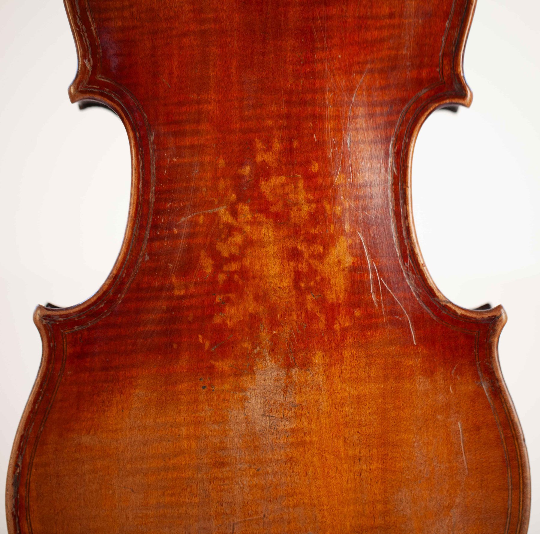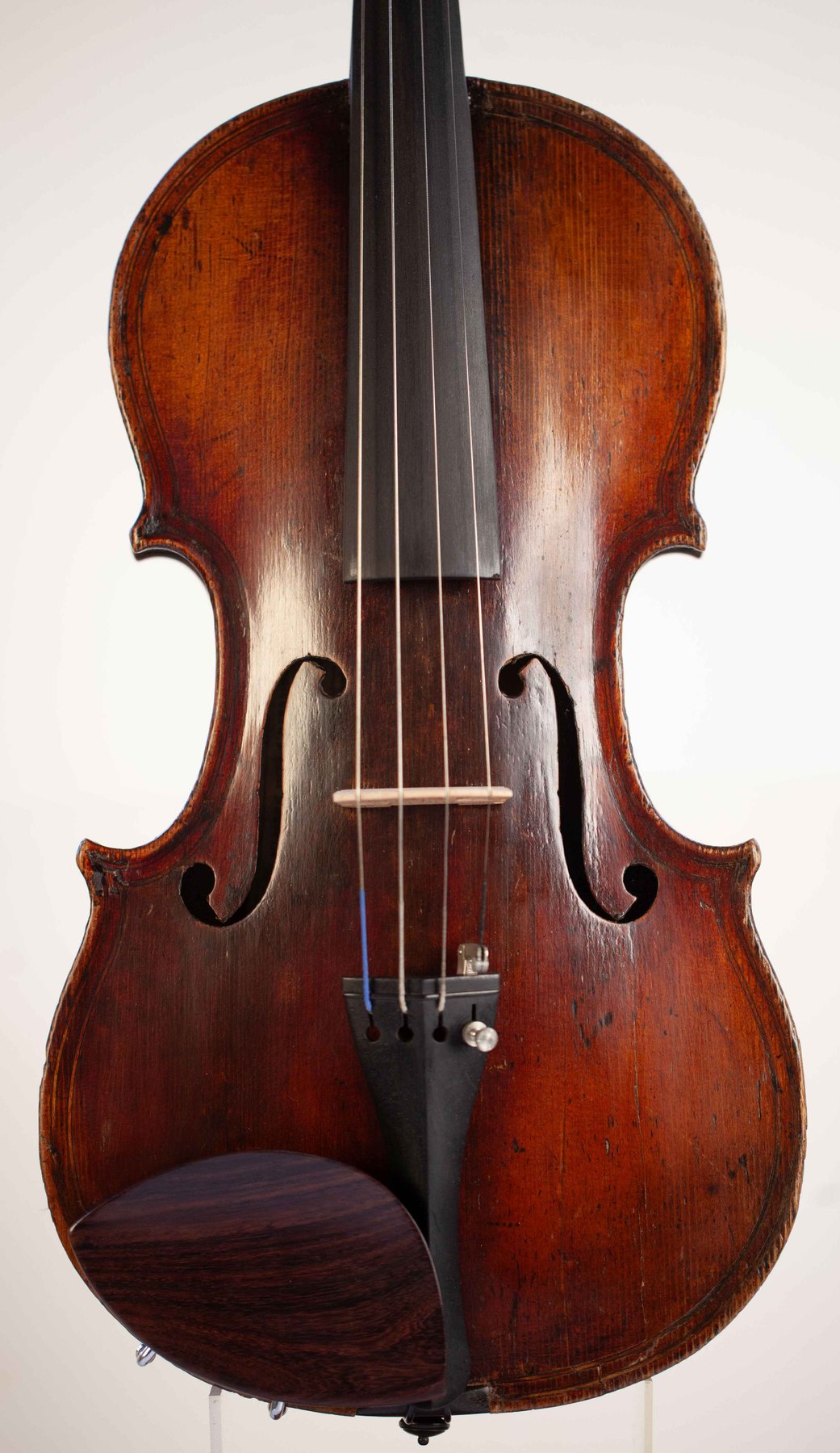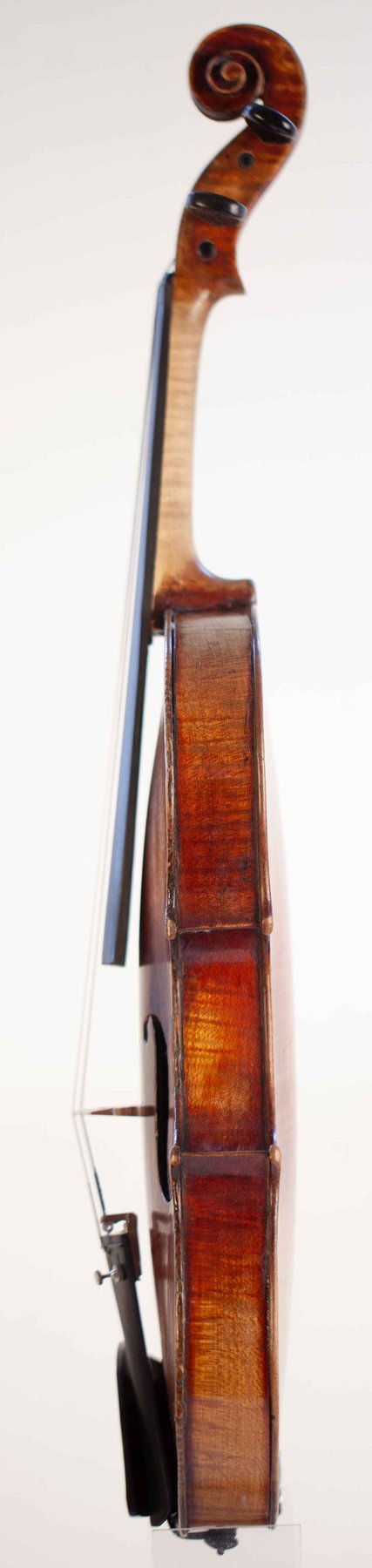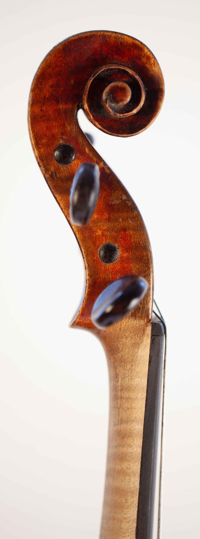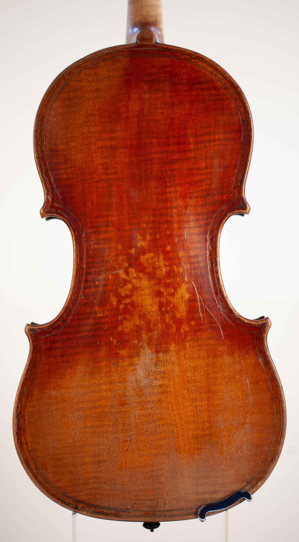 The violin has an excellent high grained spruce of the top and one piece back of strongly flamed maple with matched sides and scroll. Back length (excluding bottom of neck): 360 mm.