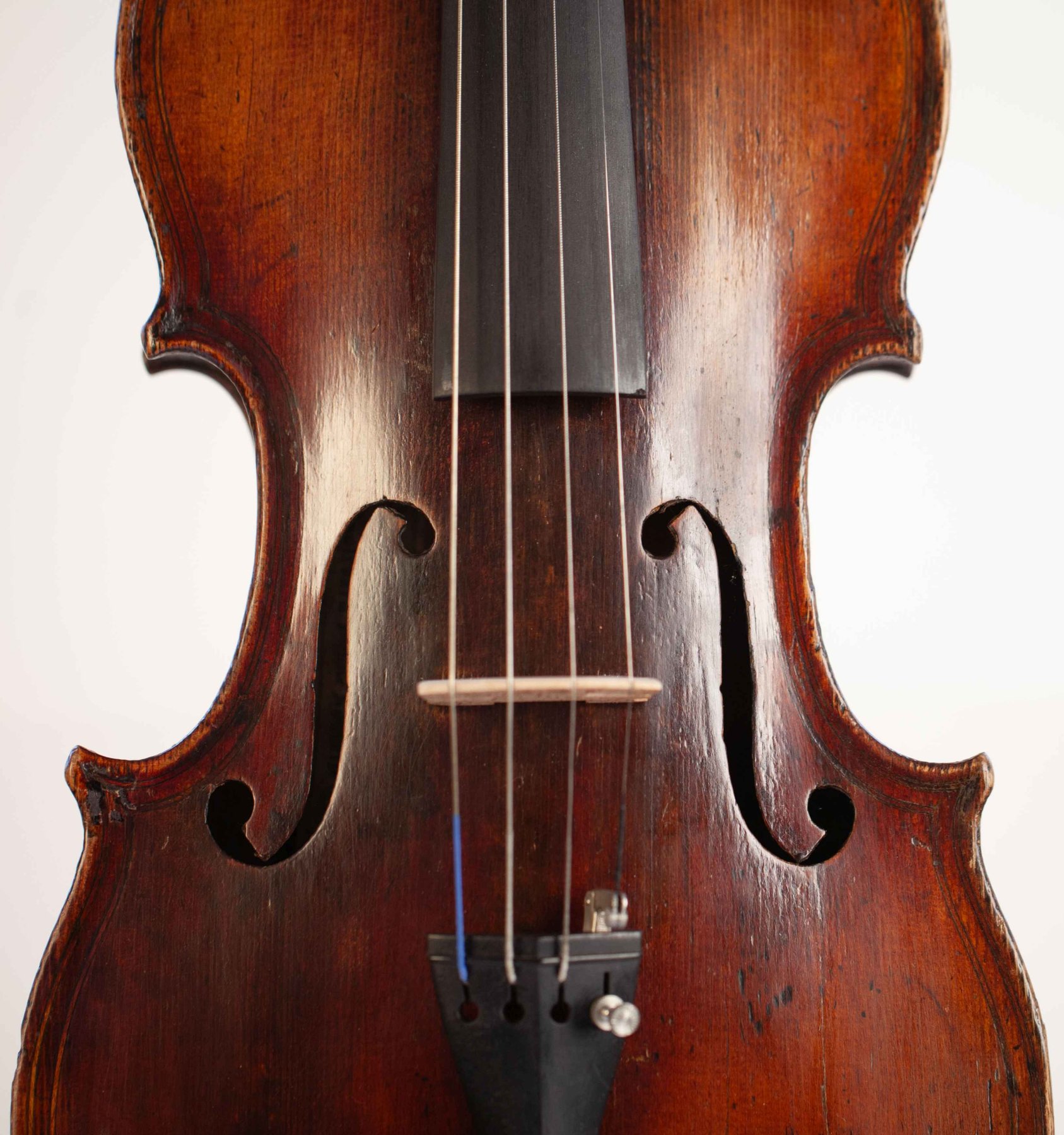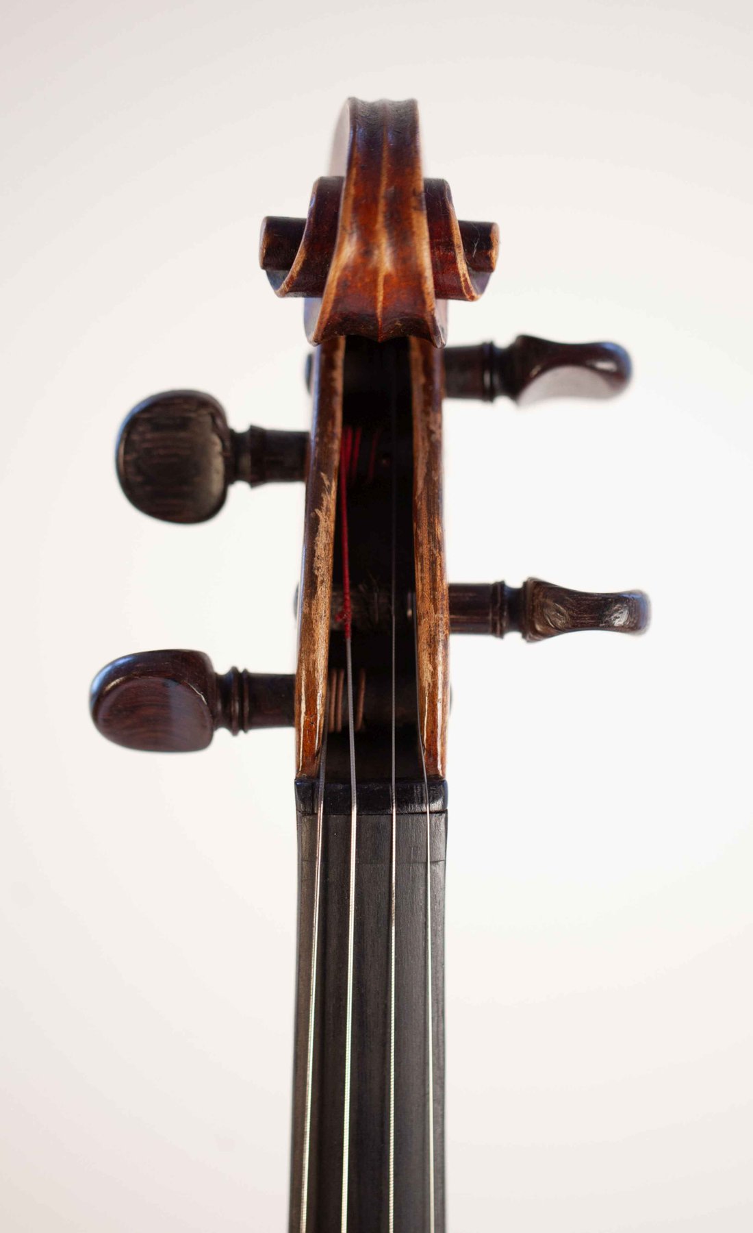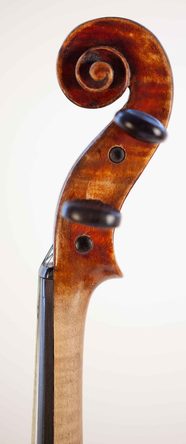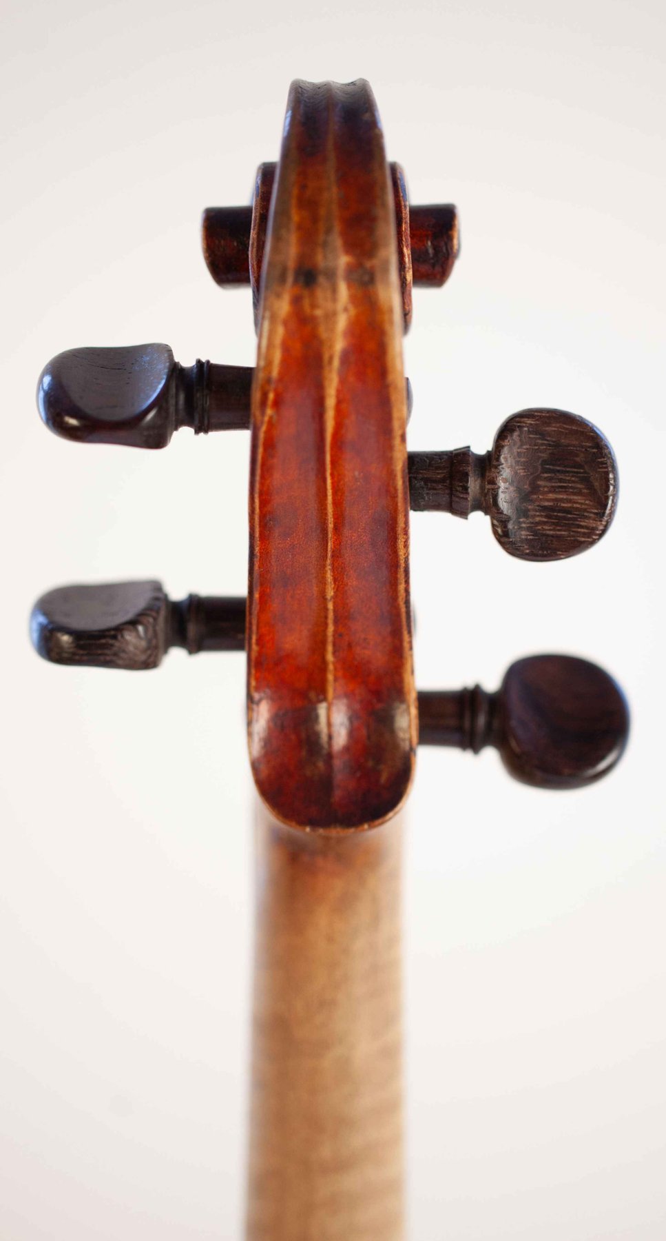The violin has an excellent high grained spruce of the top and one piece back of strongly flamed maple with matched sides and scroll. Back length (excluding bottom of neck): 360 mm.