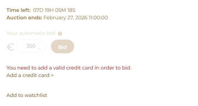 Once the countdown has come to an end, you will be notified onscreen and via email if your bid has been successful. After the sale has finished, your invoice will be sent by email. Full payment is required within seven days of the auction date. Payment may be made by the following: direct bank transfer in euros, debit and credit card, and cash up to € 10,000. For cash payments of € 3,000 or more, we’ll need to see a valid ID in line with German anti-money-laundering regulations.