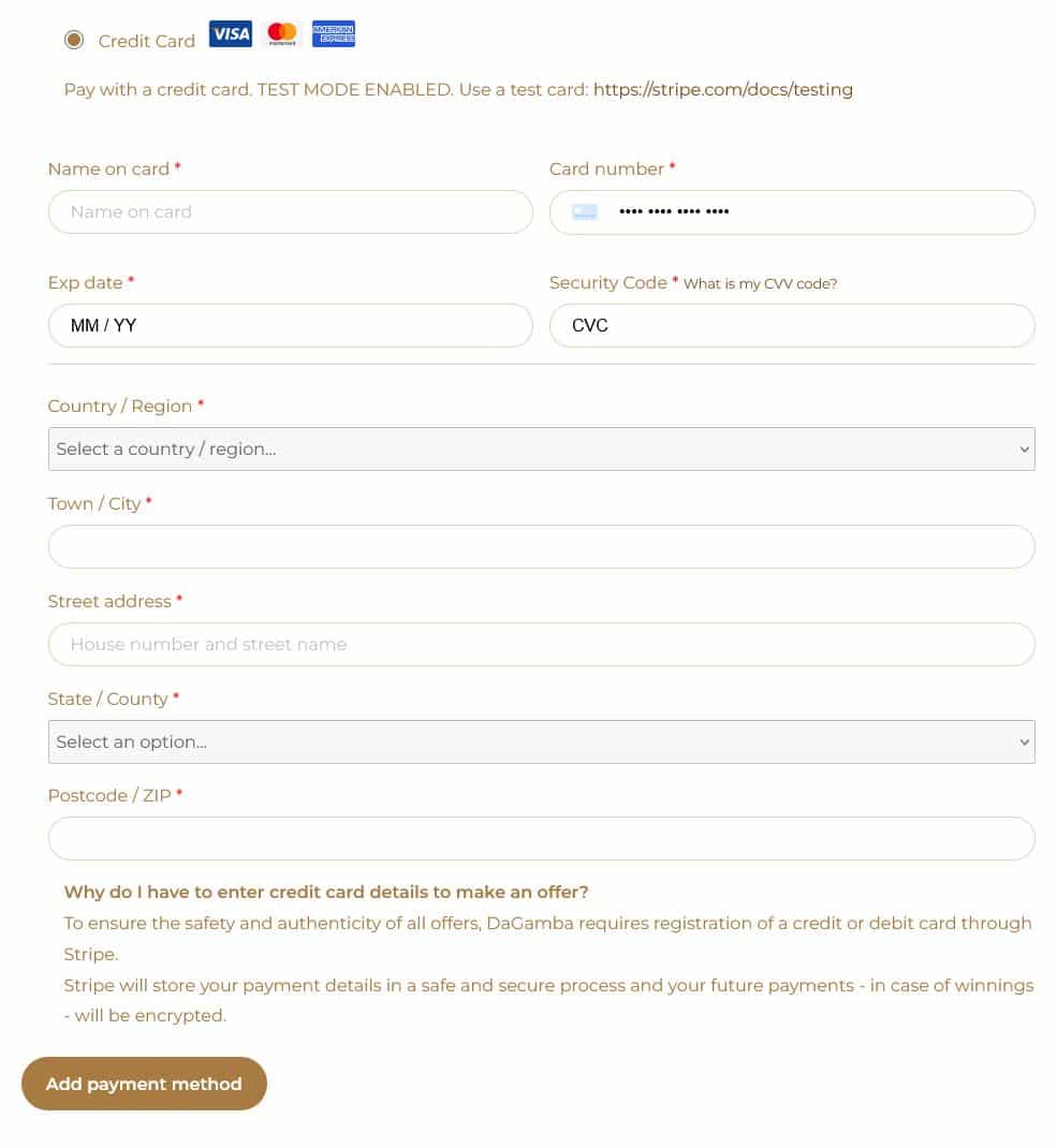 Once you’ve filled in all the required fields and your card is accepted by the payment provider, you can place your bids.