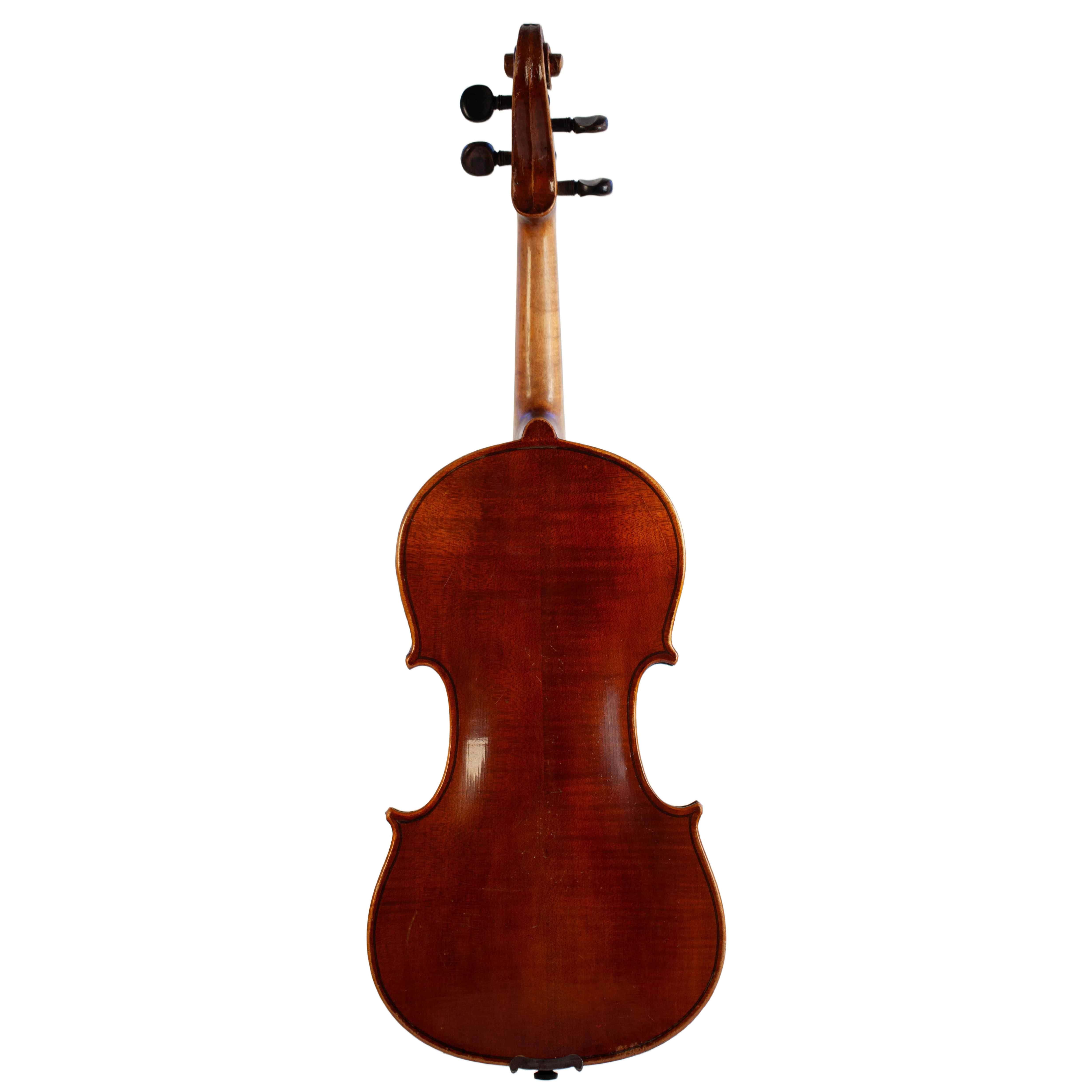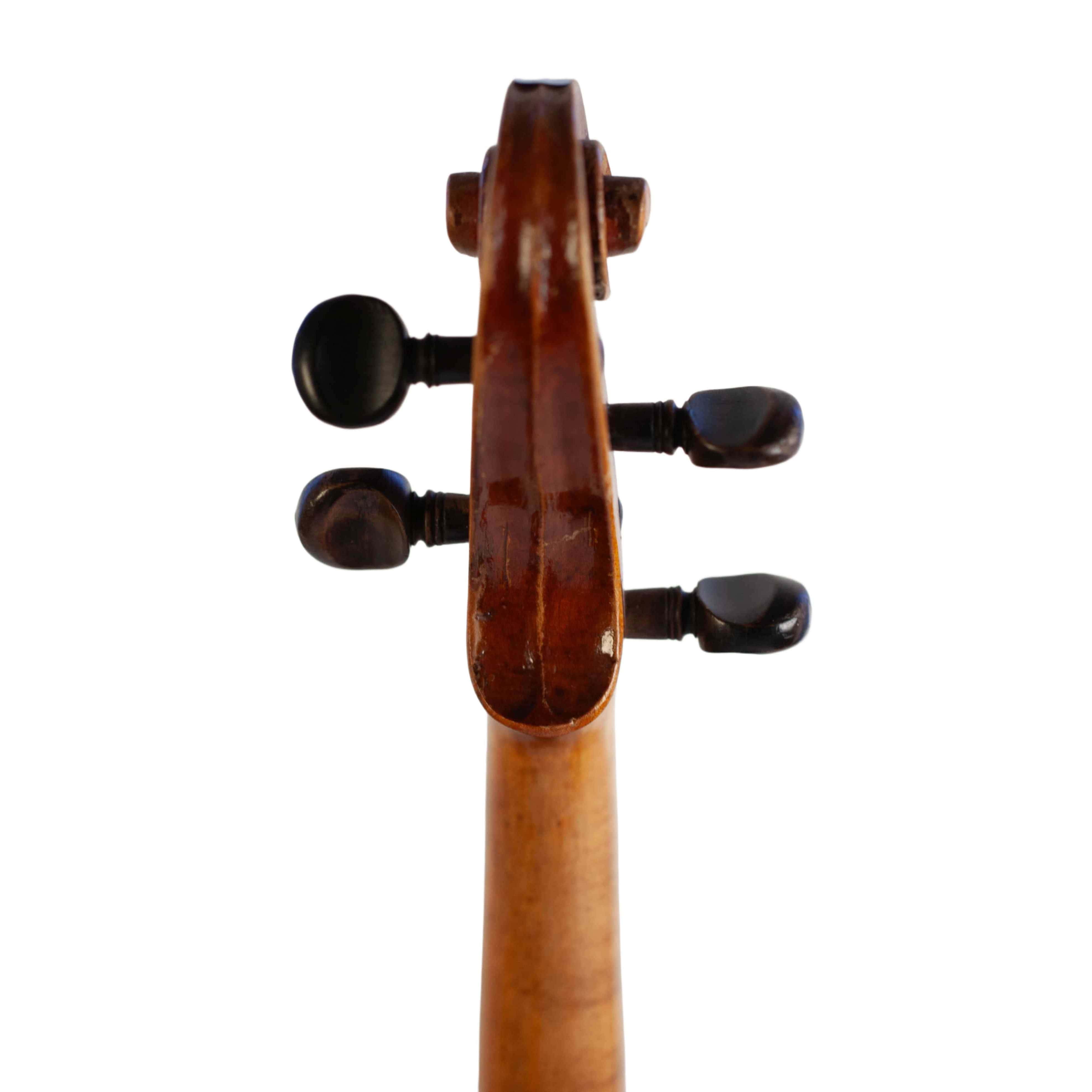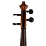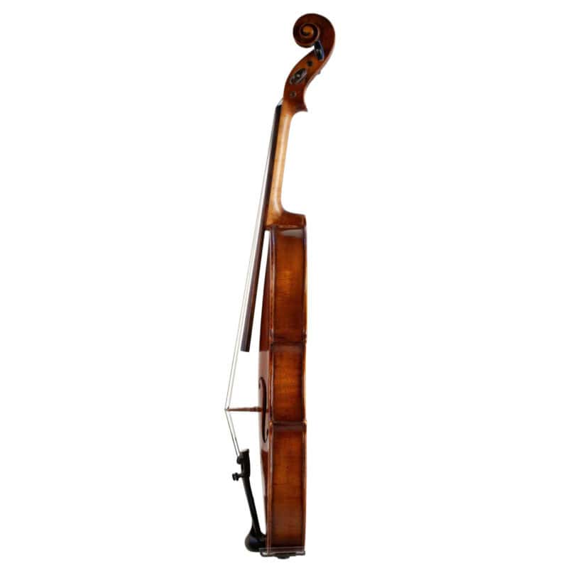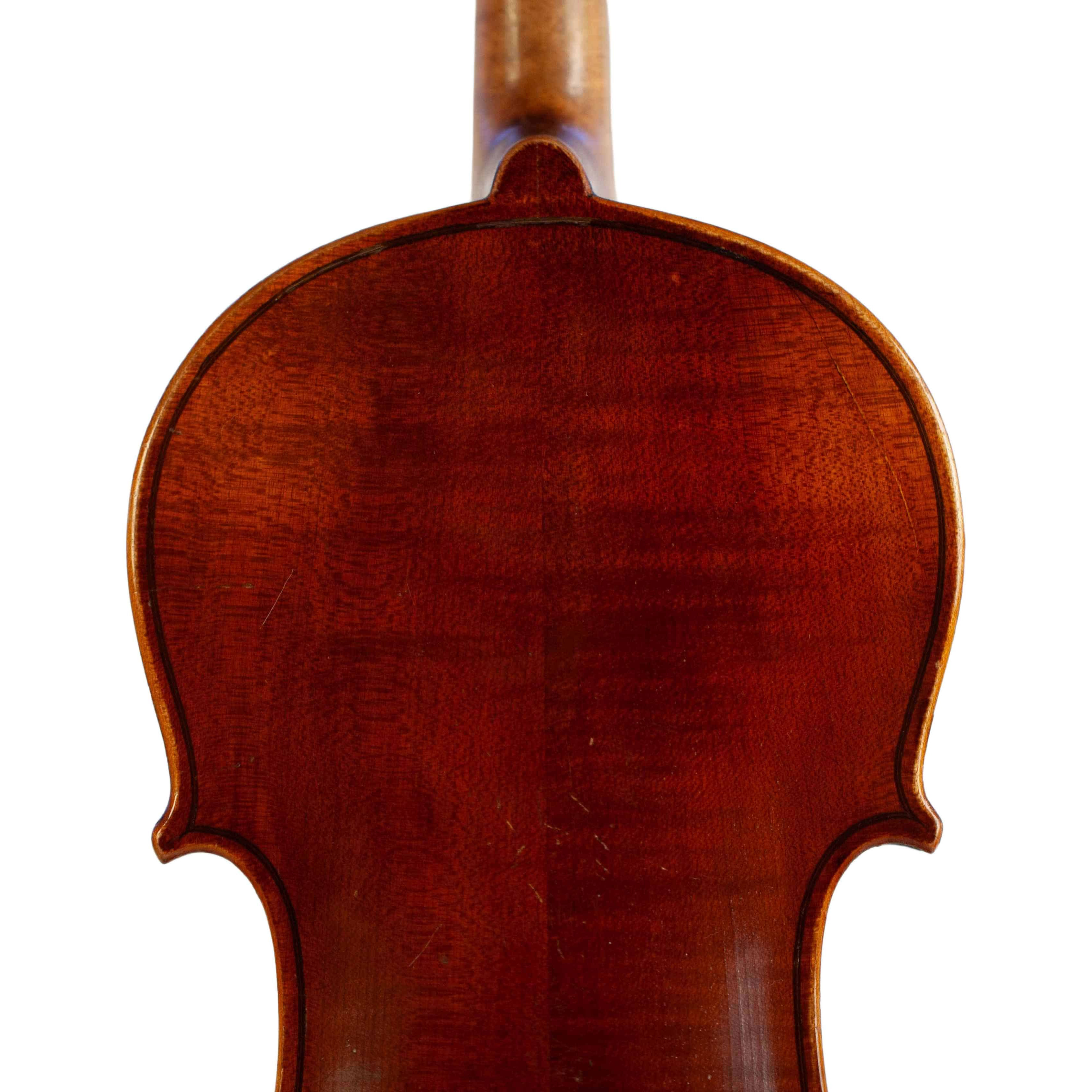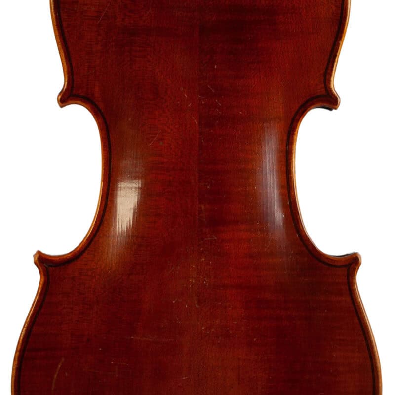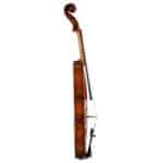 The whole length of the violin is 593 mm and the back 358 mm. The width of the upper bouts: 165 mm; middle bouts: 110 mm; lower bouts: 205 mm.