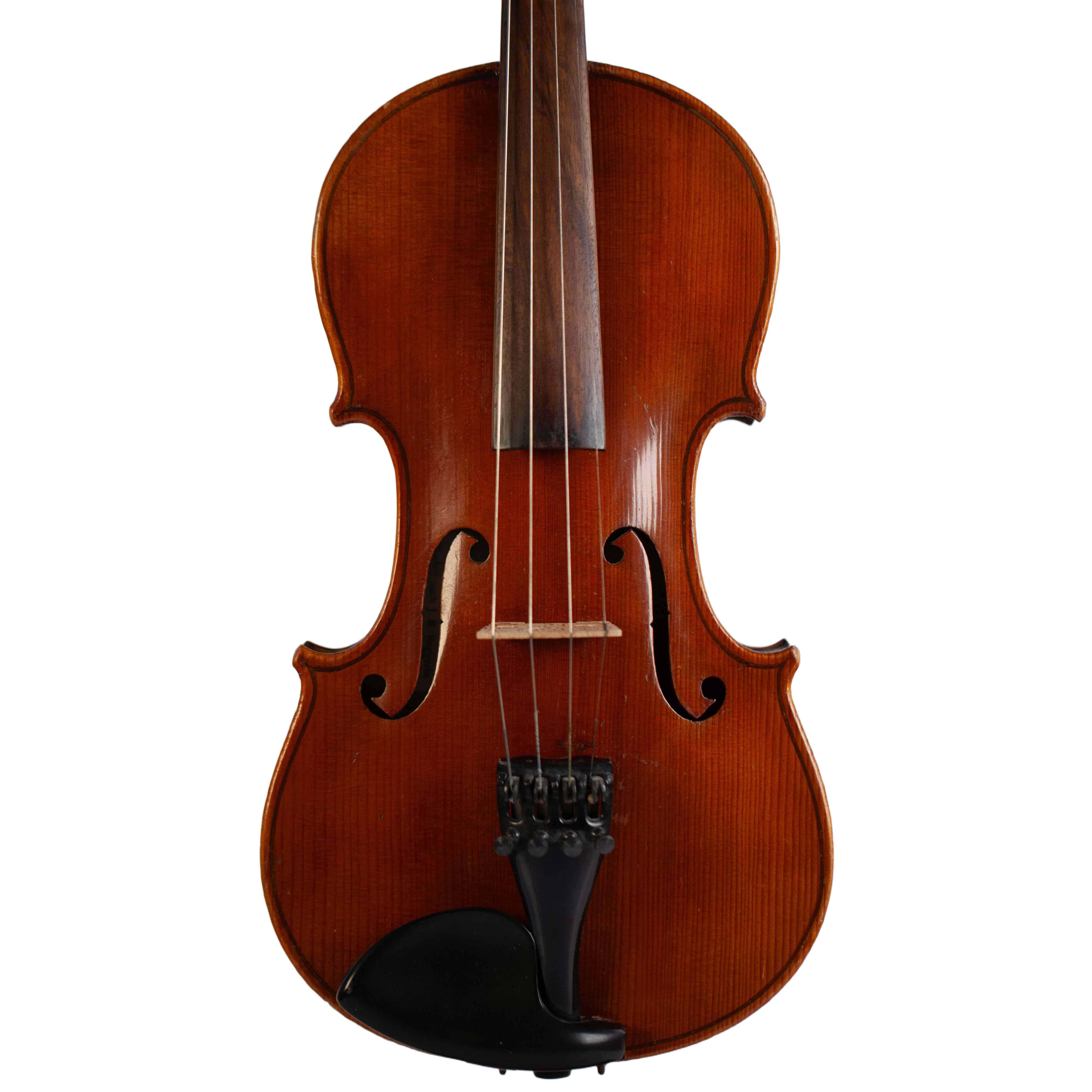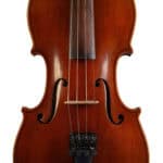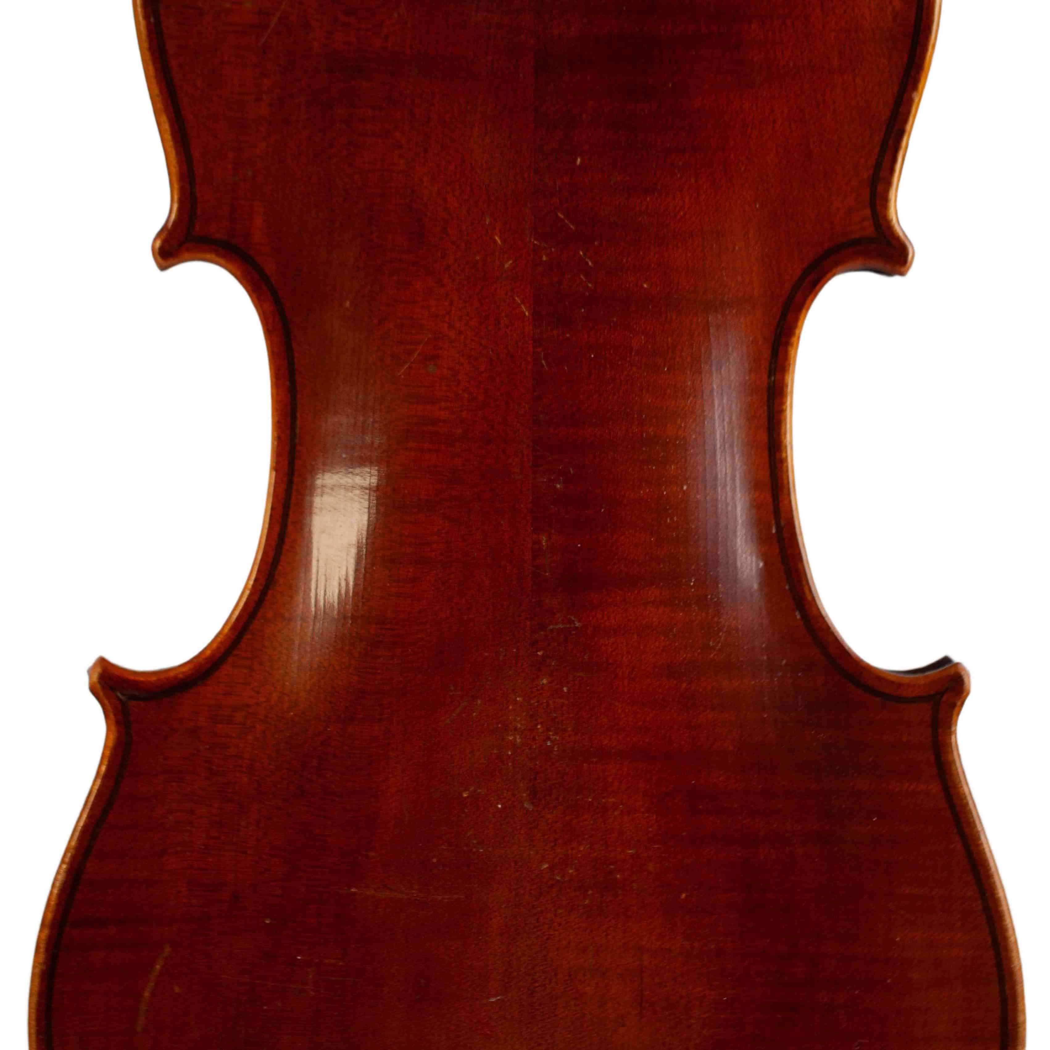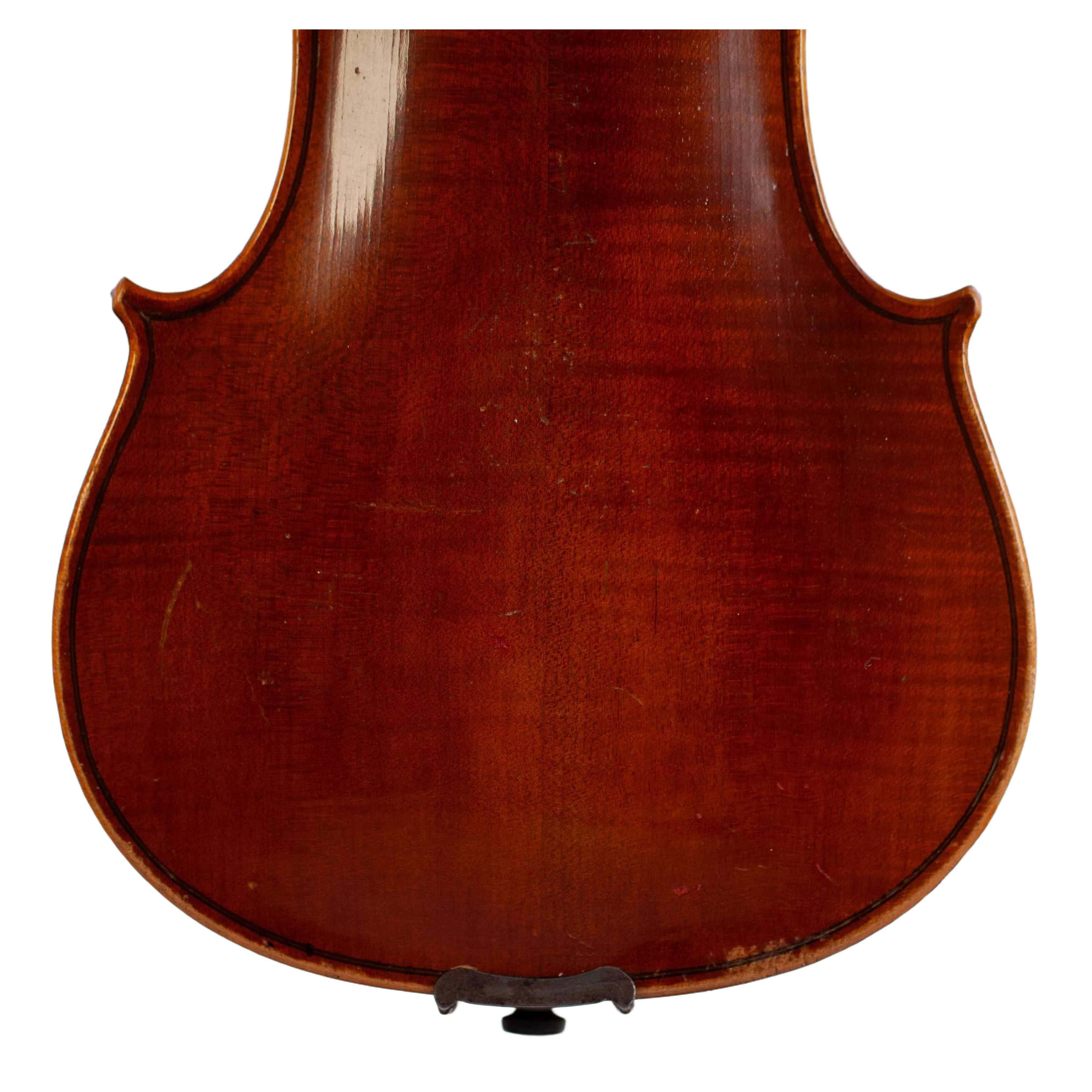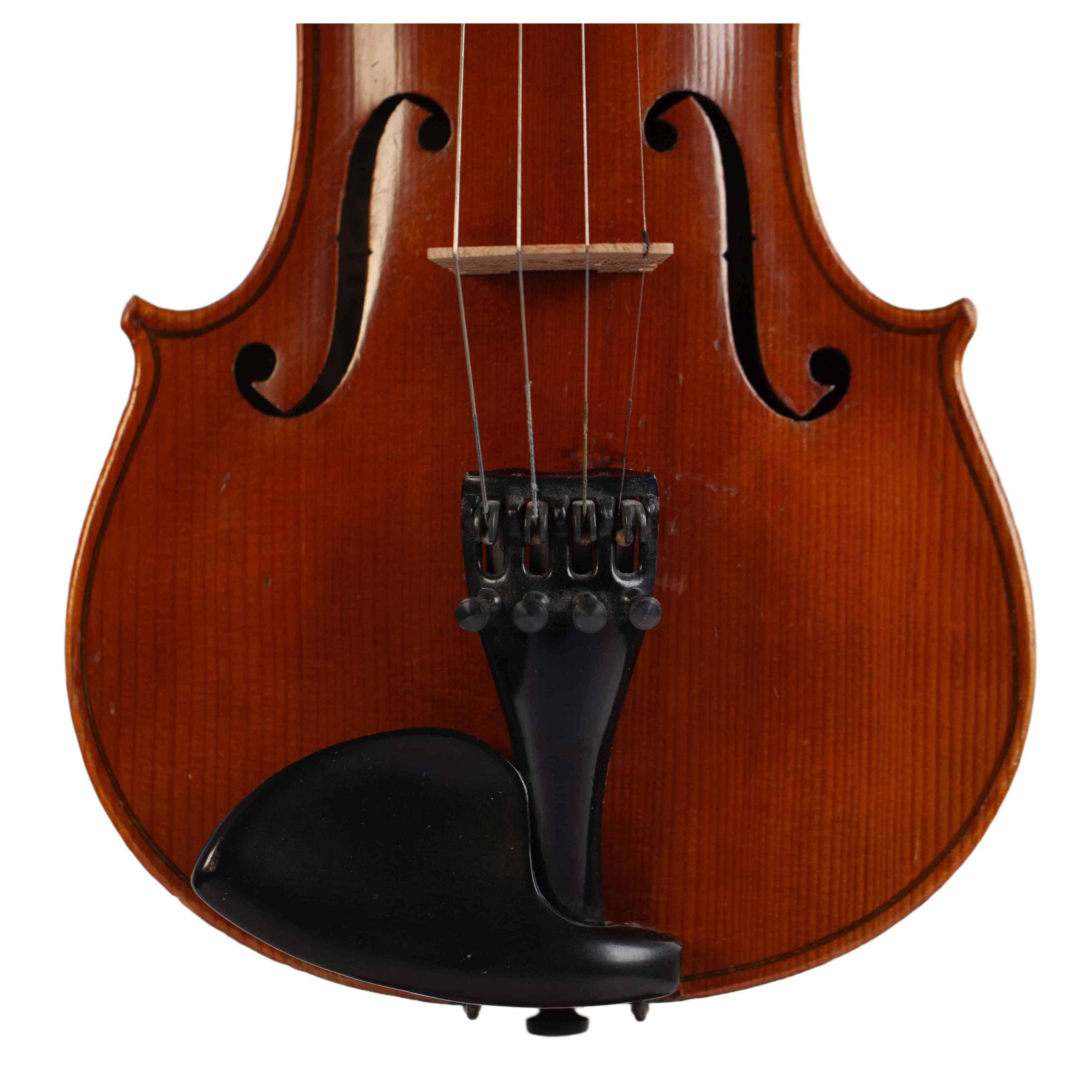 The whole length of the violin is 593 mm and the back 358 mm. The width of the upper bouts: 165 mm; middle bouts: 110 mm; lower bouts: 205 mm.
