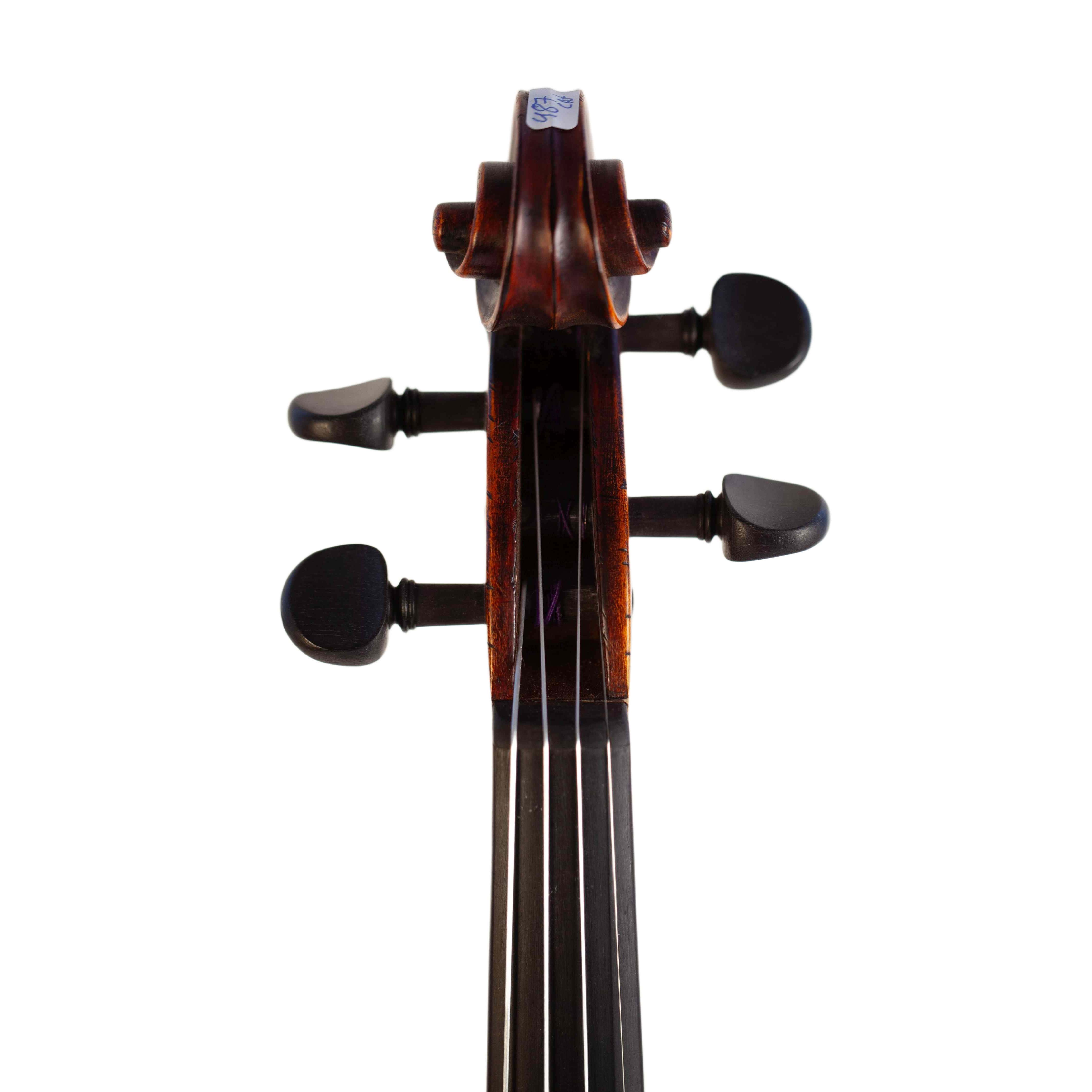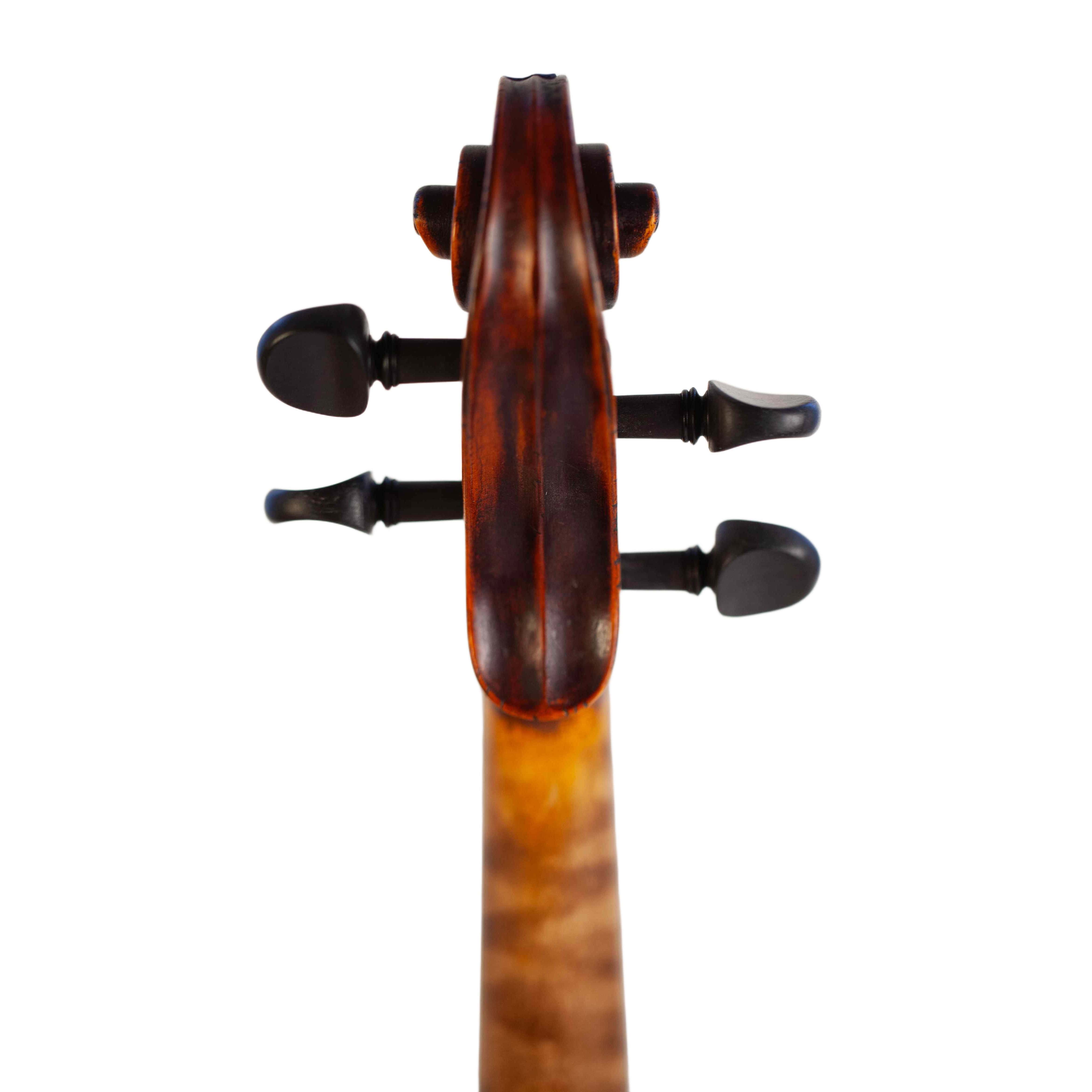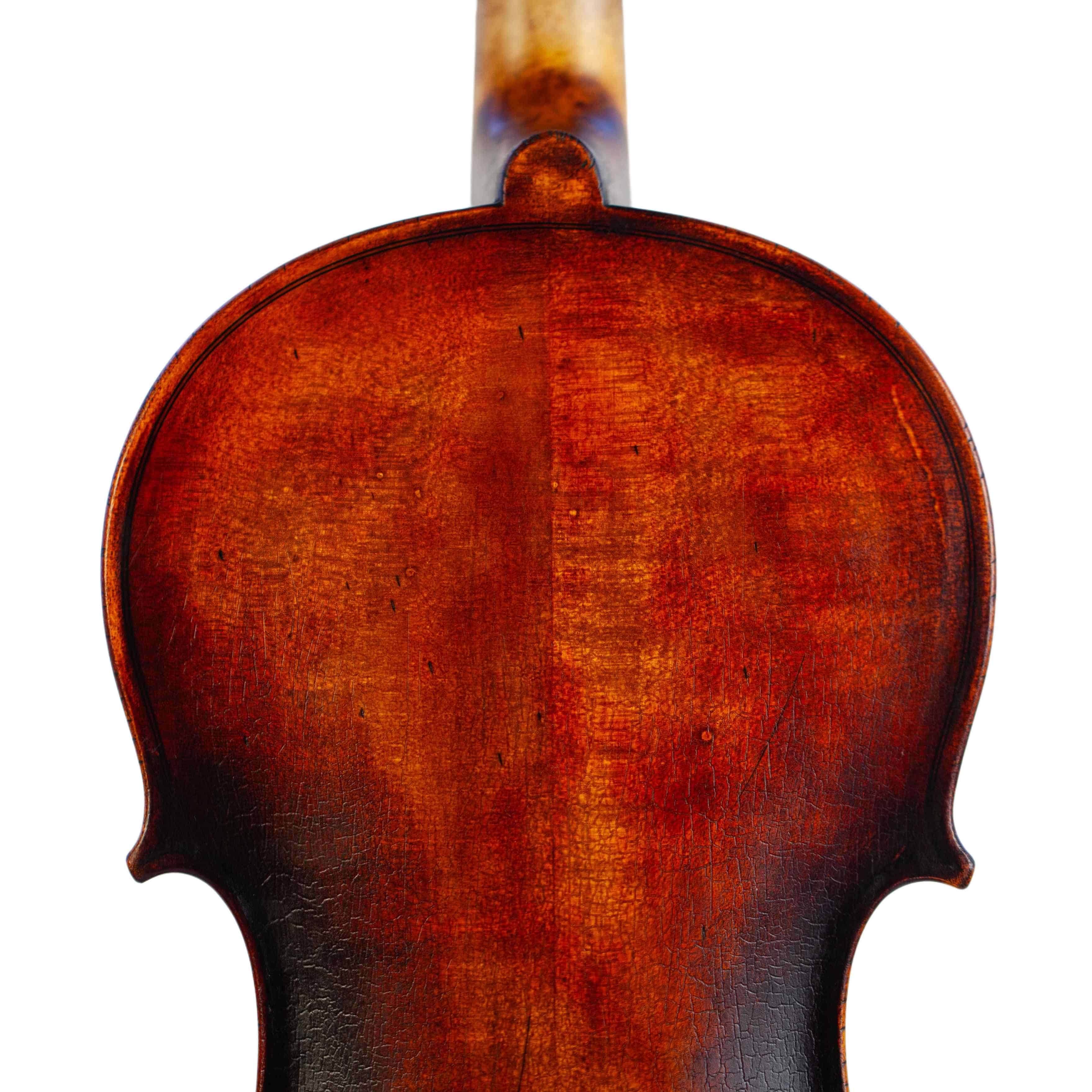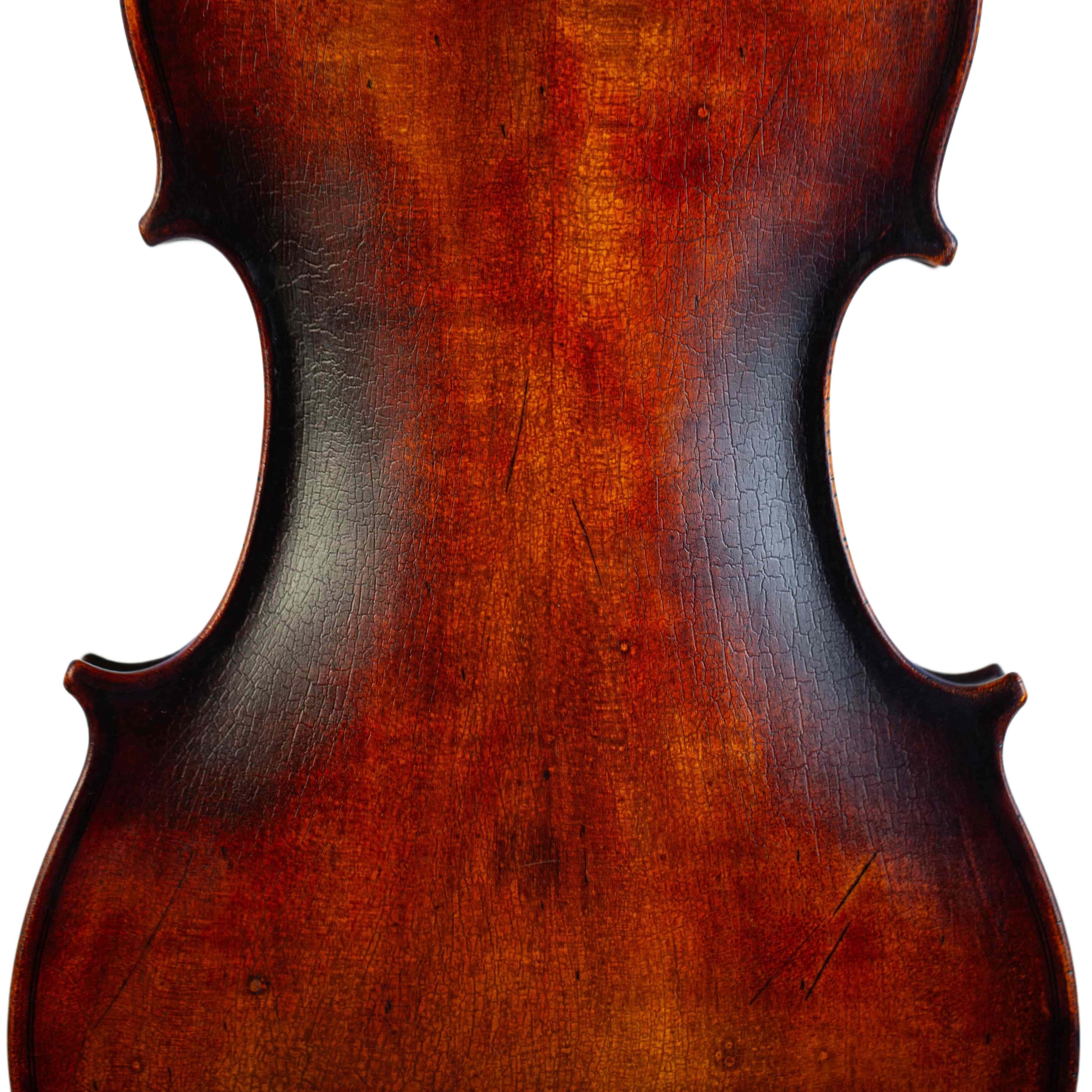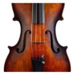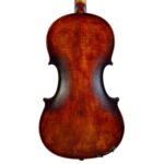 The whole length of the violin is 590 mm and the back 356 mm. The width of the upper bouts: 166 mm; middle bouts: 113 mm; lower bouts: 209 mm.