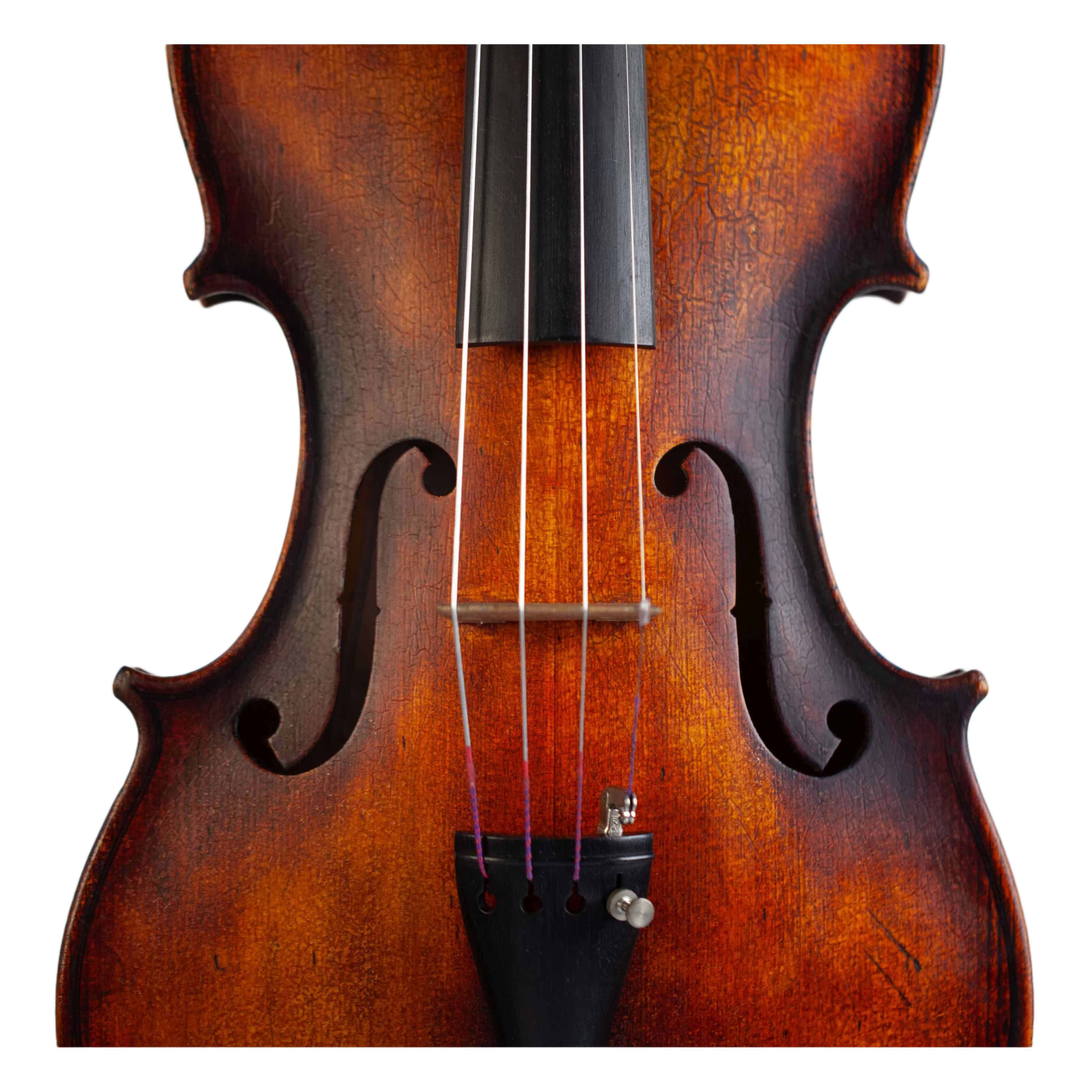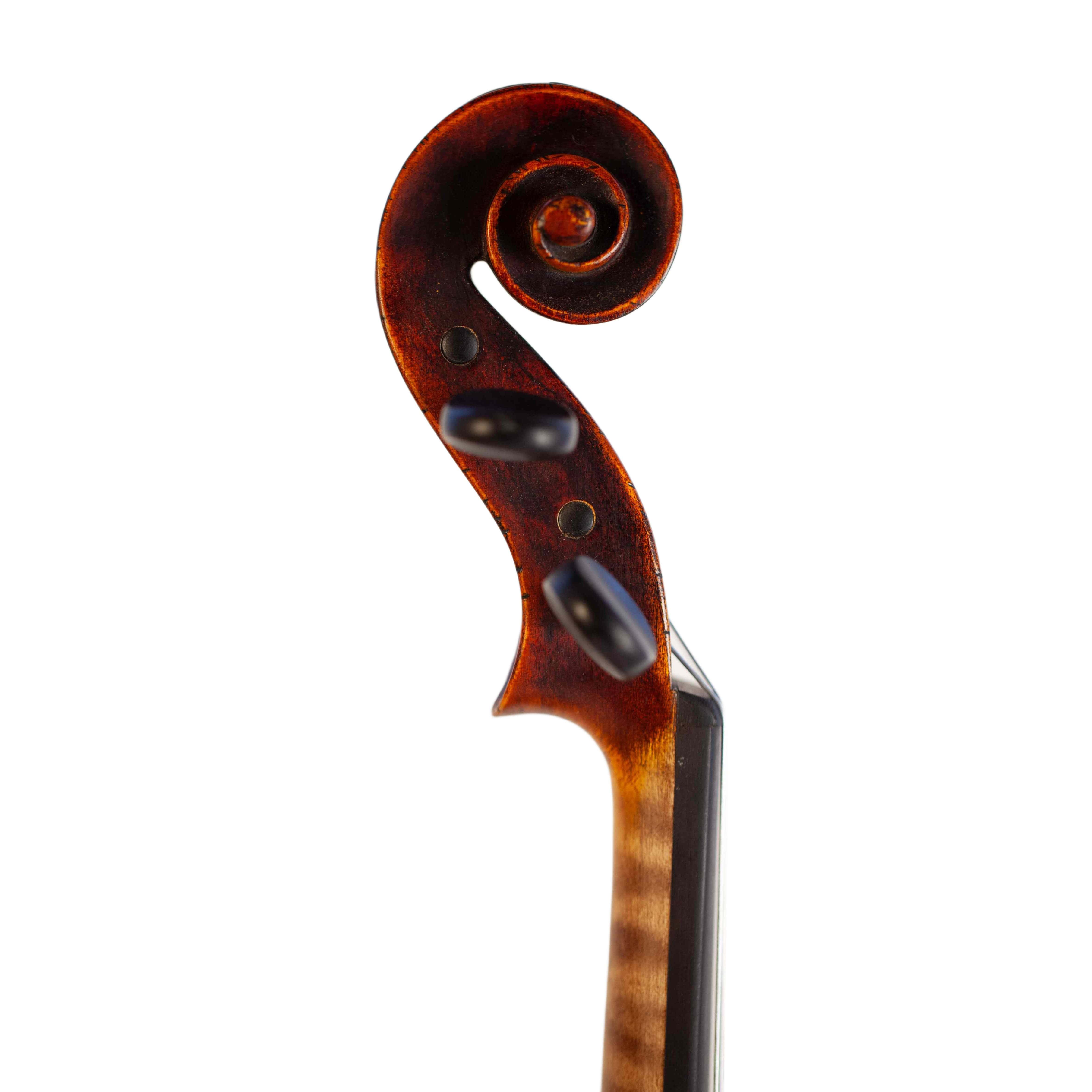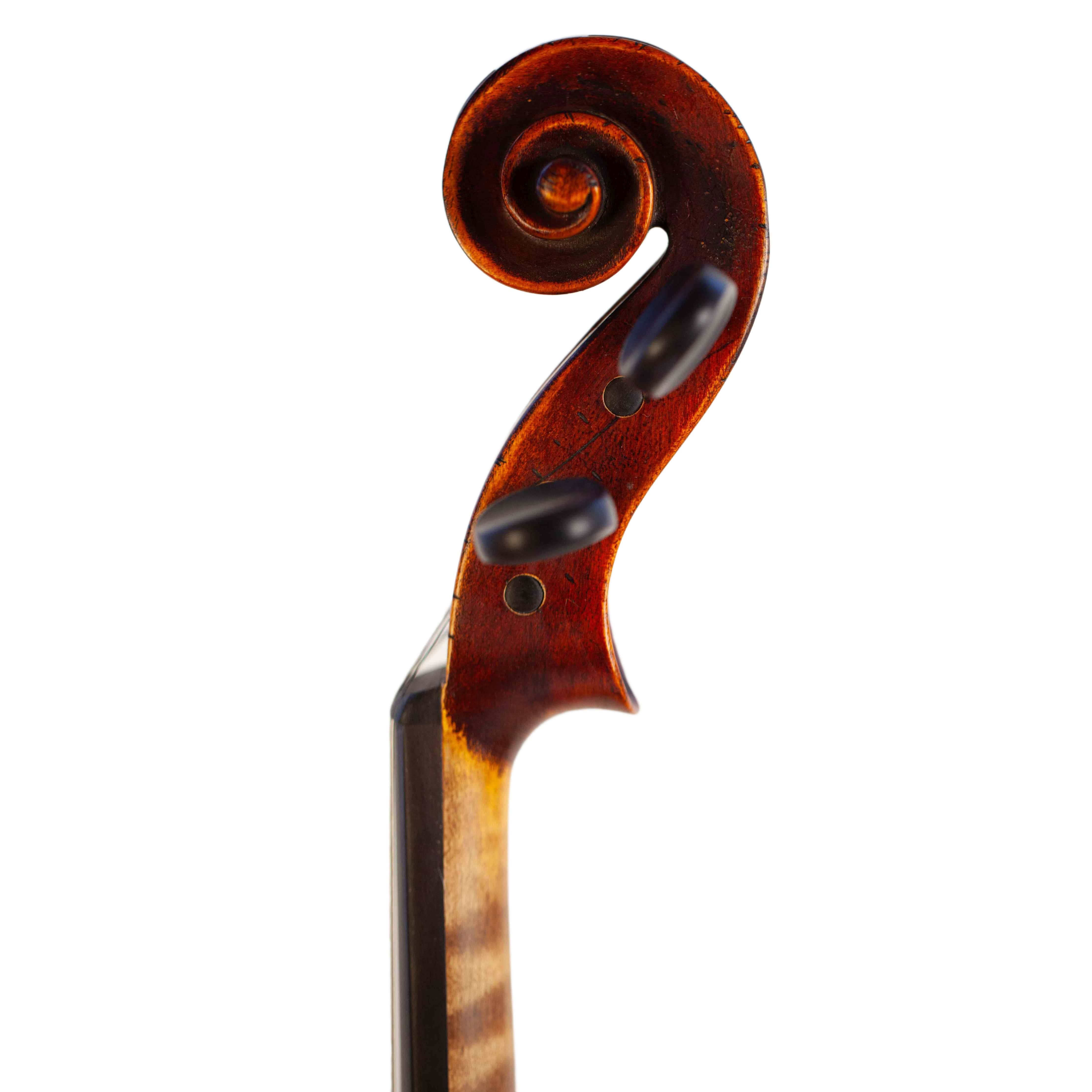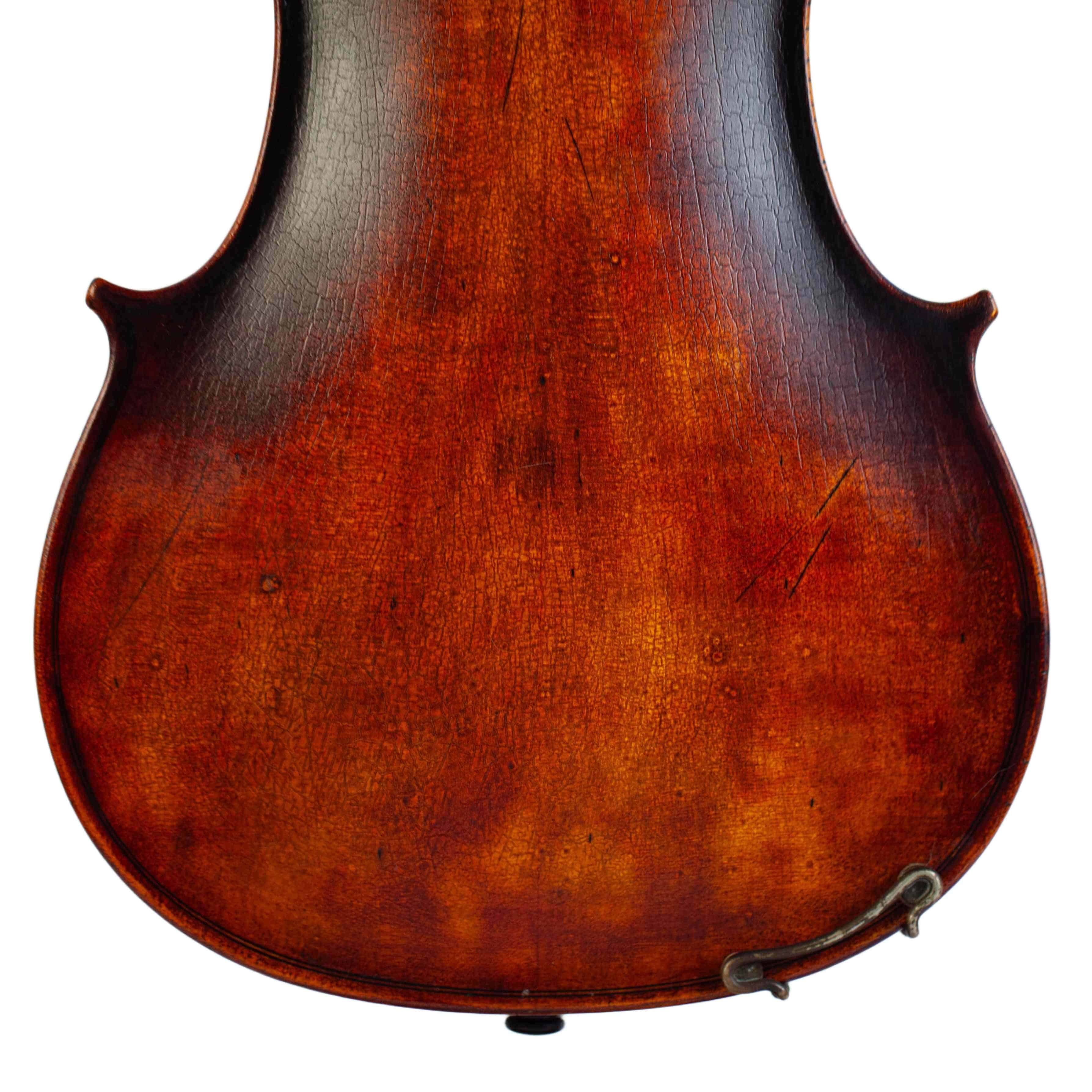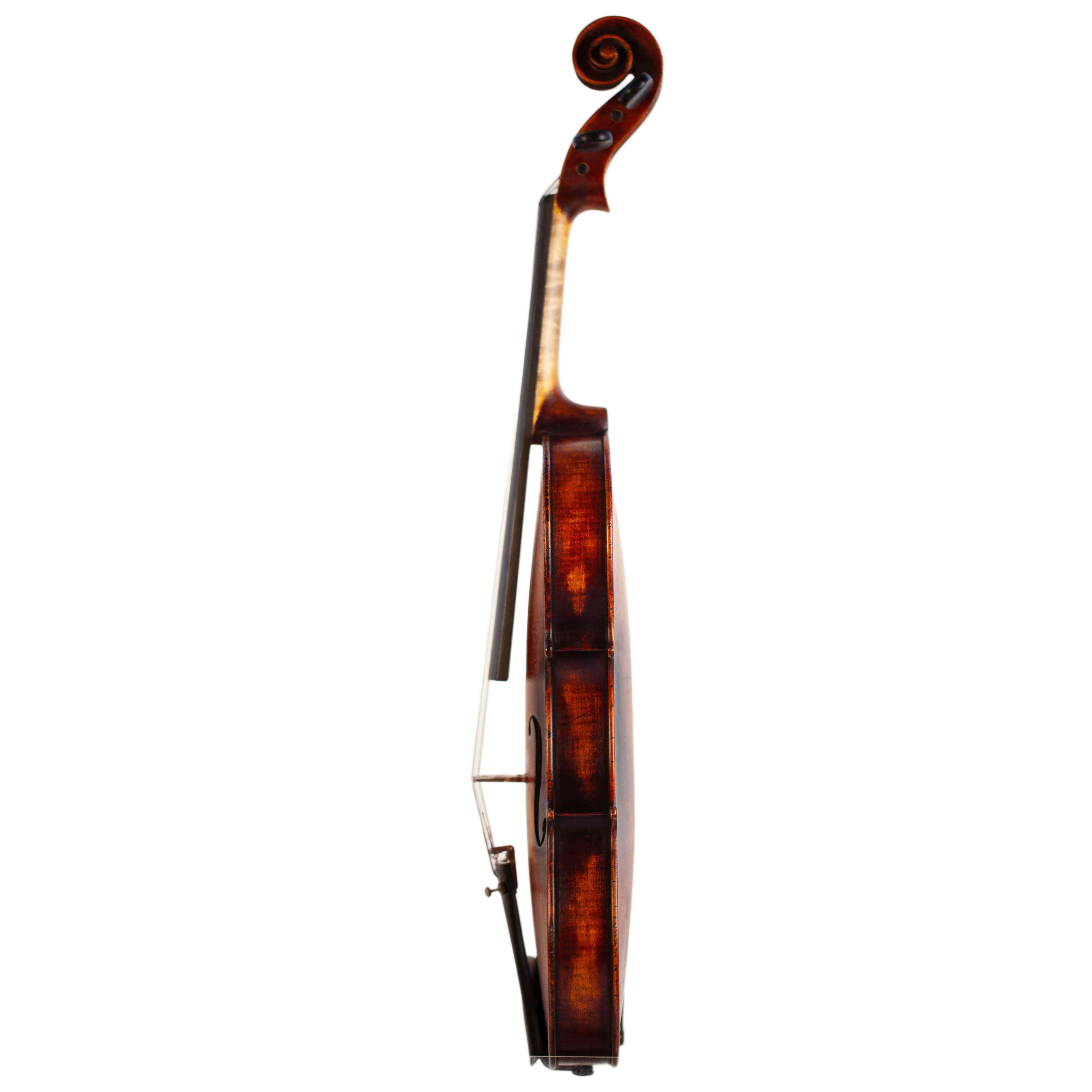 The whole length of the violin is 590 mm and the back 356 mm. The width of the upper bouts: 166 mm; middle bouts: 113 mm; lower bouts: 209 mm.
