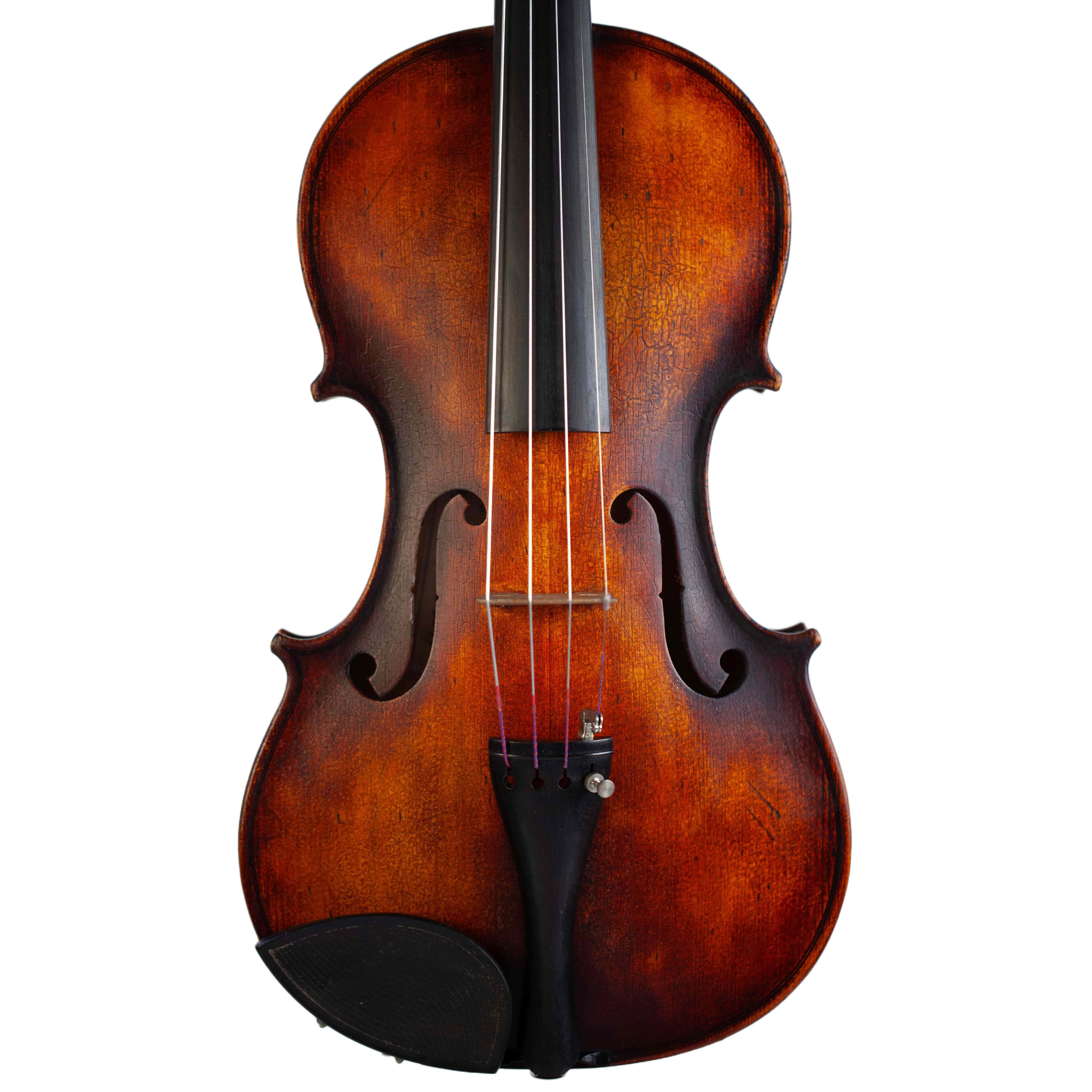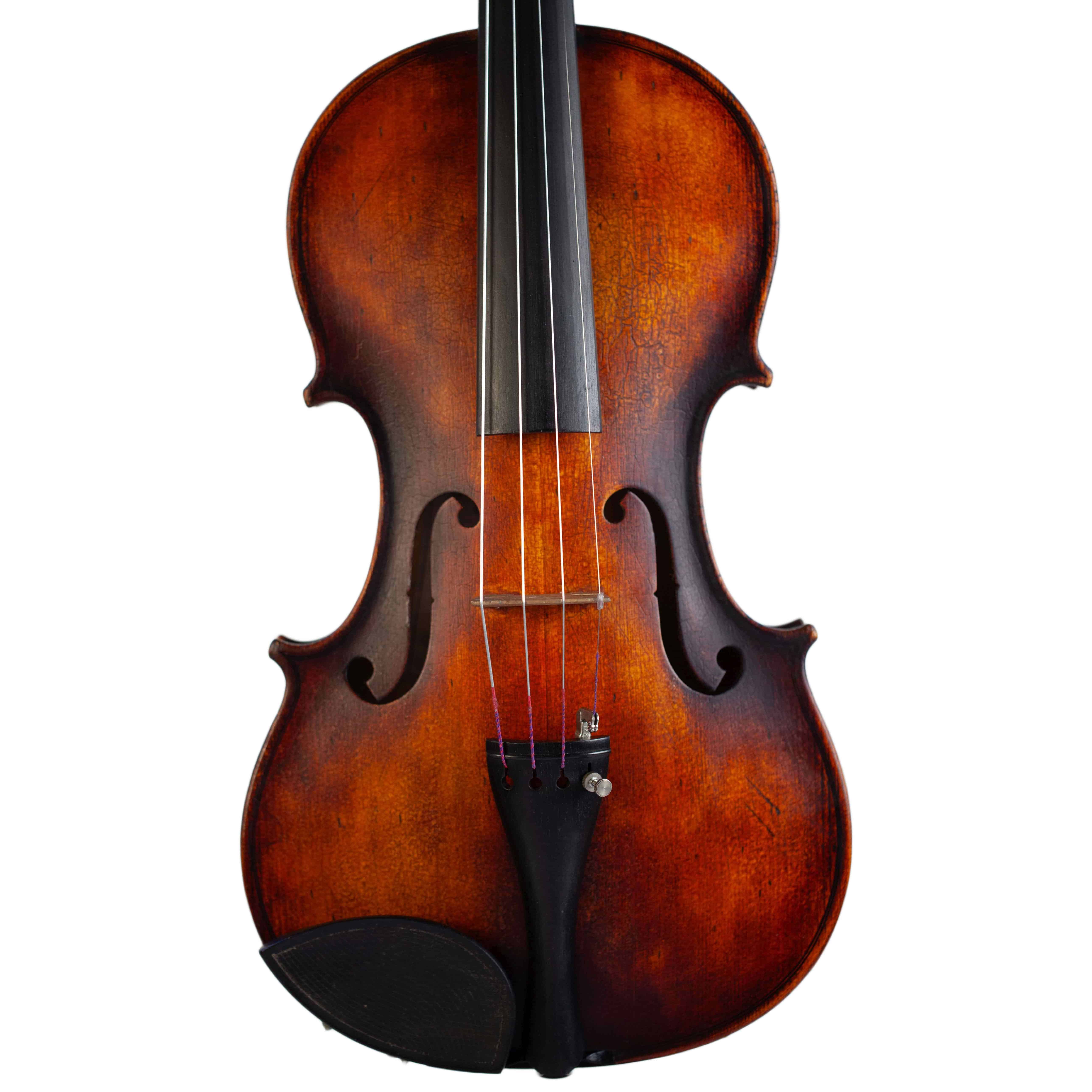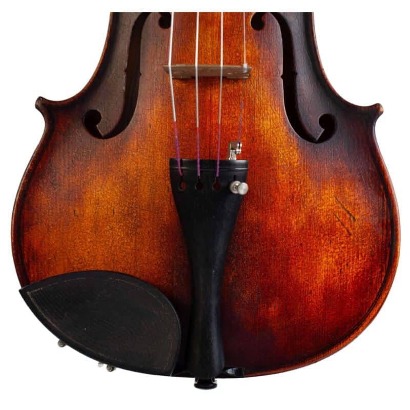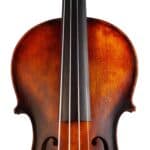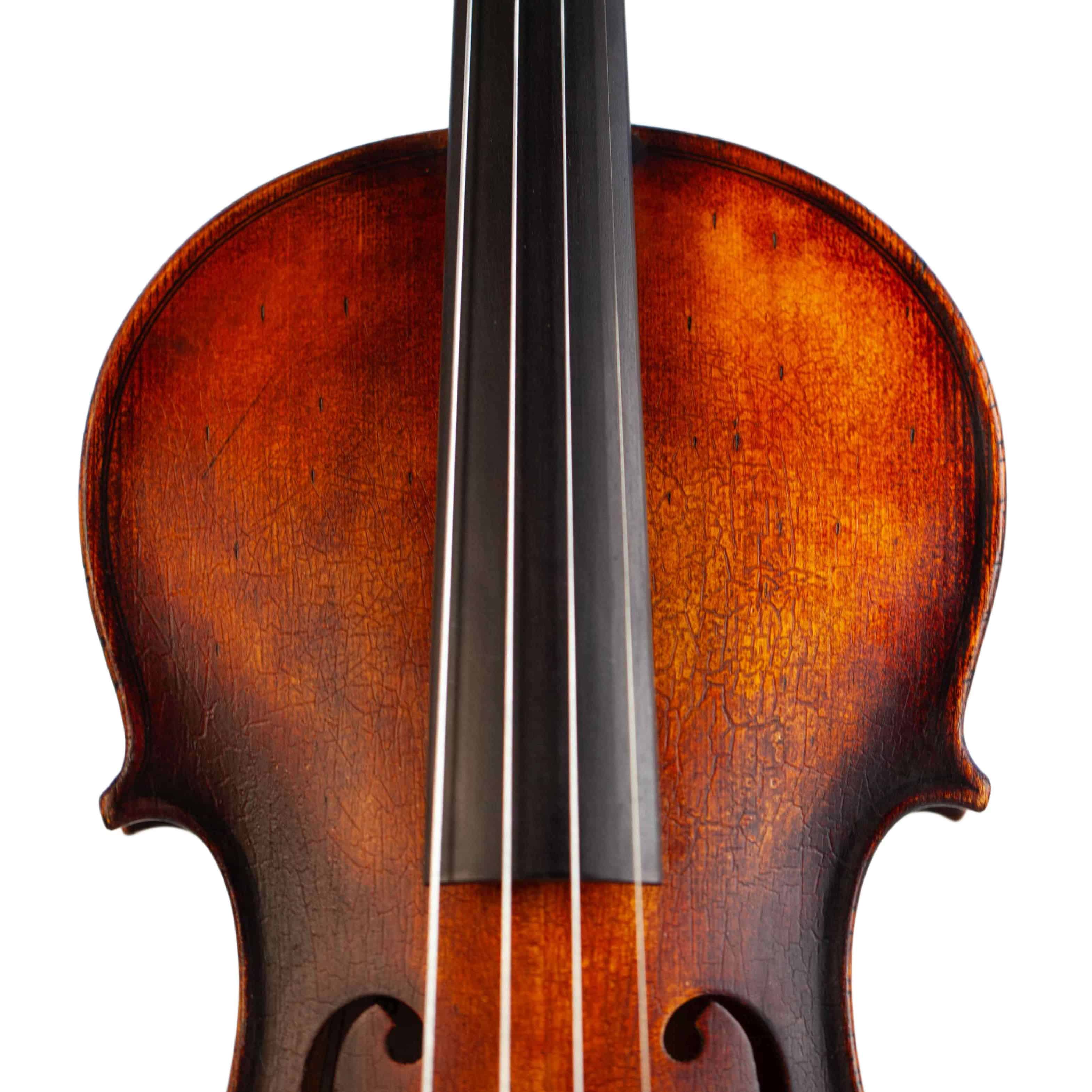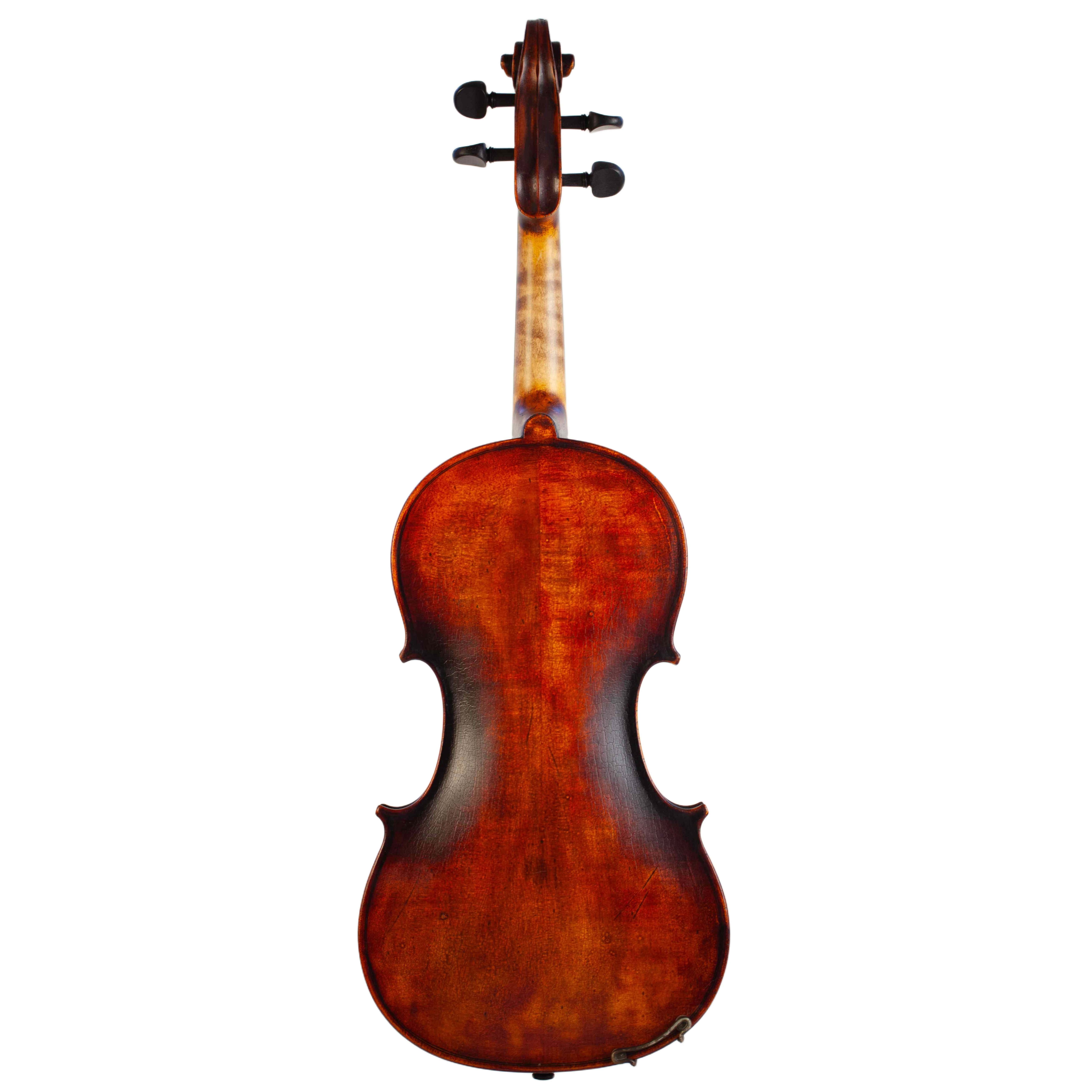 The whole length of the violin is 590 mm and the back 356 mm. The width of the upper bouts: 166 mm; middle bouts: 113 mm; lower bouts: 209 mm.