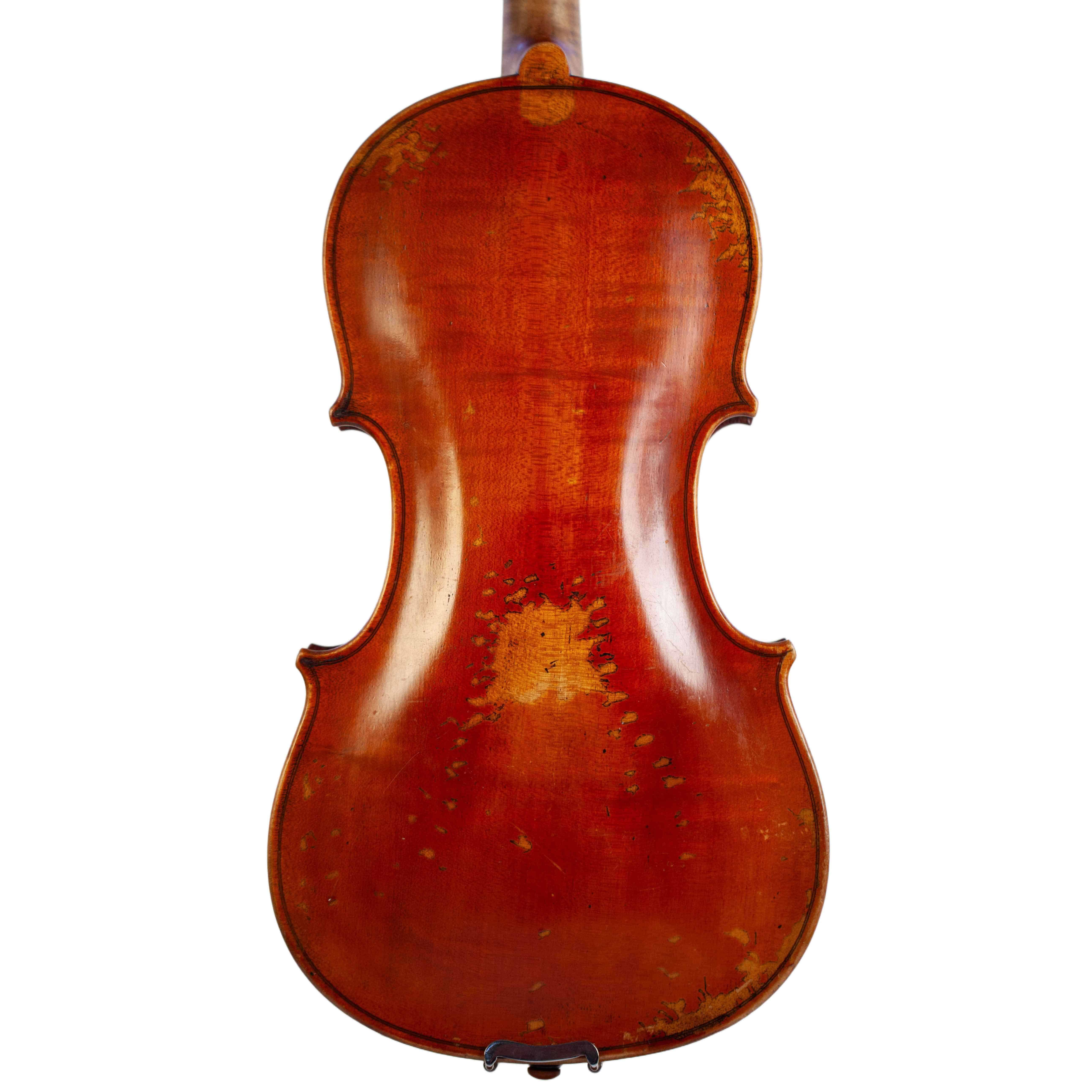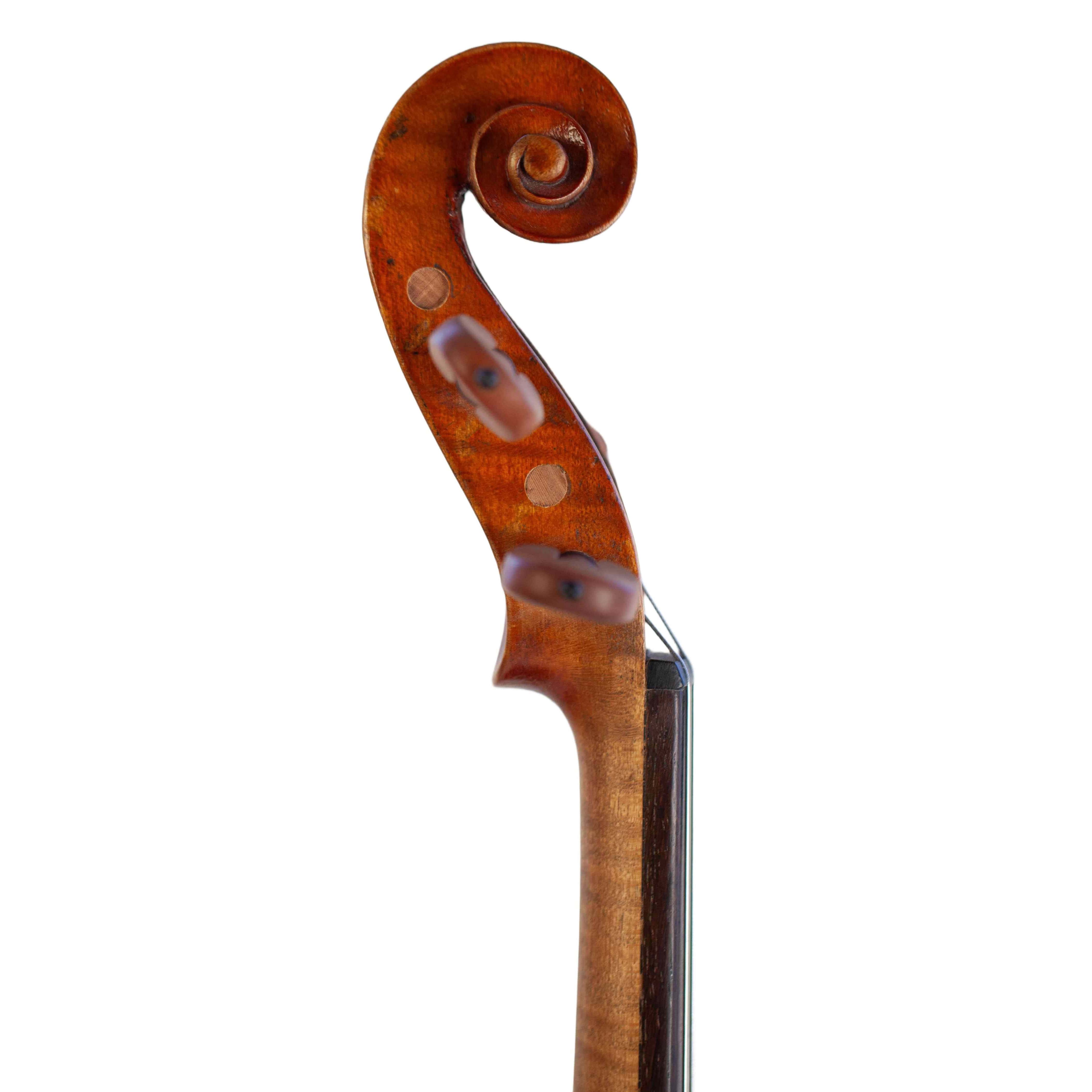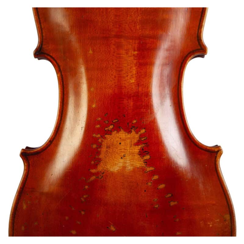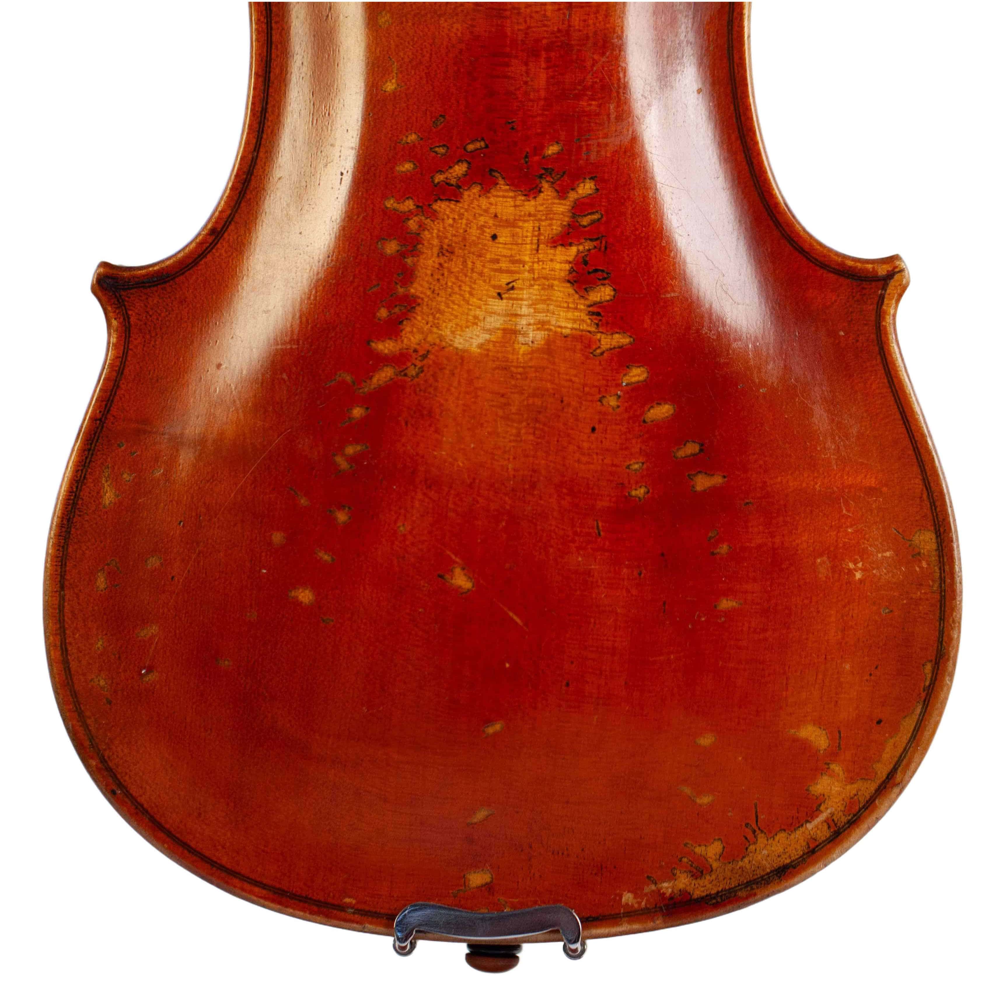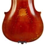 The whole length of the violin is 597 mm and the back 364 mm. The width of the upper bouts: 164 mm; middle bouts: 117 mm; lower bouts: 207 mm.