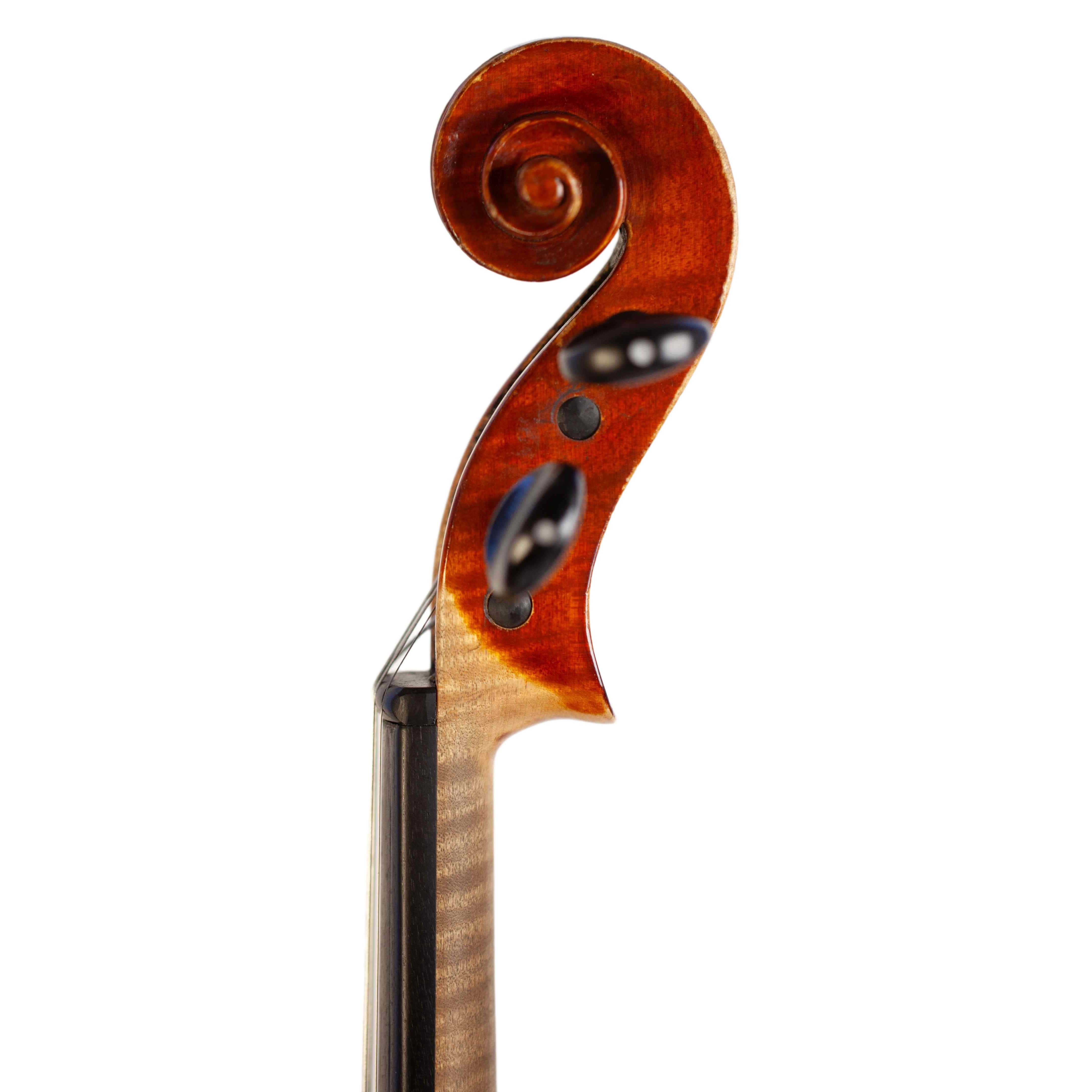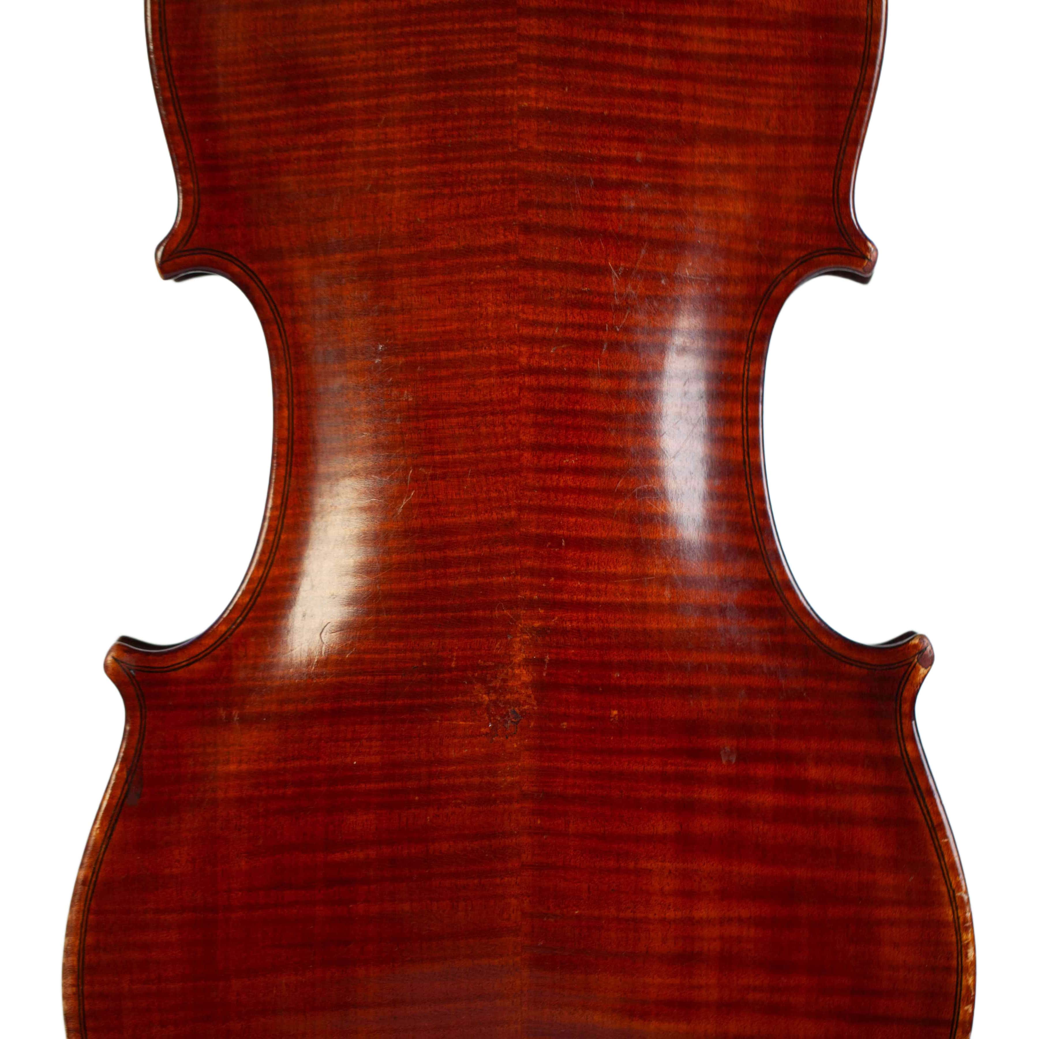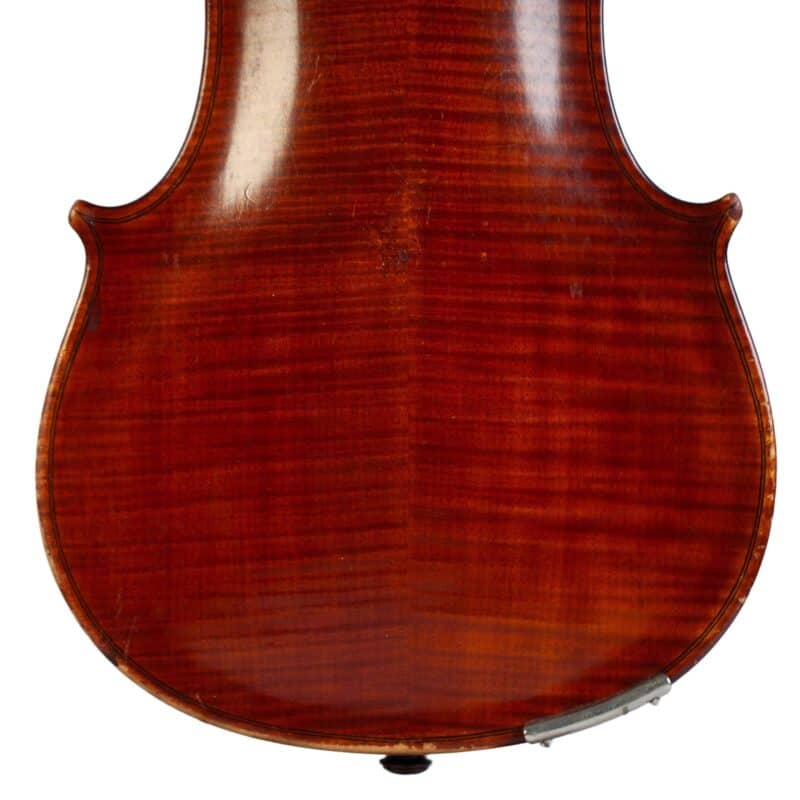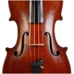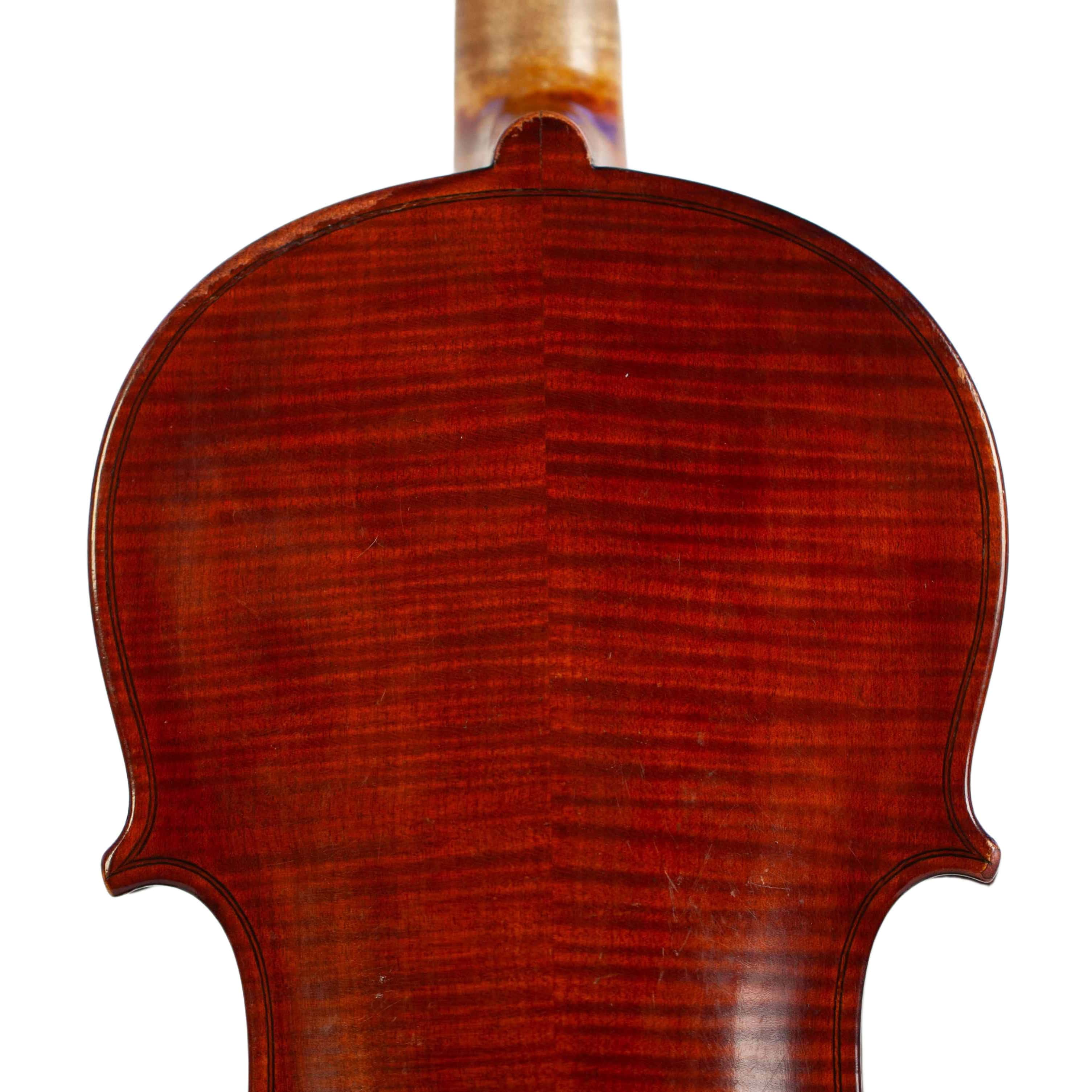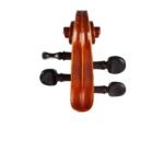 The whole length of the violin is 597 mm and the back 360 mm. The width of the upper bouts: 163 mm; middle bouts: 111 mm; lower bouts: 202 mm.