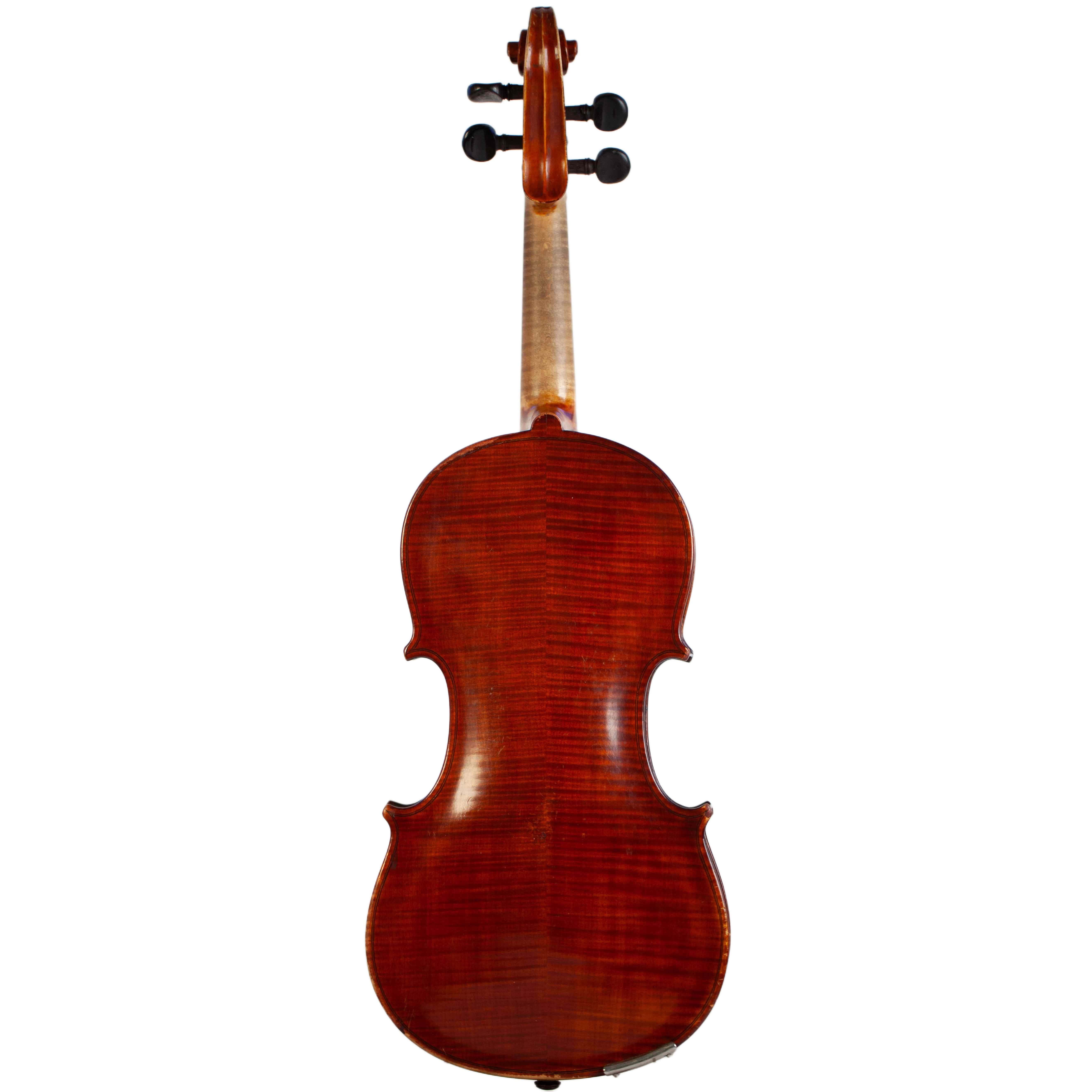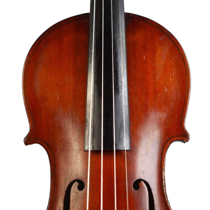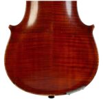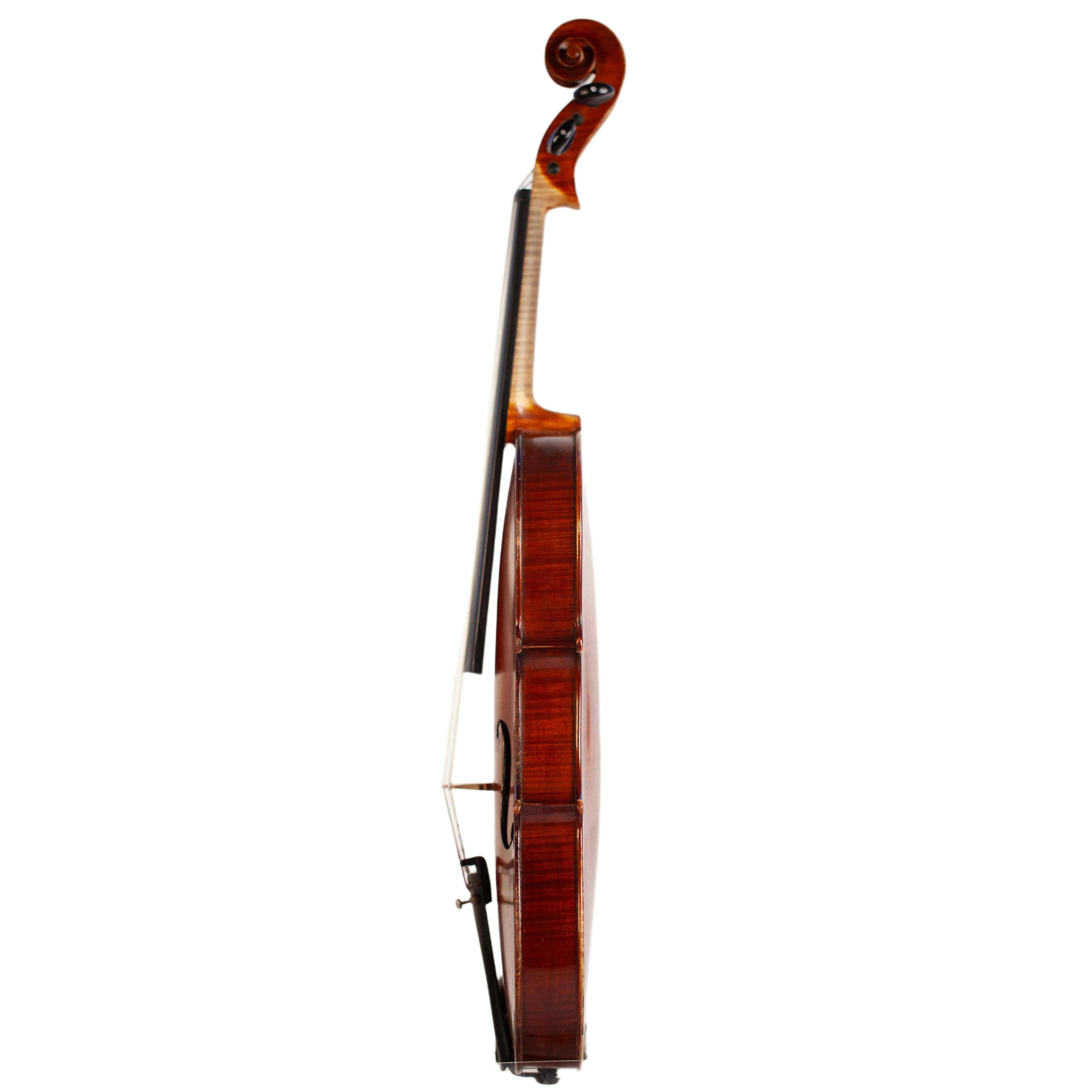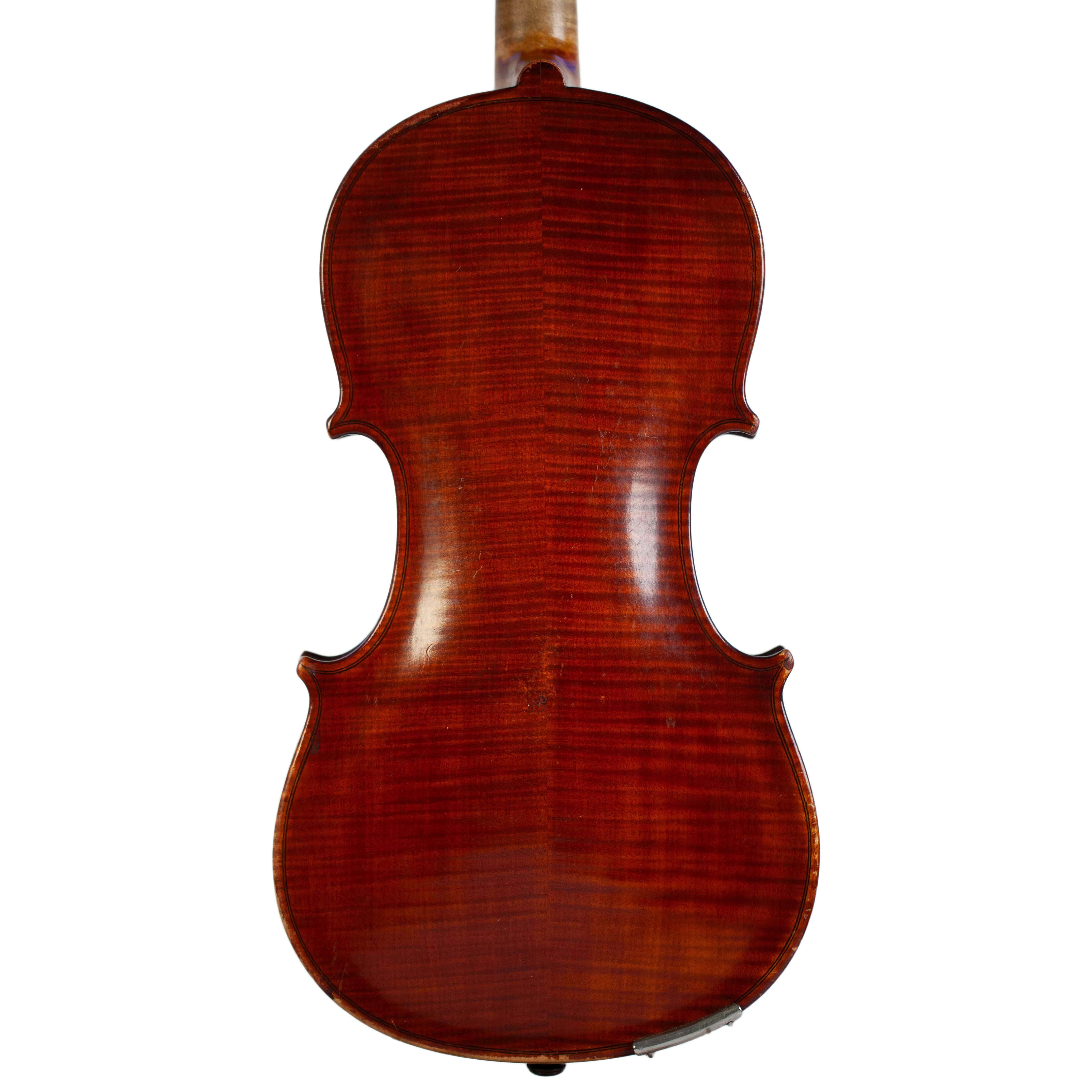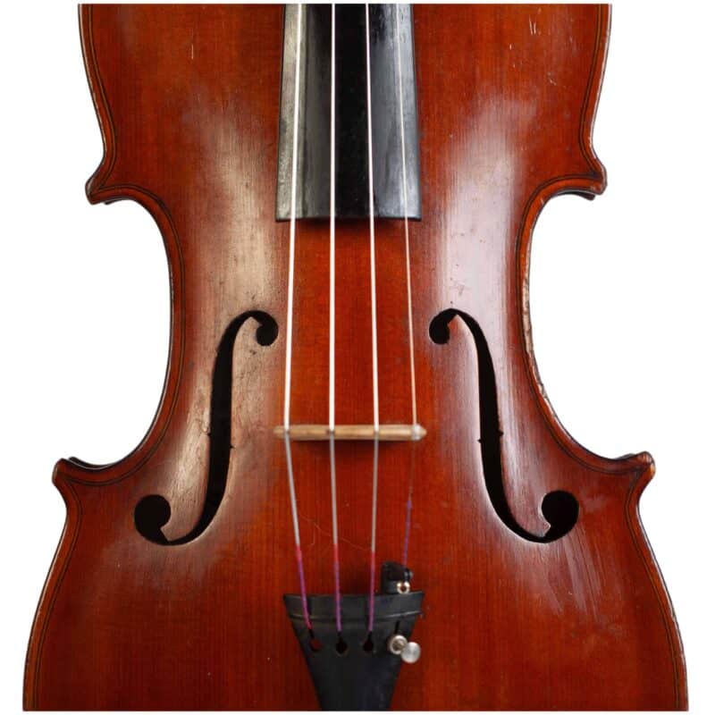 The whole length of the violin is 597 mm and the back 360 mm. The width of the upper bouts: 163 mm; middle bouts: 111 mm; lower bouts: 202 mm.