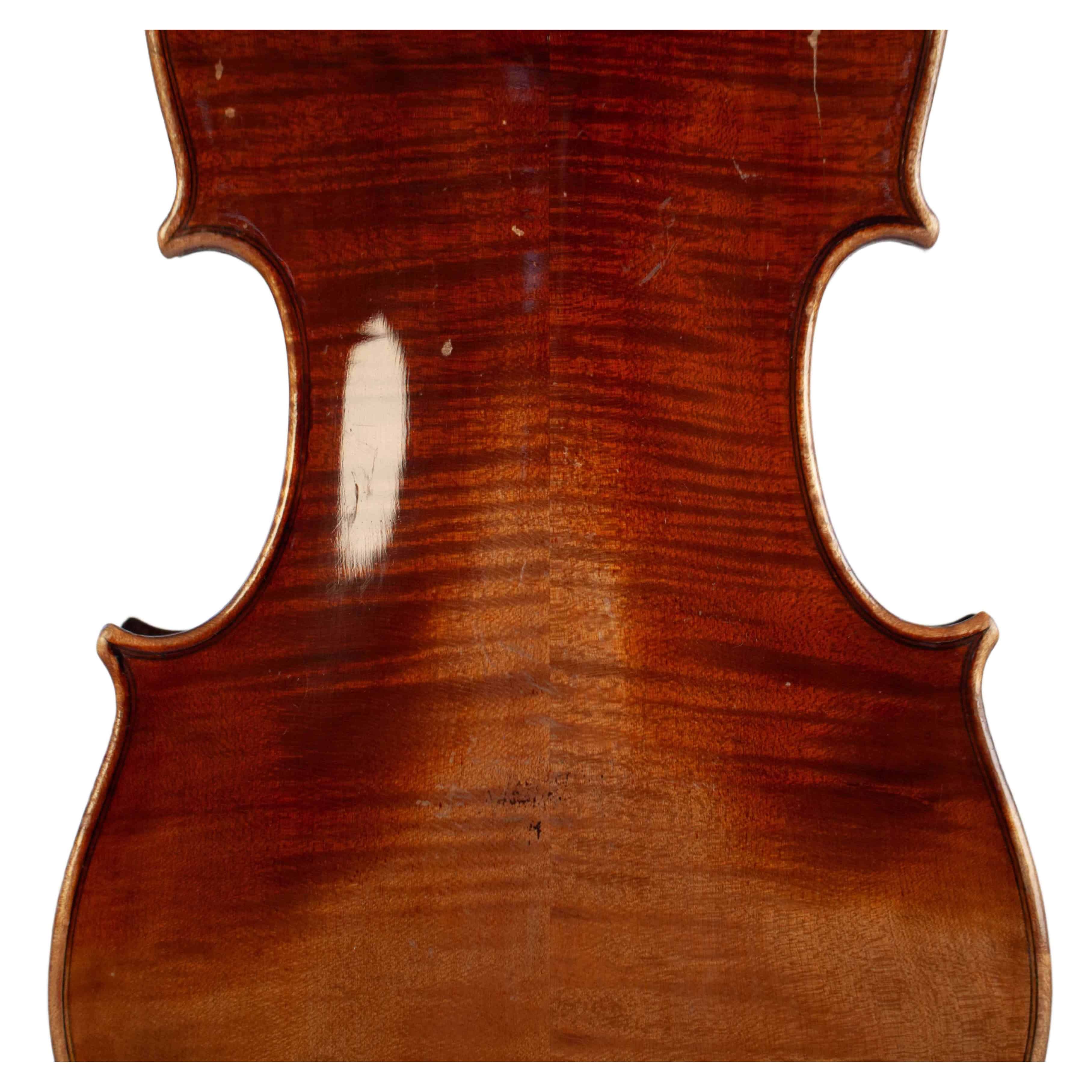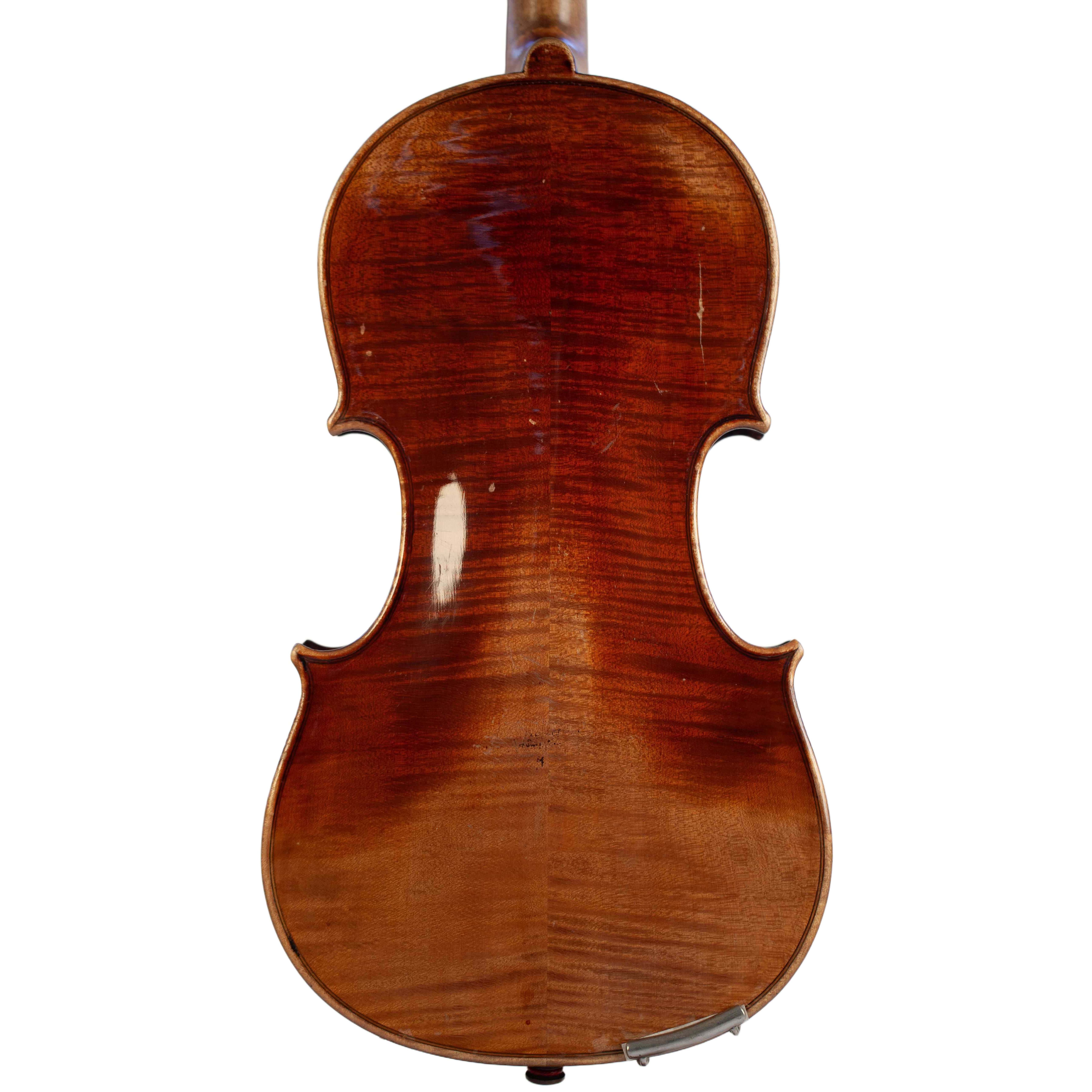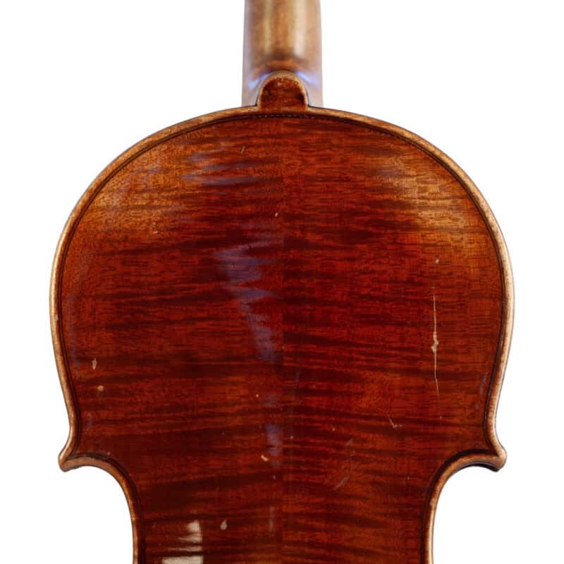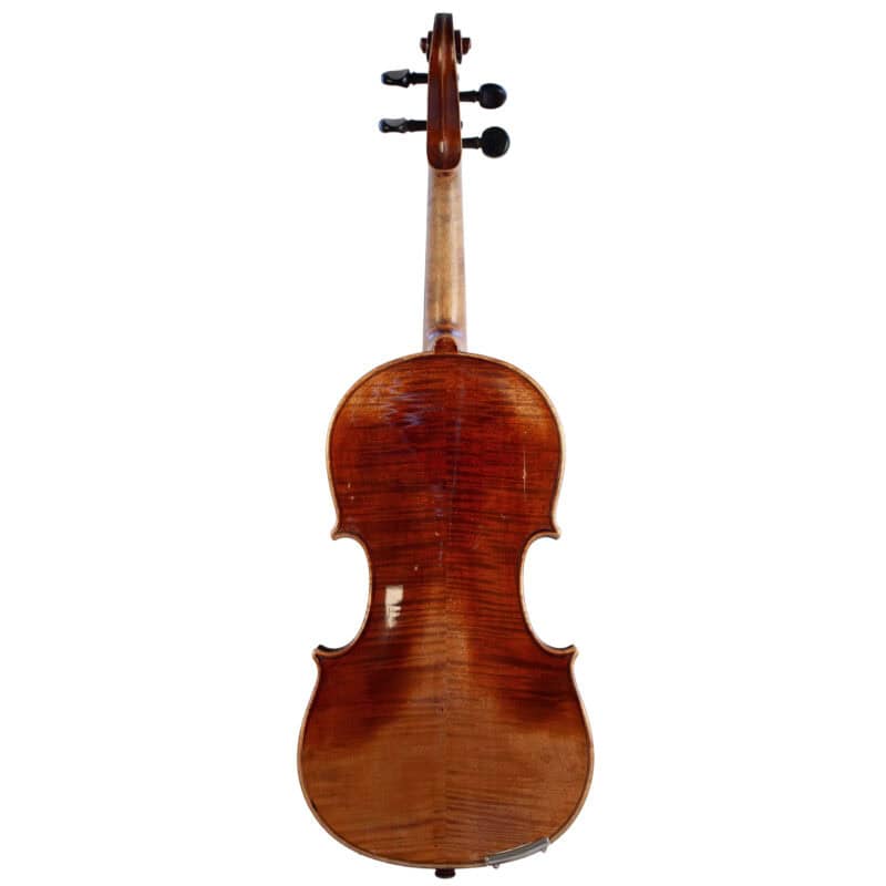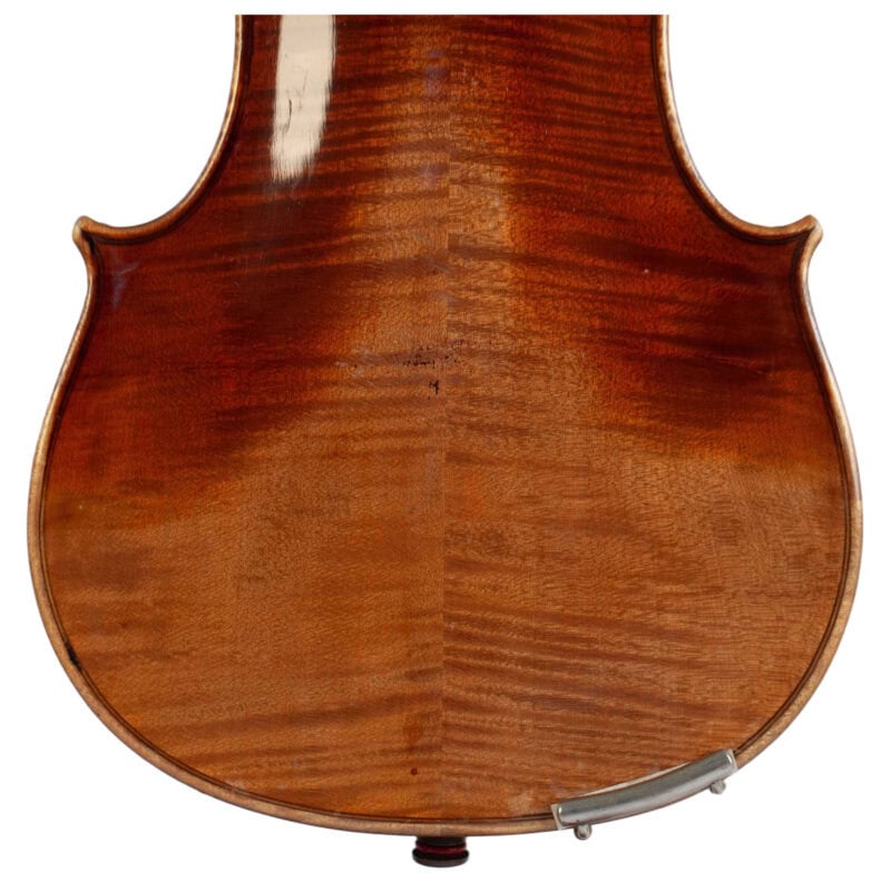 The whole length of the violin is 596 mm and the back 361 mm. The width of the upper bouts: 168 mm; middle bouts: 111 mm; lower bouts: 207 mm.