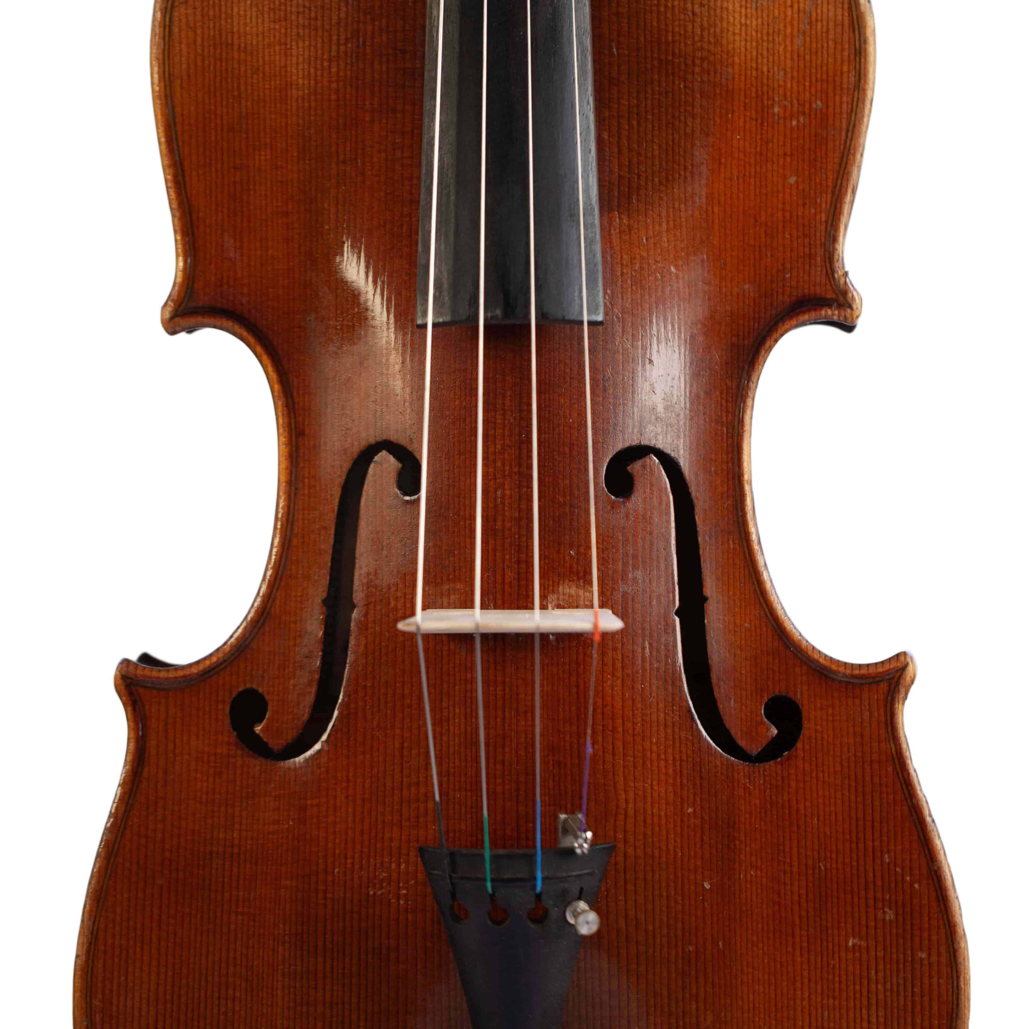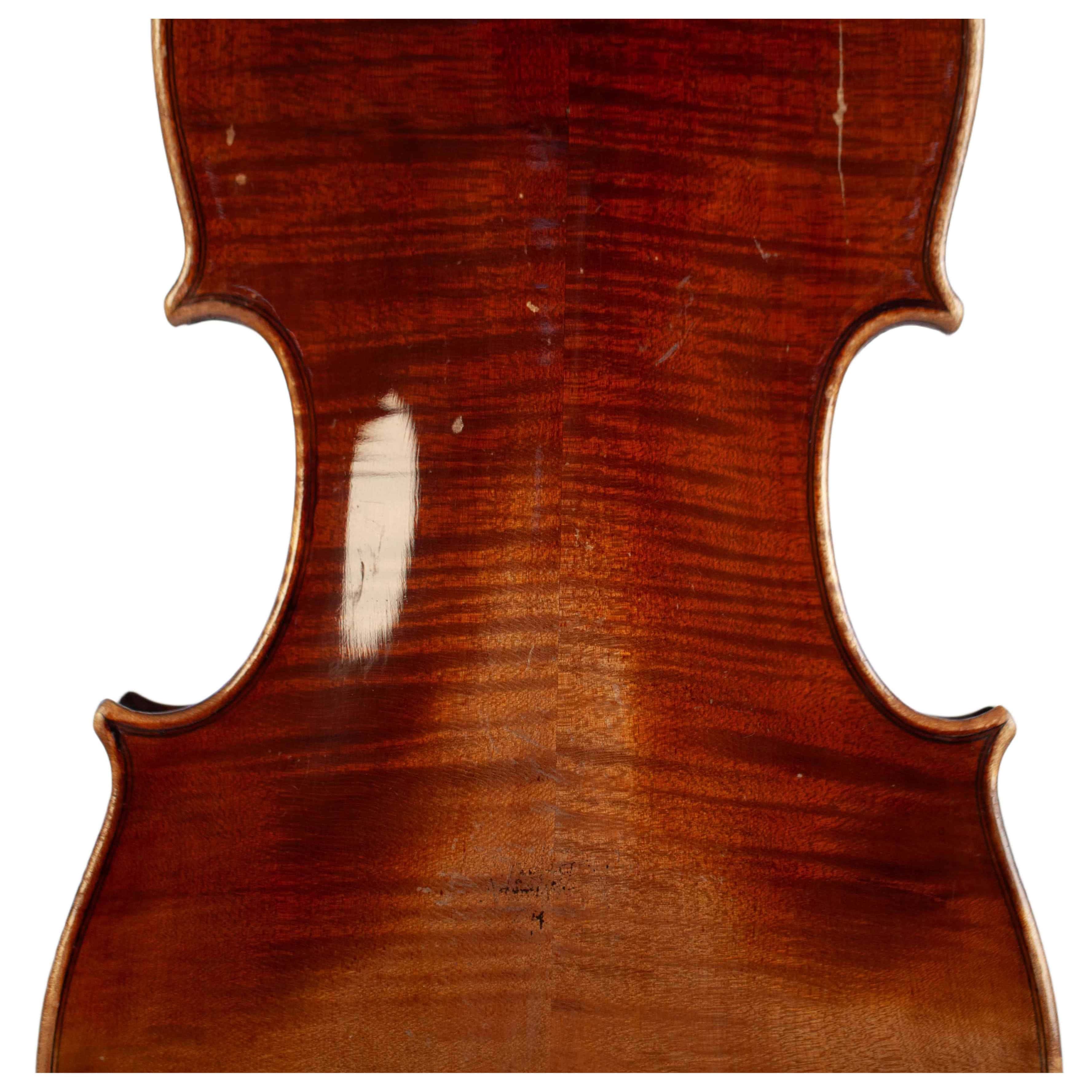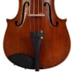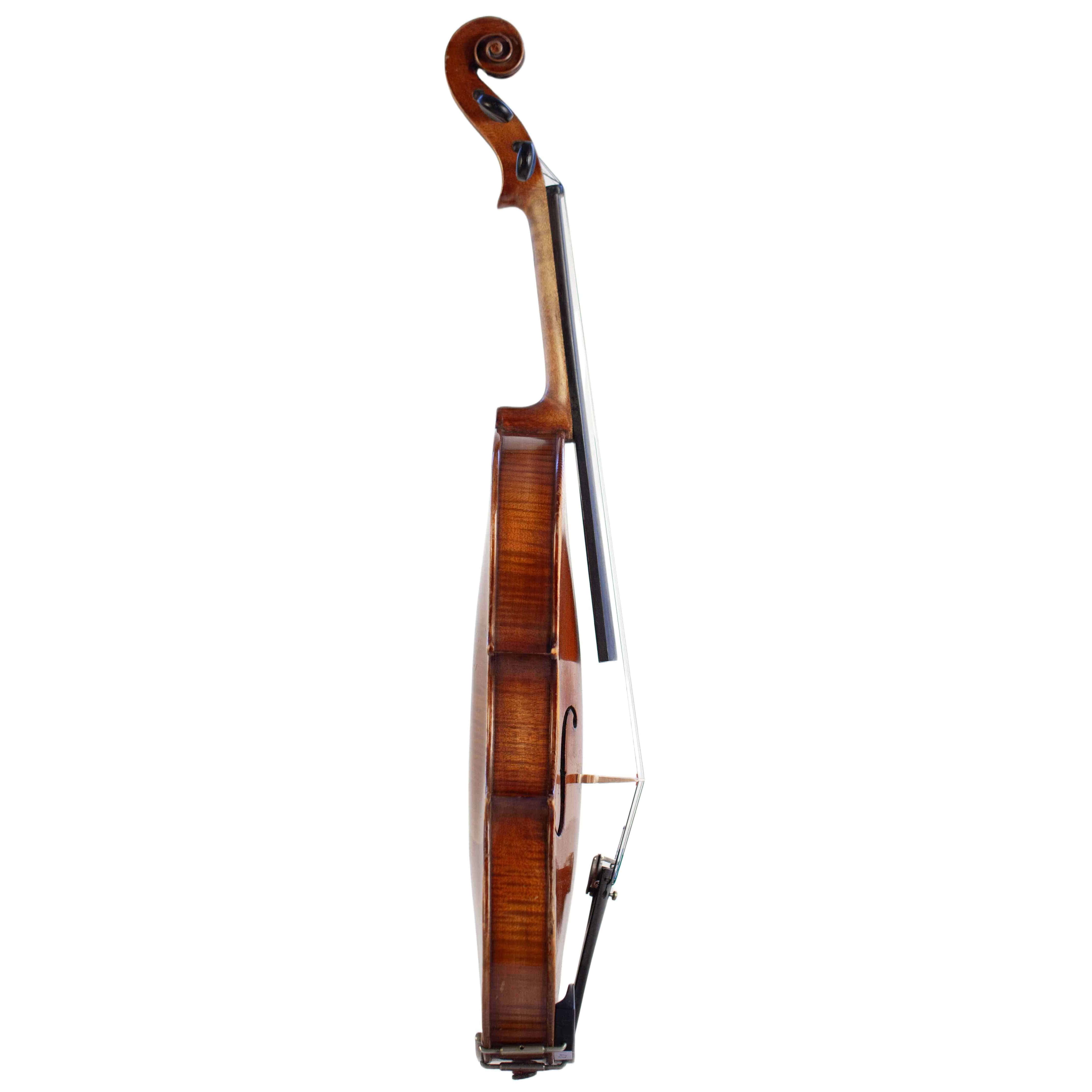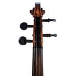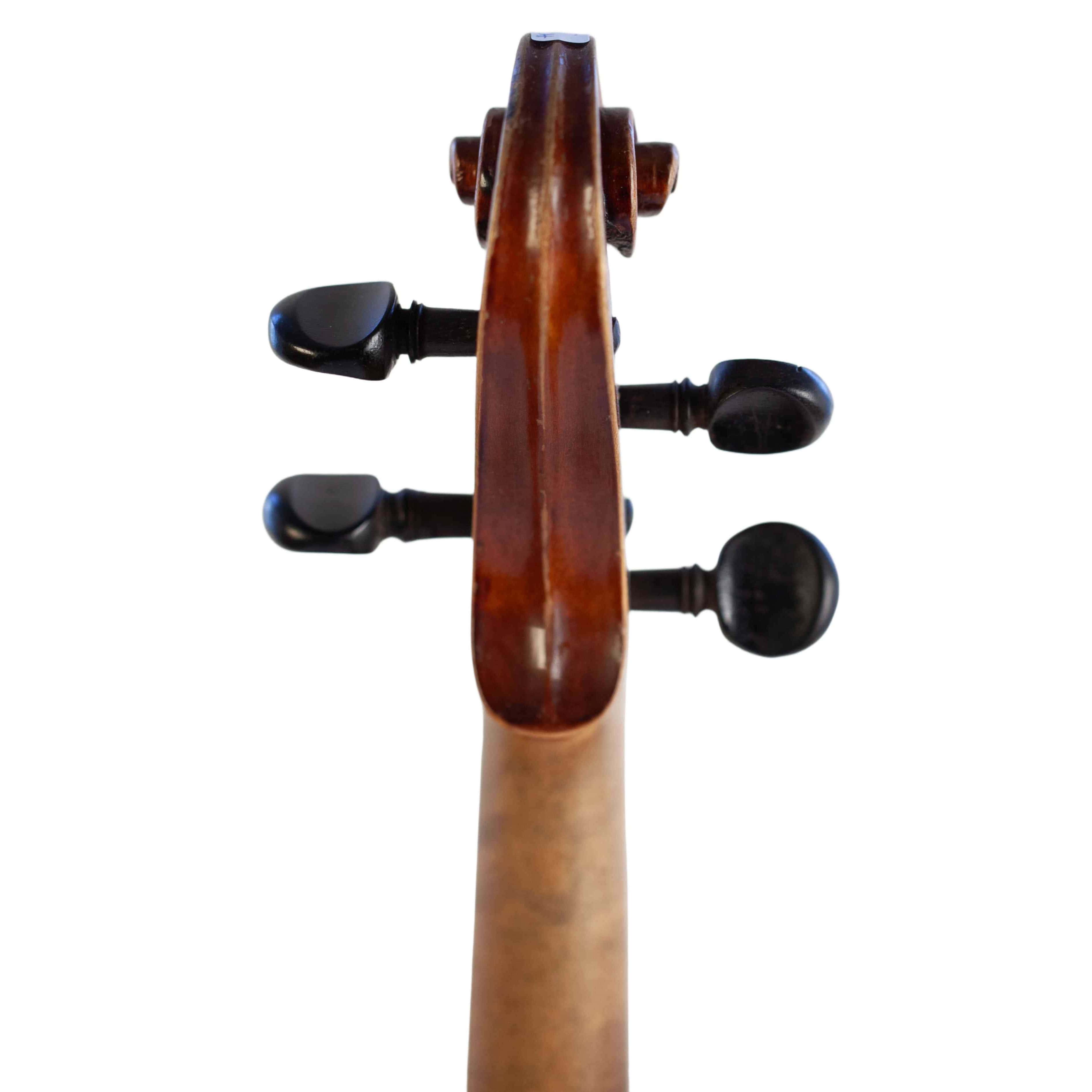 The whole length of the violin is 596 mm and the back 361 mm. The width of the upper bouts: 168 mm; middle bouts: 111 mm; lower bouts: 207 mm.