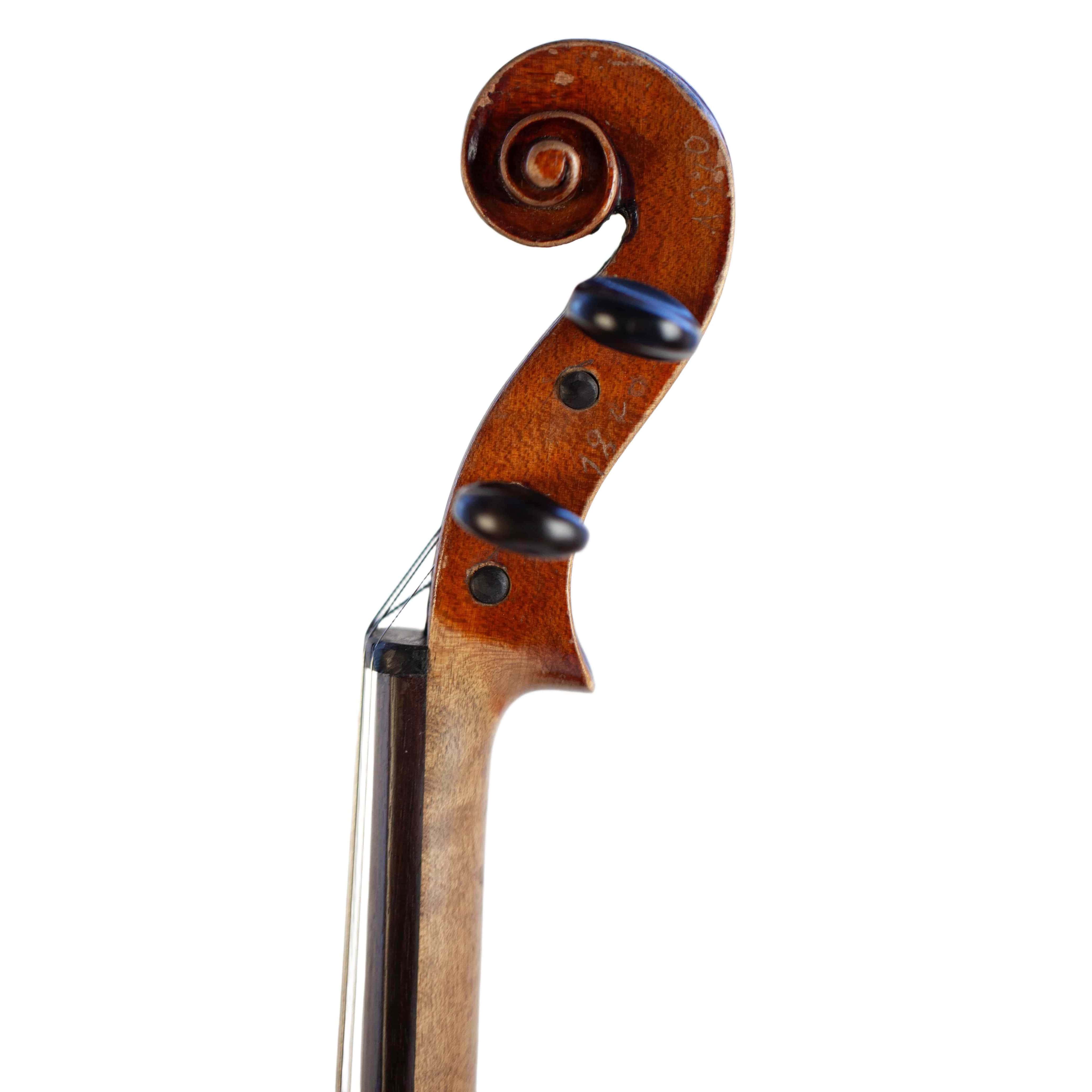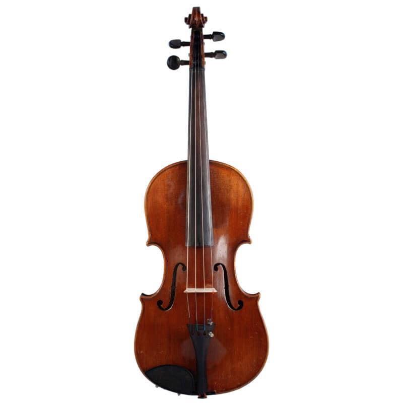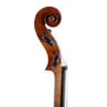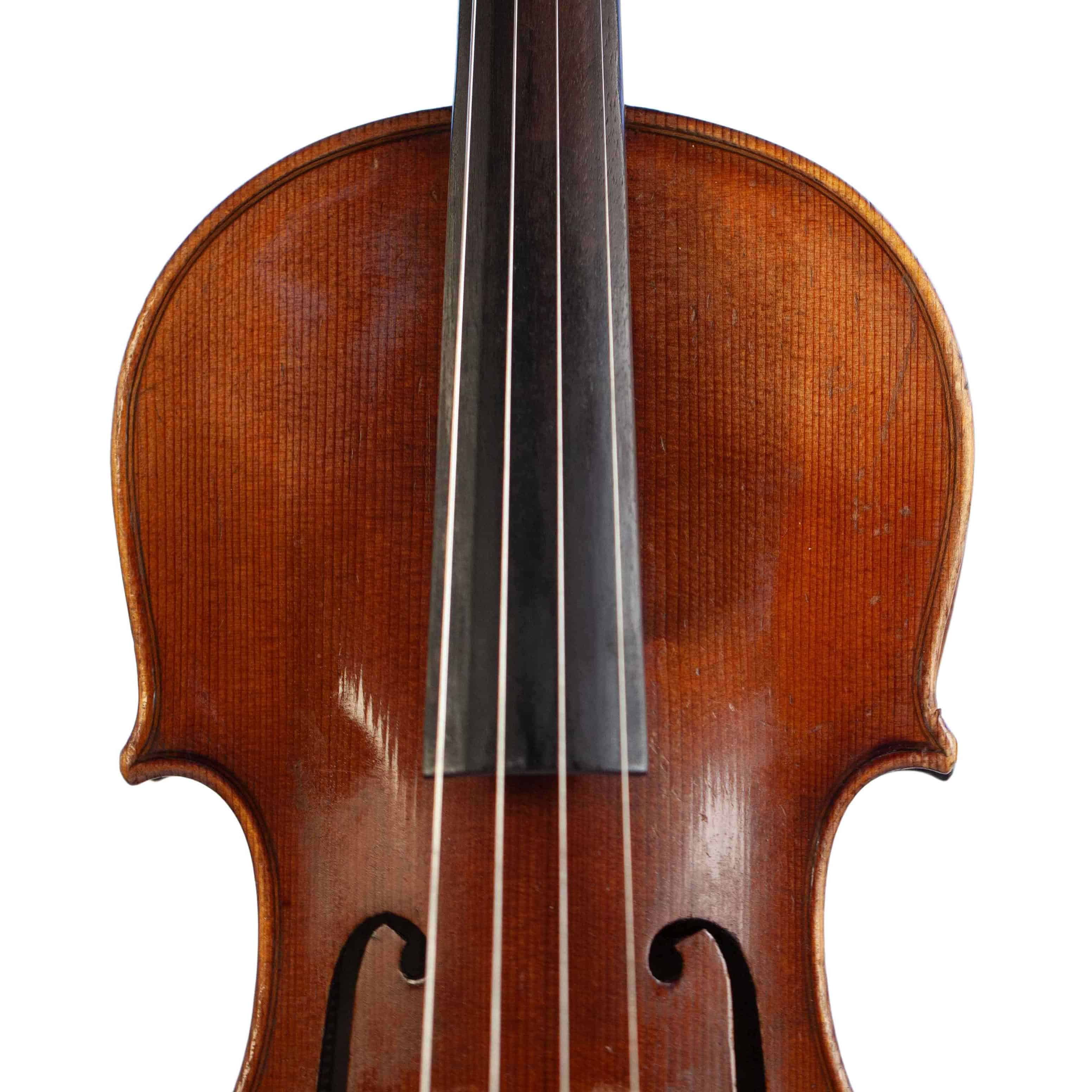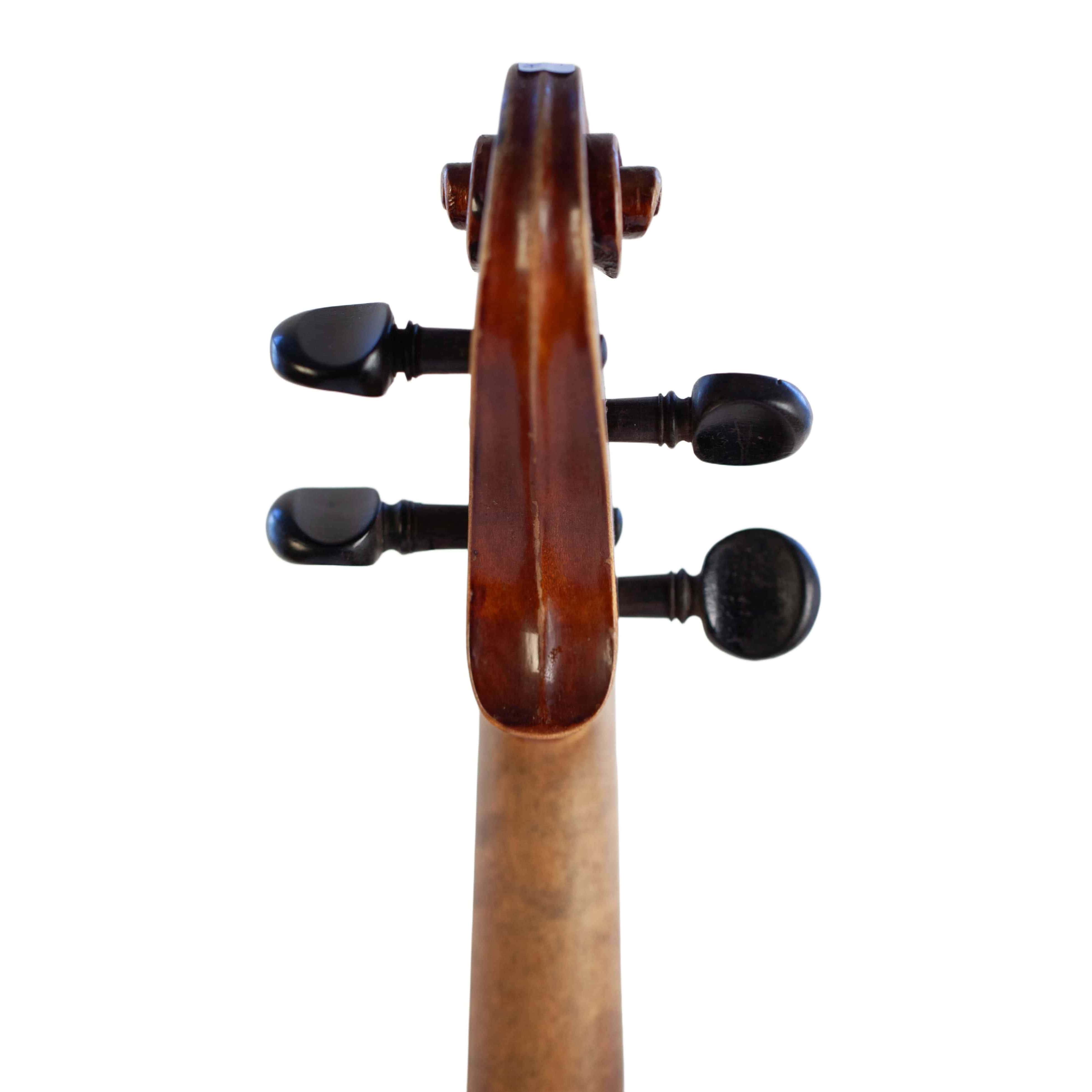 The whole length of the violin is 596 mm and the back 361 mm. The width of the upper bouts: 168 mm; middle bouts: 111 mm; lower bouts: 207 mm.