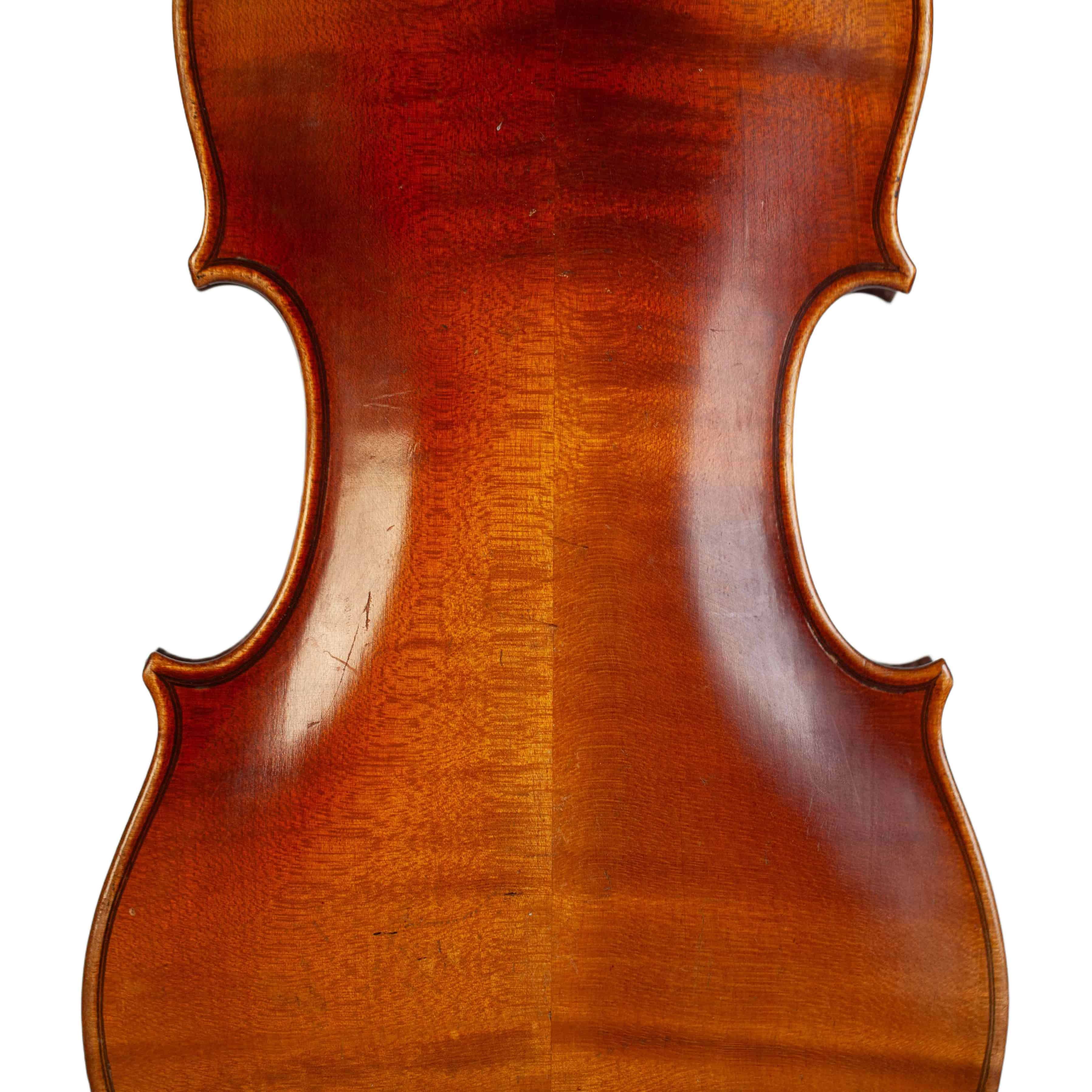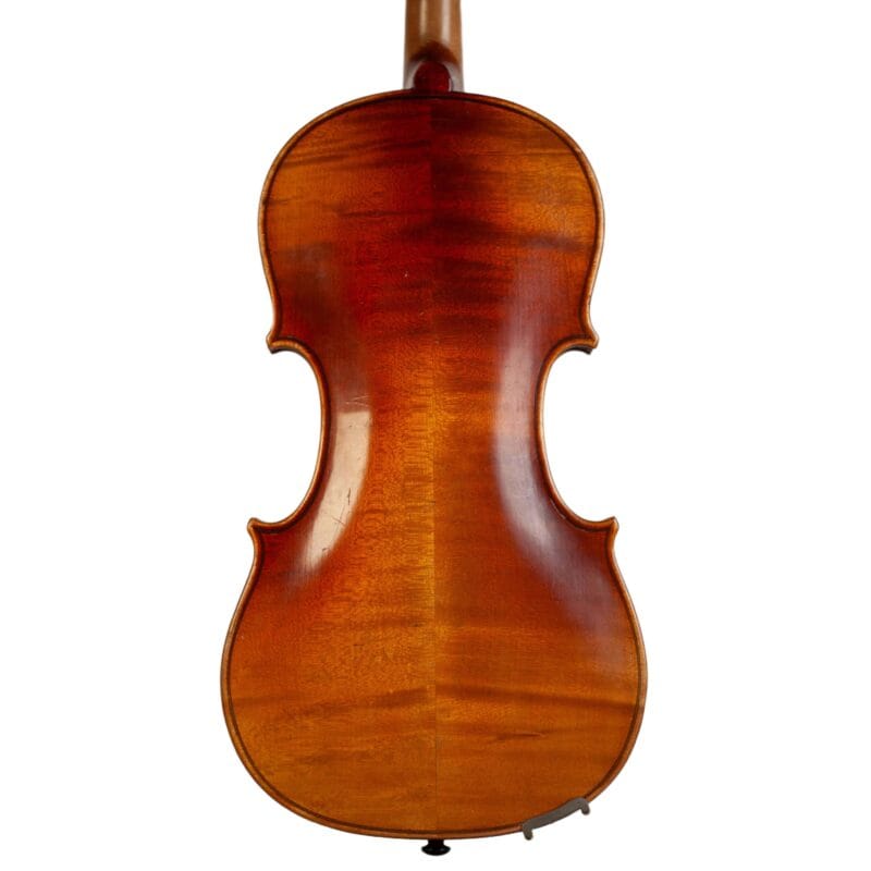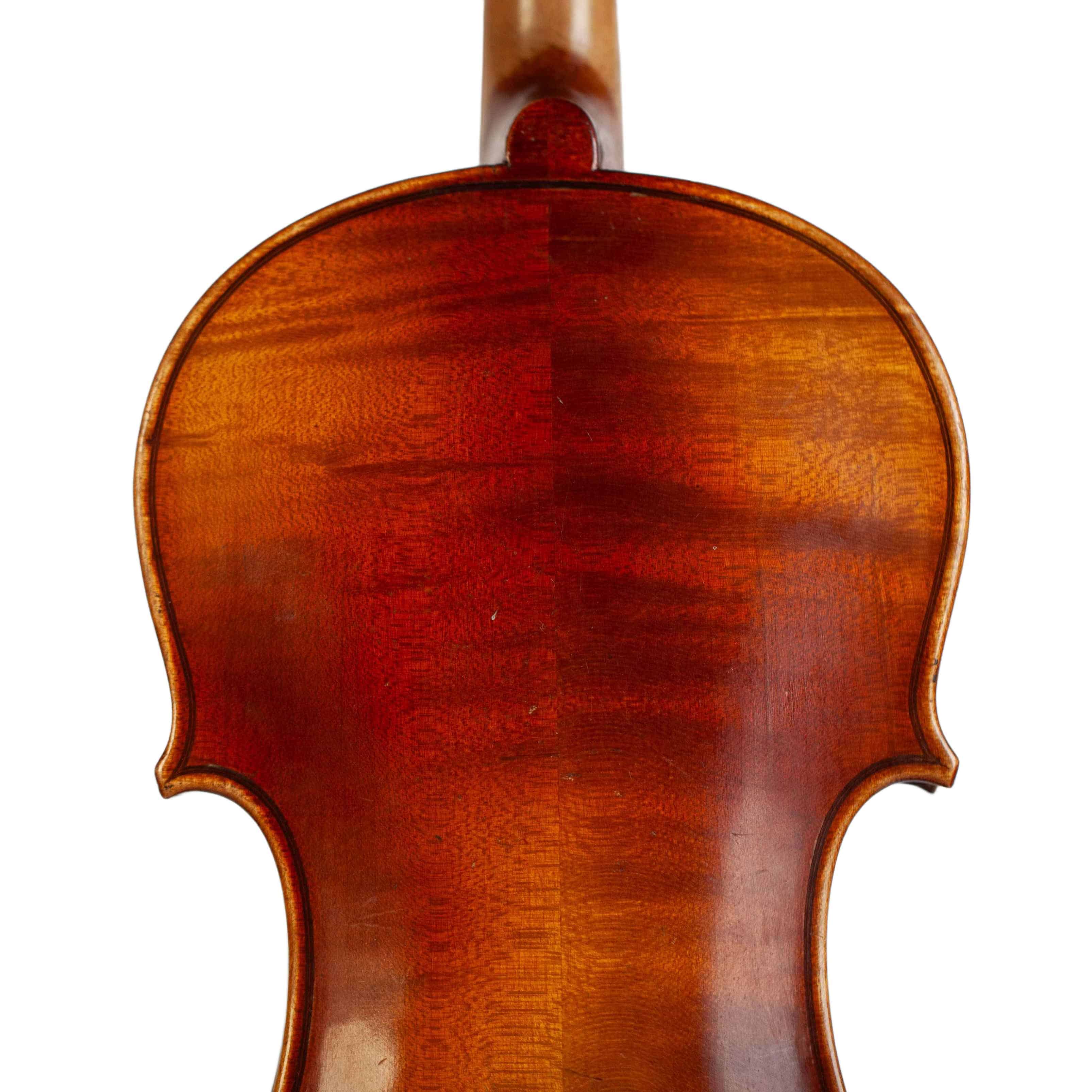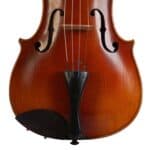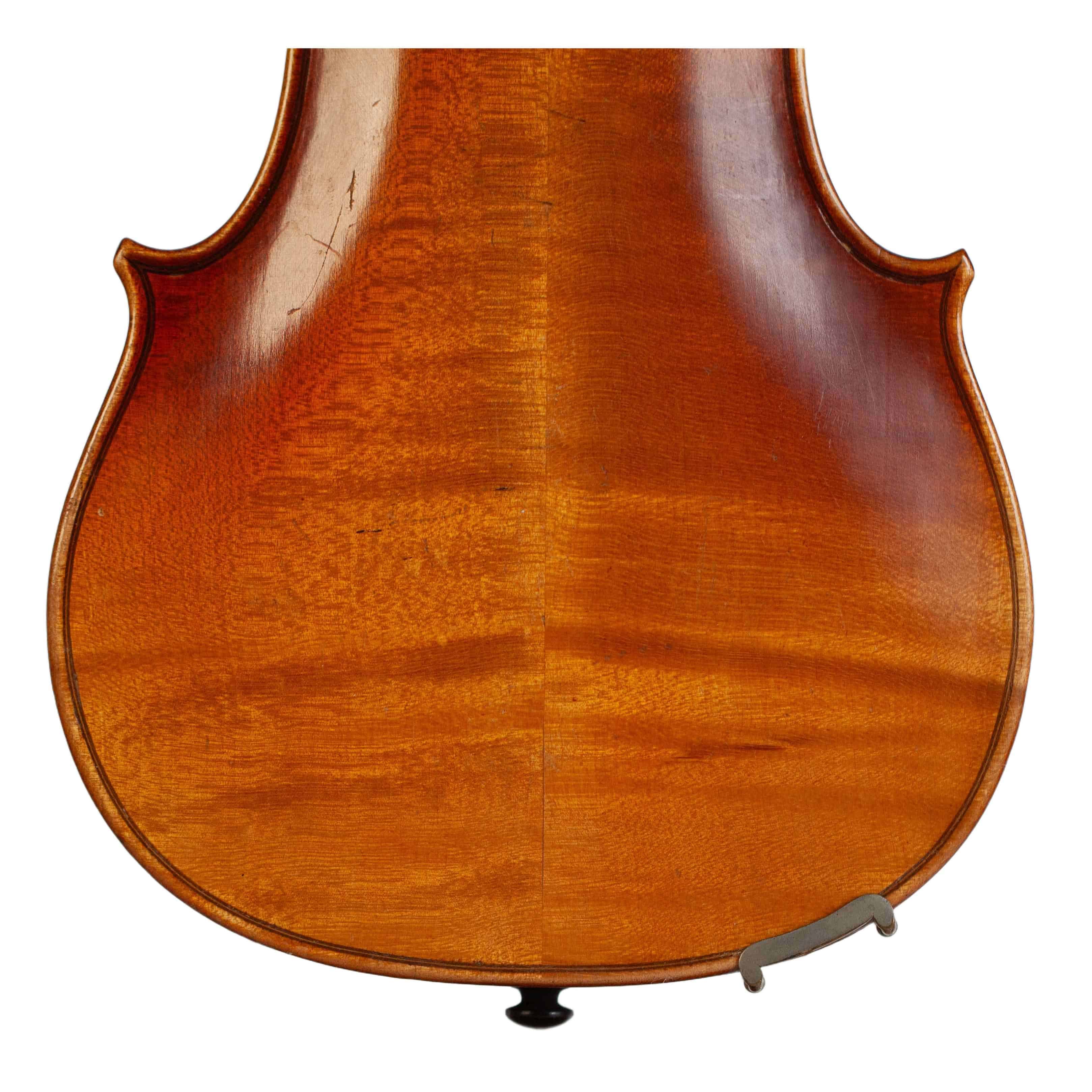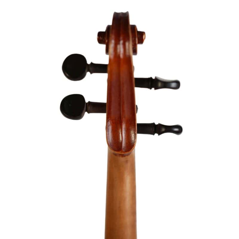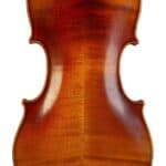 The whole length of the violin is 590 mm and the back 357 mm. The width of the upper bouts: 166 mm; middle bouts: 110 mm; lower bouts: 203 mm.