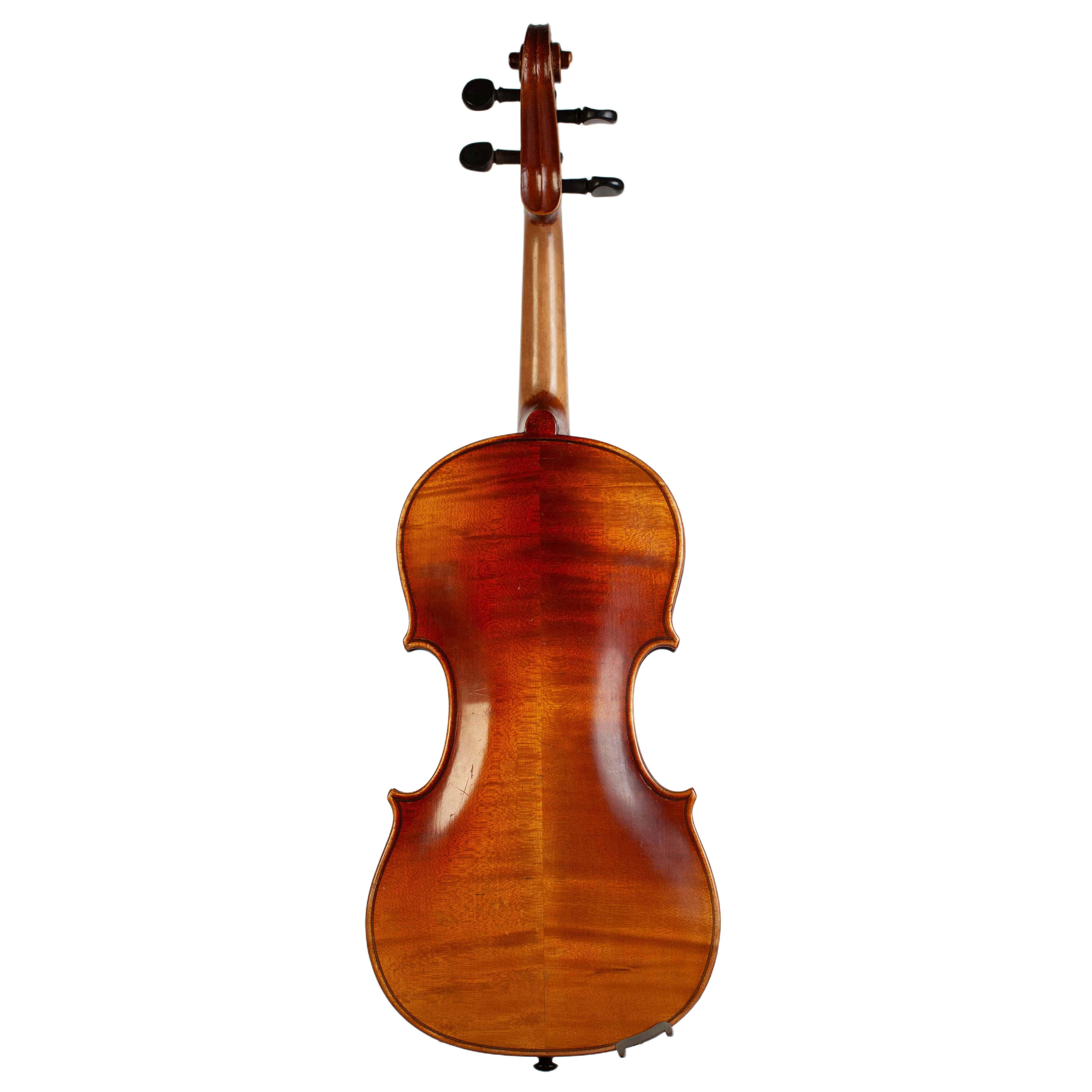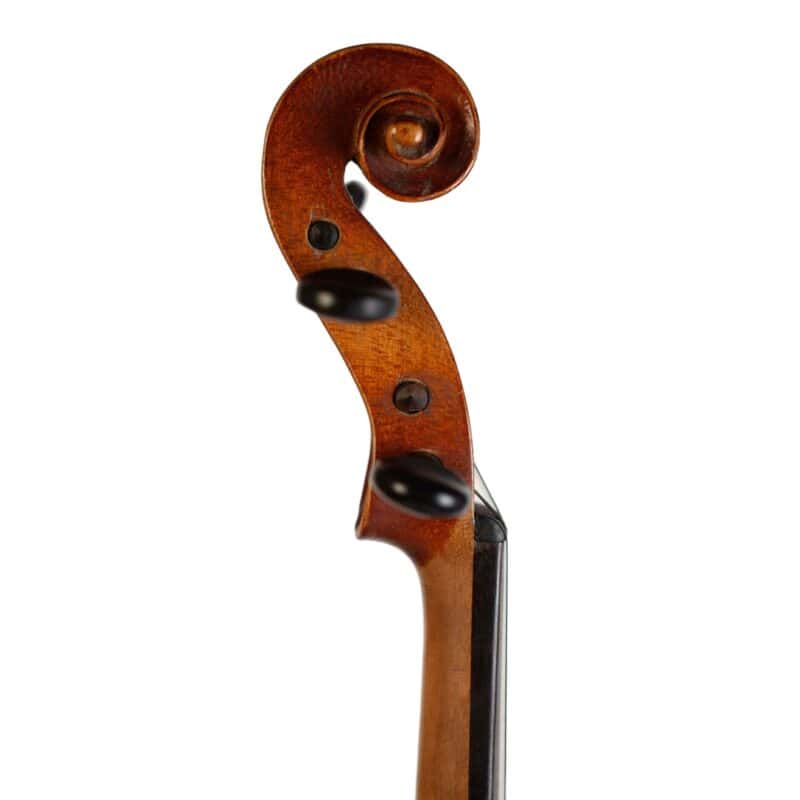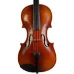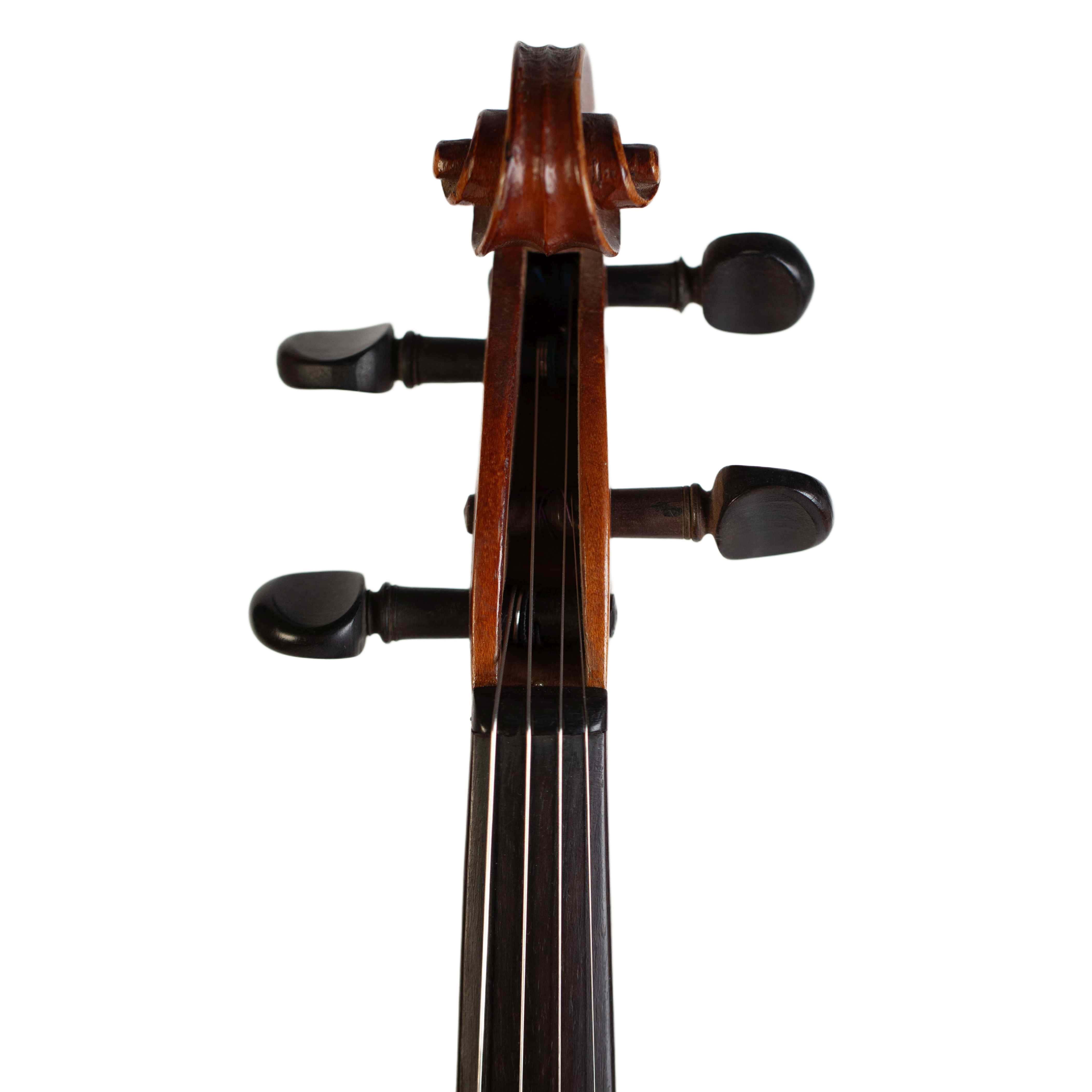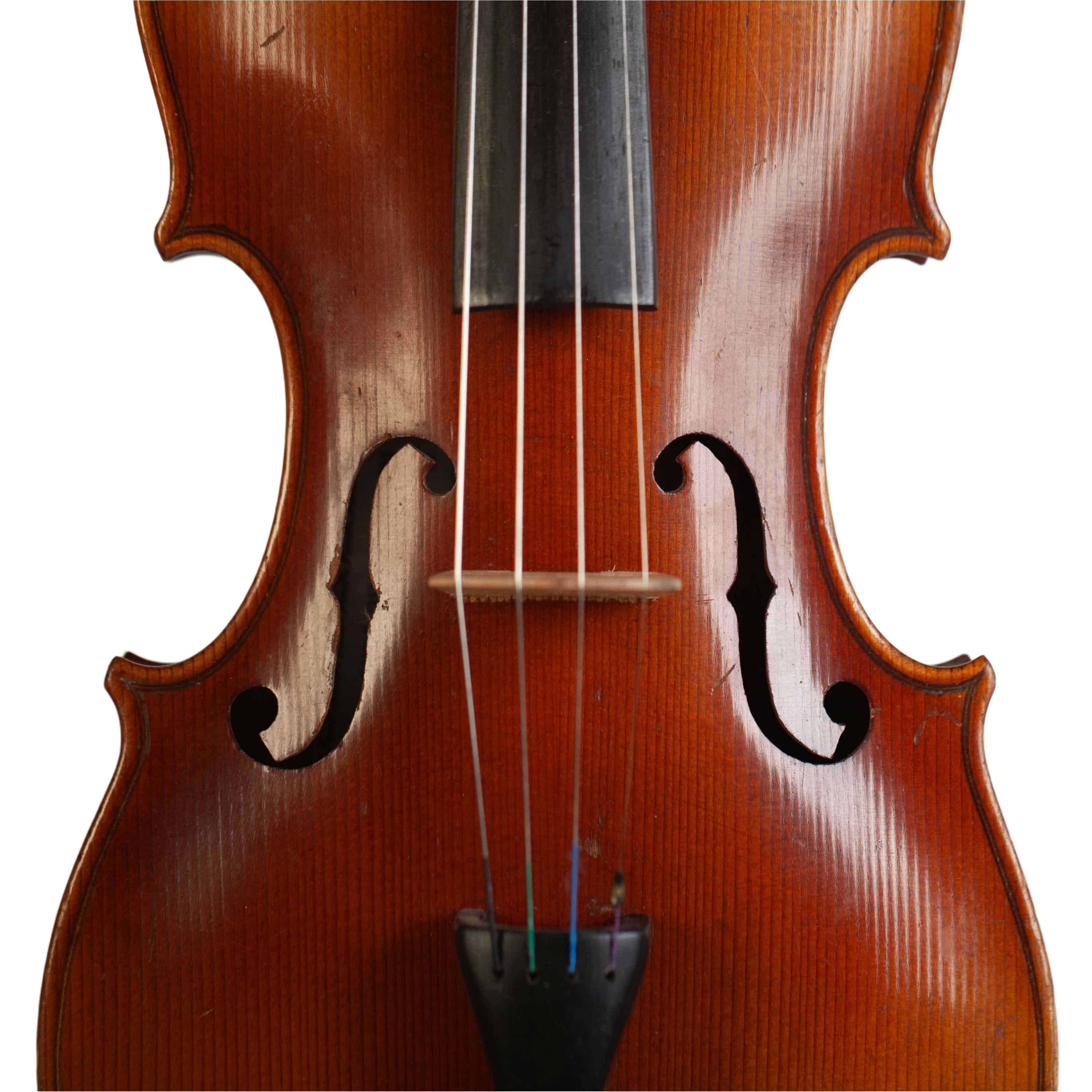 The whole length of the violin is 590 mm and the back 357 mm. The width of the upper bouts: 166 mm; middle bouts: 110 mm; lower bouts: 203 mm.