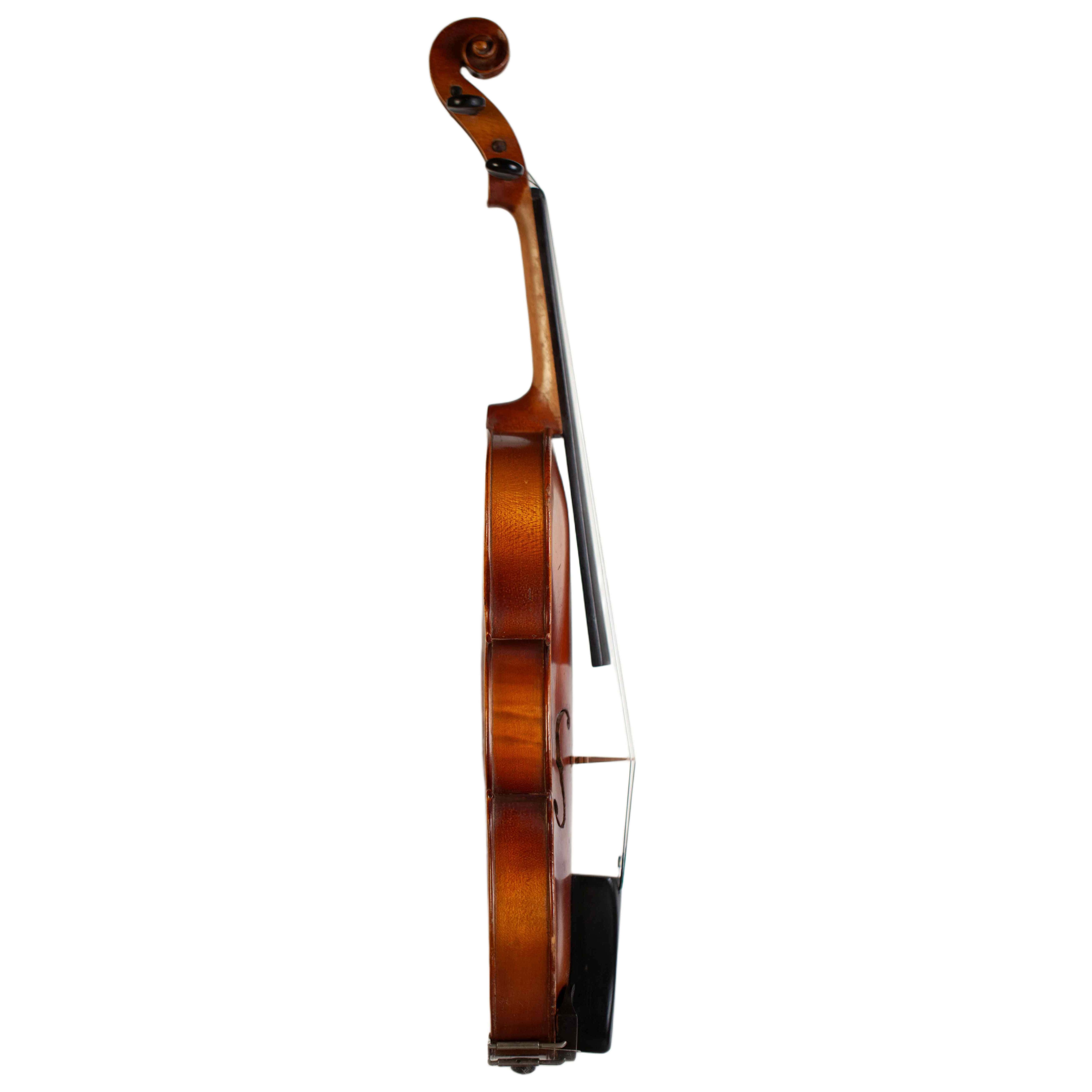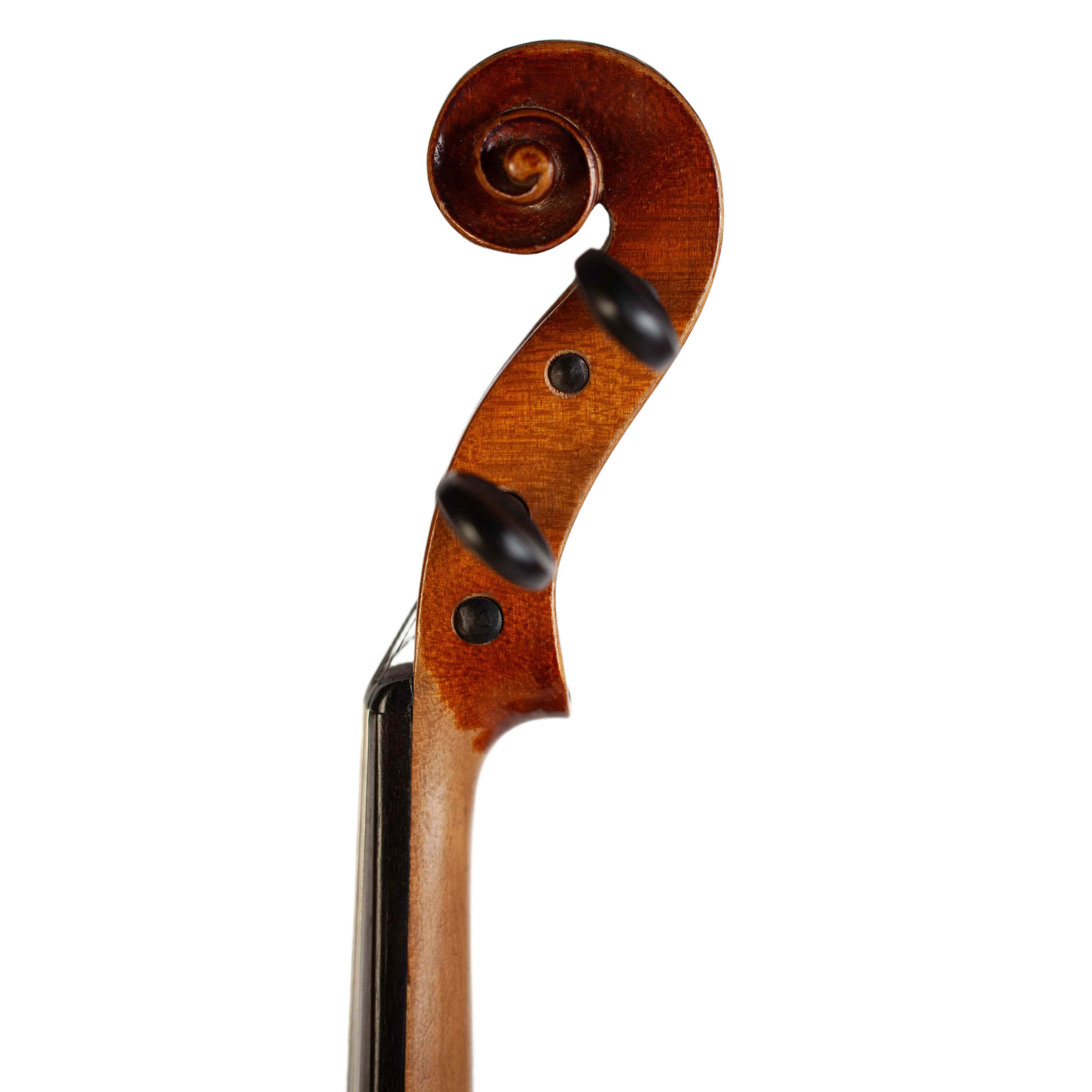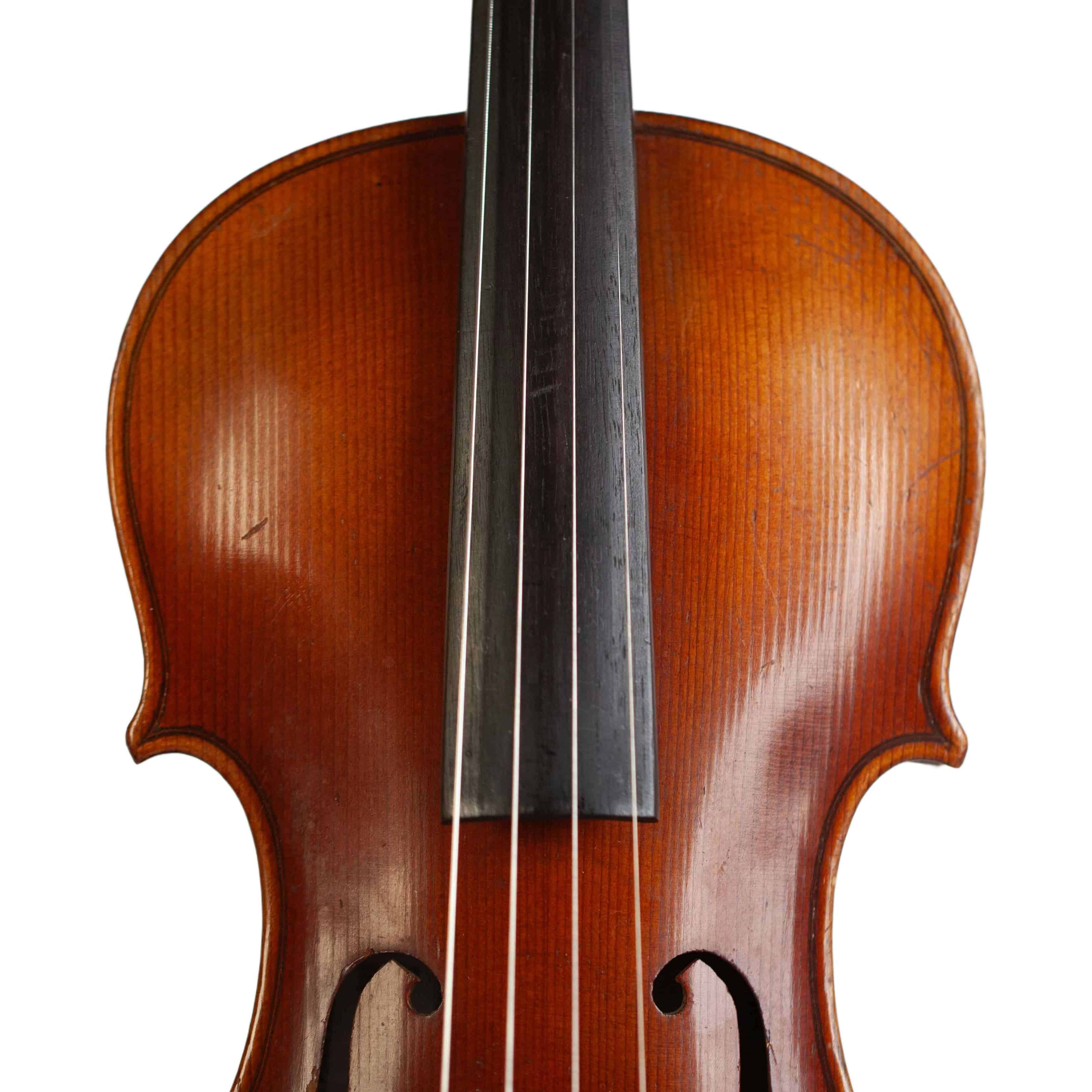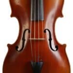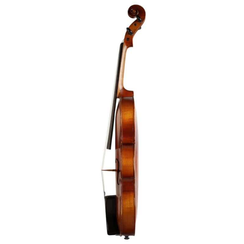 The whole length of the violin is 590 mm and the back 357 mm. The width of the upper bouts: 166 mm; middle bouts: 110 mm; lower bouts: 203 mm.