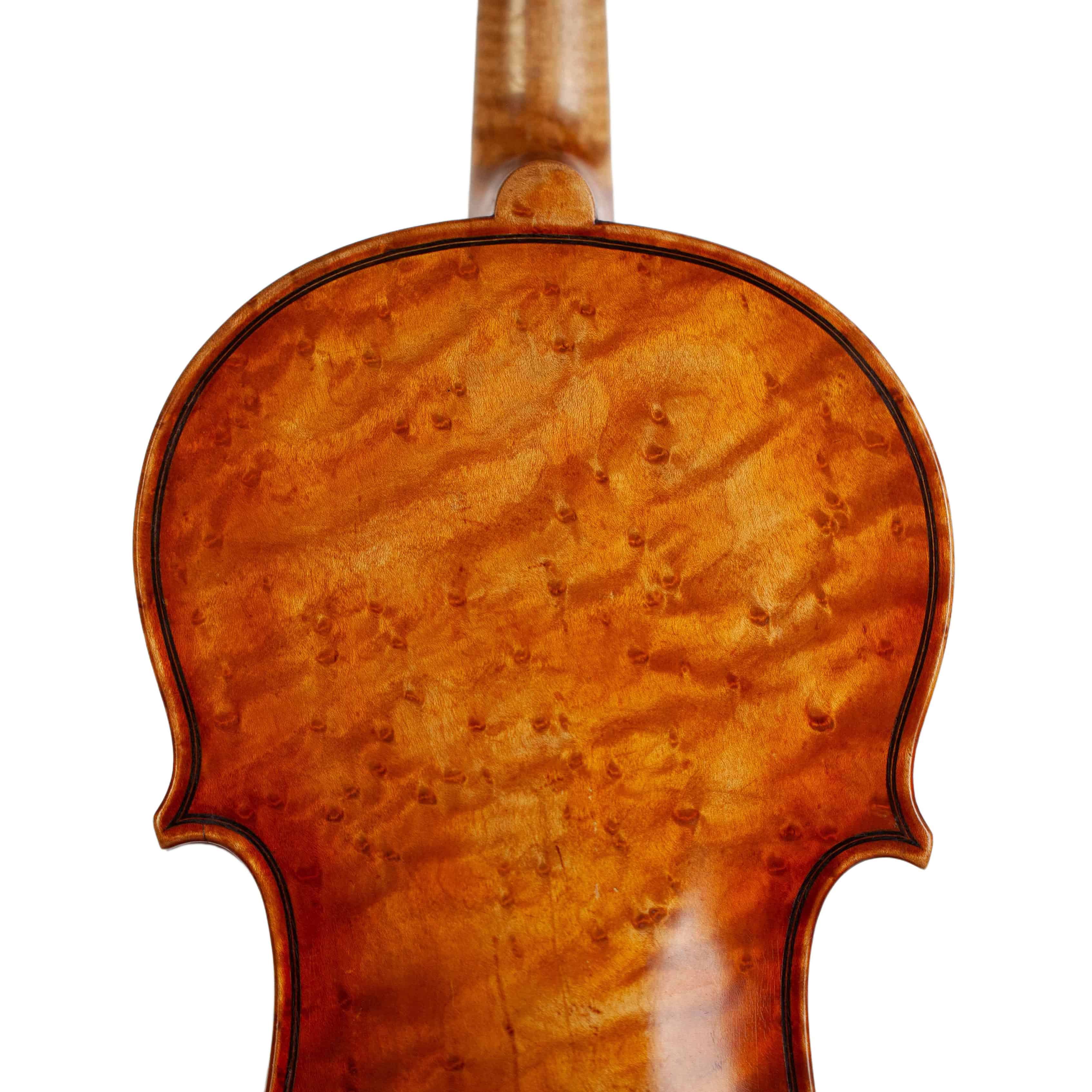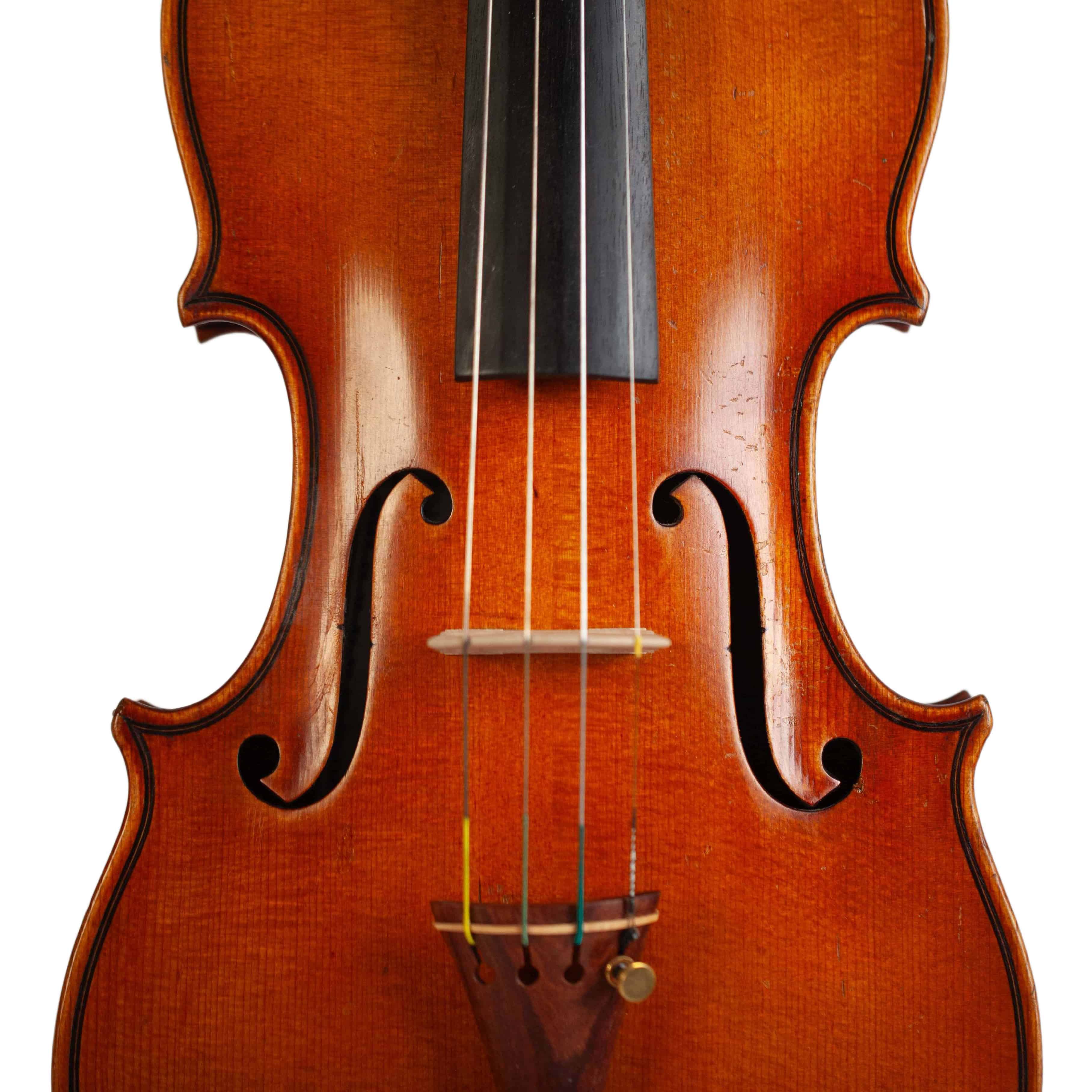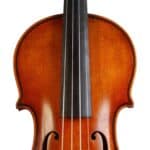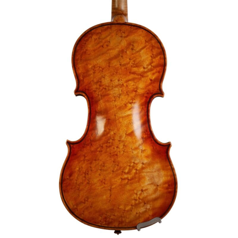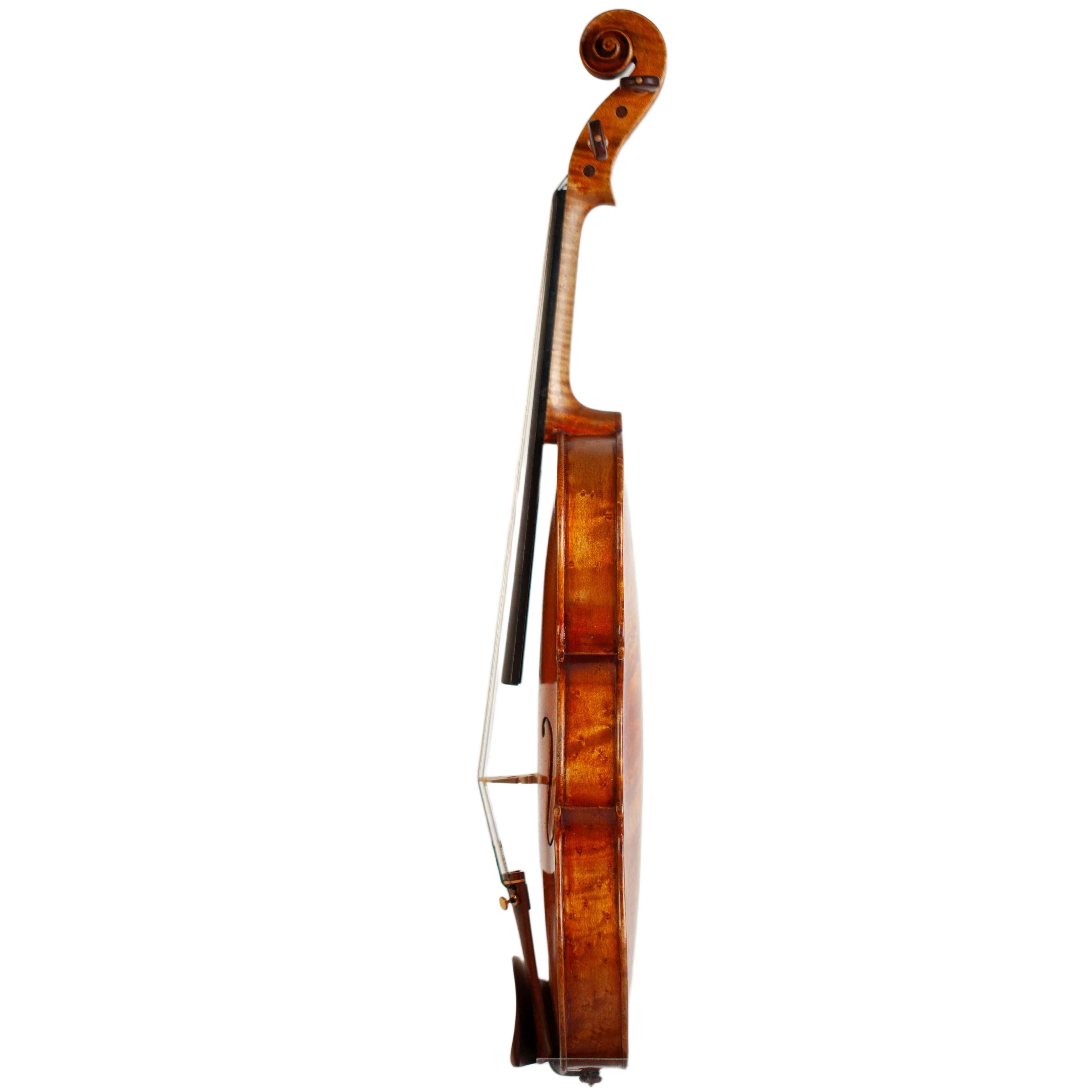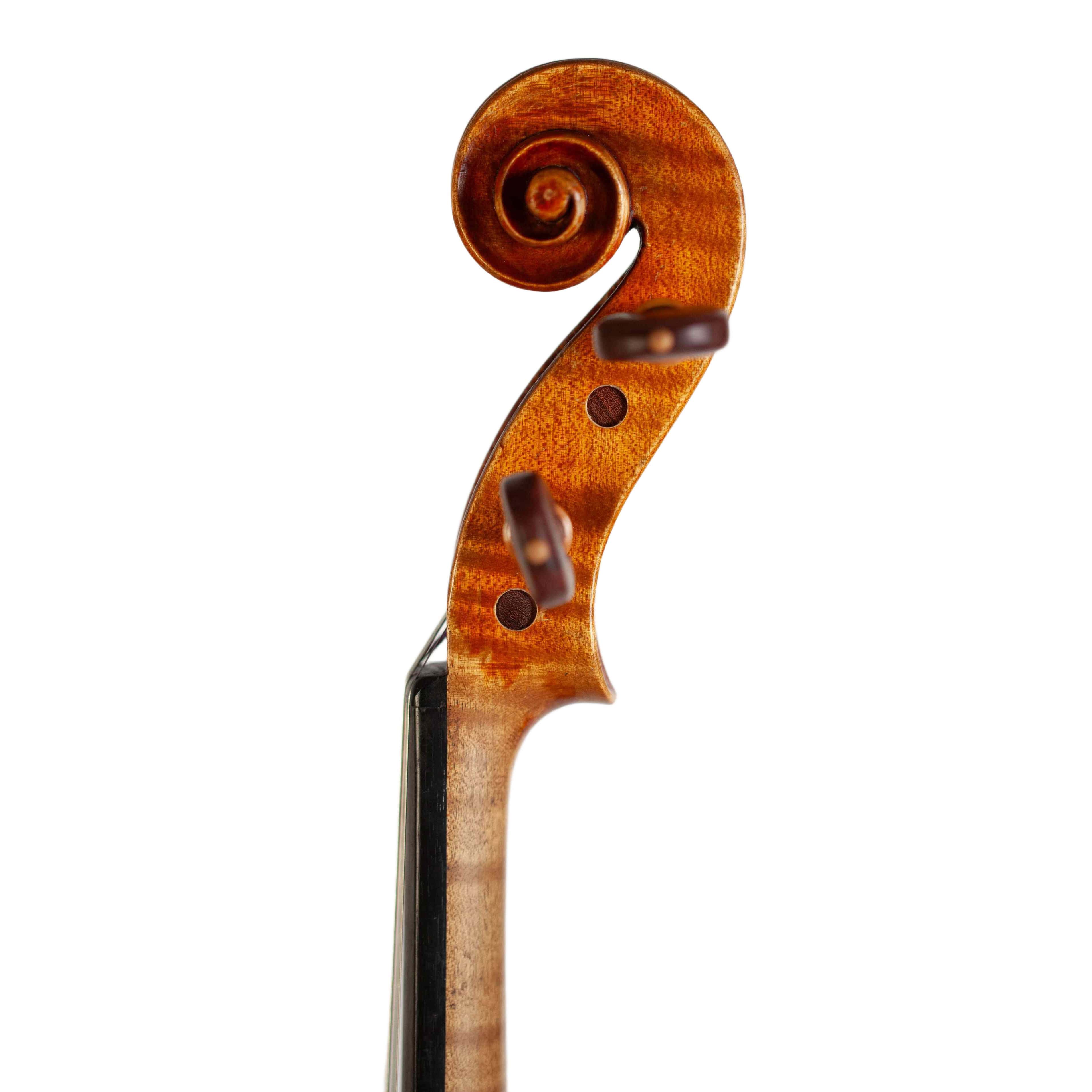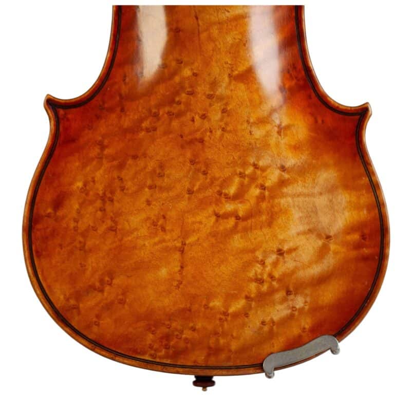 The whole length of the violin is 589 mm and the back 355 mm. The width of the upper bouts: 163 mm; middle bouts: 109 mm; lower bouts: 201 mm.