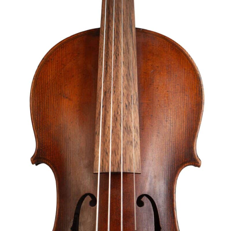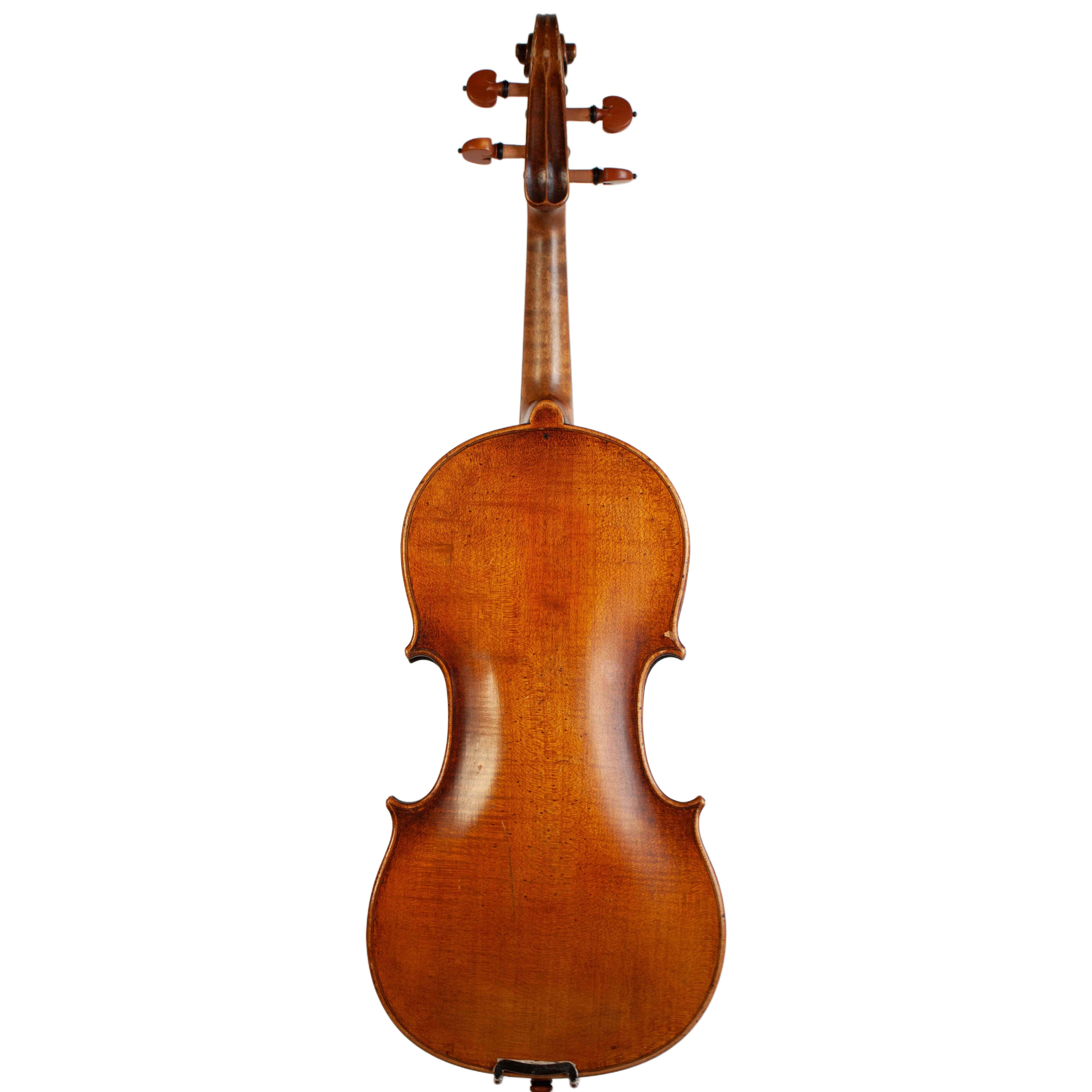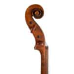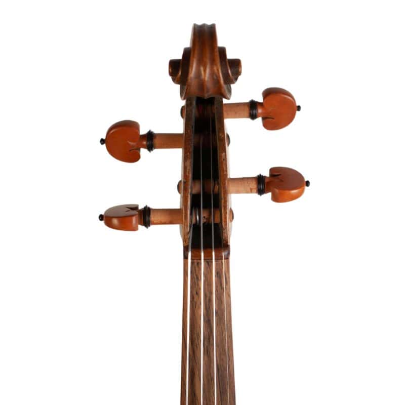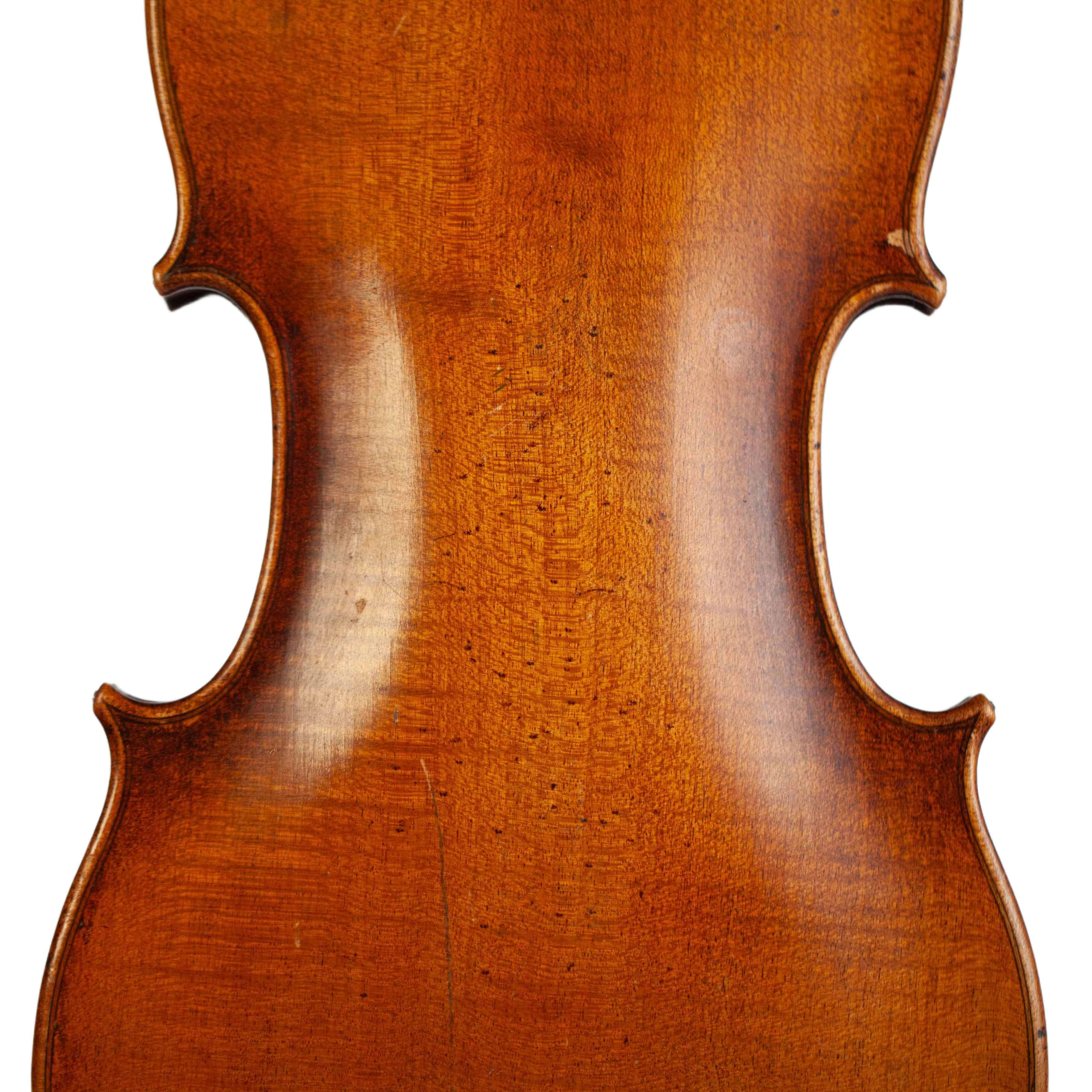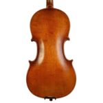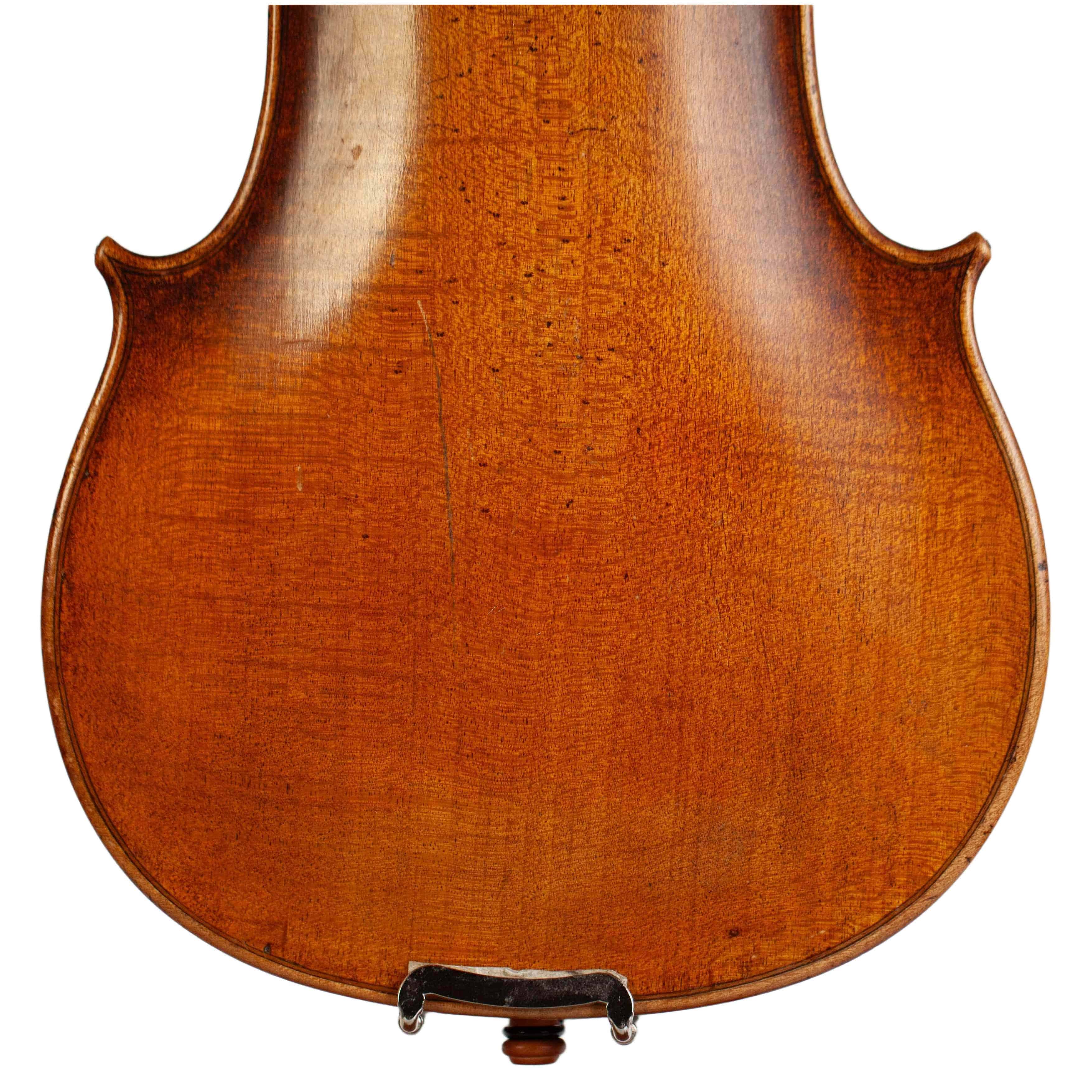 The whole length of the violin is 590 mm and the back 362 mm. The width of the upper bouts: 162 mm; middle bouts: 112 mm; lower bouts: 199 mm.