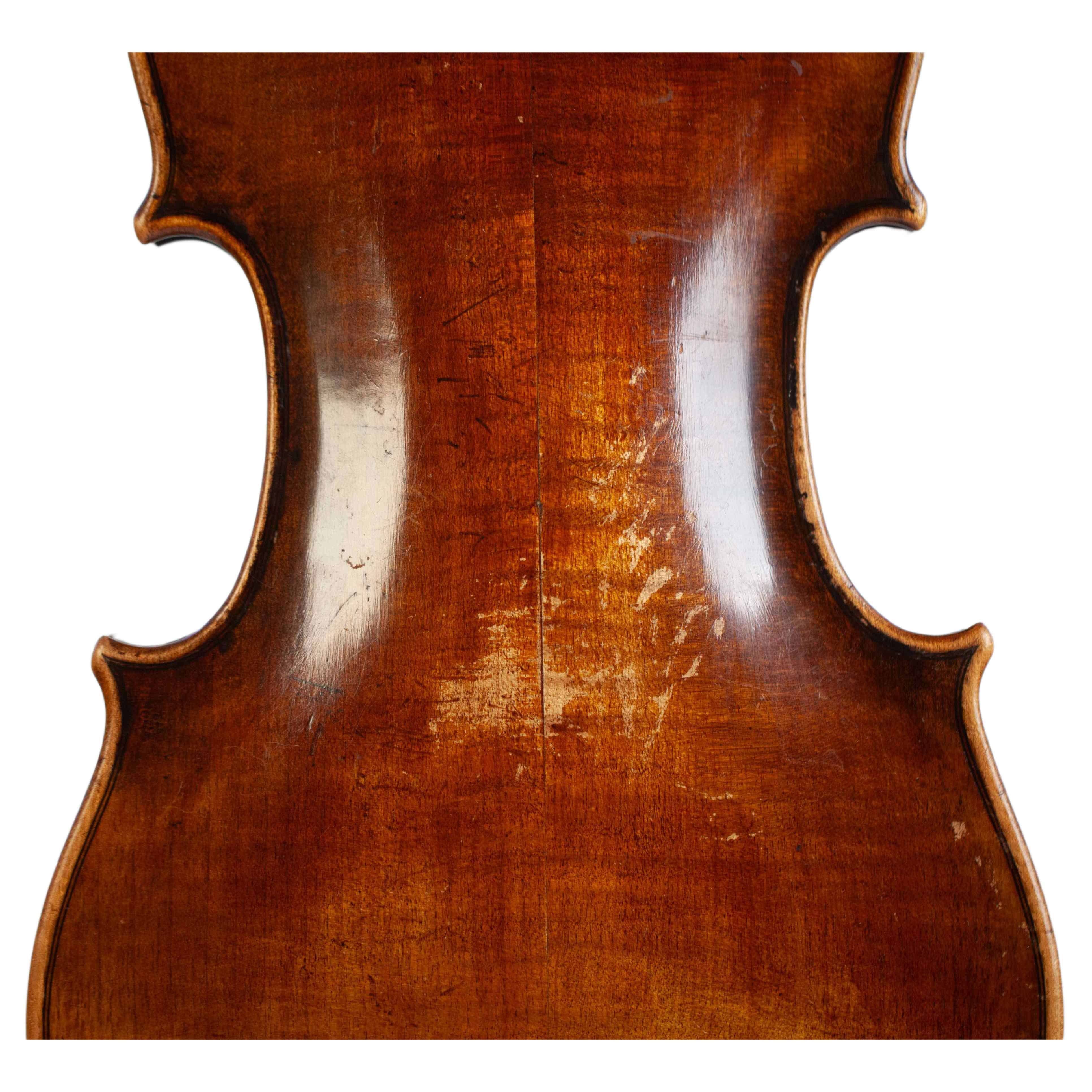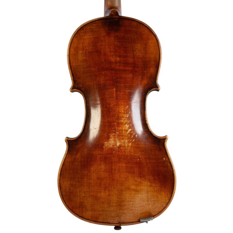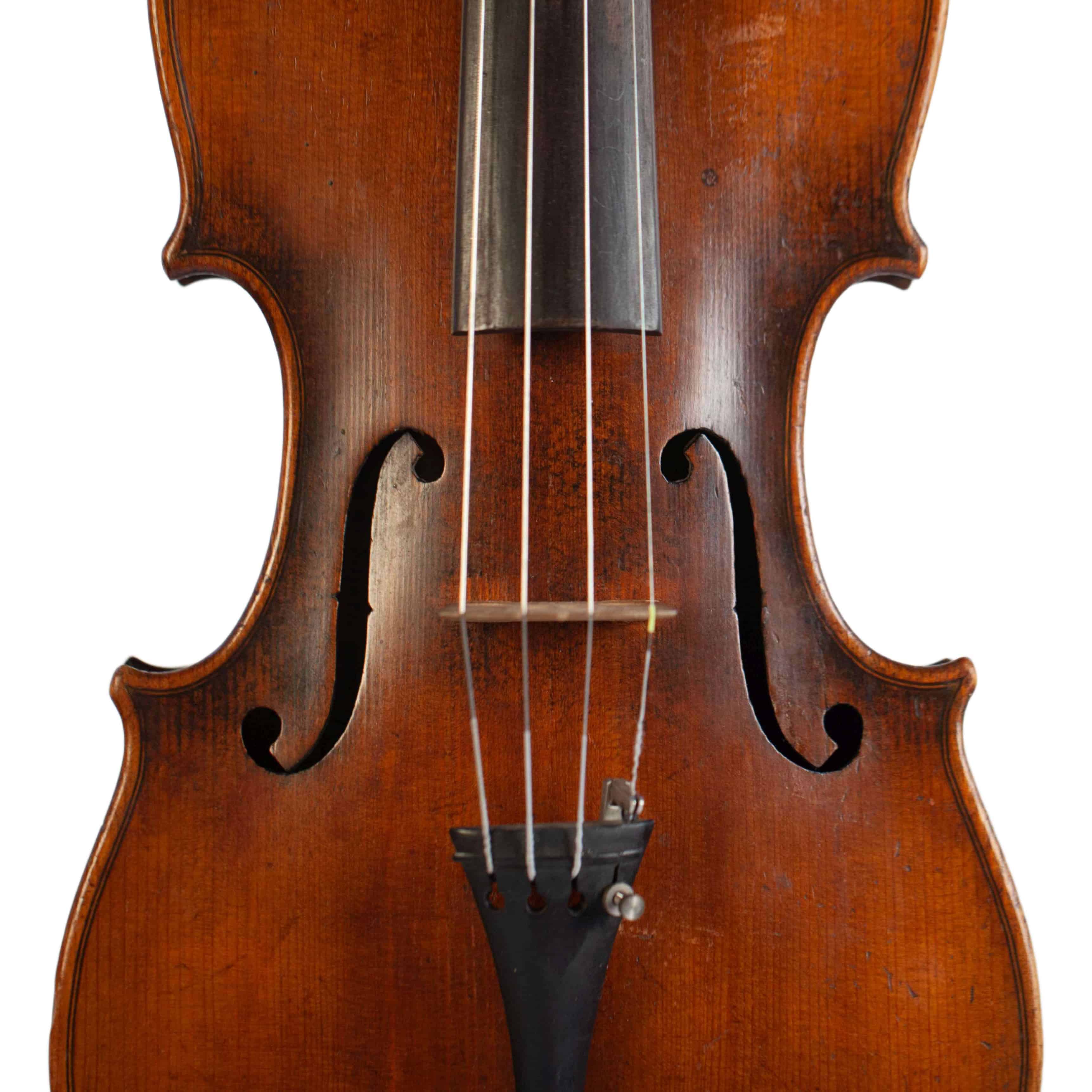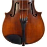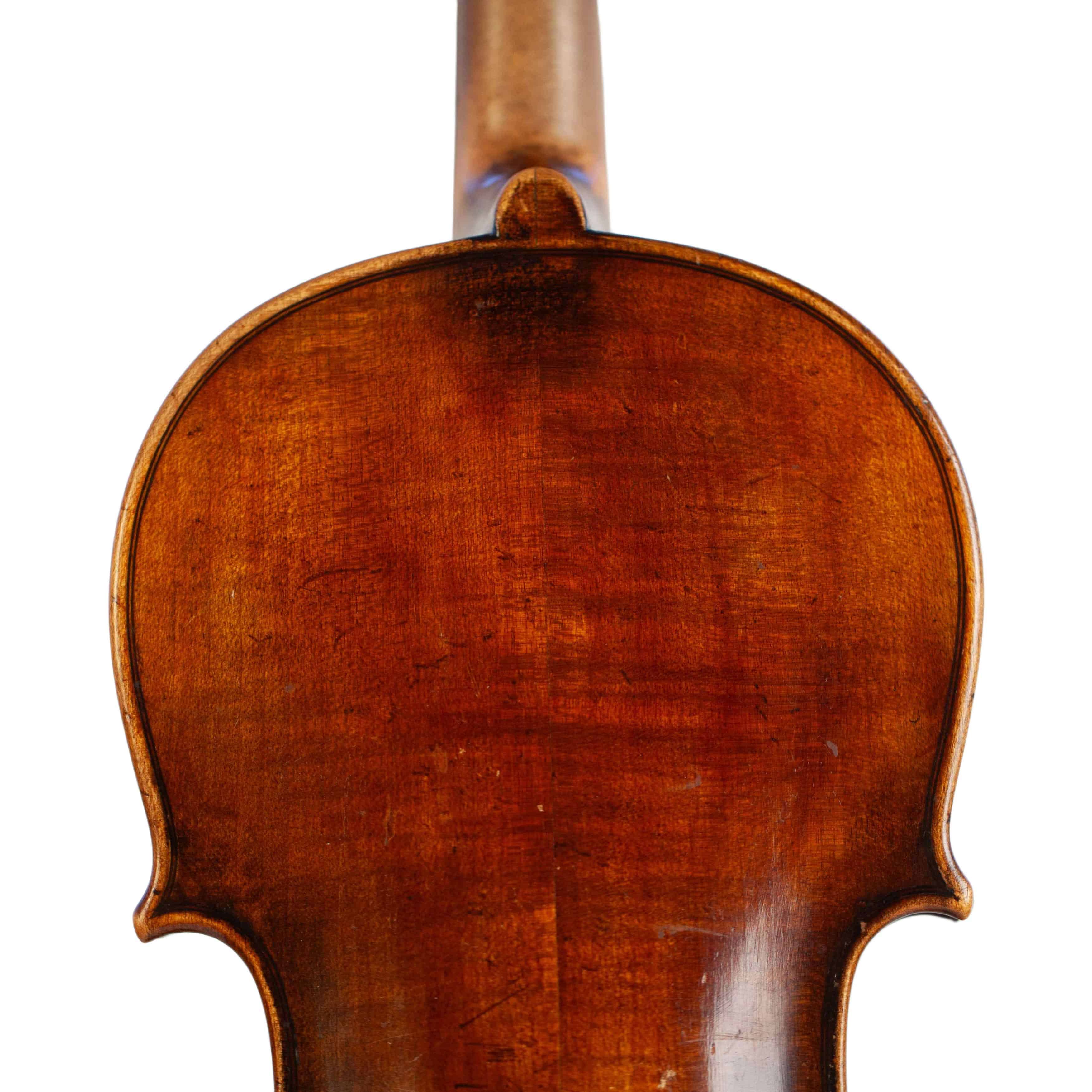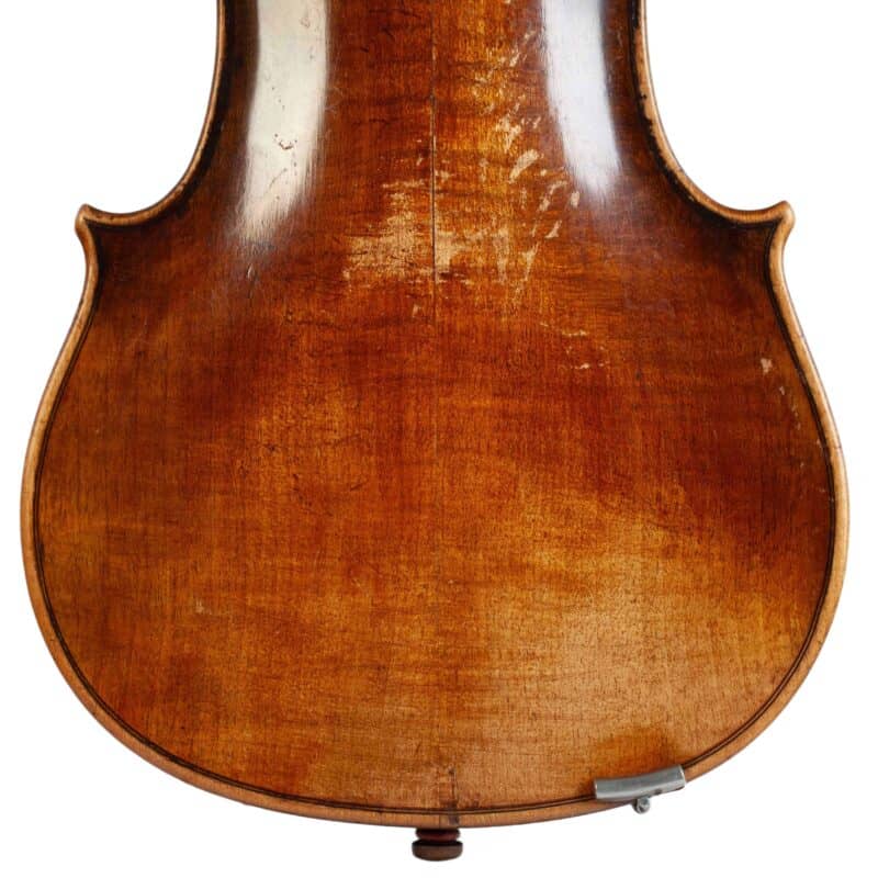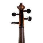 The whole length of the violin is 586 mm and the back 357 mm. The width of the upper bouts: 162 mm; middle bouts: 108 mm; lower bouts: 201 mm.