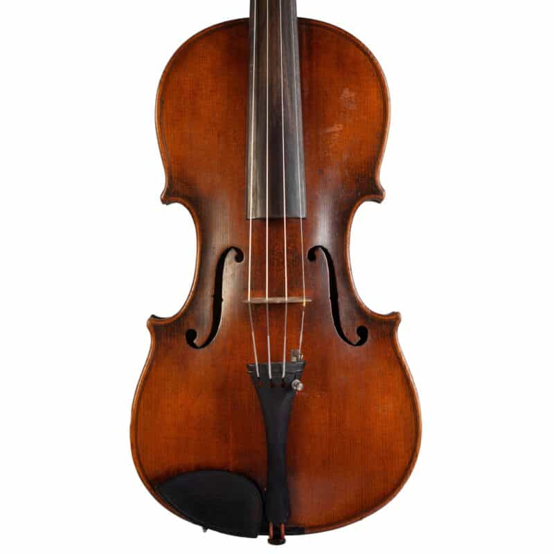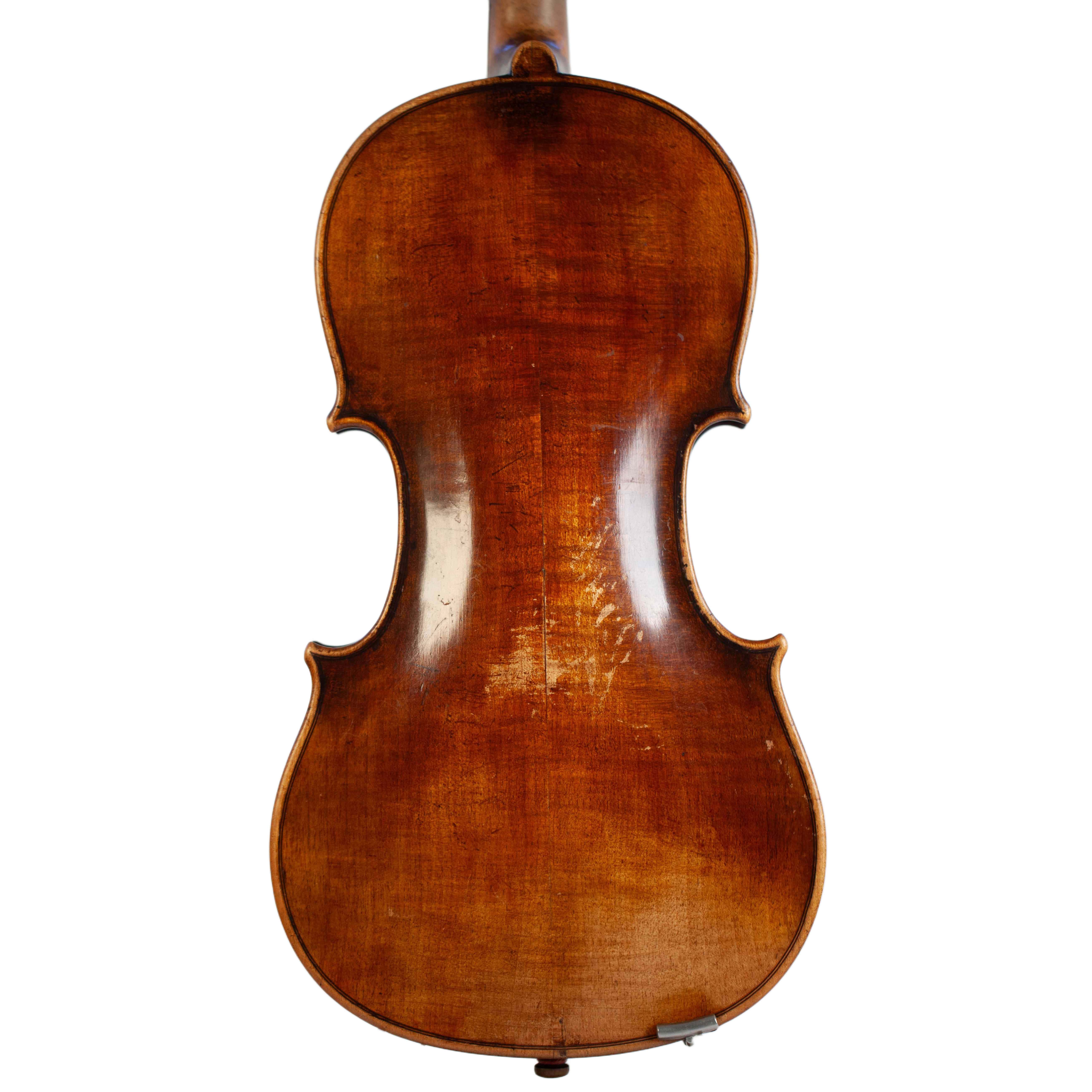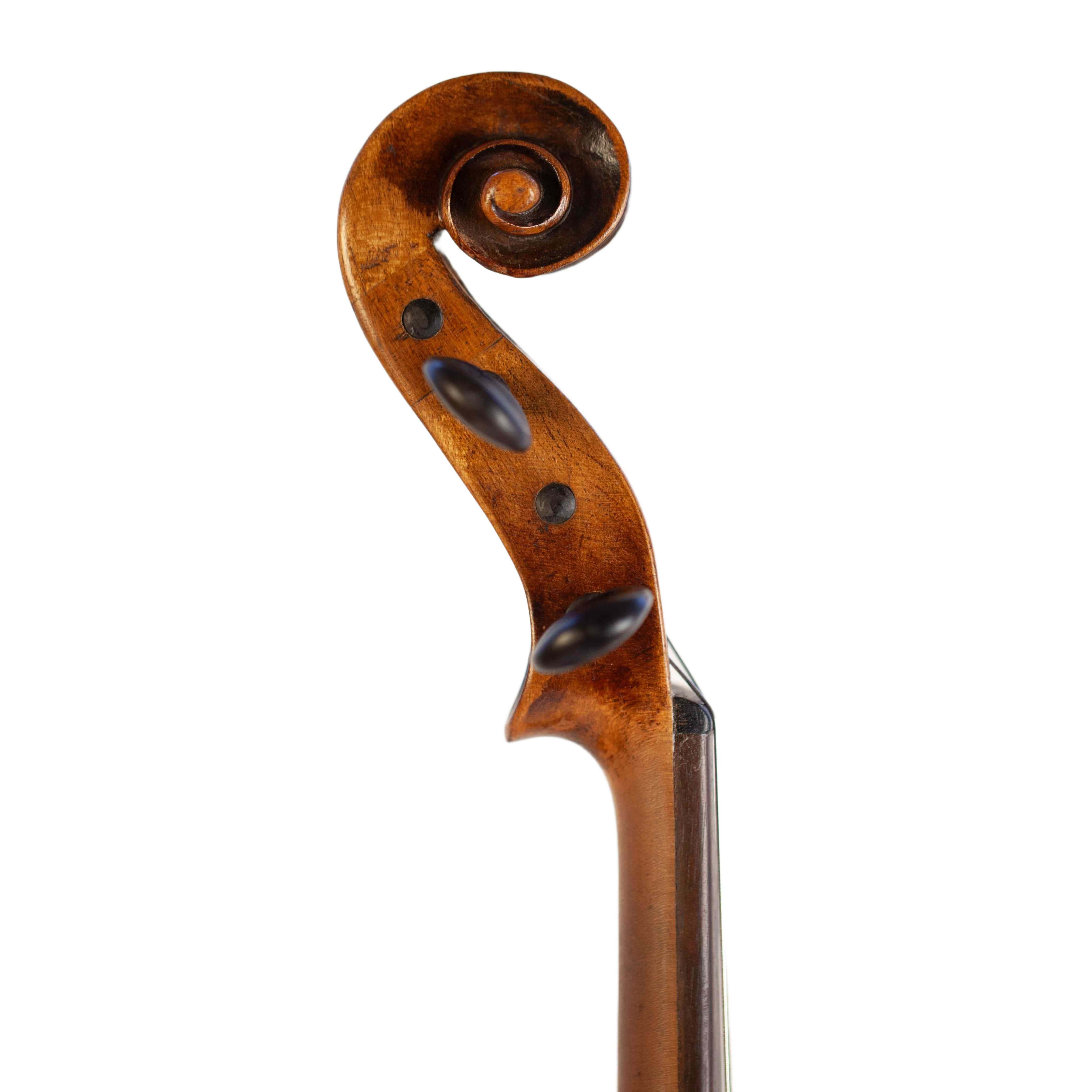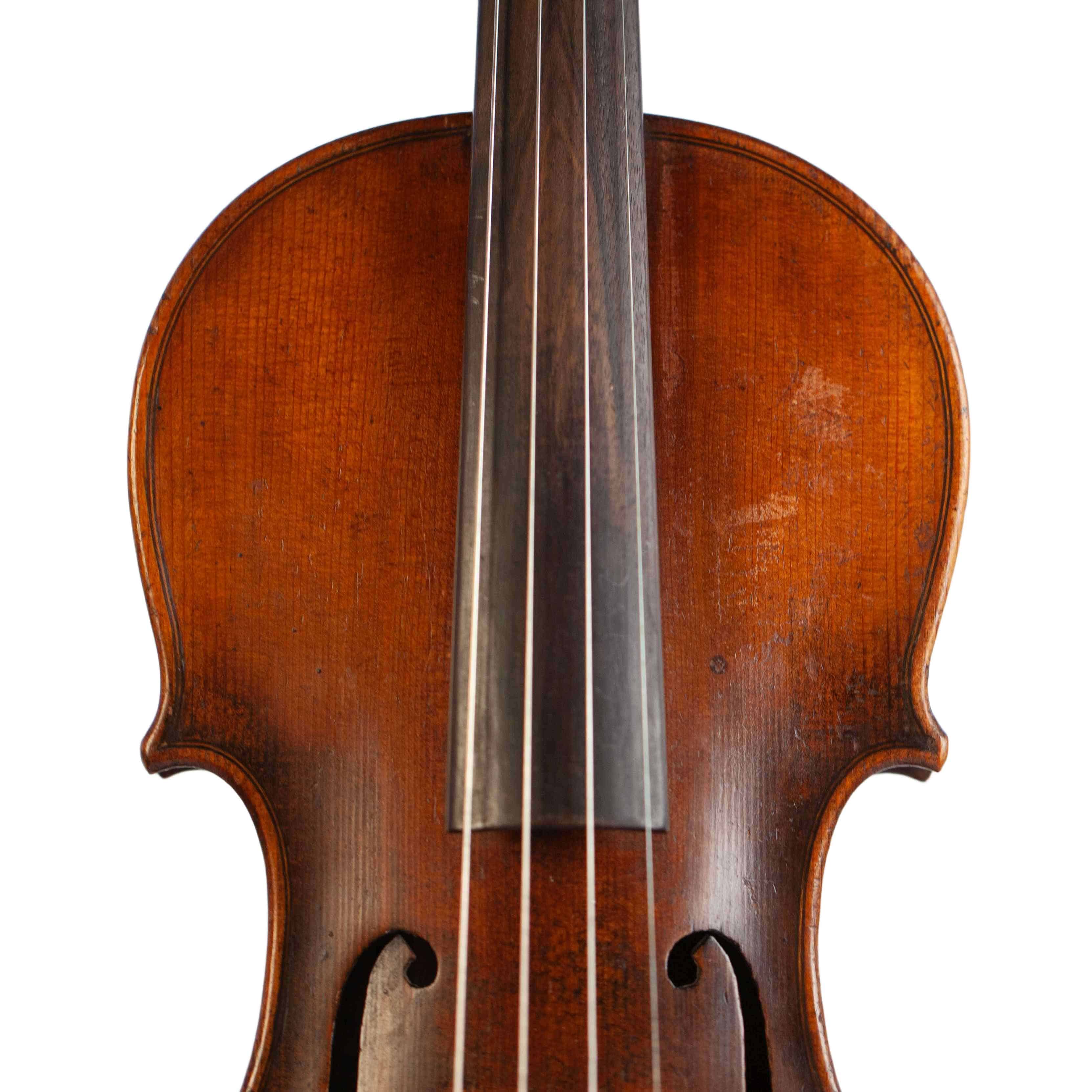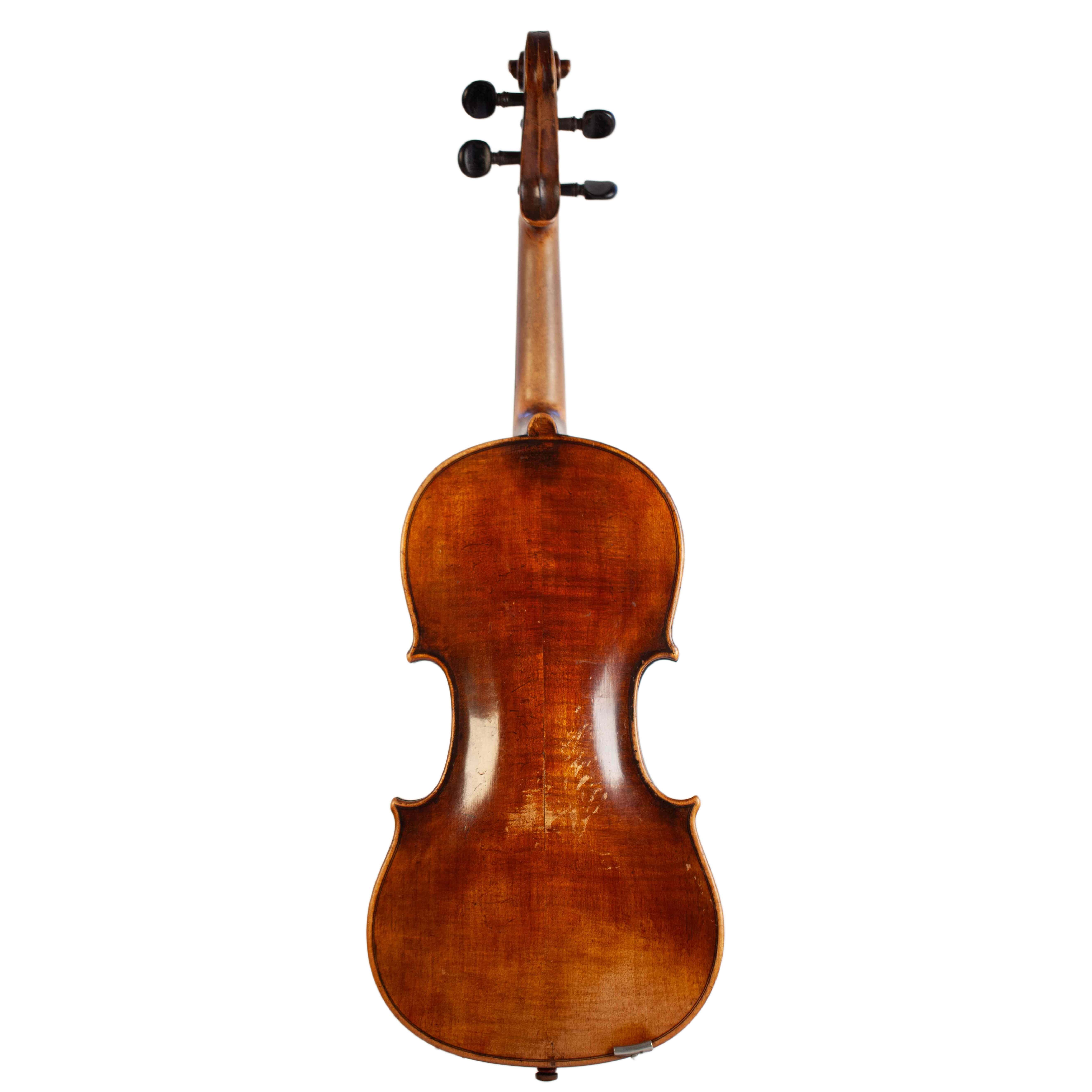 The whole length of the violin is 586 mm and the back 357 mm. The width of the upper bouts: 162 mm; middle bouts: 108 mm; lower bouts: 201 mm.