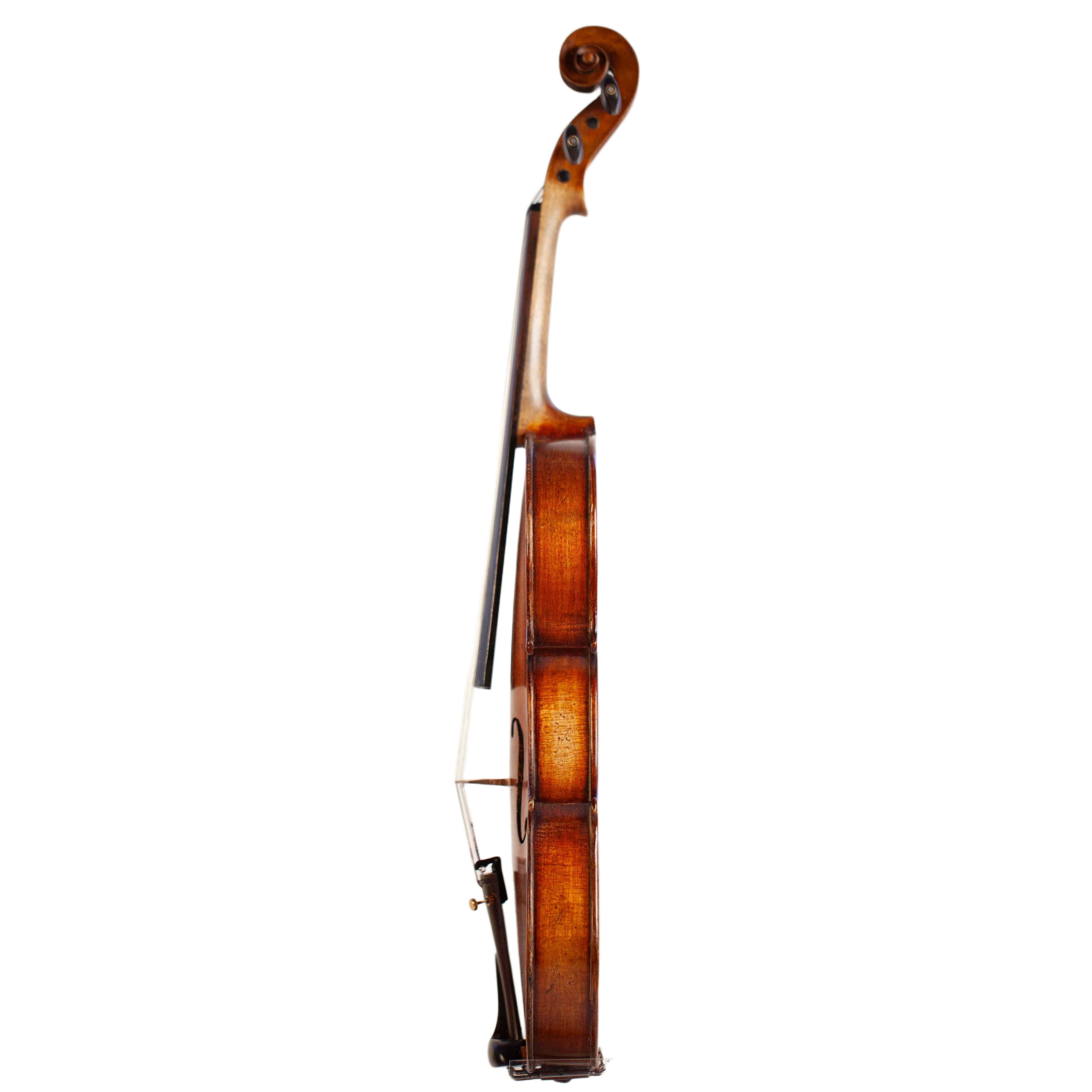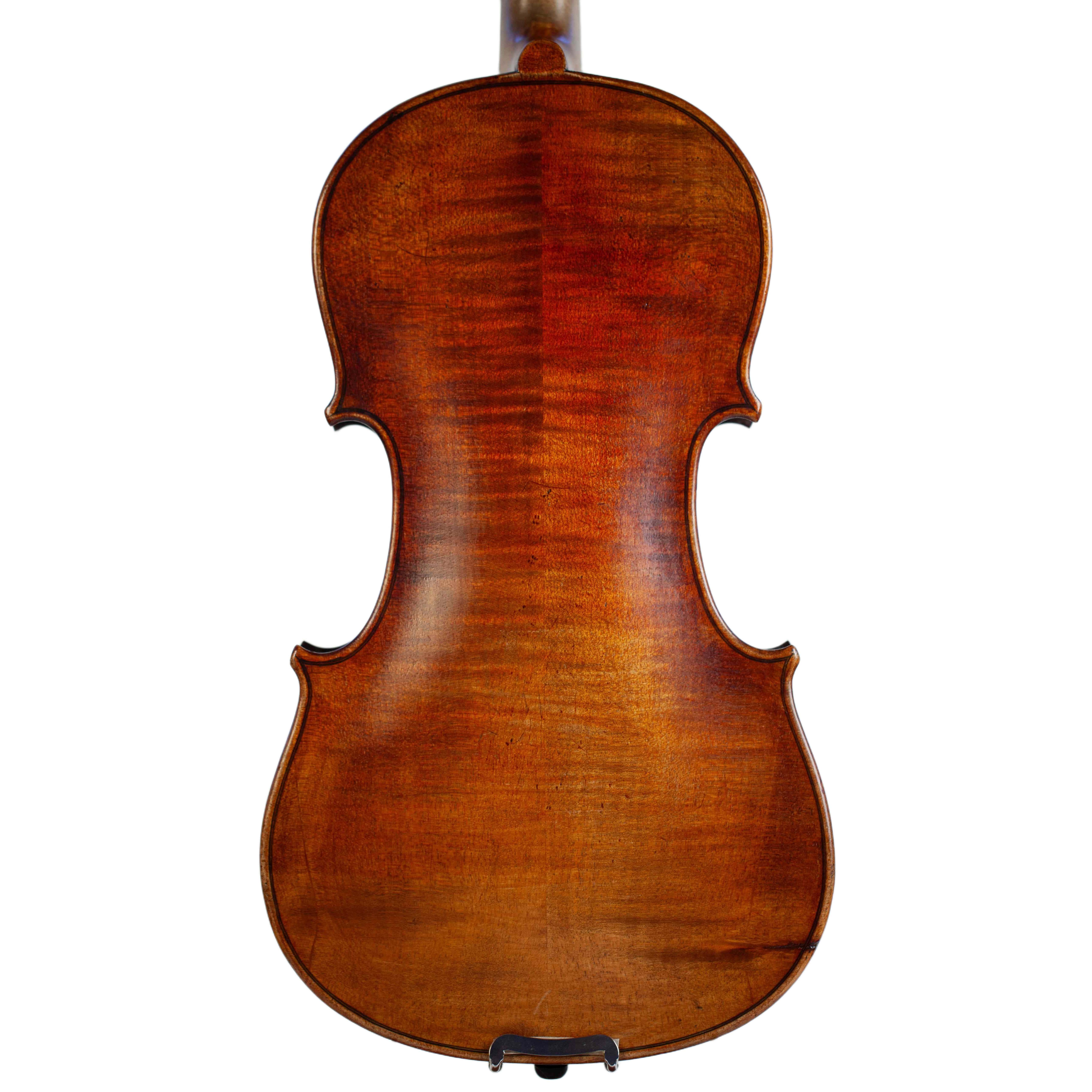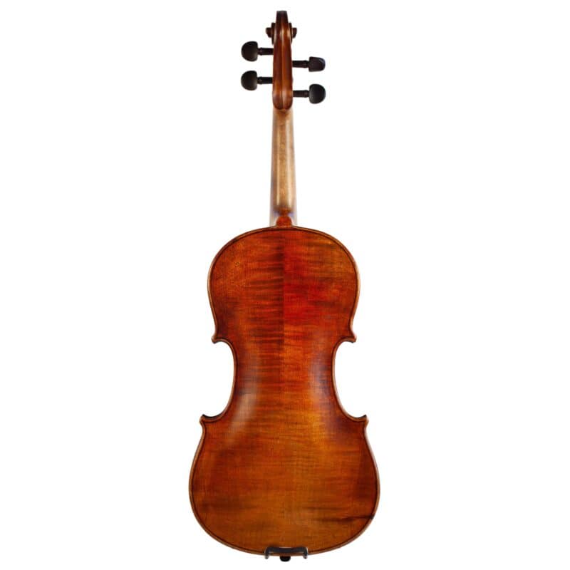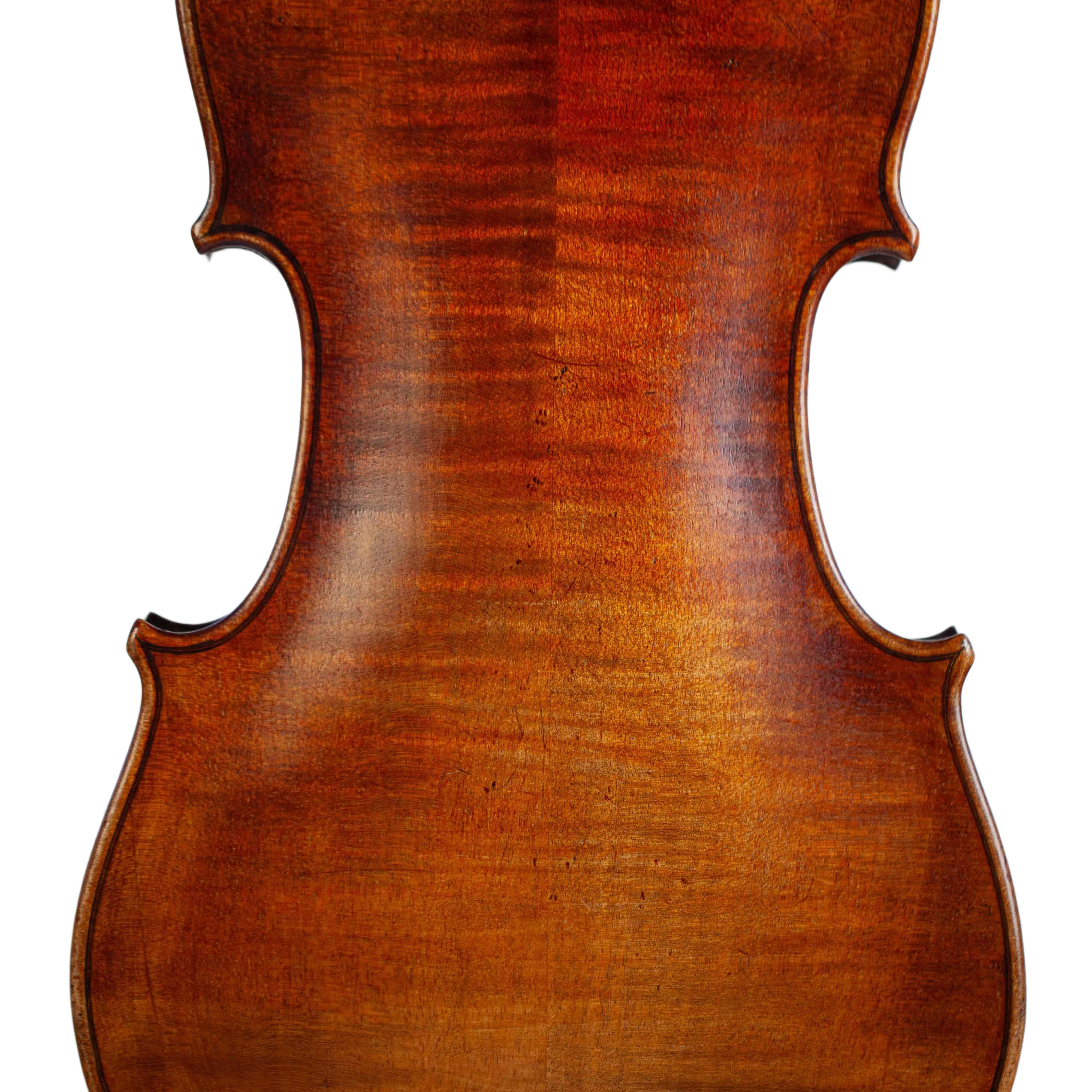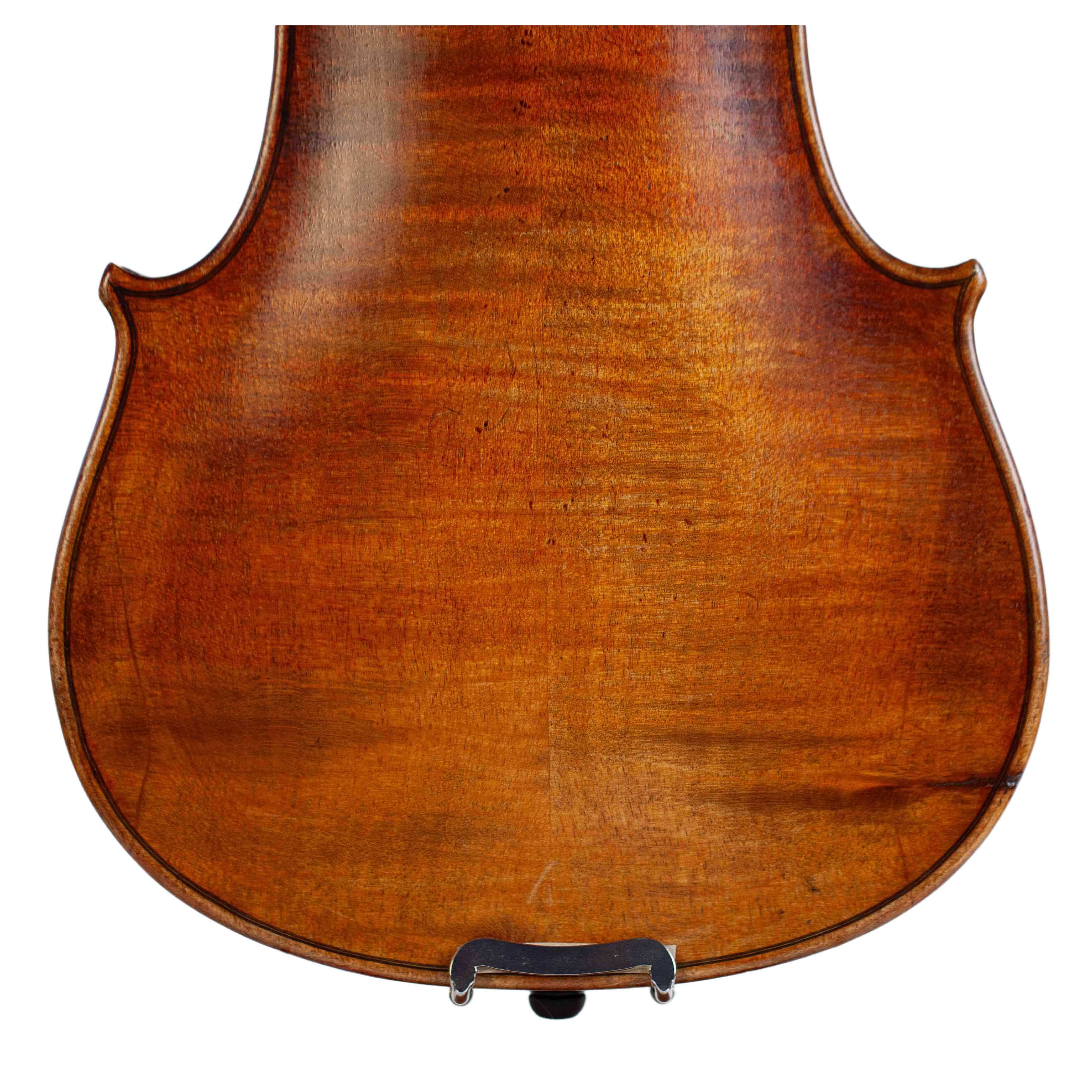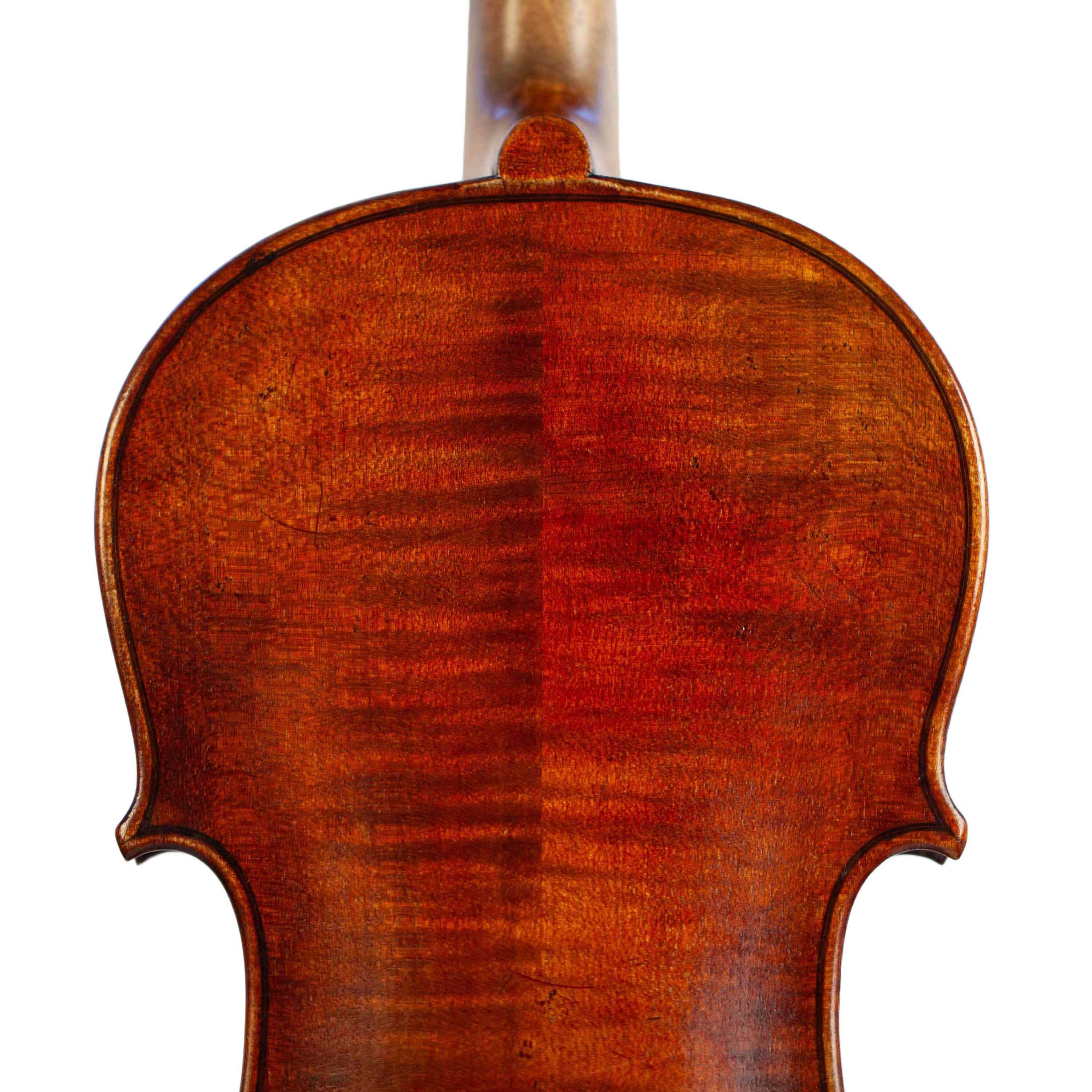 The whole length of the violin is 587 mm and the back 356 mm. The width of the upper bouts: 165 mm; middle bouts: 111 mm; lower bouts: 205 mm.