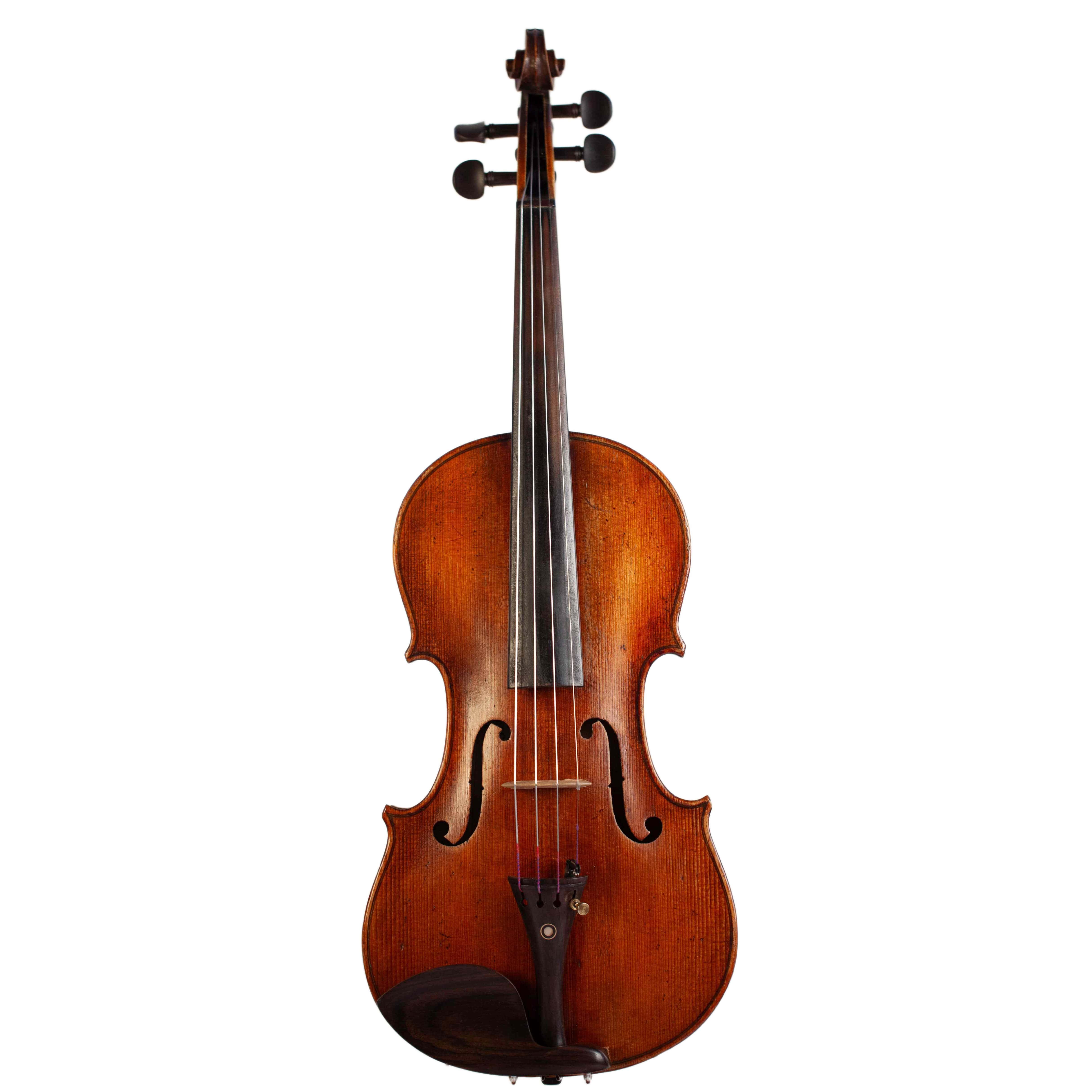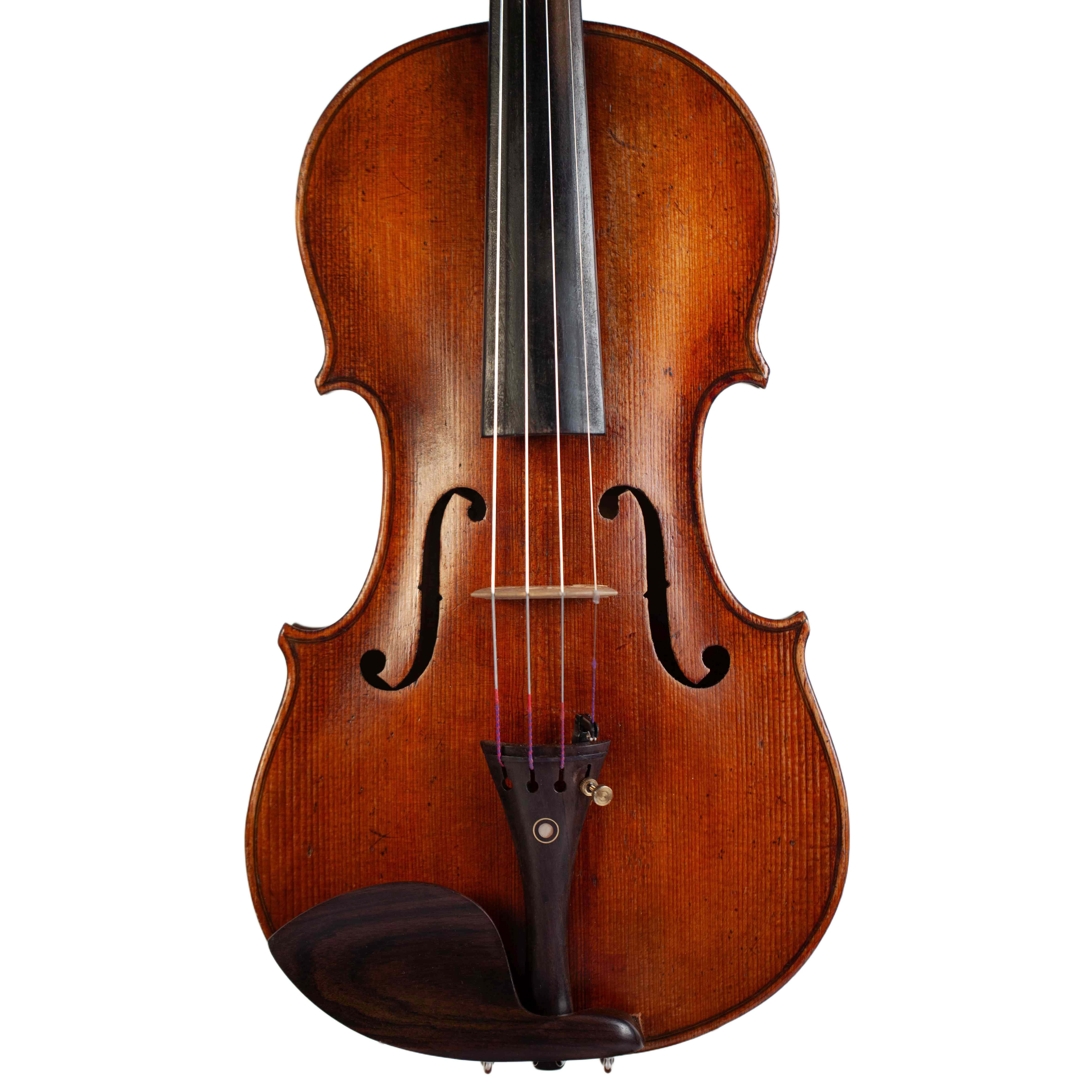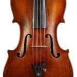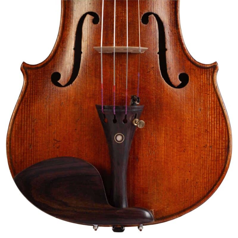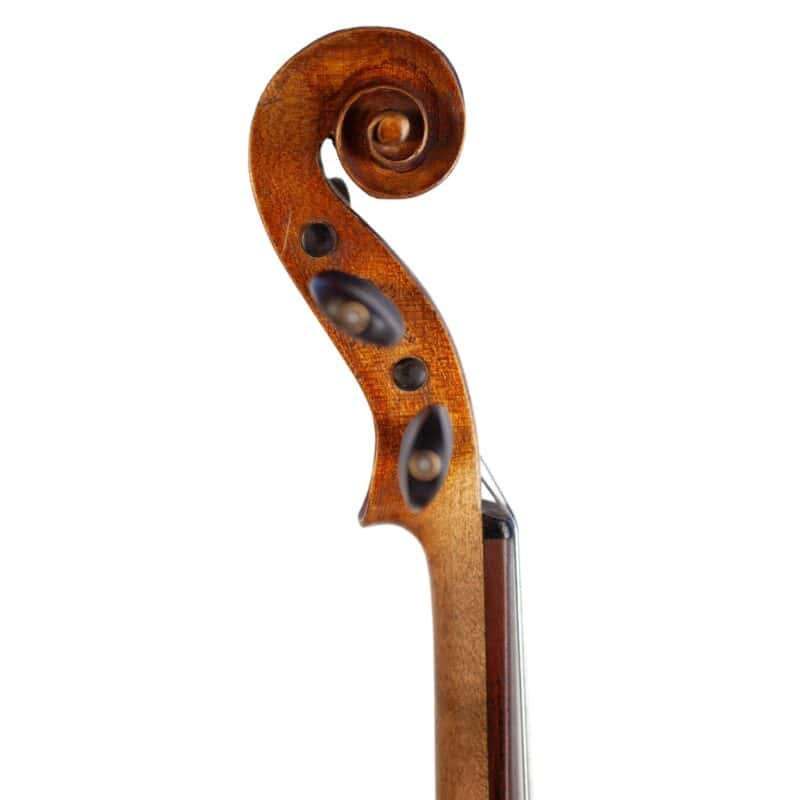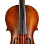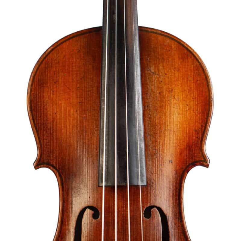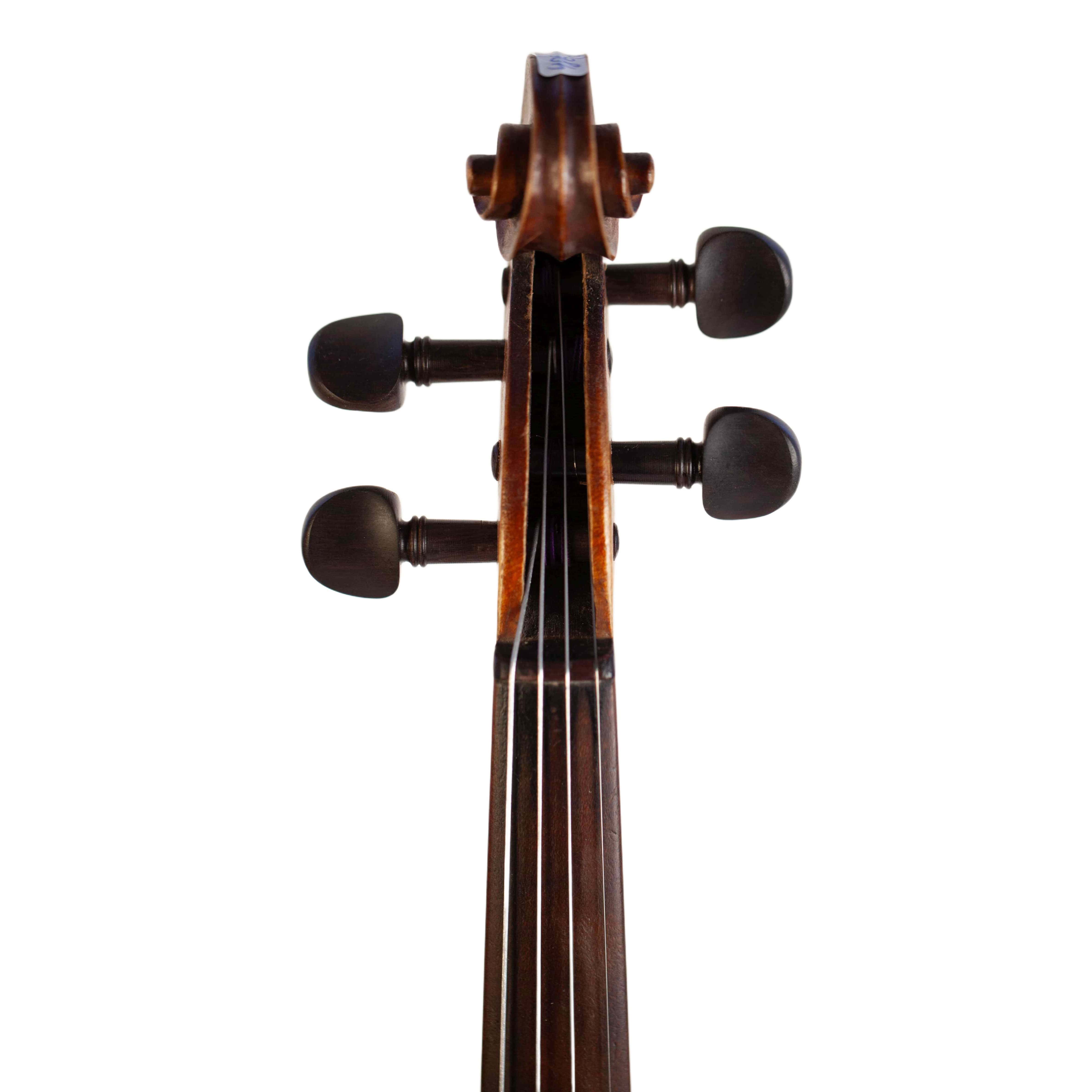 The whole length of the violin is 587 mm and the back 356 mm. The width of the upper bouts: 165 mm; middle bouts: 111 mm; lower bouts: 205 mm.