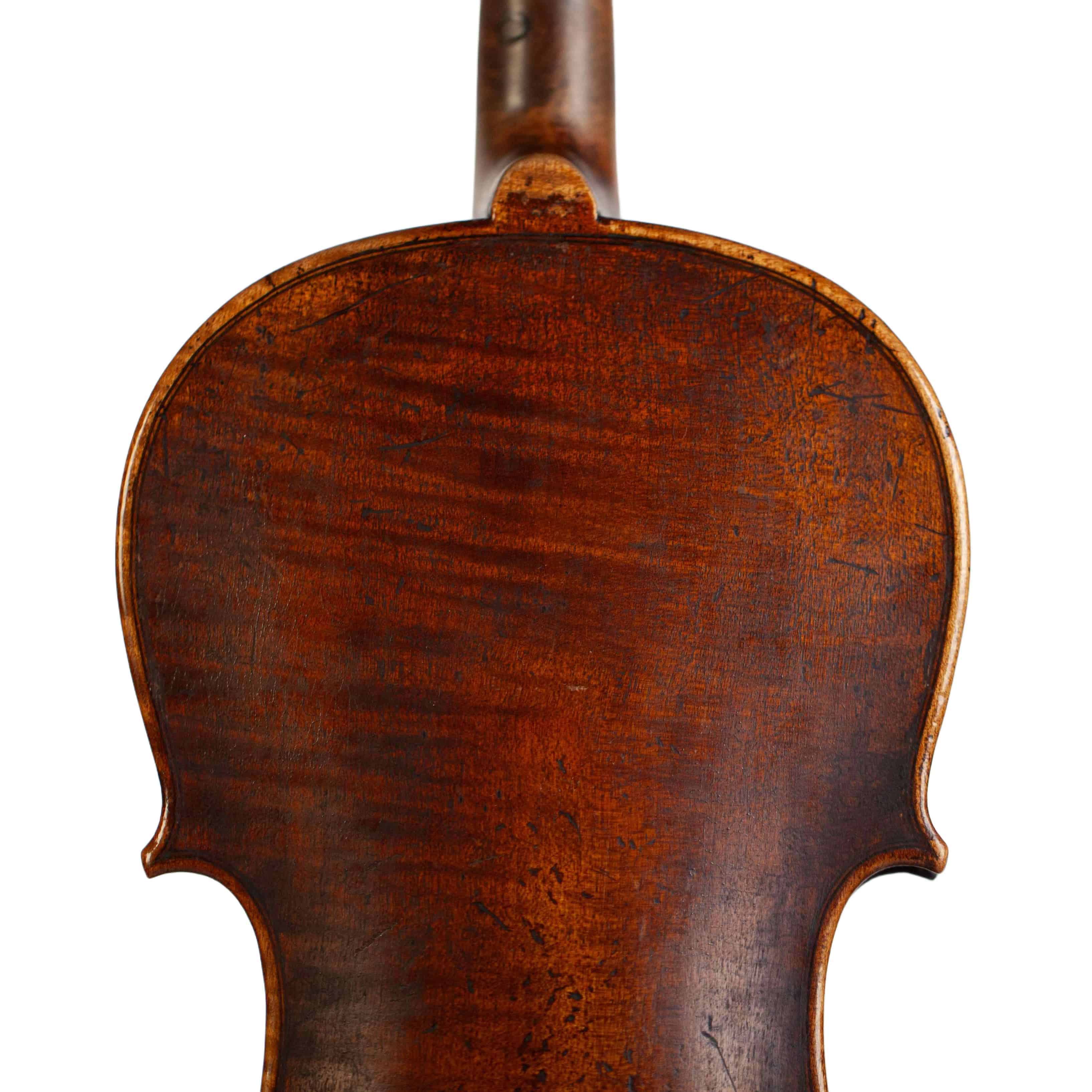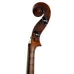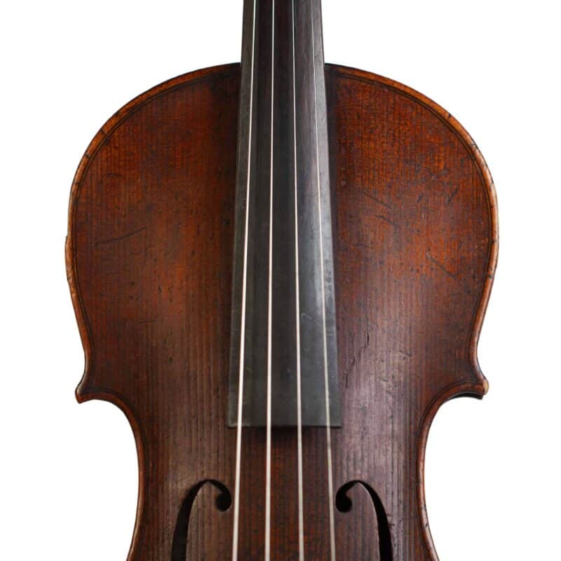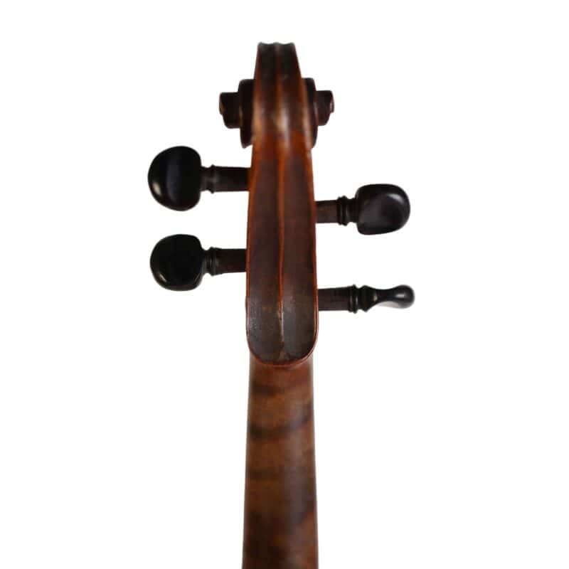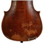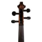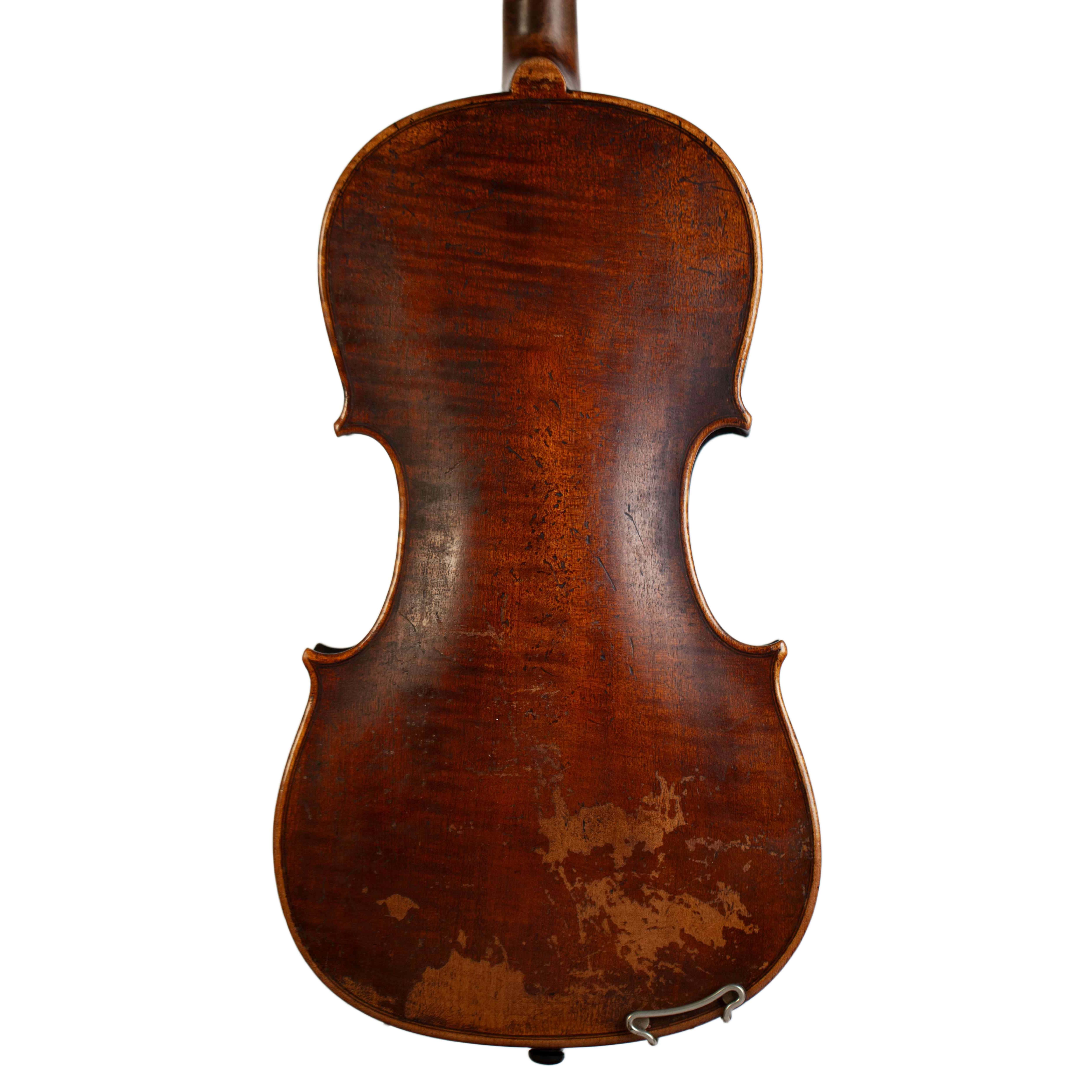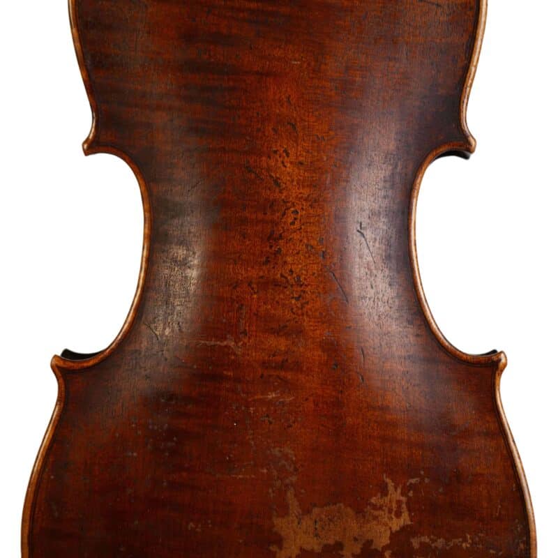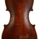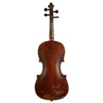 The whole length of the violin is 590 mm and the back 362 mm. The width of the upper bouts: 168 mm; middle bouts: 113 mm; lower bouts: 208 mm.