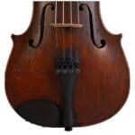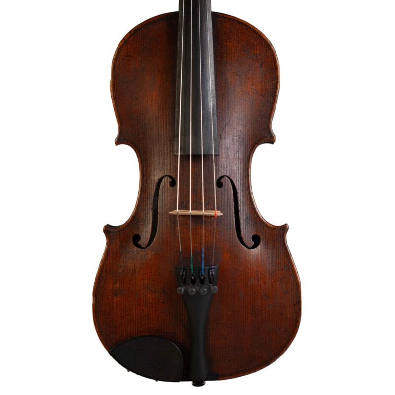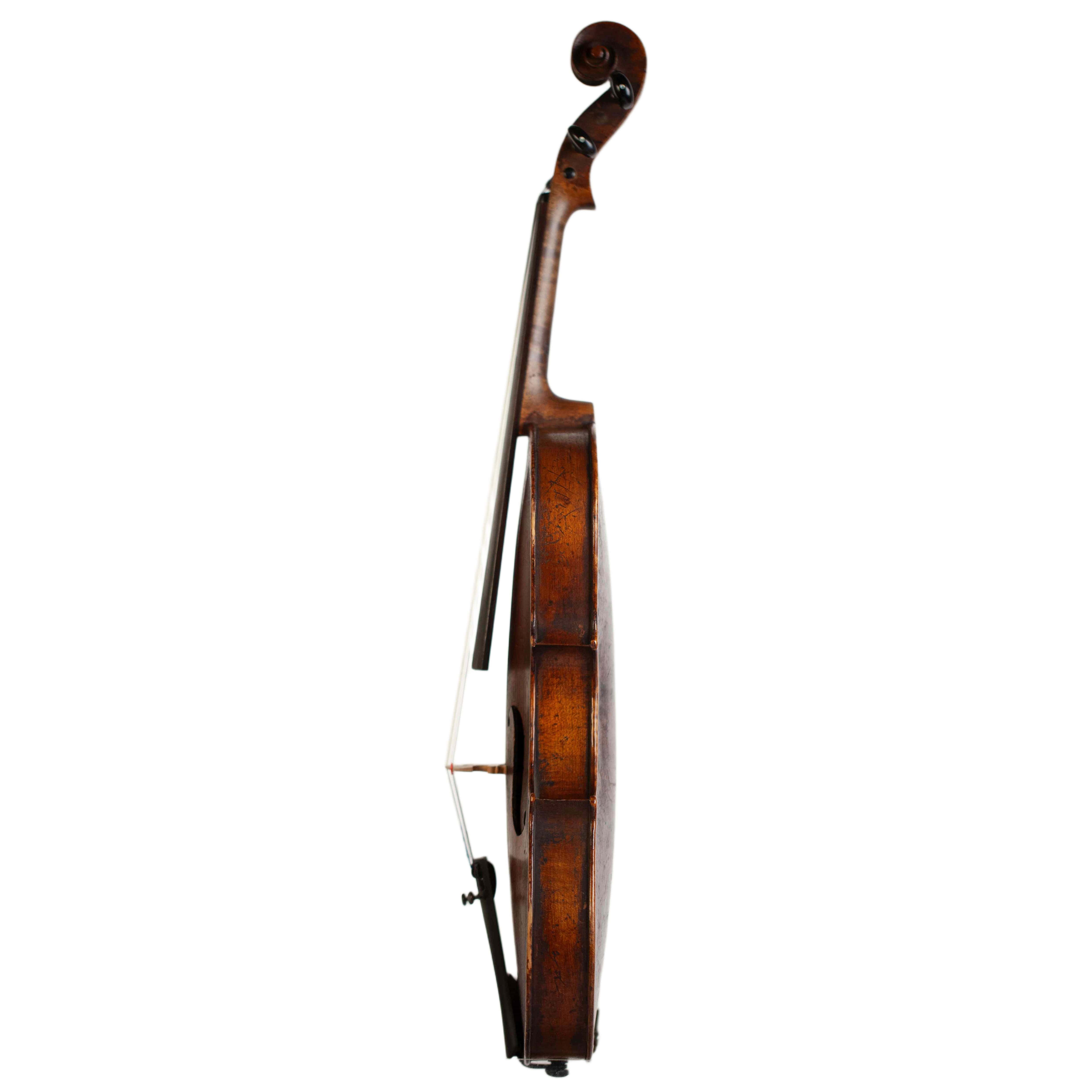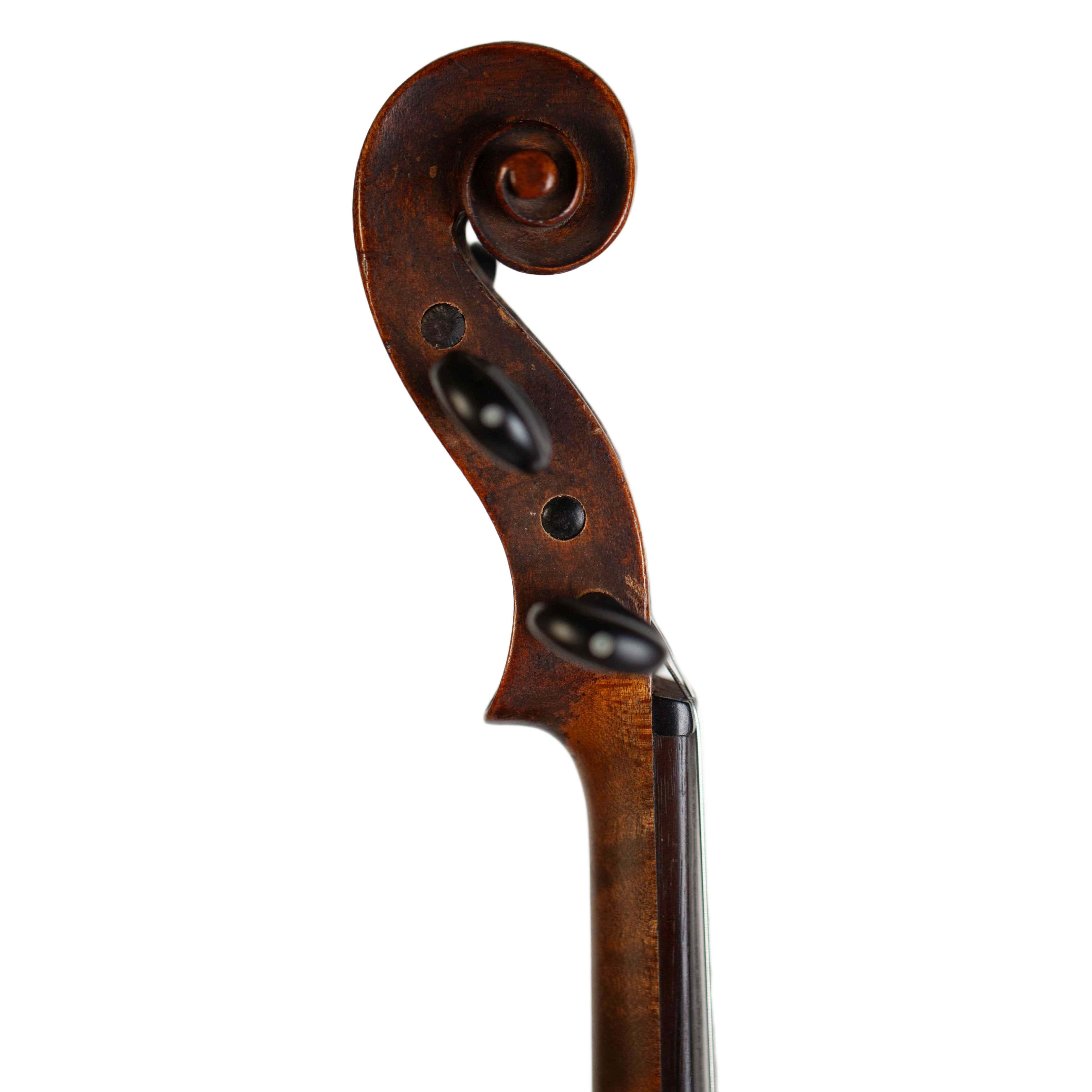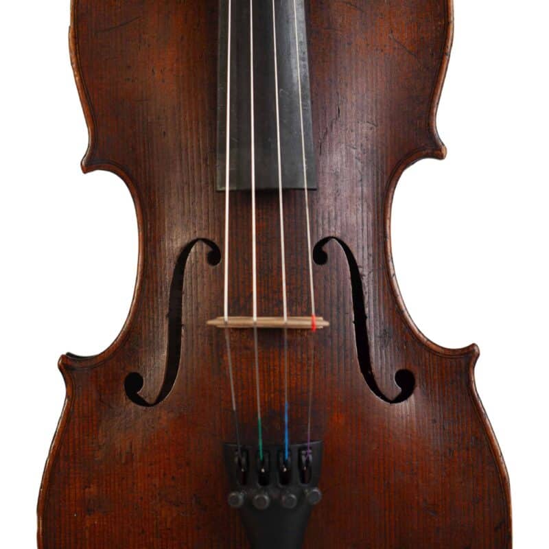 The whole length of the violin is 590 mm and the back 362 mm. The width of the upper bouts: 168 mm; middle bouts: 113 mm; lower bouts: 208 mm.