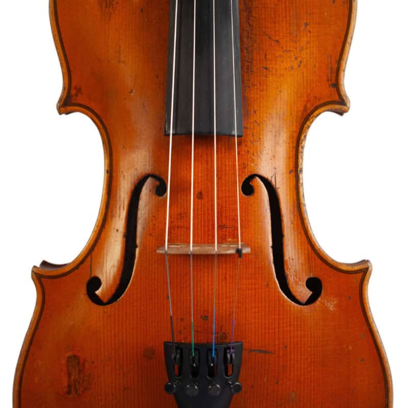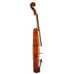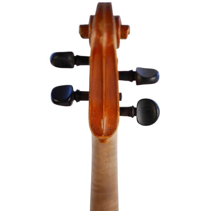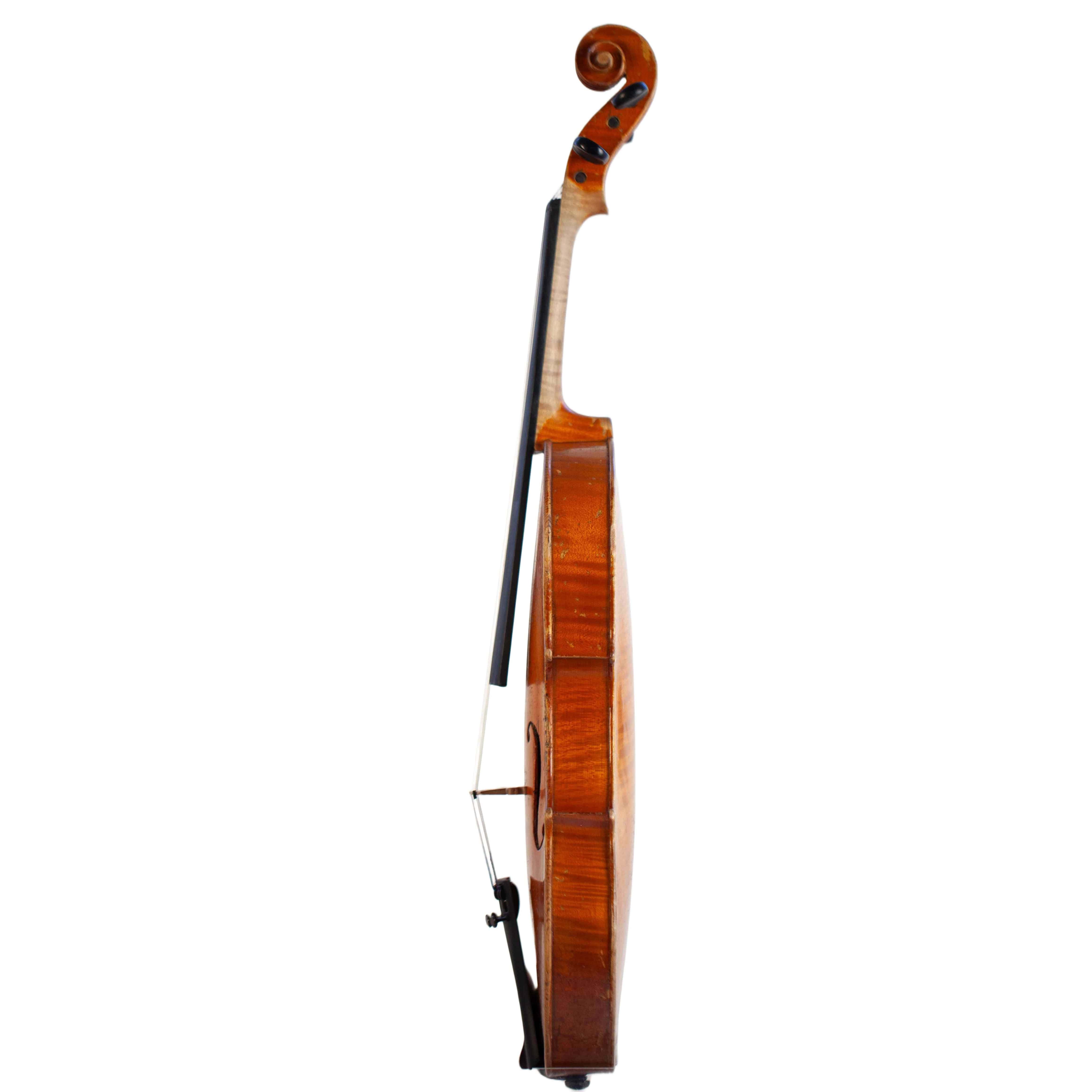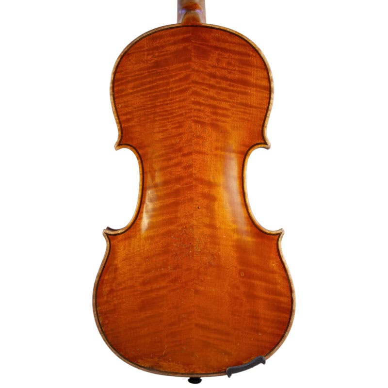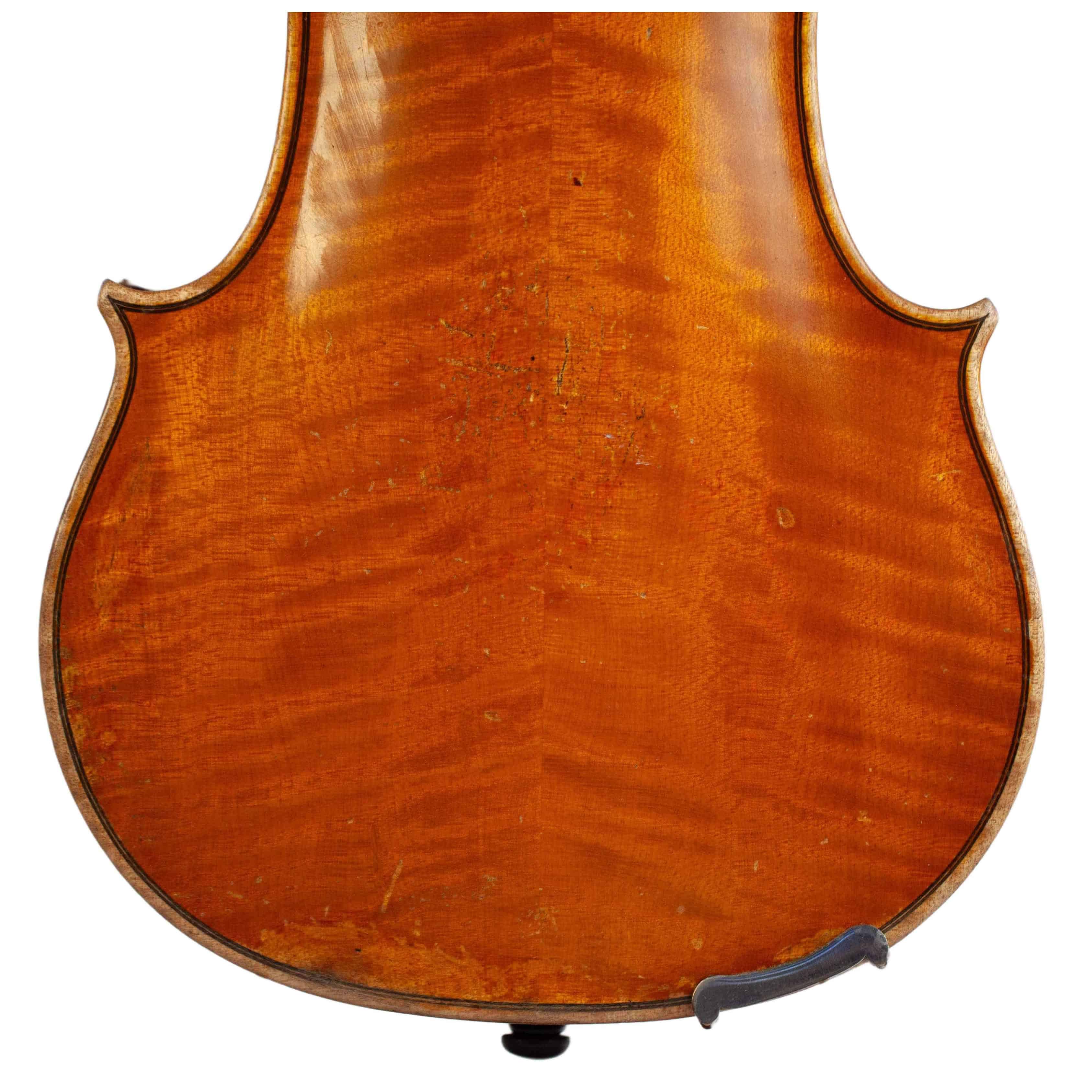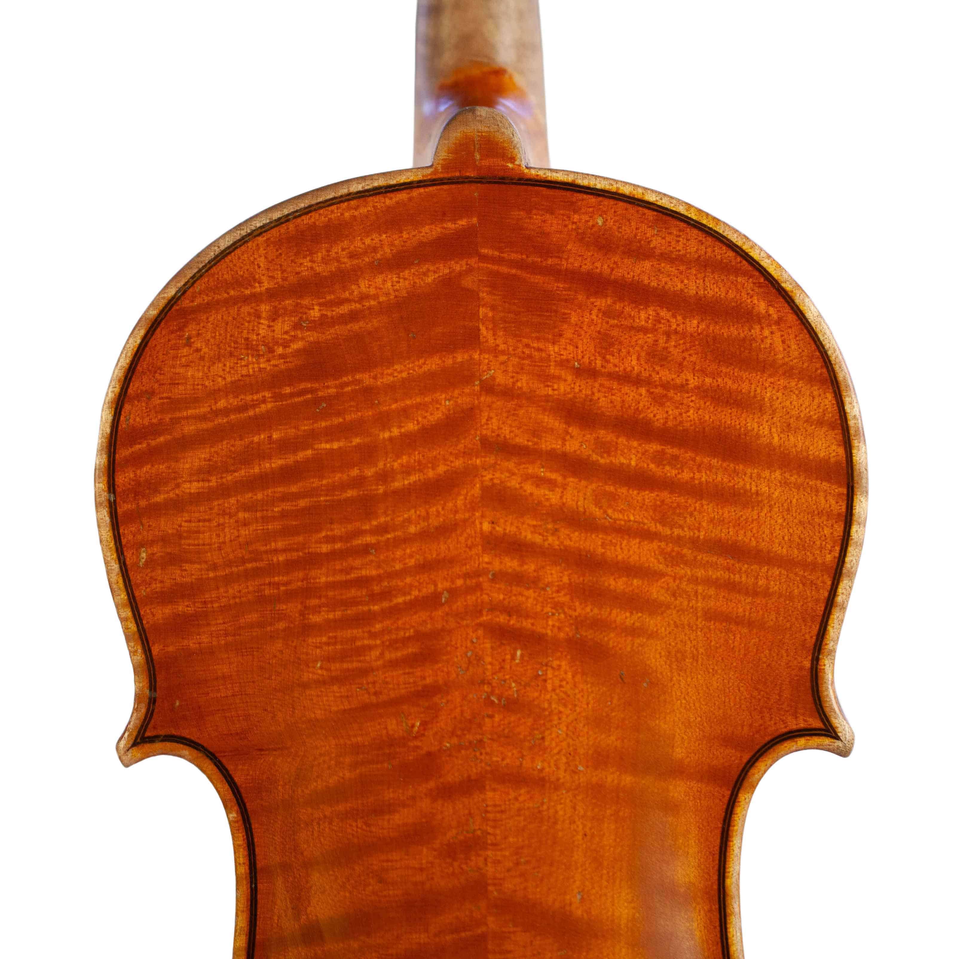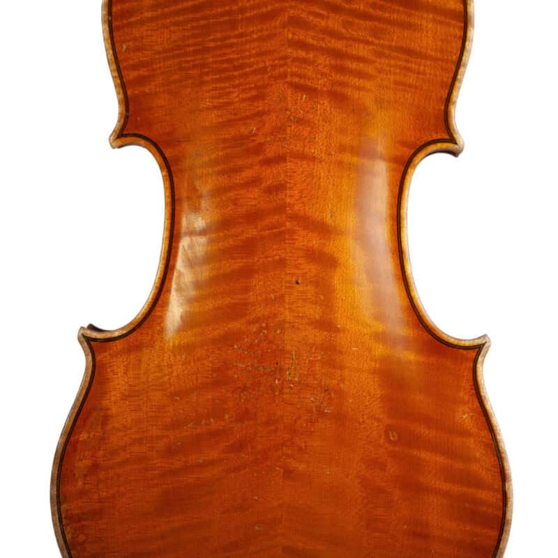 The whole length of the violin is 590 mm and the back 356 mm. The width of the upper bouts: 165 mm; middle bouts: 111 mm; lower bouts: 205 mm.