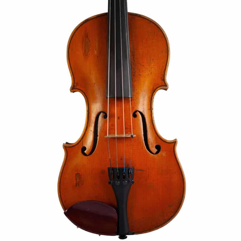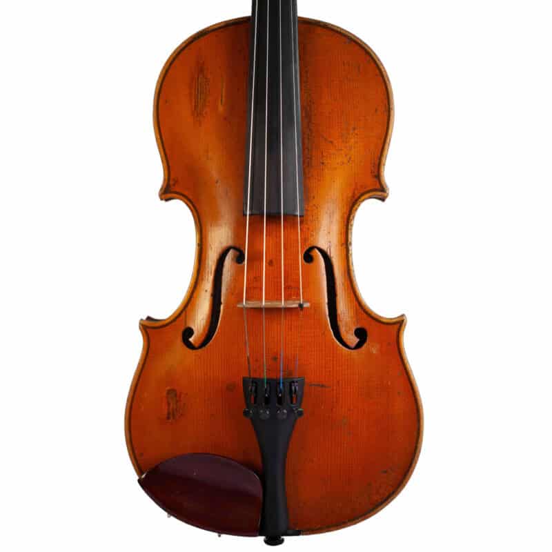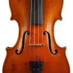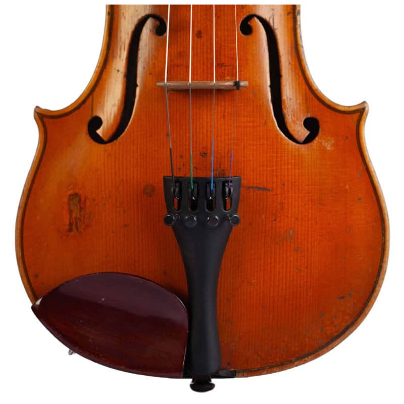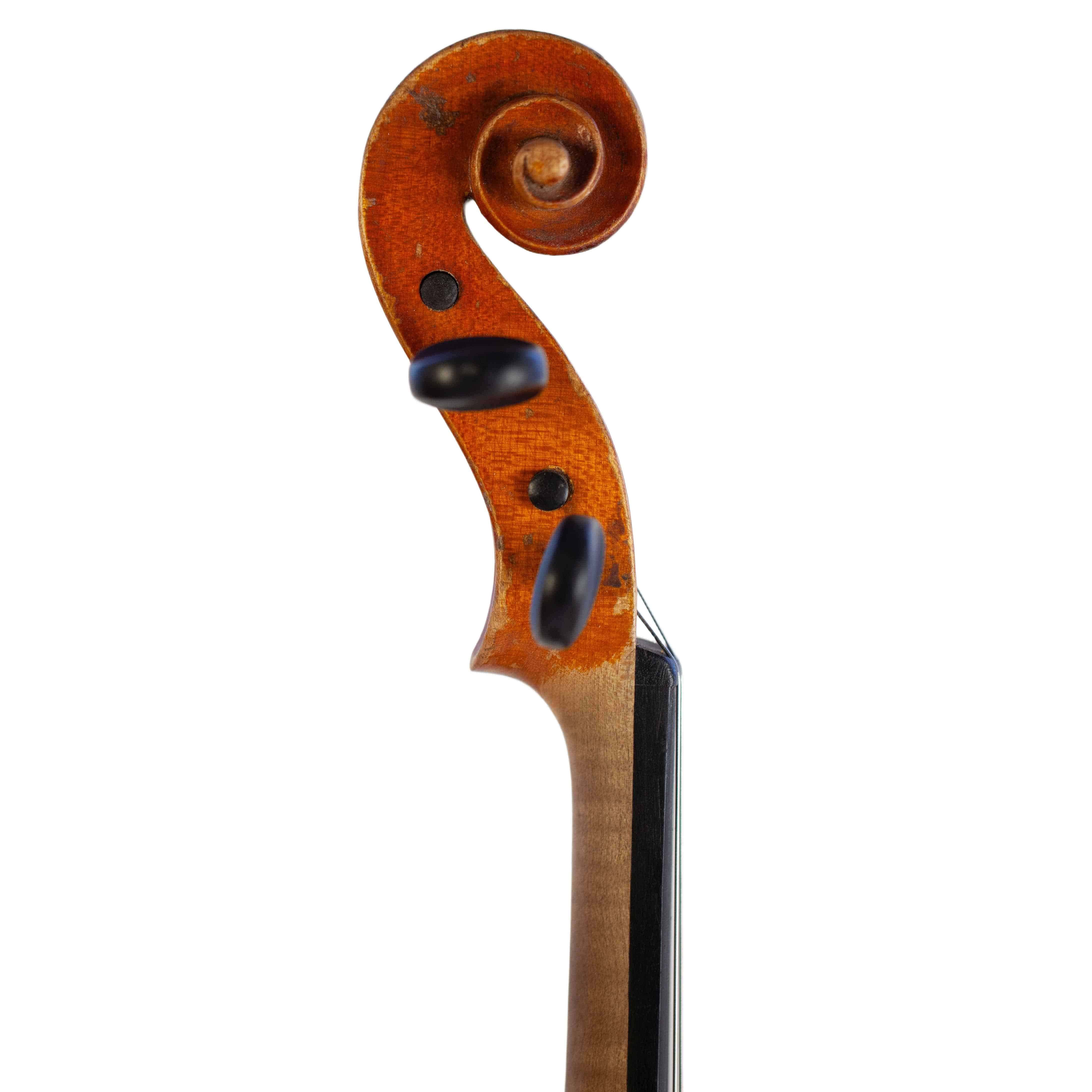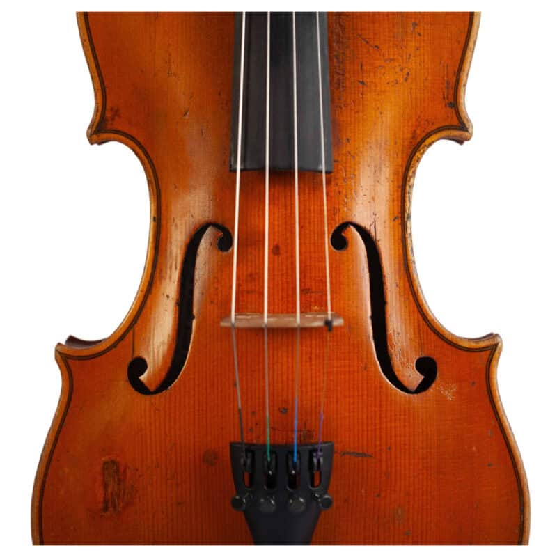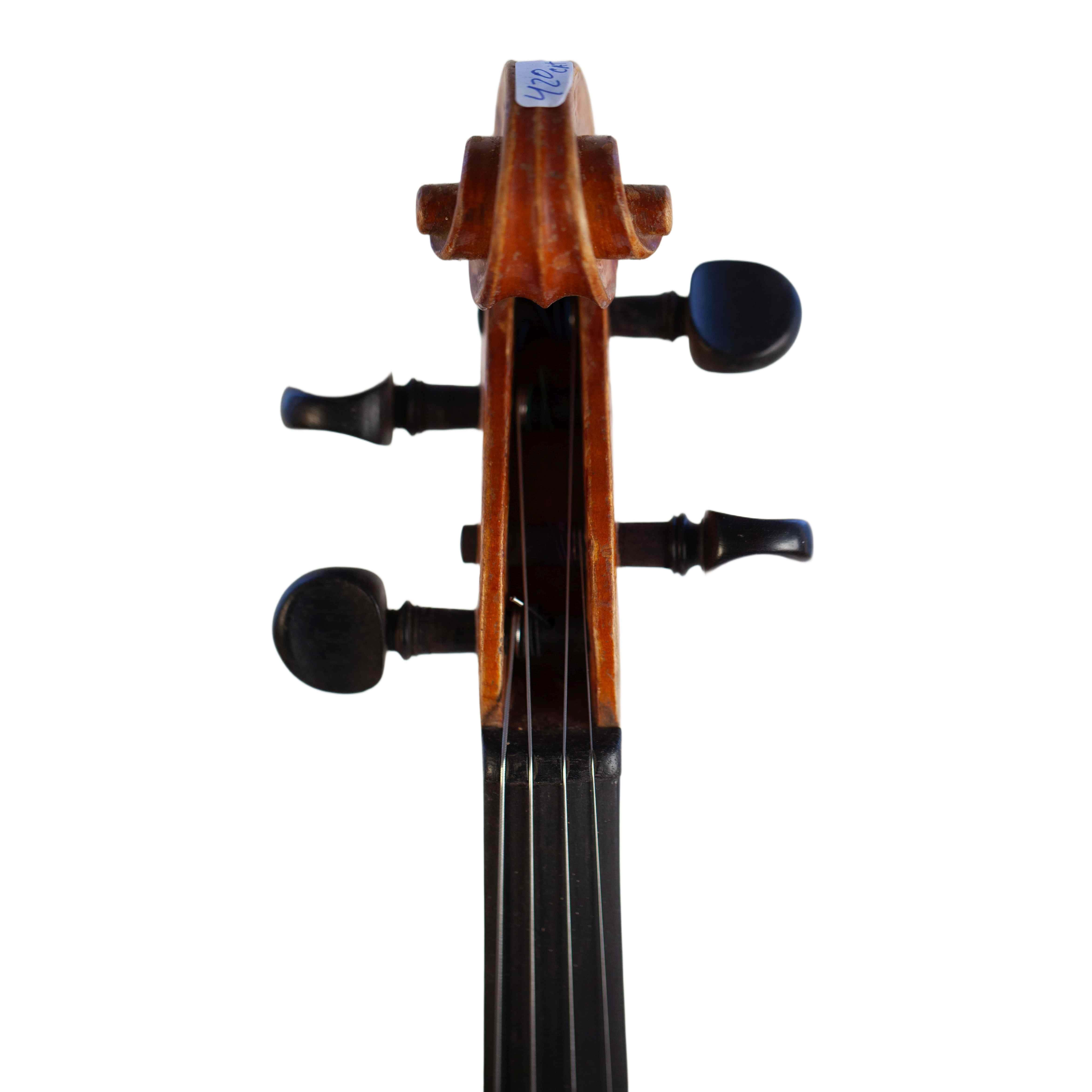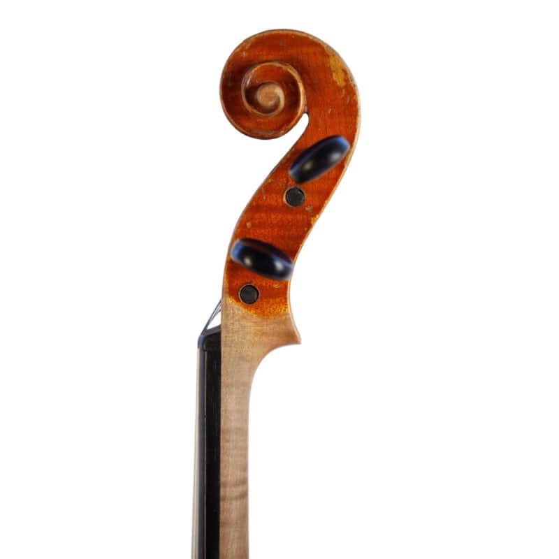 The whole length of the violin is 590 mm and the back 356 mm. The width of the upper bouts: 165 mm; middle bouts: 111 mm; lower bouts: 205 mm.