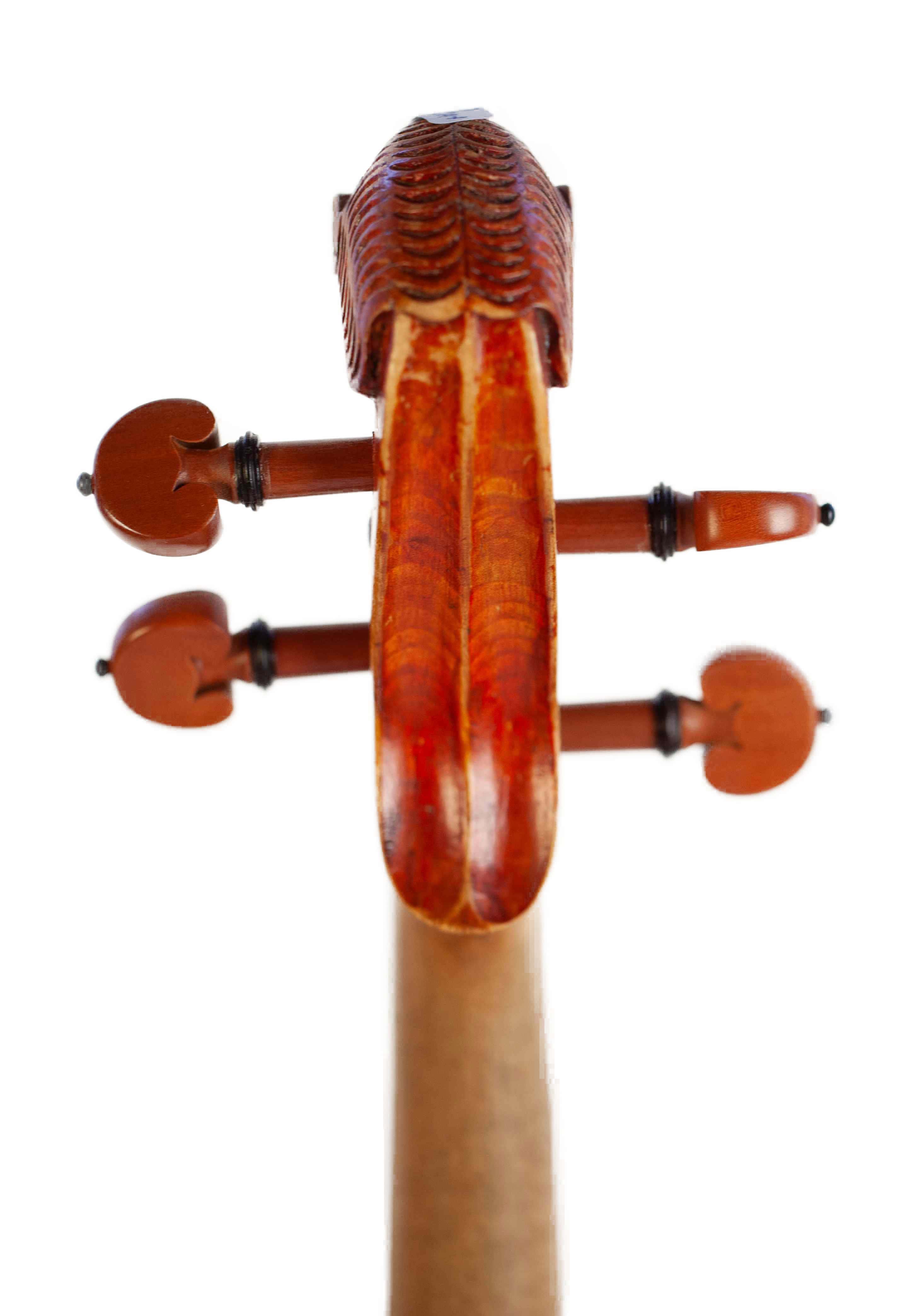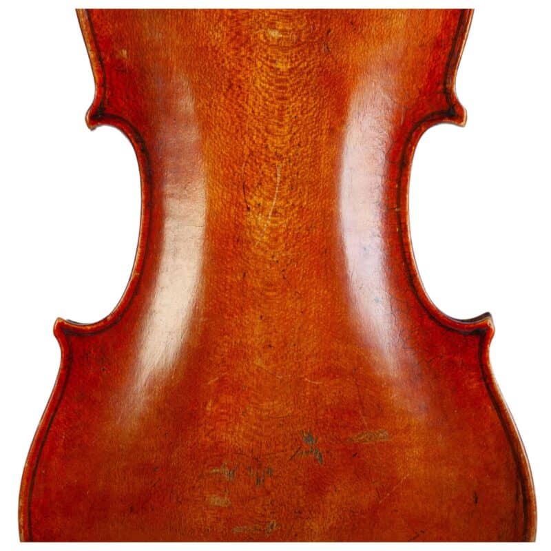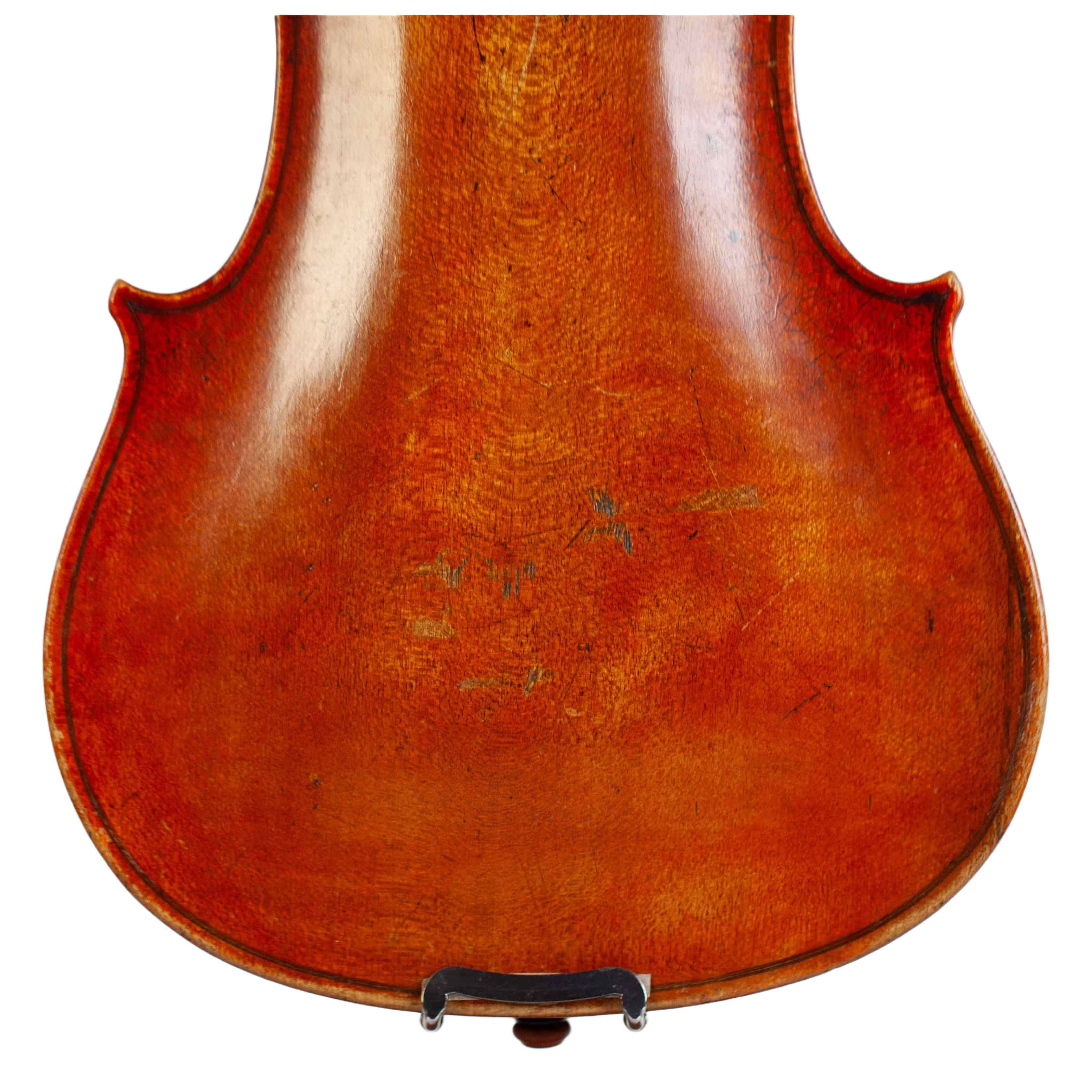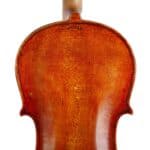 The whole length of the violin is 590 mm and the back 357 mm. The width of the upper bouts: 163 mm; middle bouts: 110 mm; lower bouts: 208 mm.