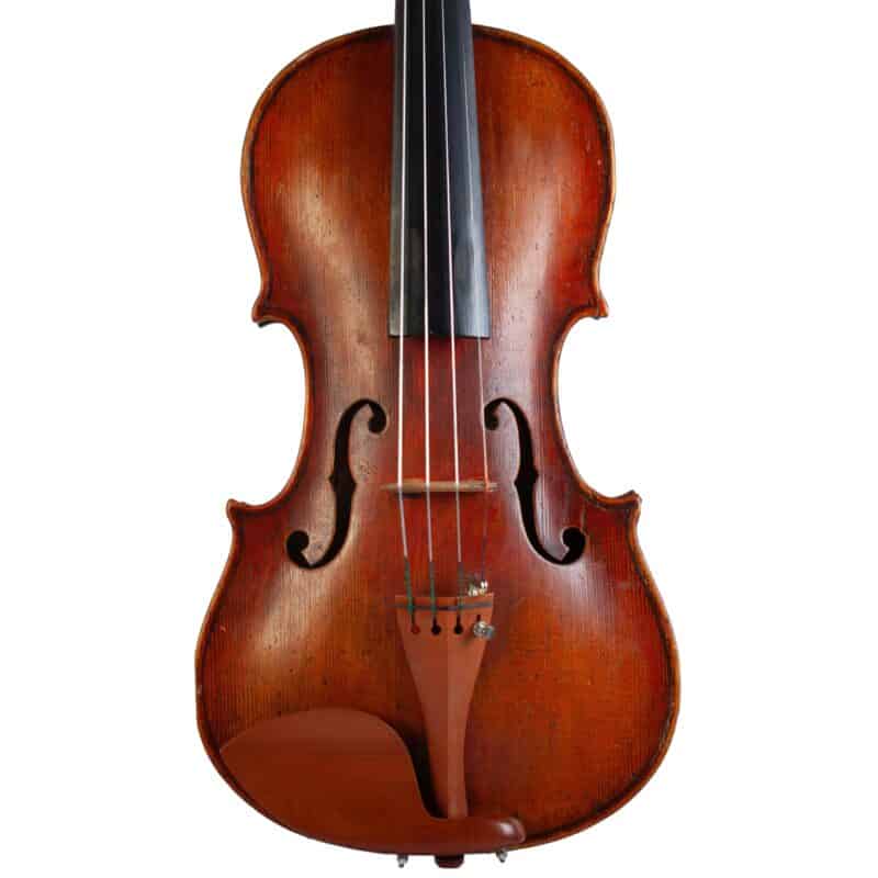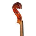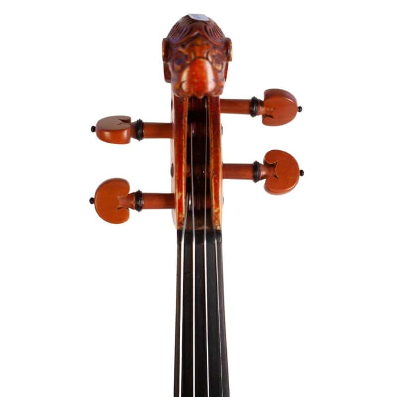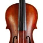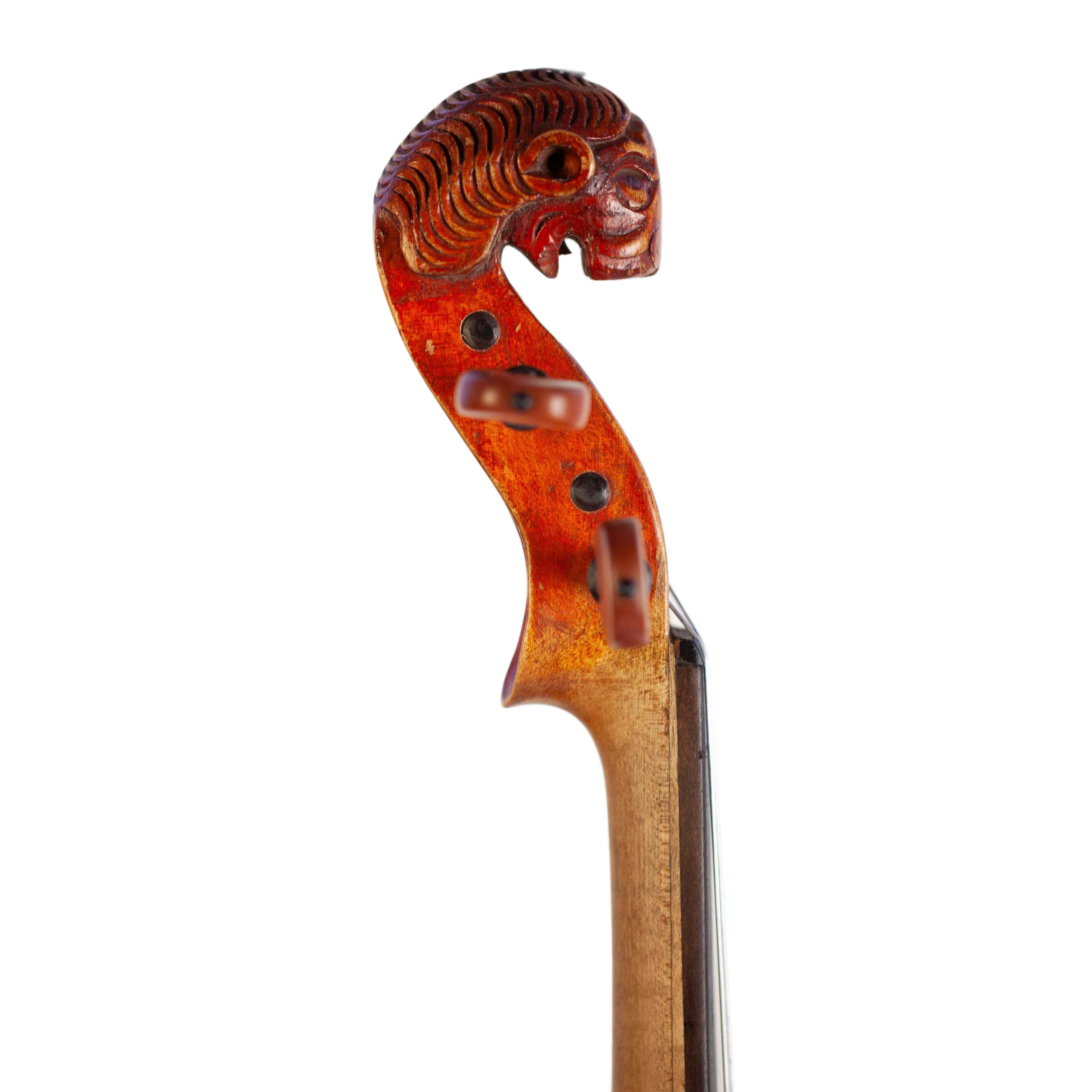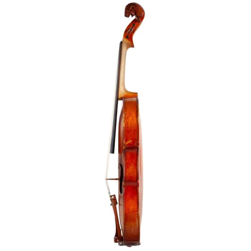 The whole length of the violin is 590 mm and the back 357 mm. The width of the upper bouts: 163 mm; middle bouts: 110 mm; lower bouts: 208 mm.