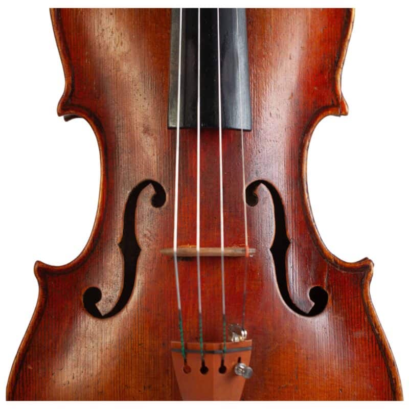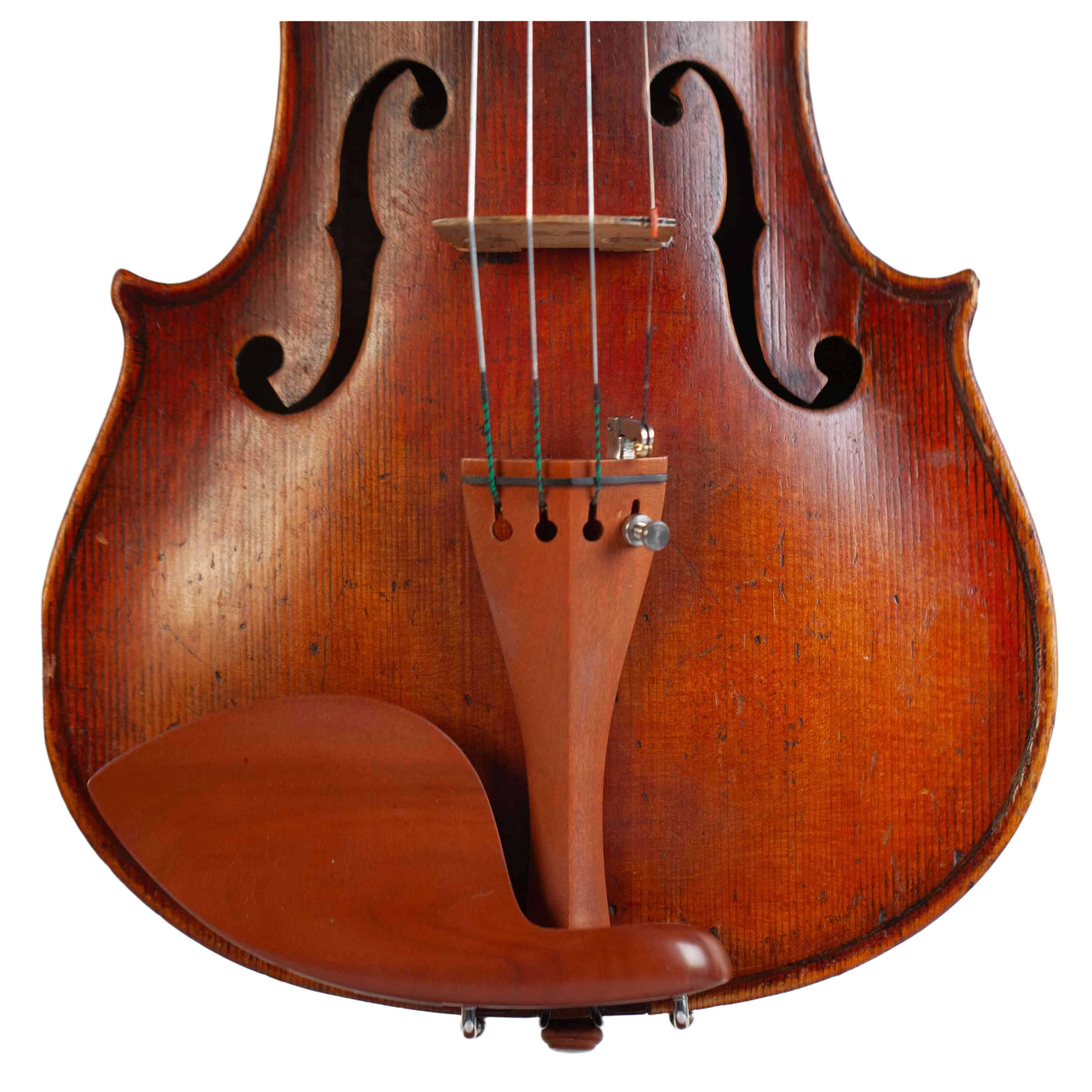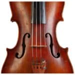 Repaired crack to the right f-hole.