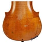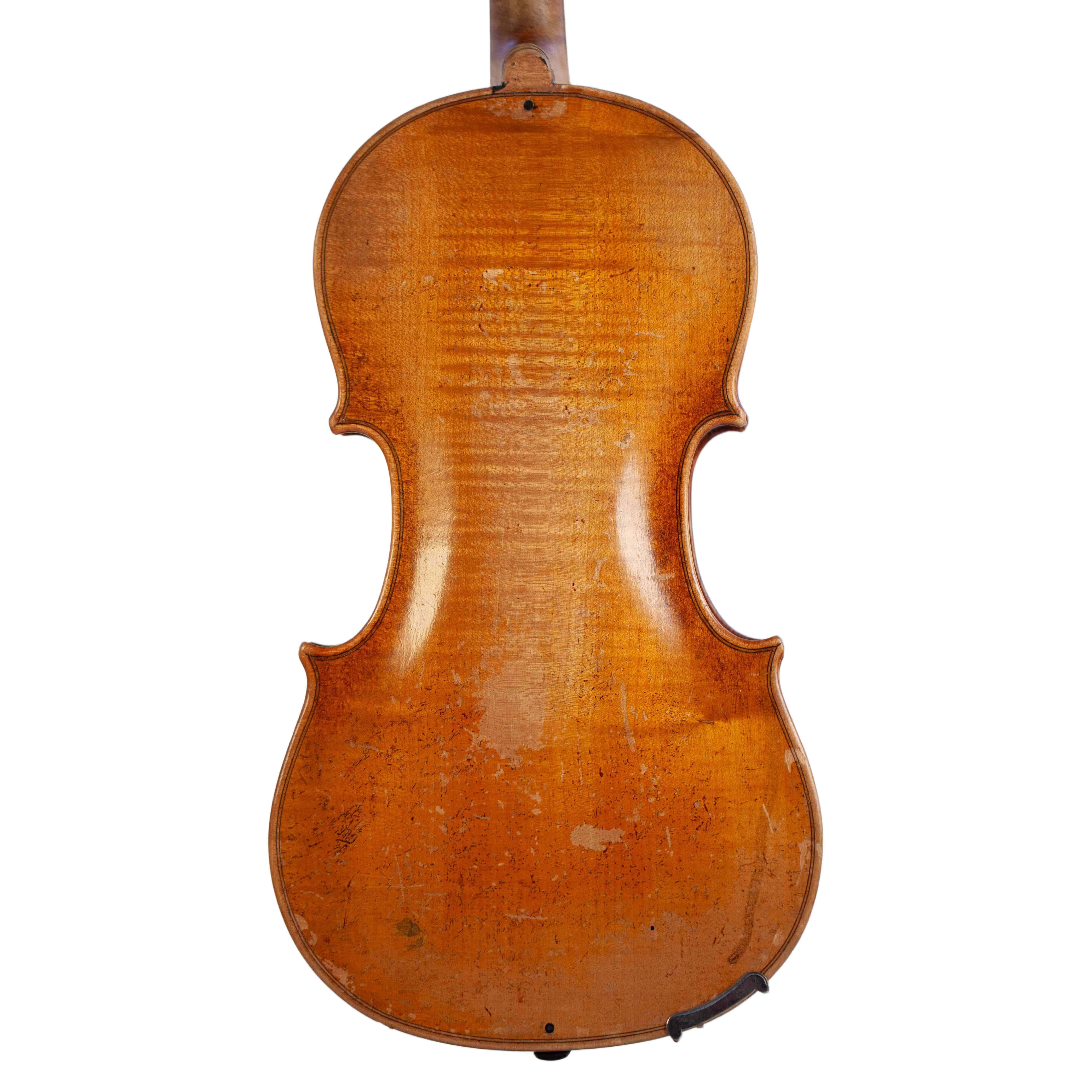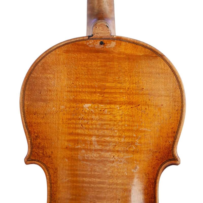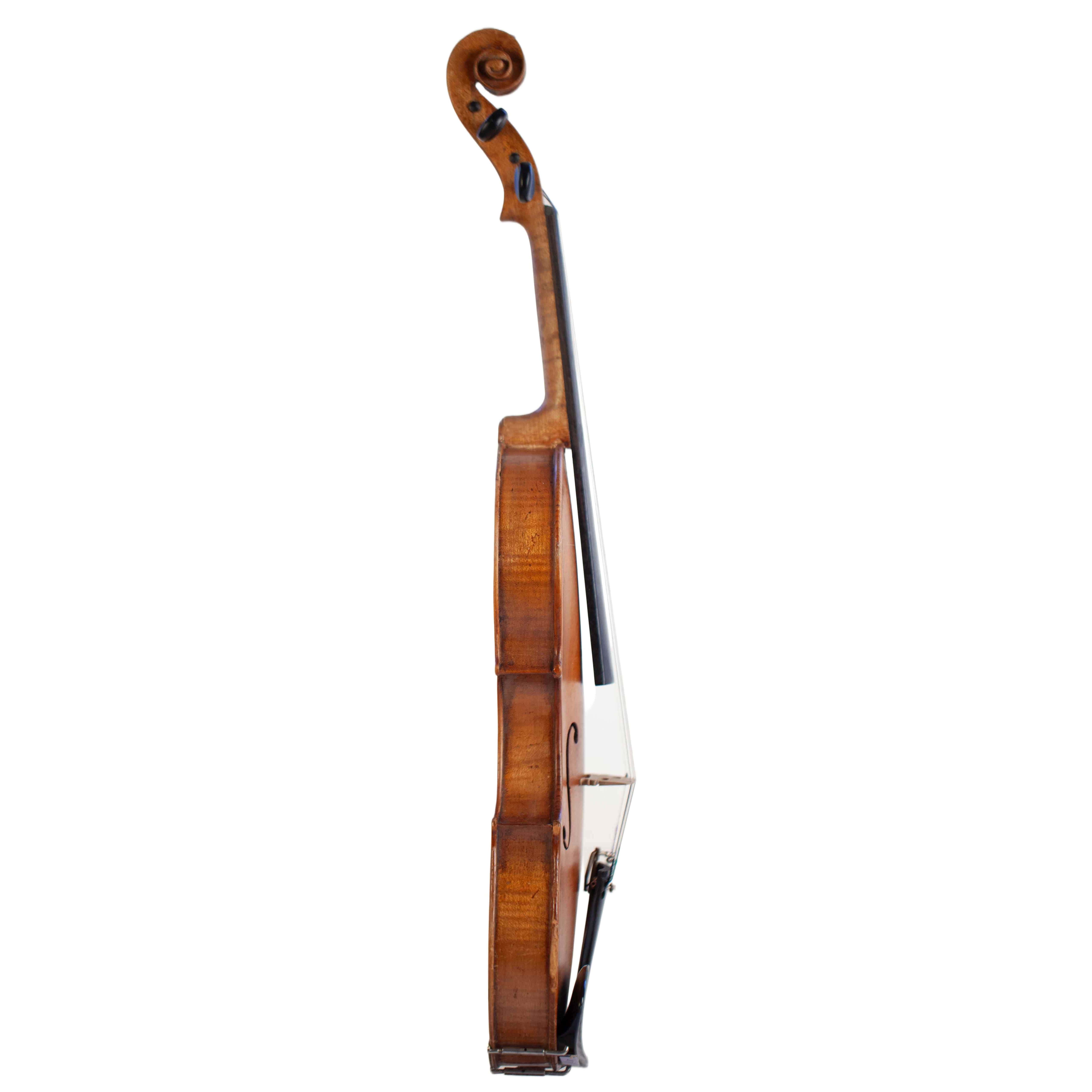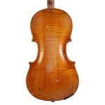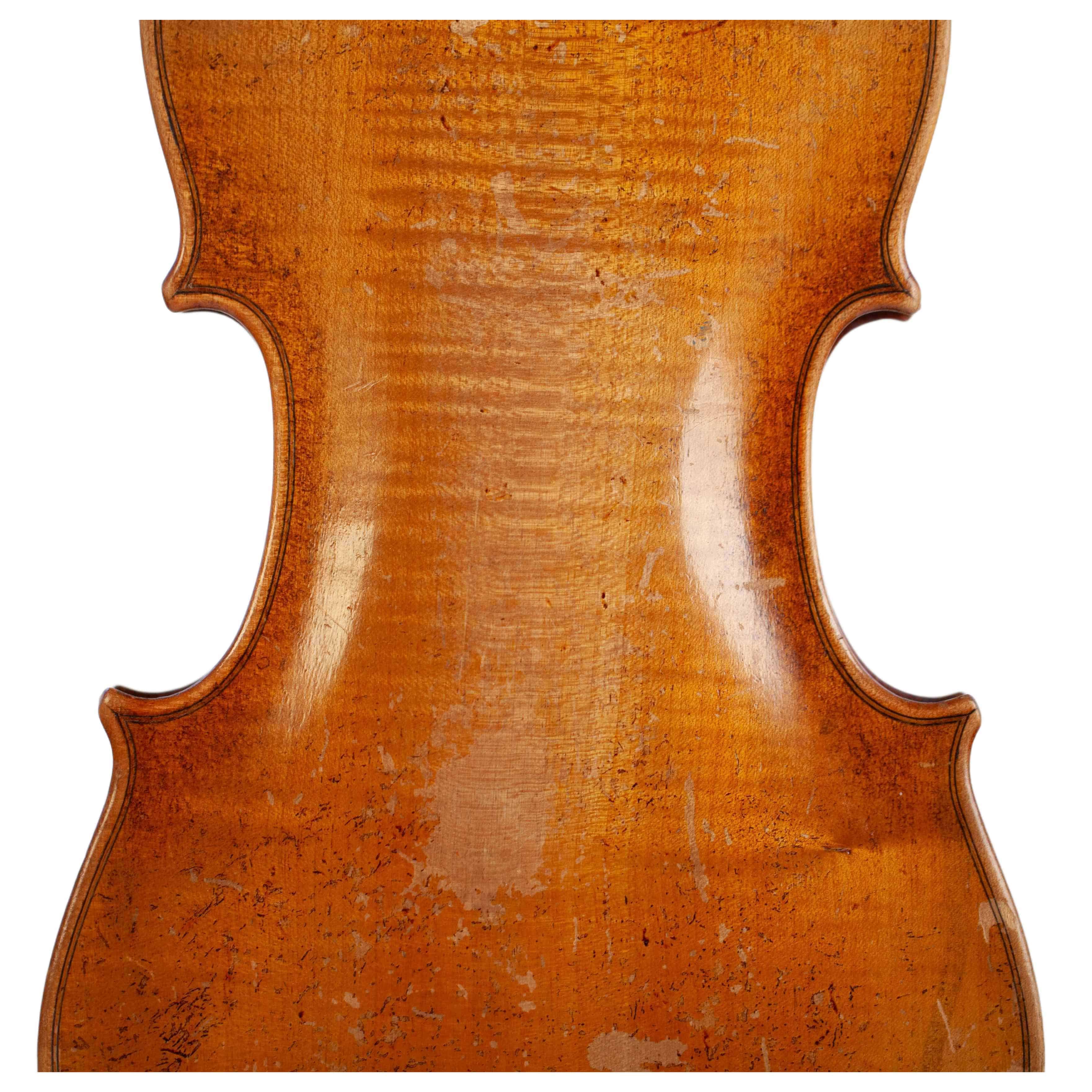 The whole length of the violin is 594 mm and the back 359 mm. The width of the upper bouts: 166 mm; middle bouts: 114 mm; lower bouts: 206 mm.