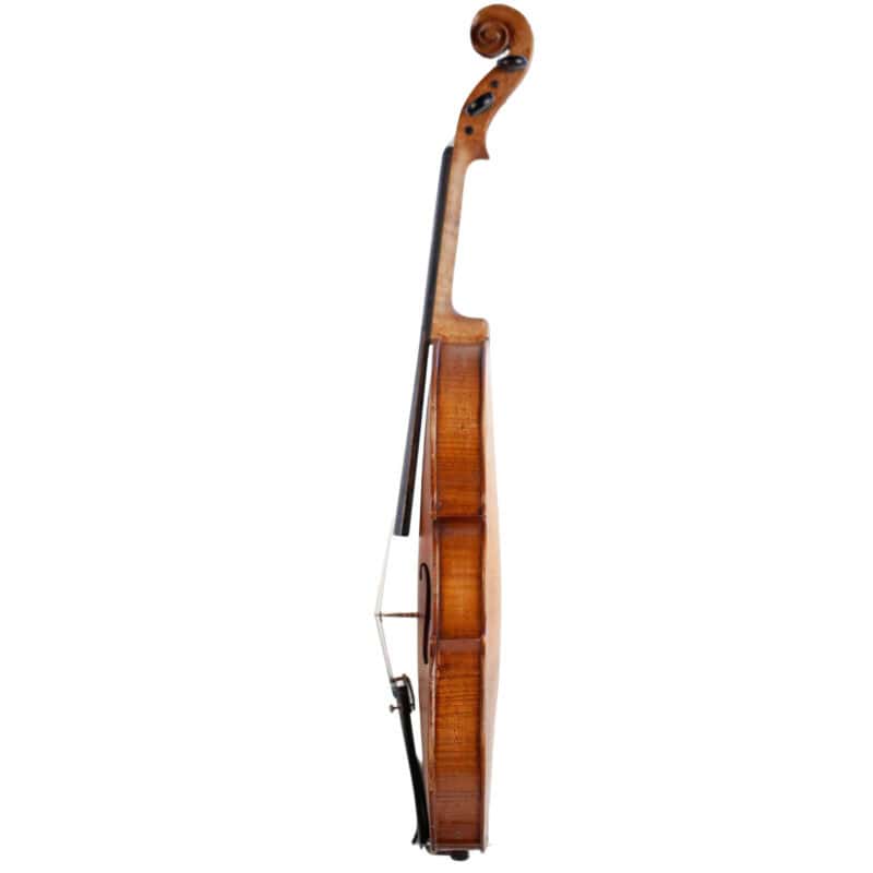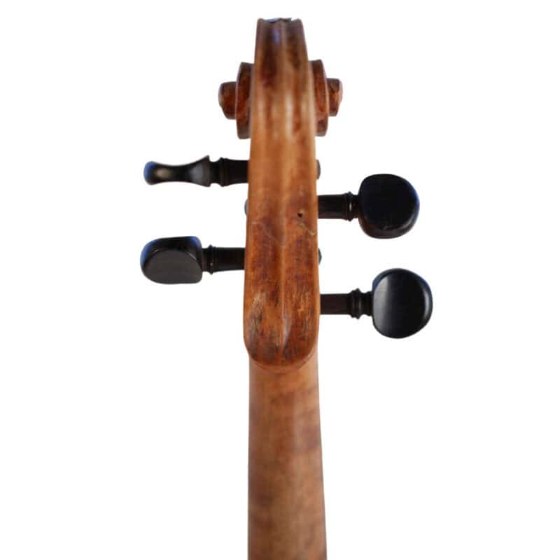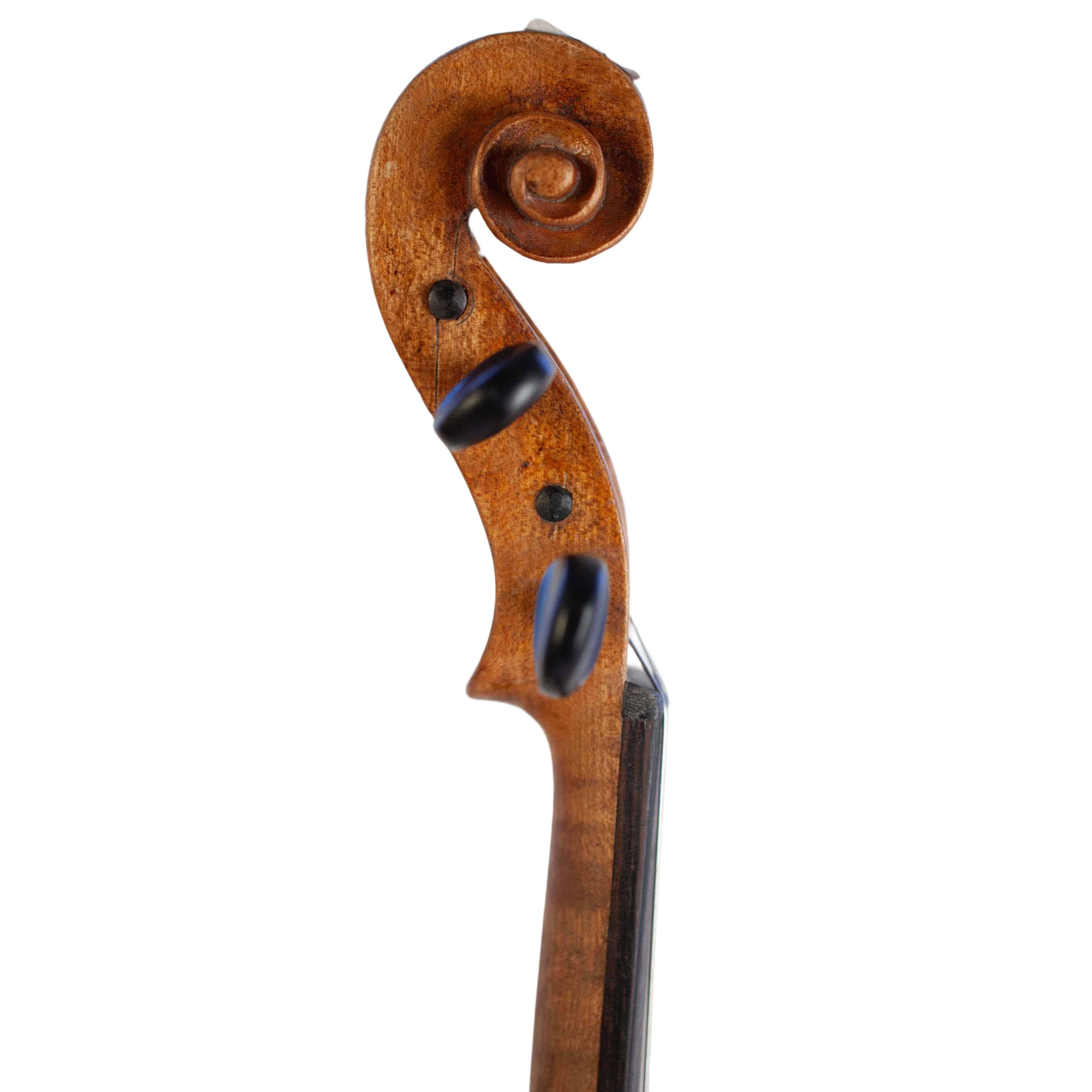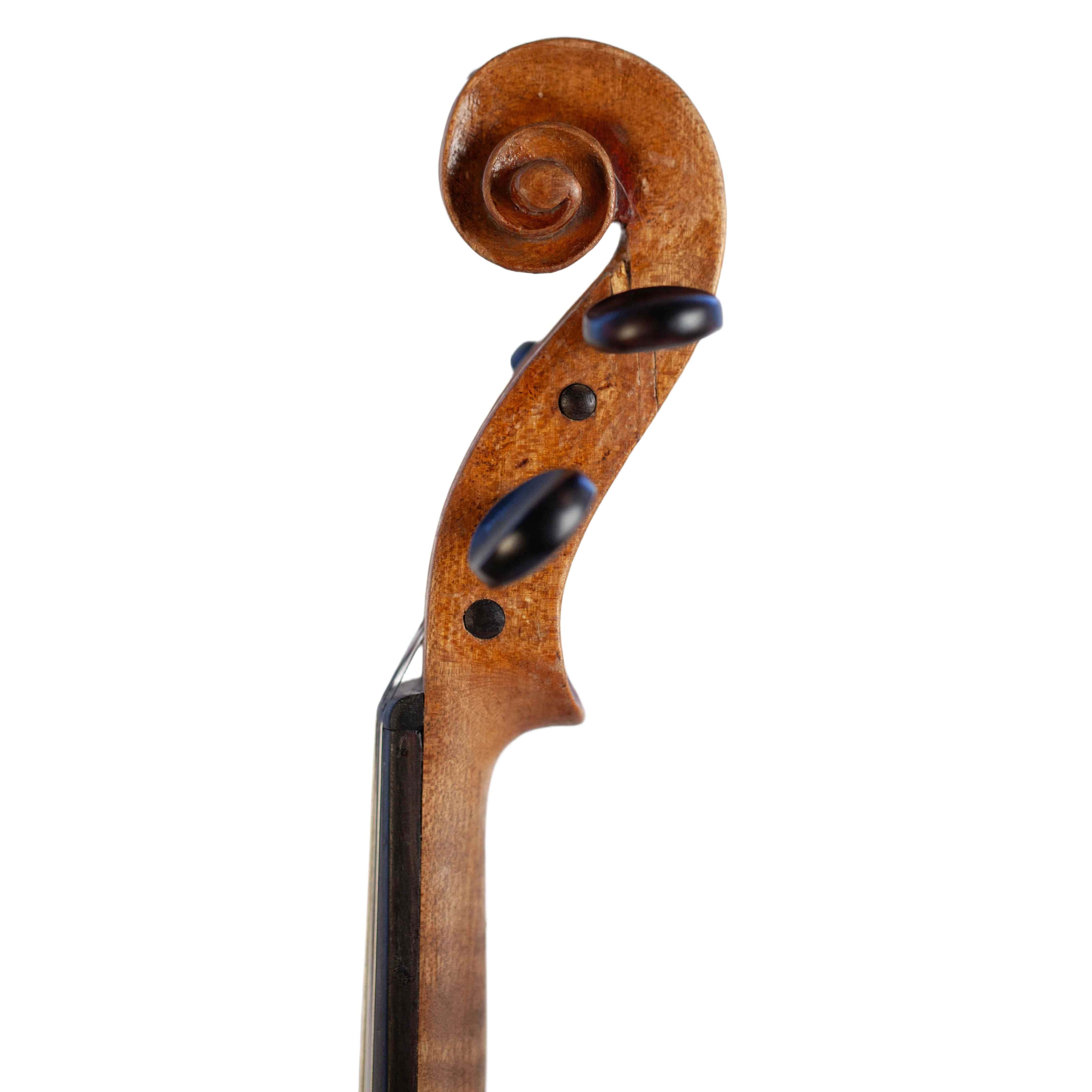 The whole length of the violin is 594 mm and the back 359 mm. The width of the upper bouts: 166 mm; middle bouts: 114 mm; lower bouts: 206 mm.
