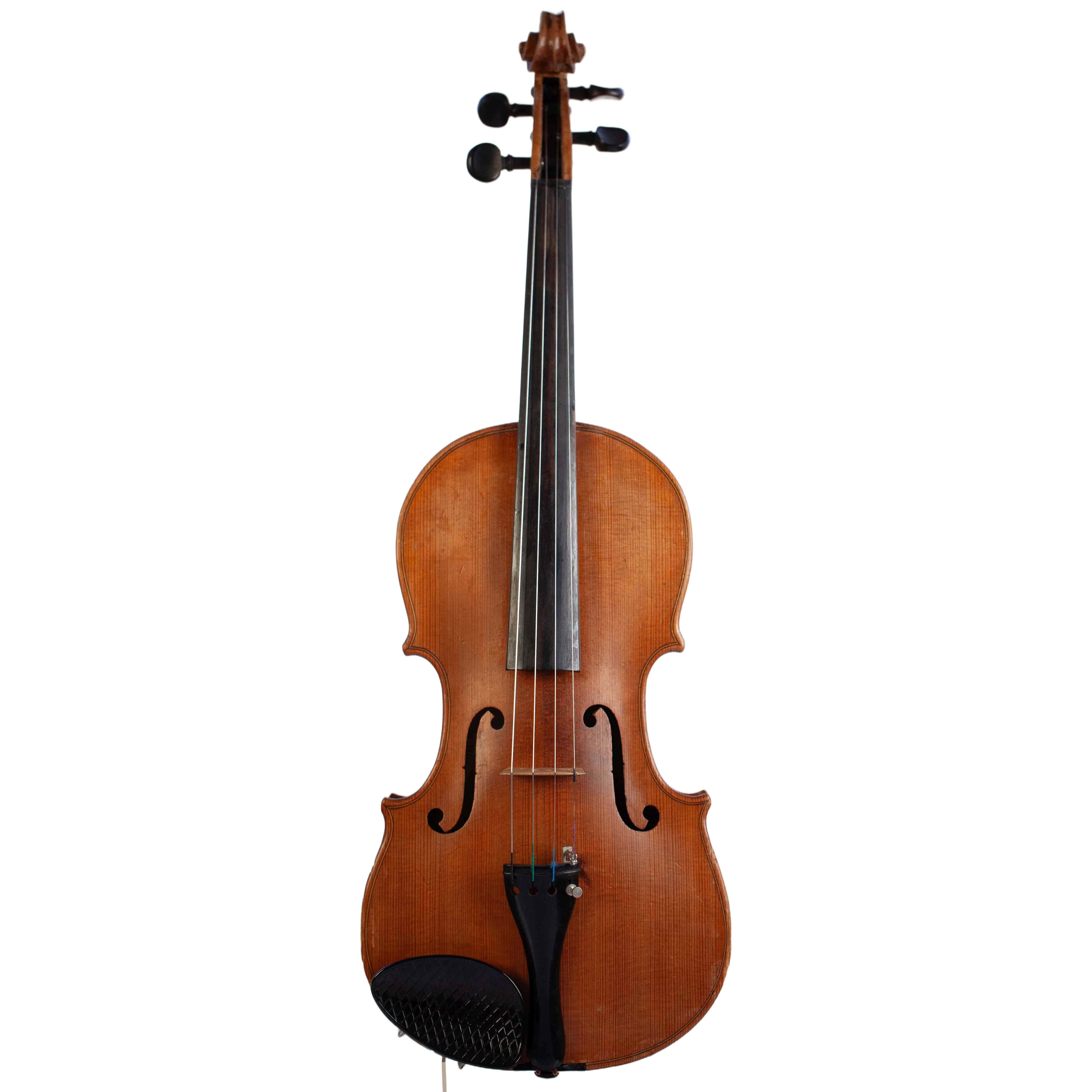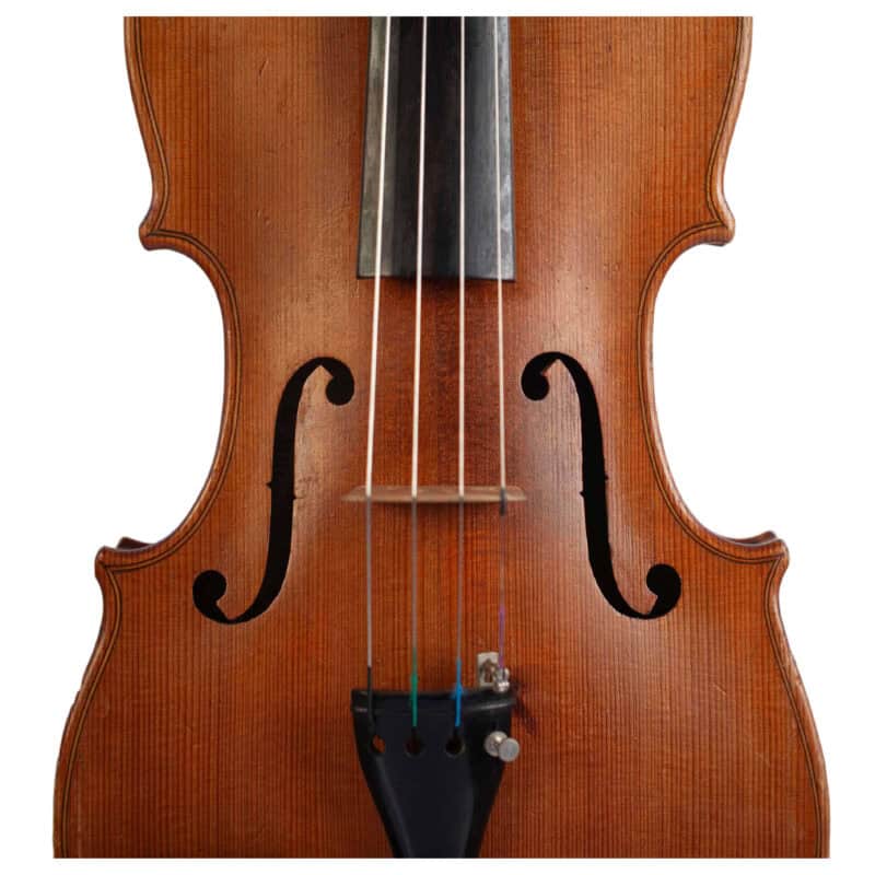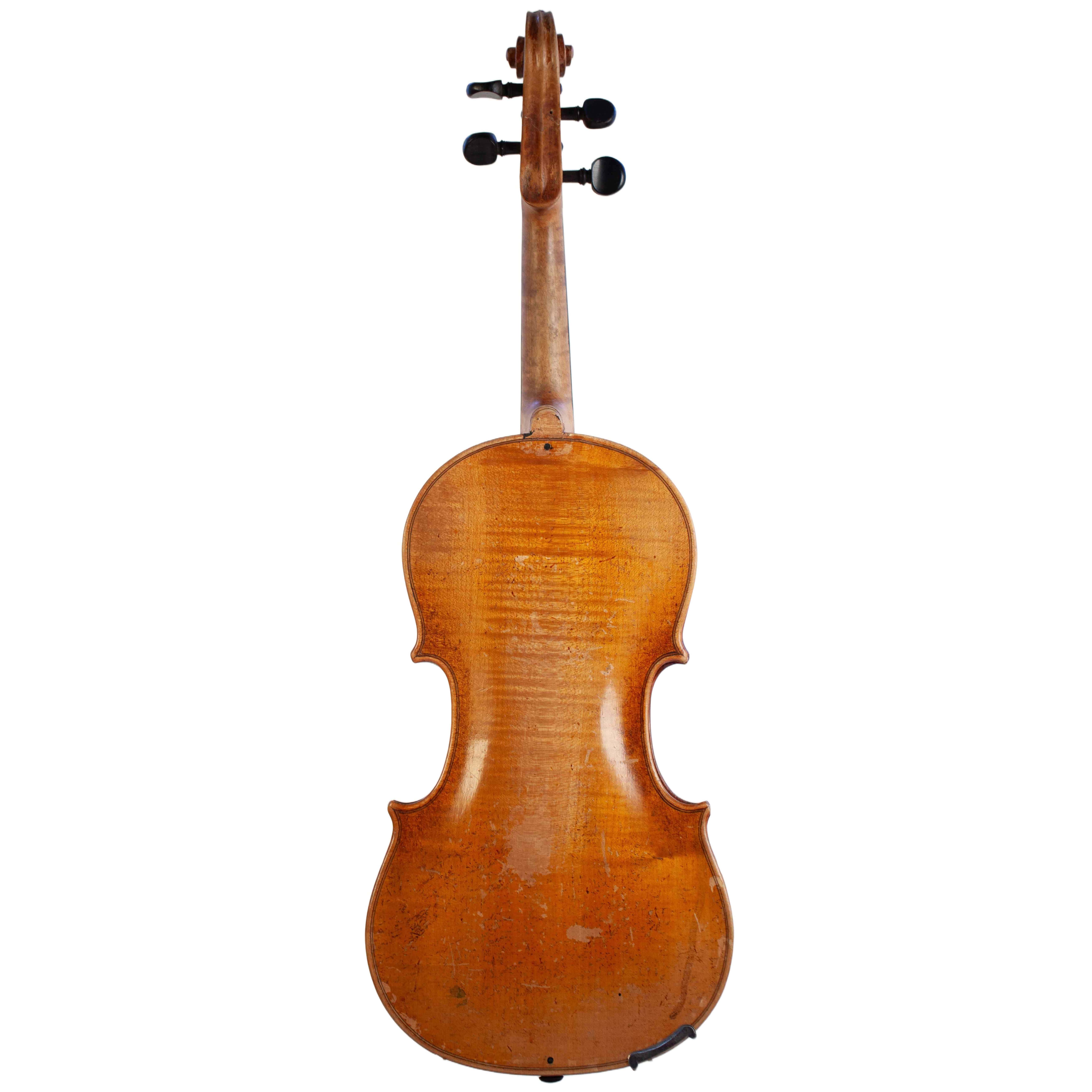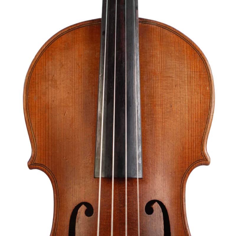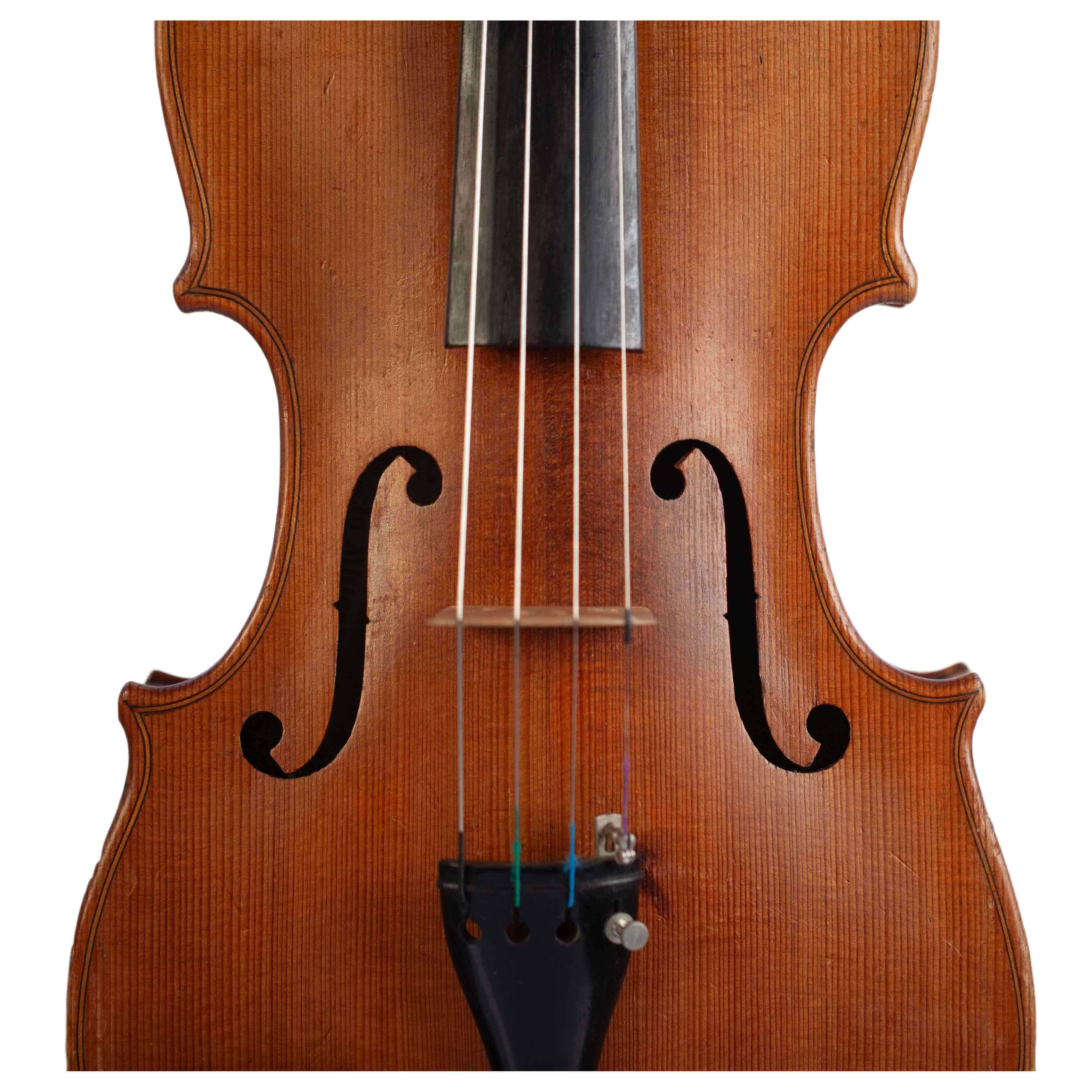 The whole length of the violin is 594 mm and the back 359 mm. The width of the upper bouts: 166 mm; middle bouts: 114 mm; lower bouts: 206 mm.