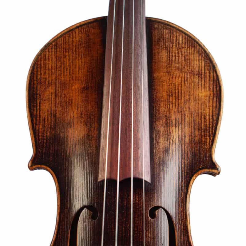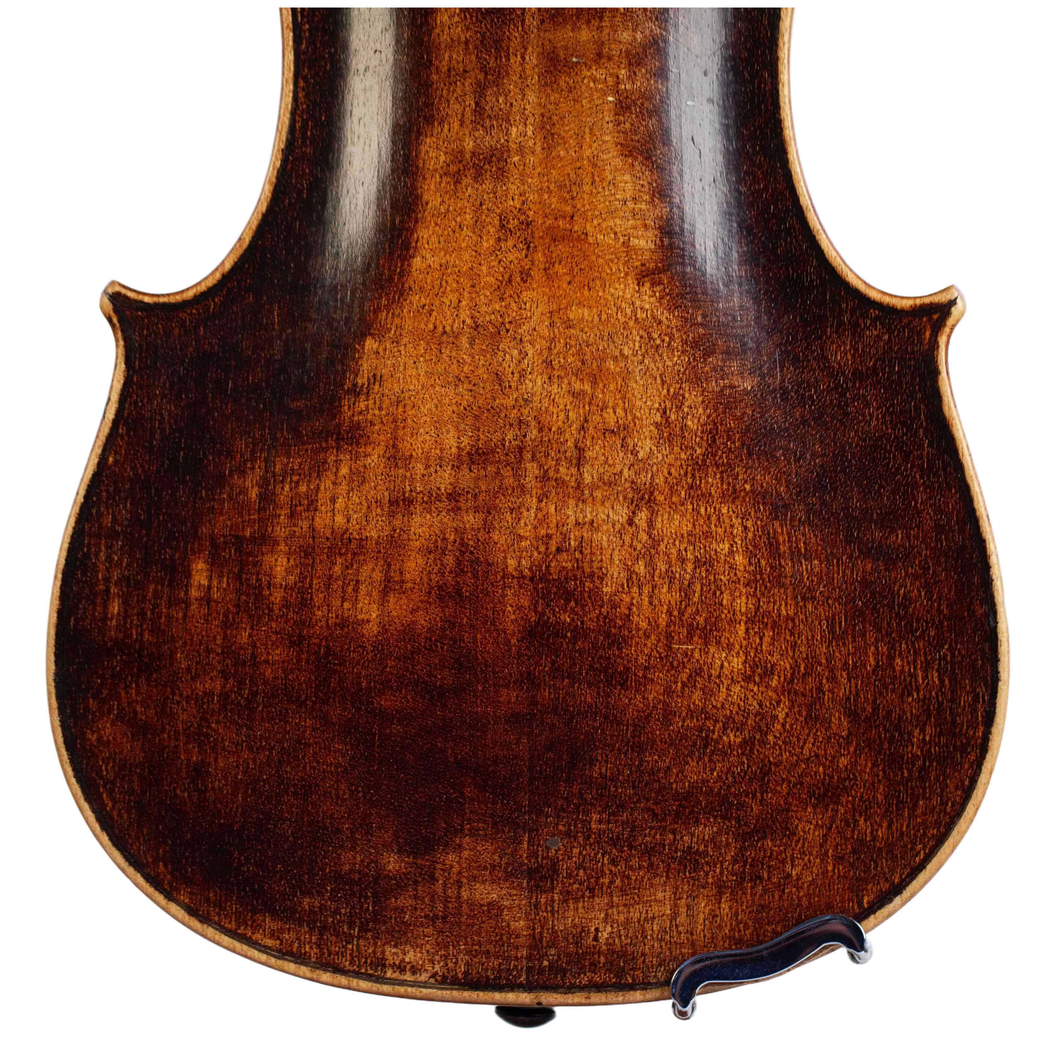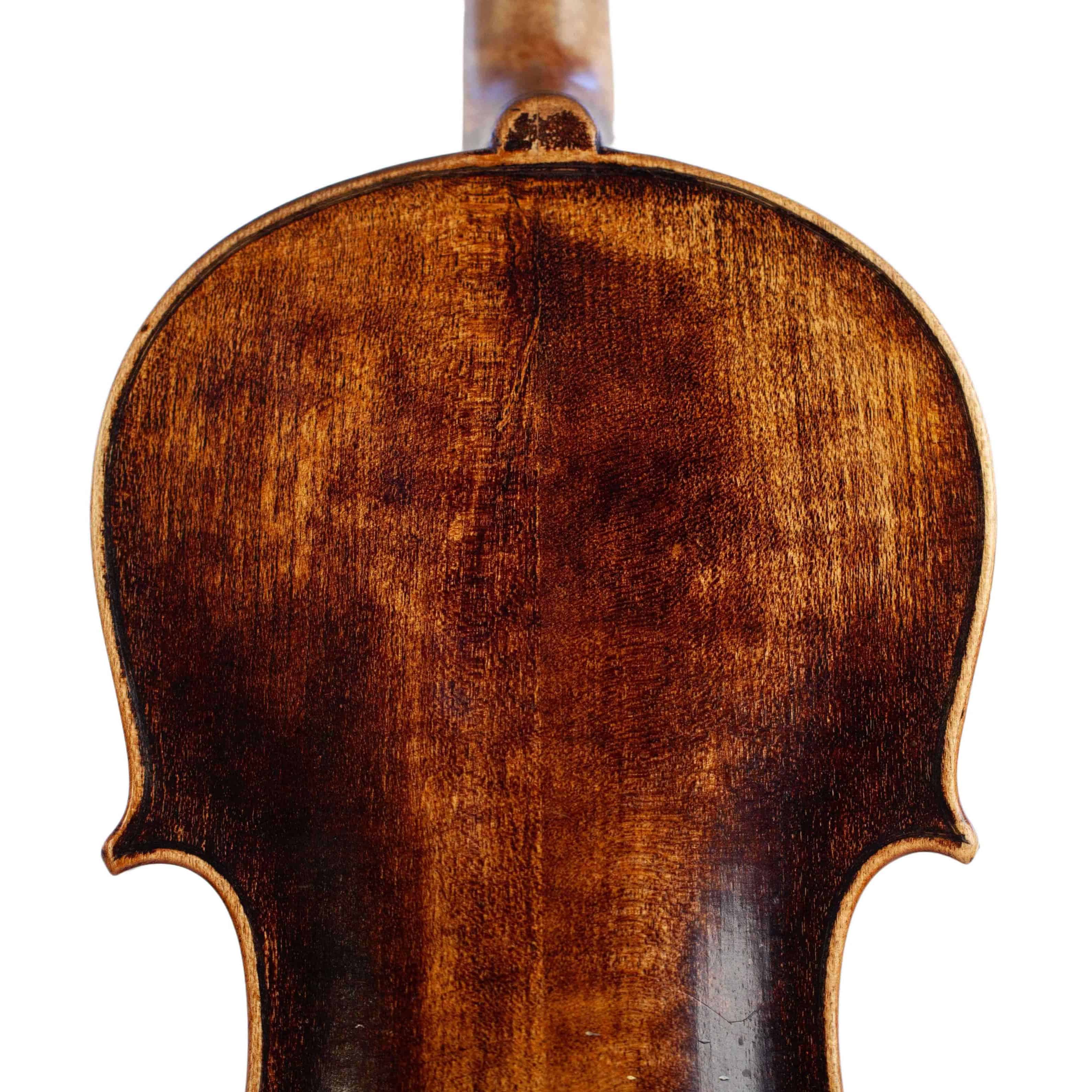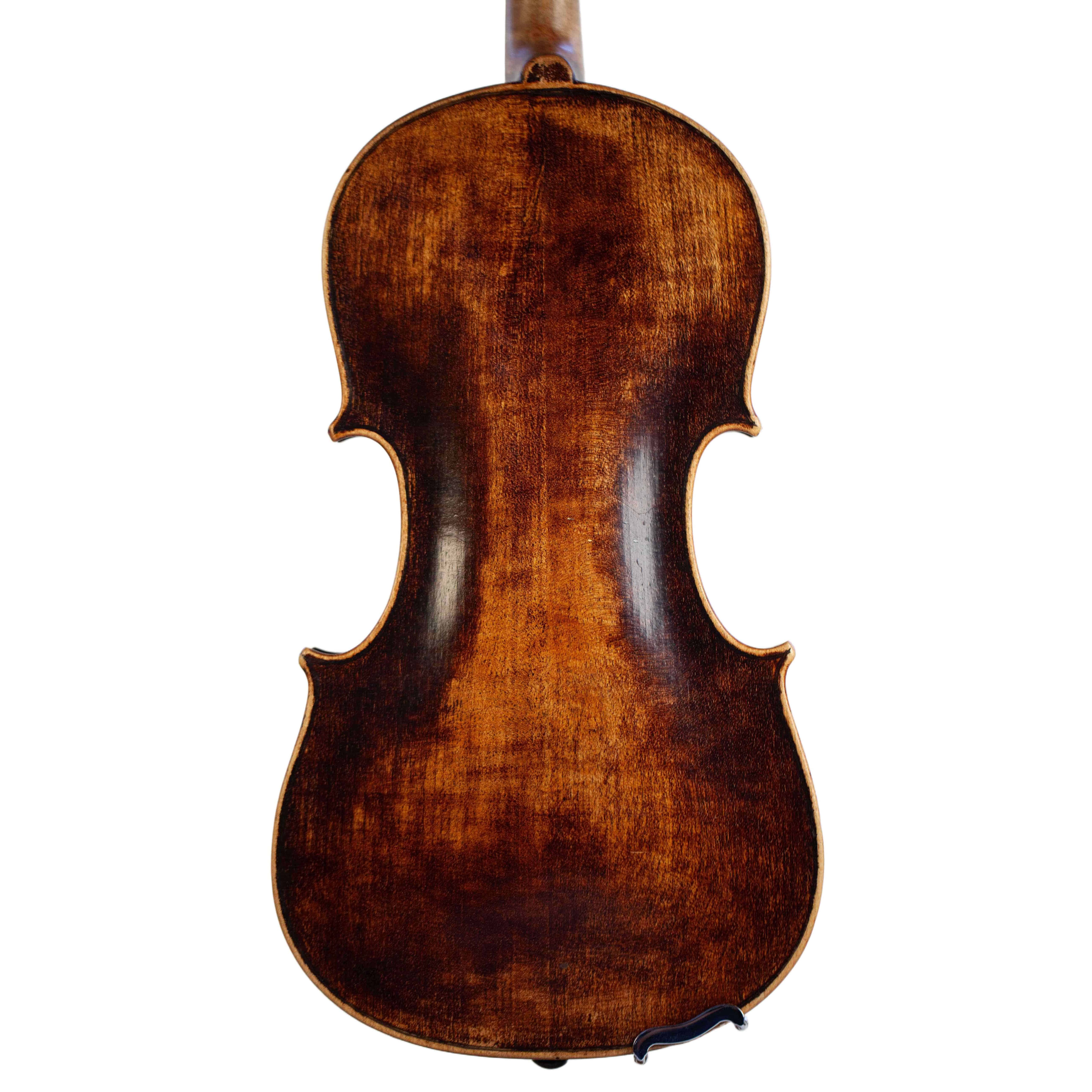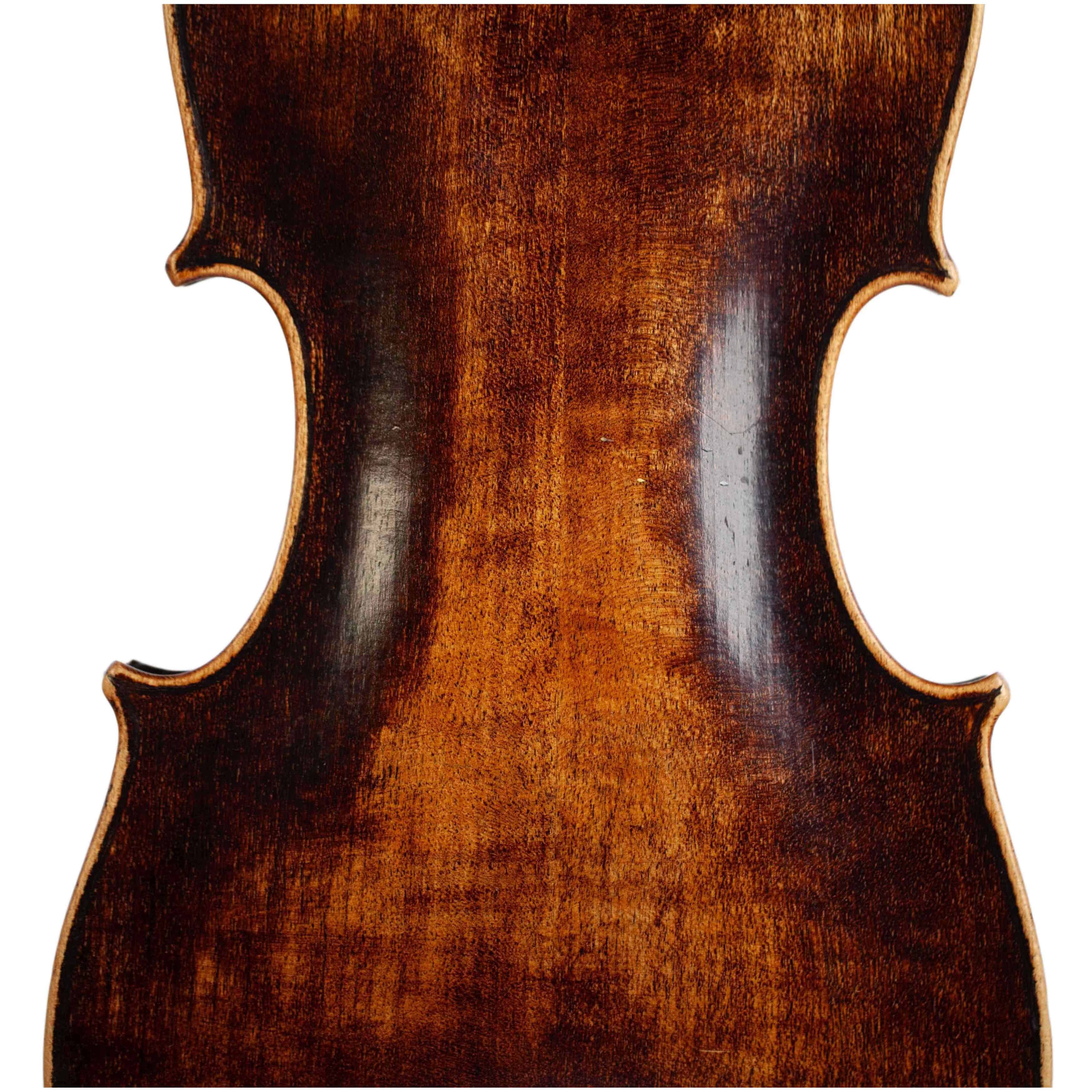 The whole length of the violin is 589 mm and the back 359 mm. The width of the upper bouts: 165 mm; middle bouts: 109 mm; lower bouts: 203 mm.