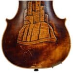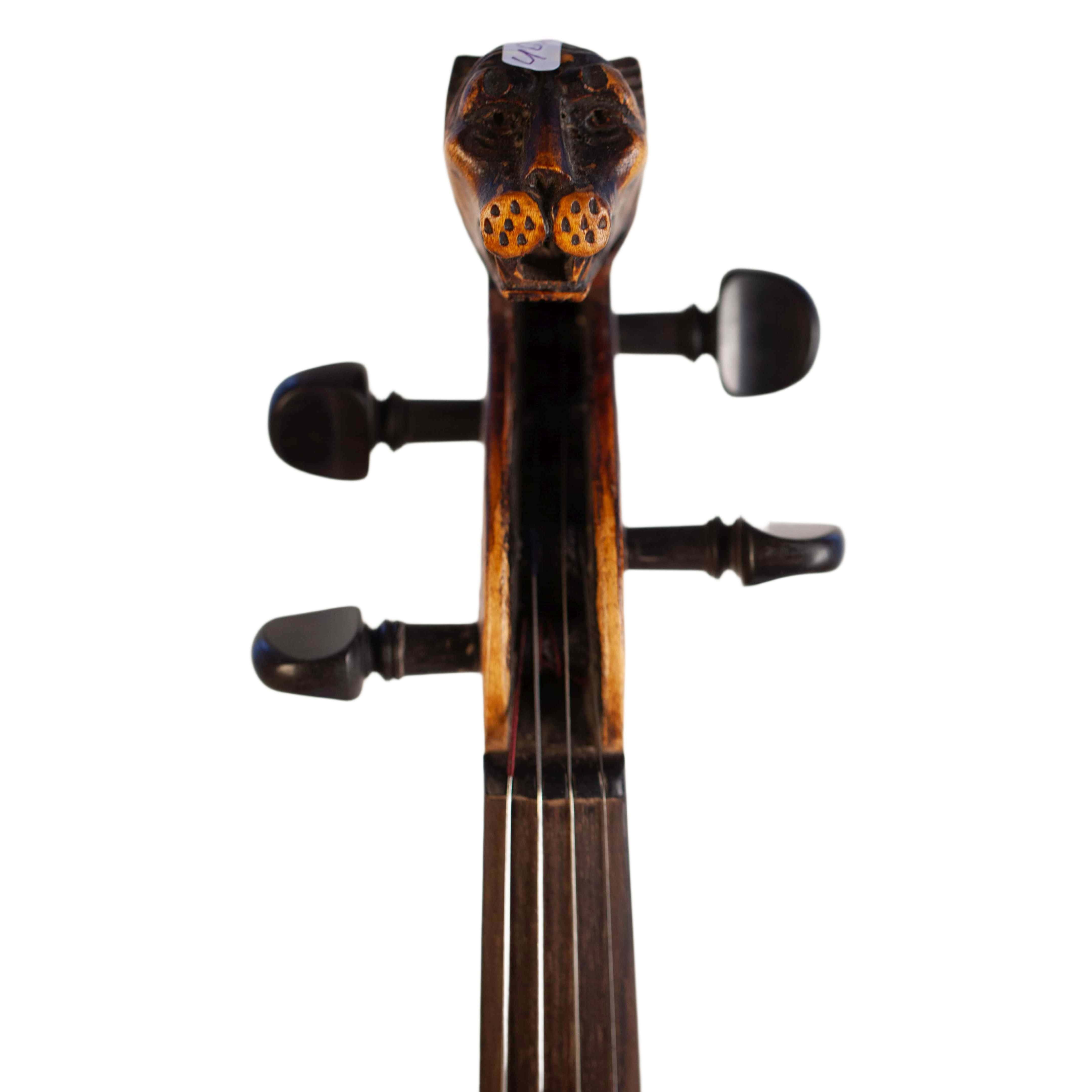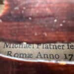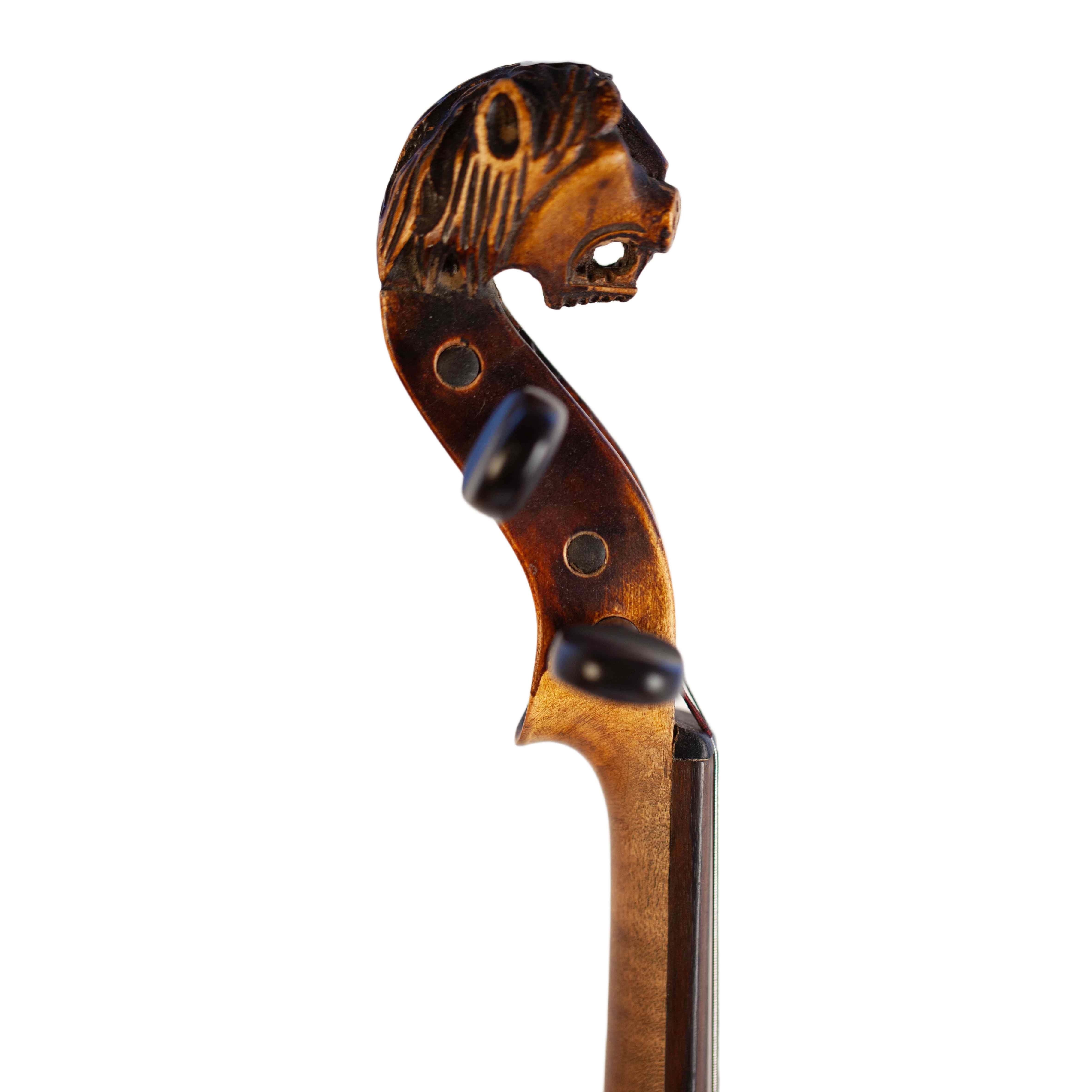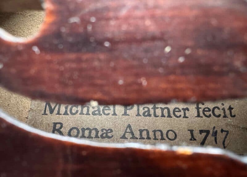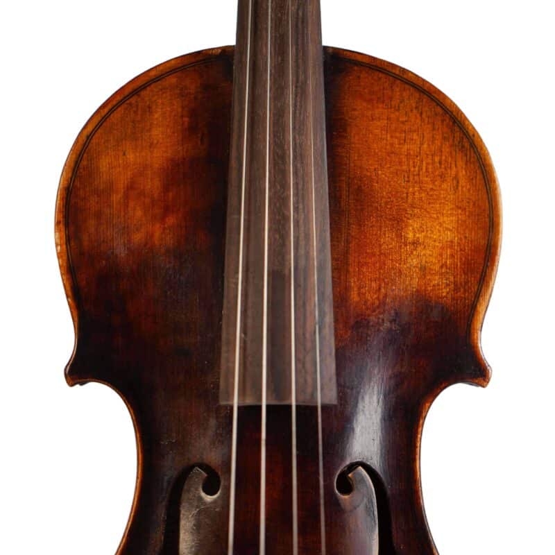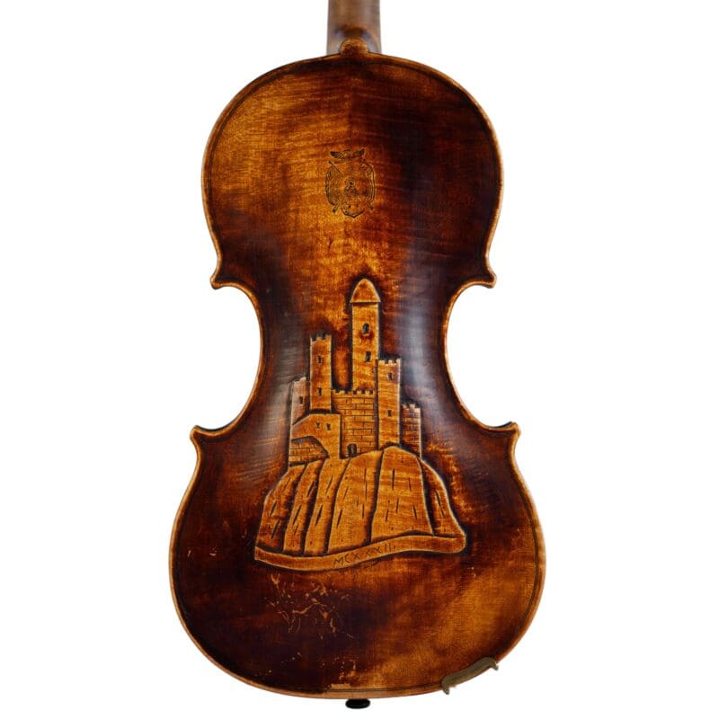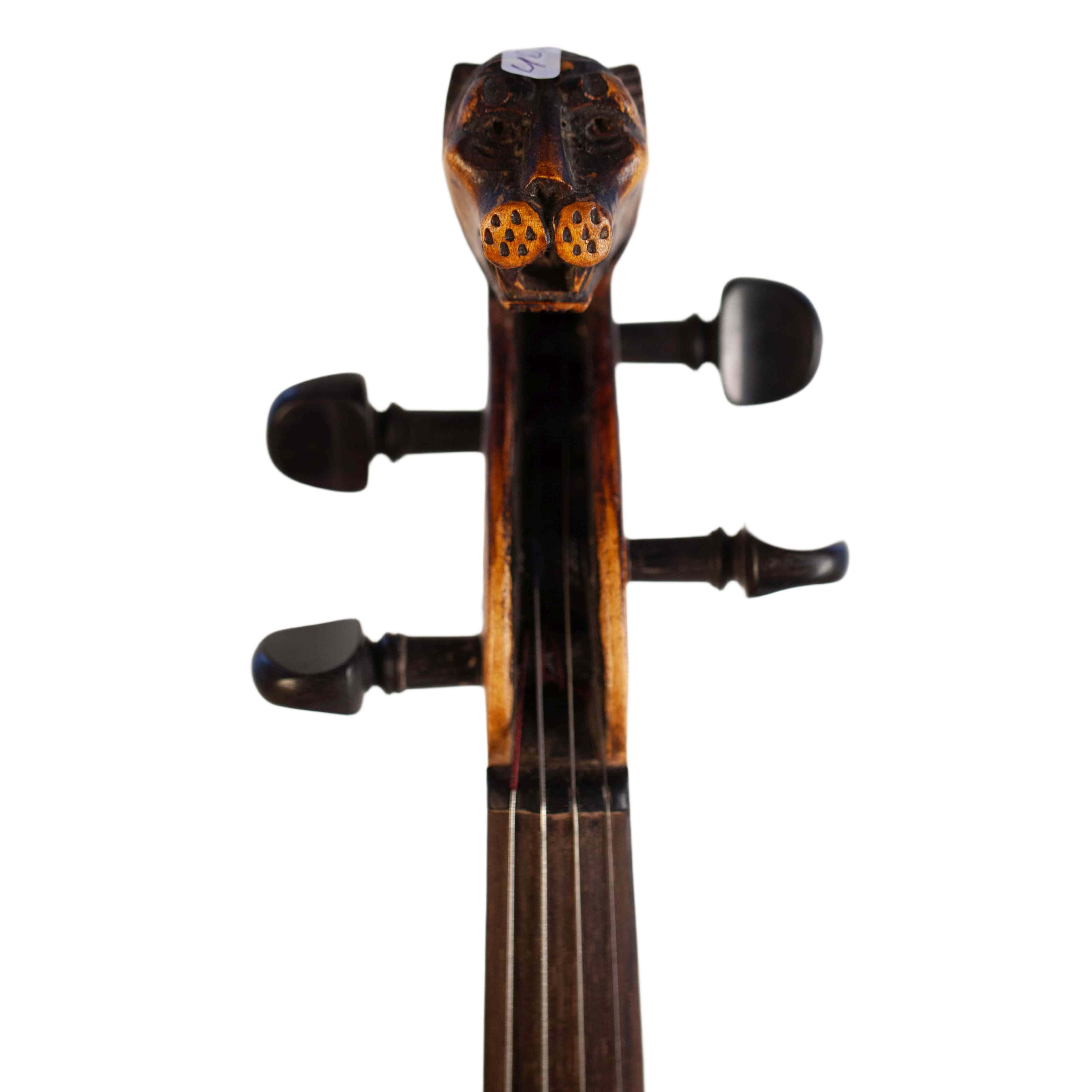 The whole length of the violin is 600 mm and the back 359 mm. The width of the upper bouts: 168 mm; middle bouts: 107 mm; lower bouts: 210 mm.
