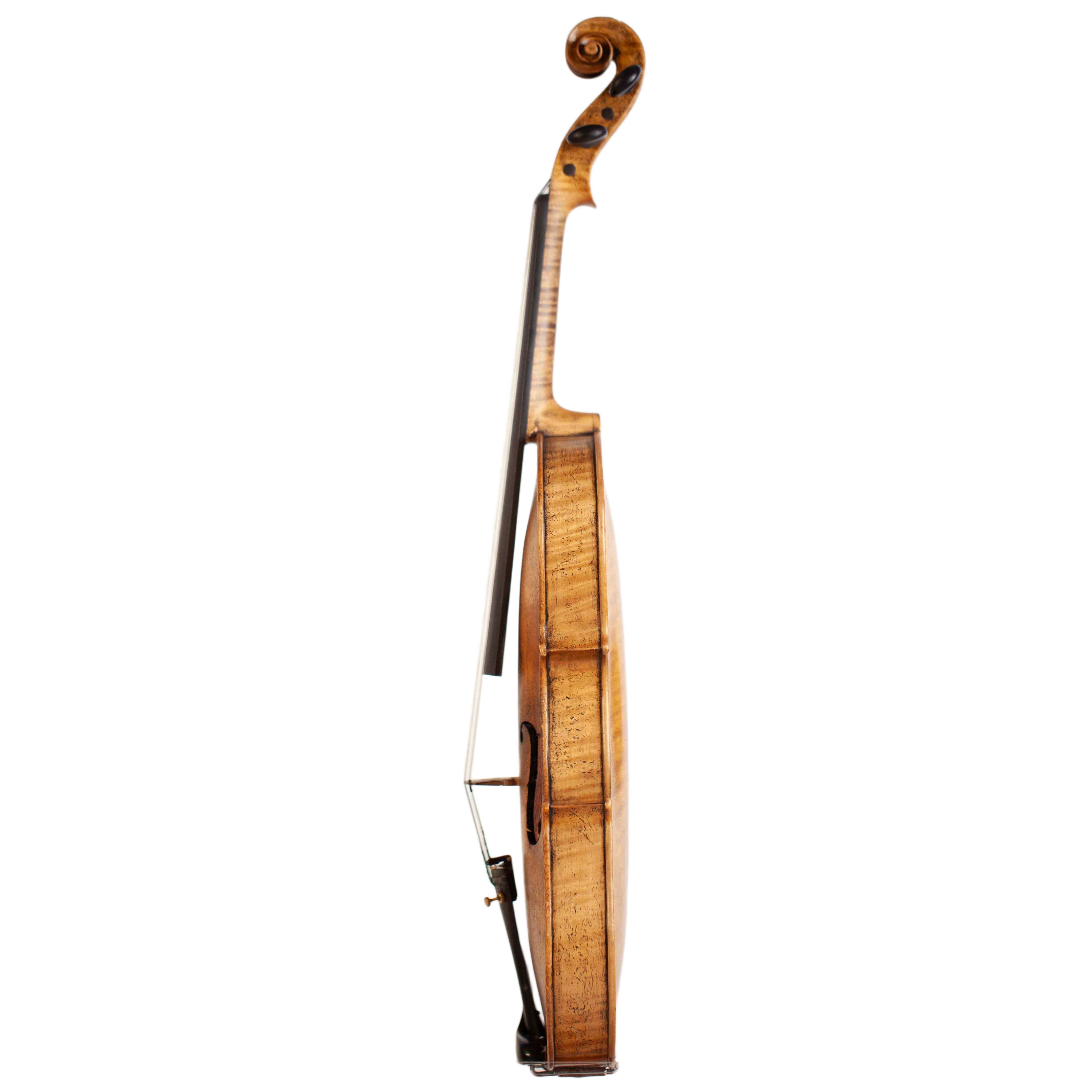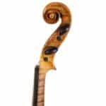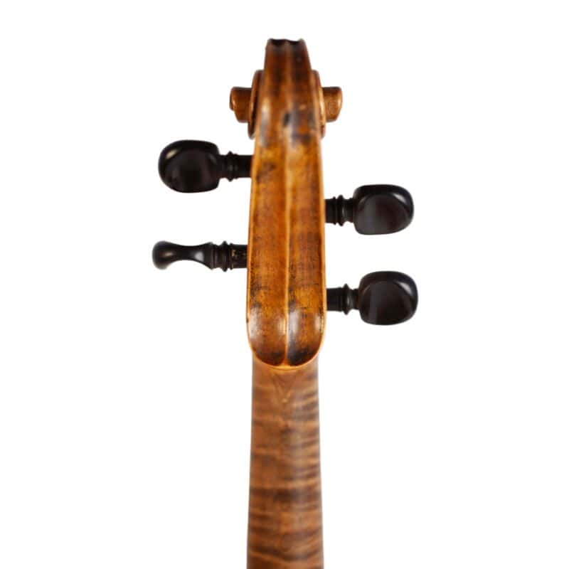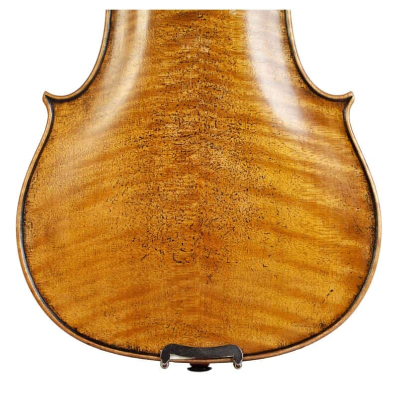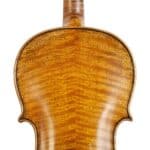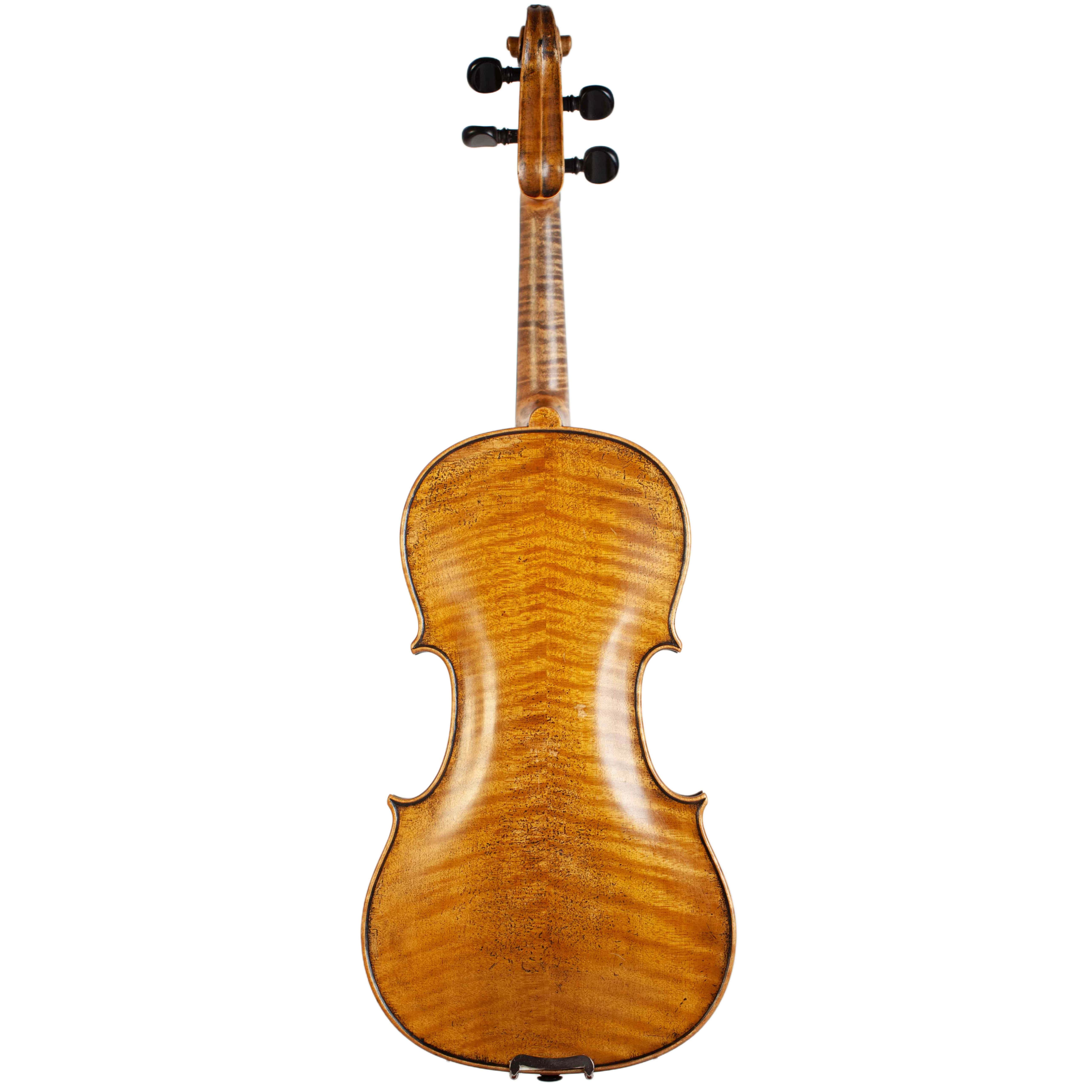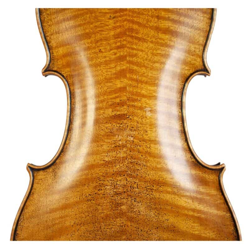 The whole length of the violin is 591 mm and the back 358 mm. The width of the upper bouts: 163 mm; middle bouts: 110 mm; lower bouts: 208 mm.