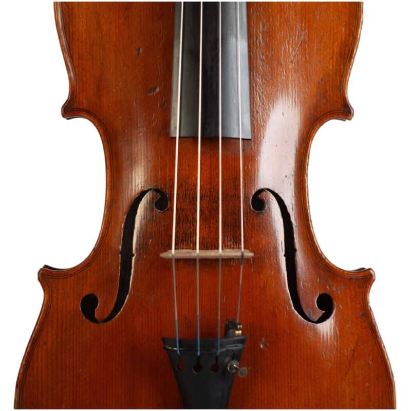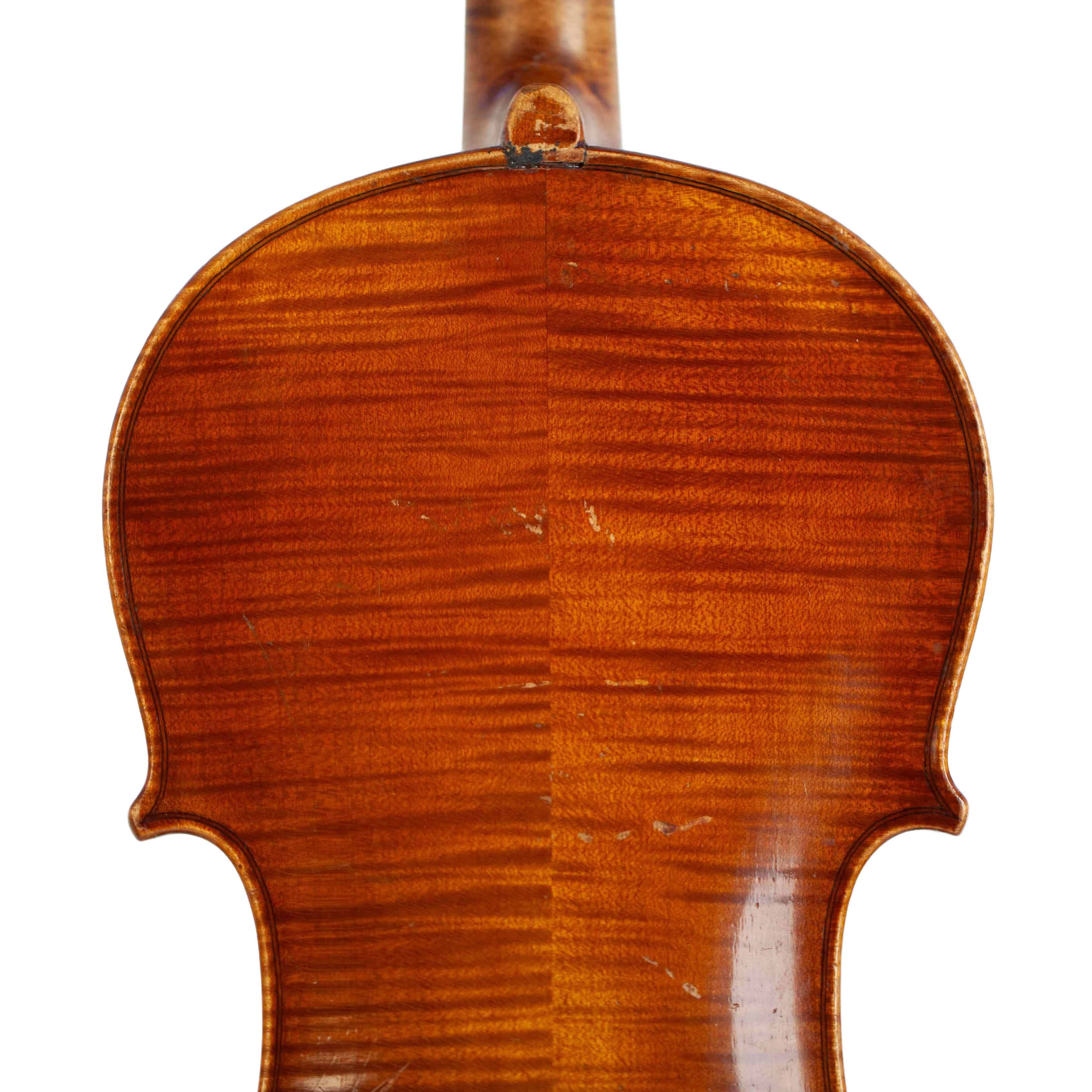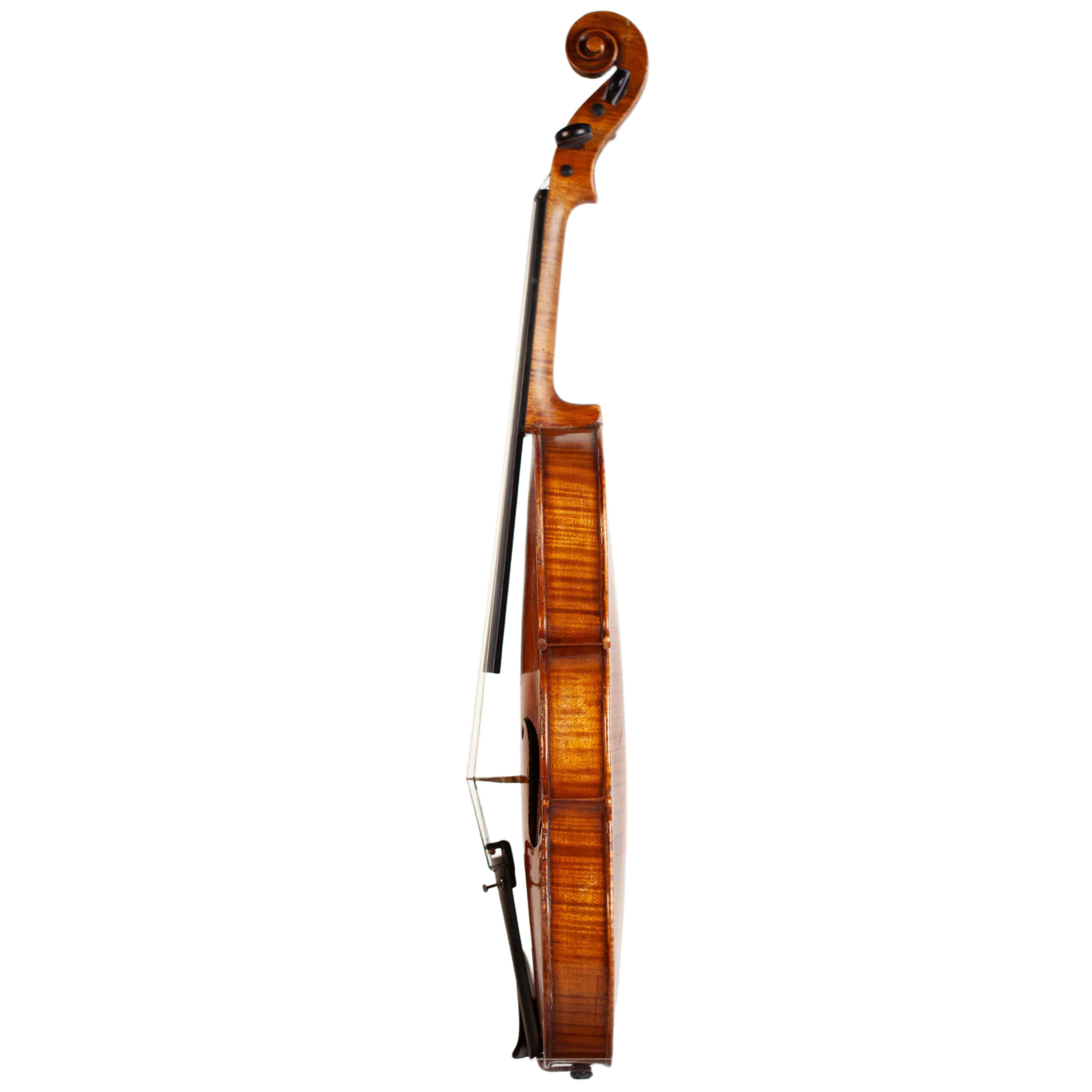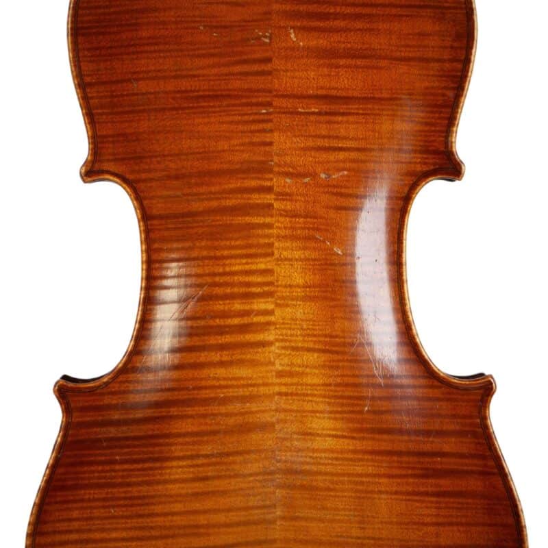 The whole length of the violin is 588 mm and the back 356 mm. The width of the upper bouts: 163 mm; middle bouts: 108 mm; lower bouts: 200 mm.